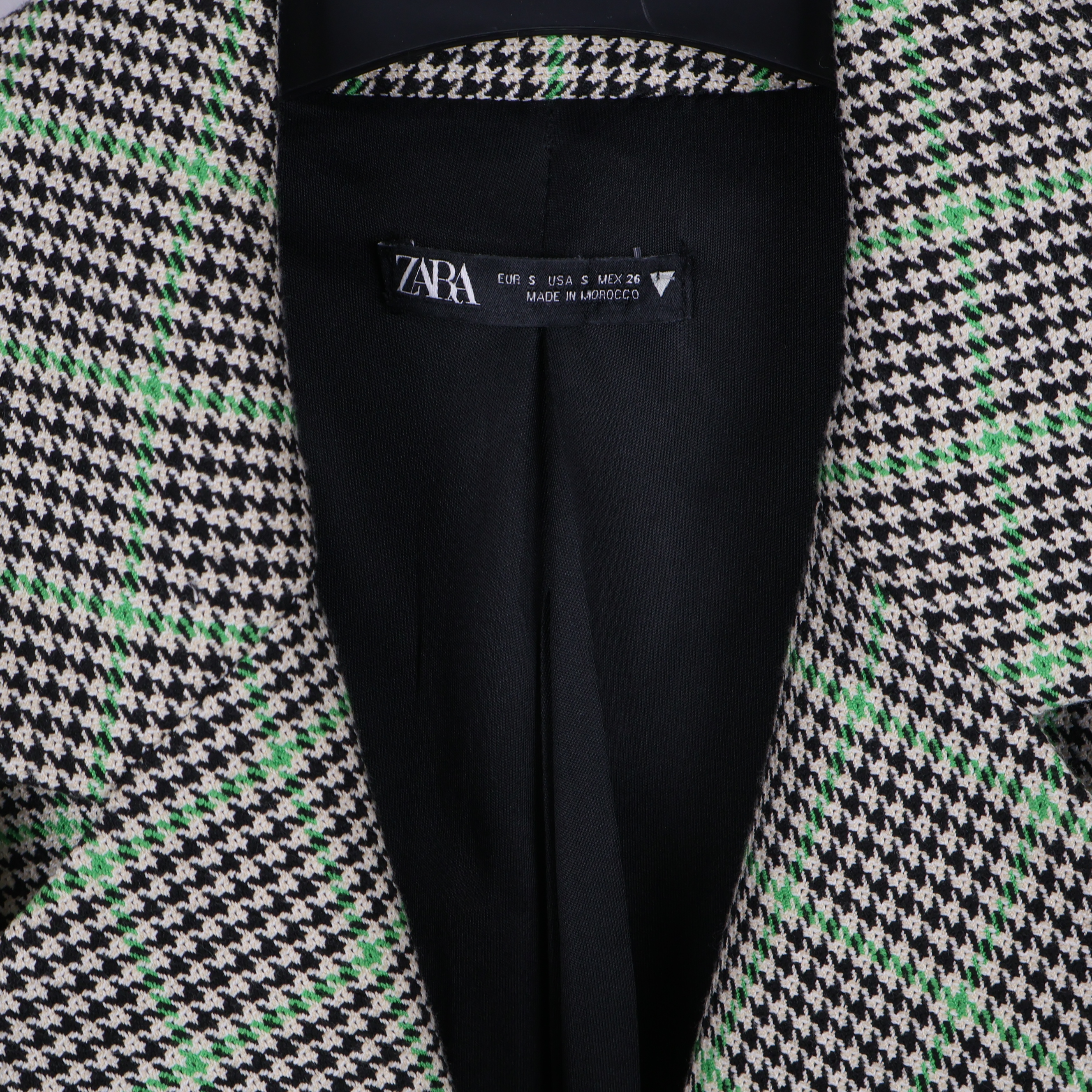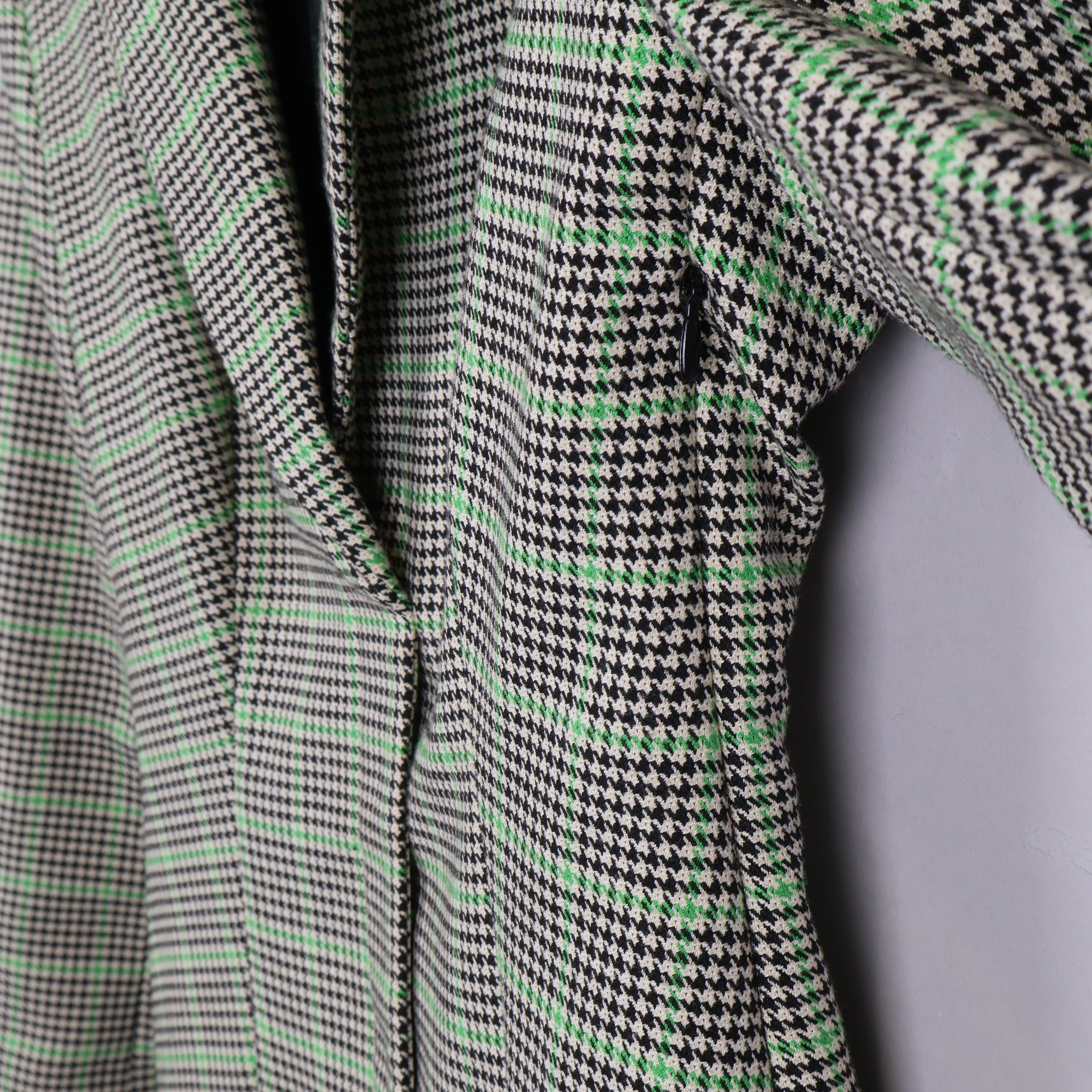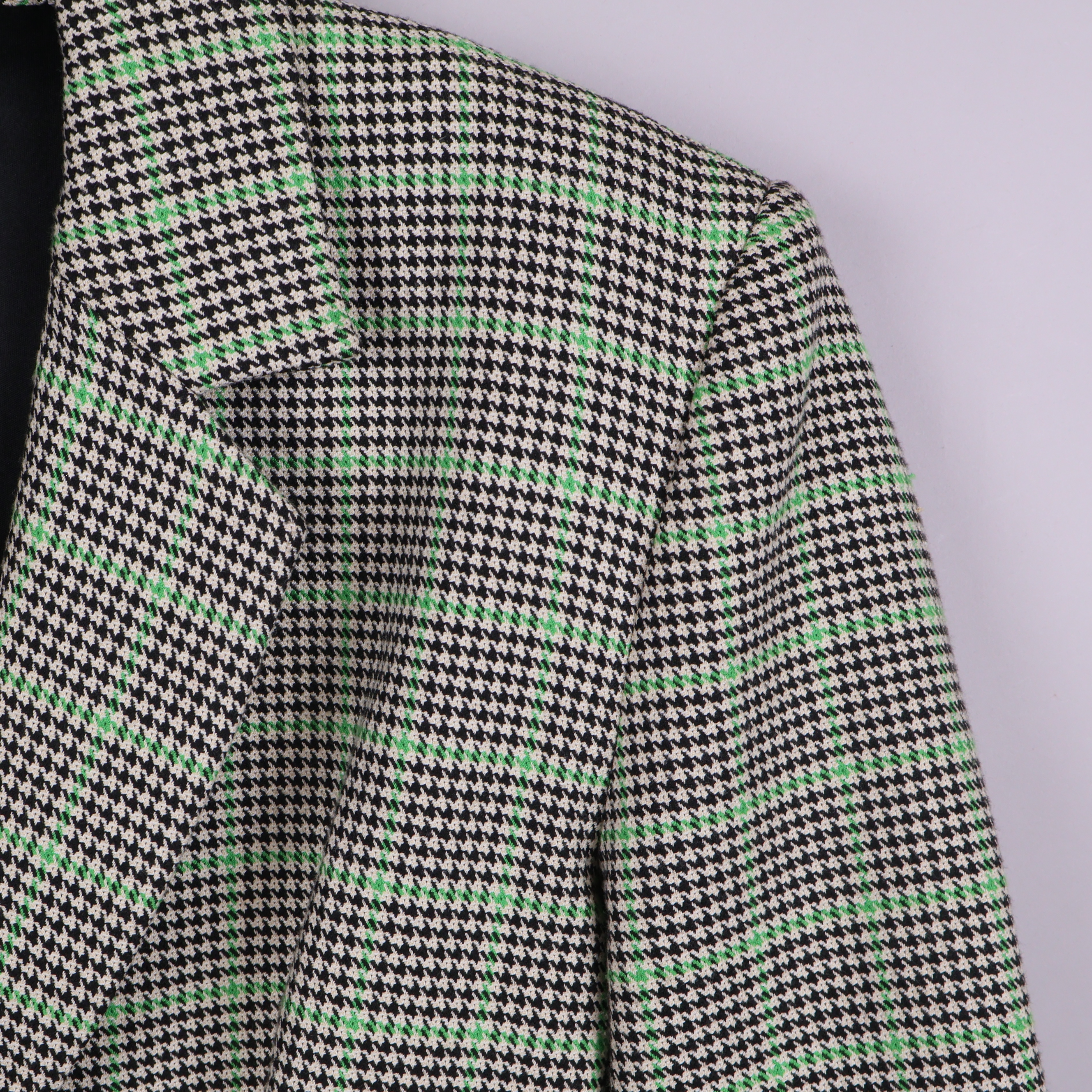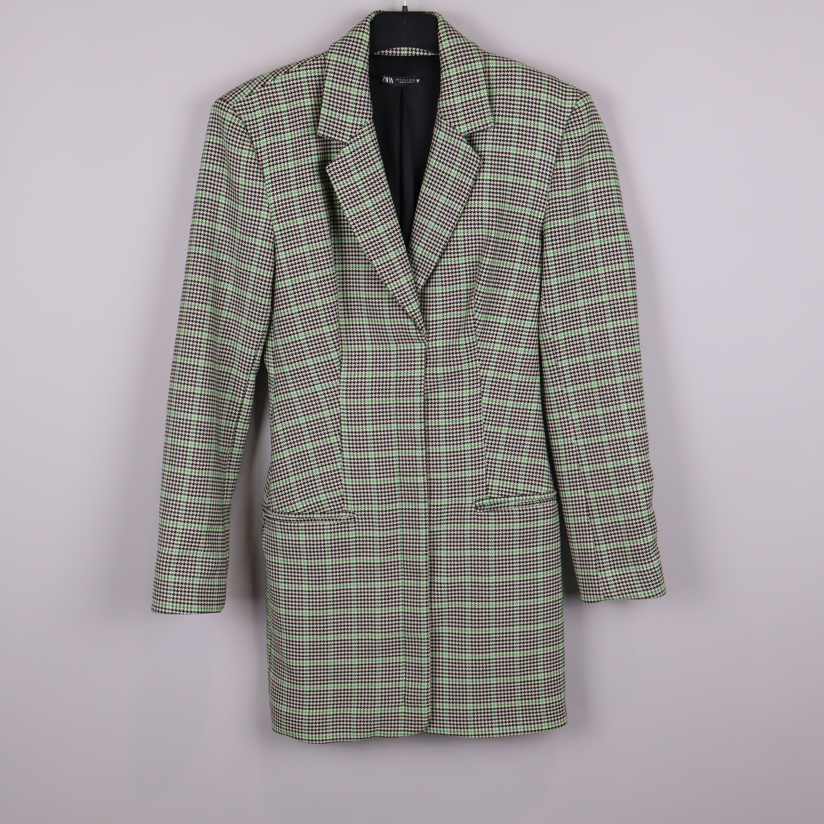 Stilren kavajklänning med klassiskt rutig mönster i svart, vitt och grönt som ger en modern och pigg look. Klänningen har rak passform, markerad krage och två fake fickor. Dold dragkedja i sidan. Fodret är svart för extra kontrast. Rutmönstret med gröna inslag skapar en uppdaterad vintage vibe som passar till många stilar.