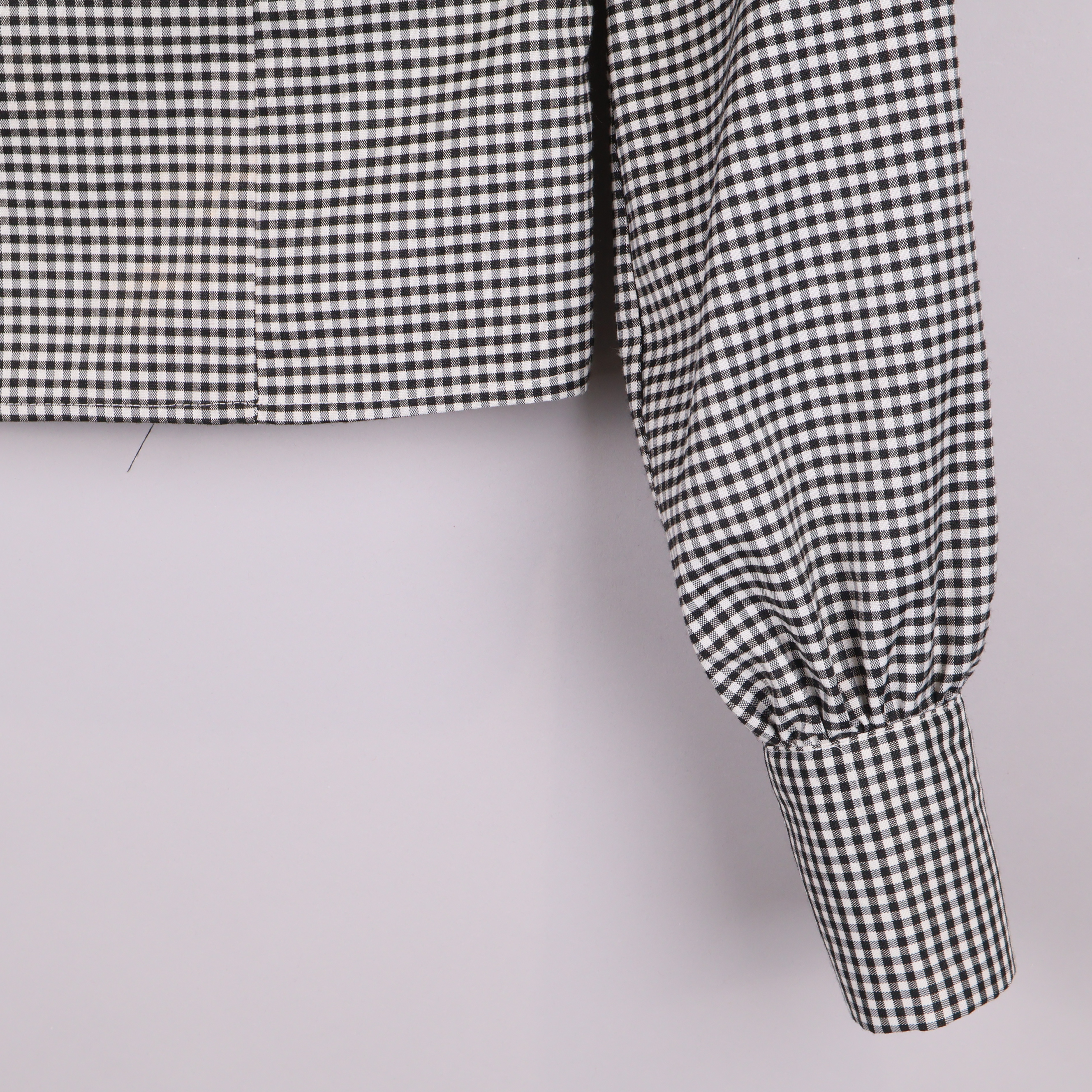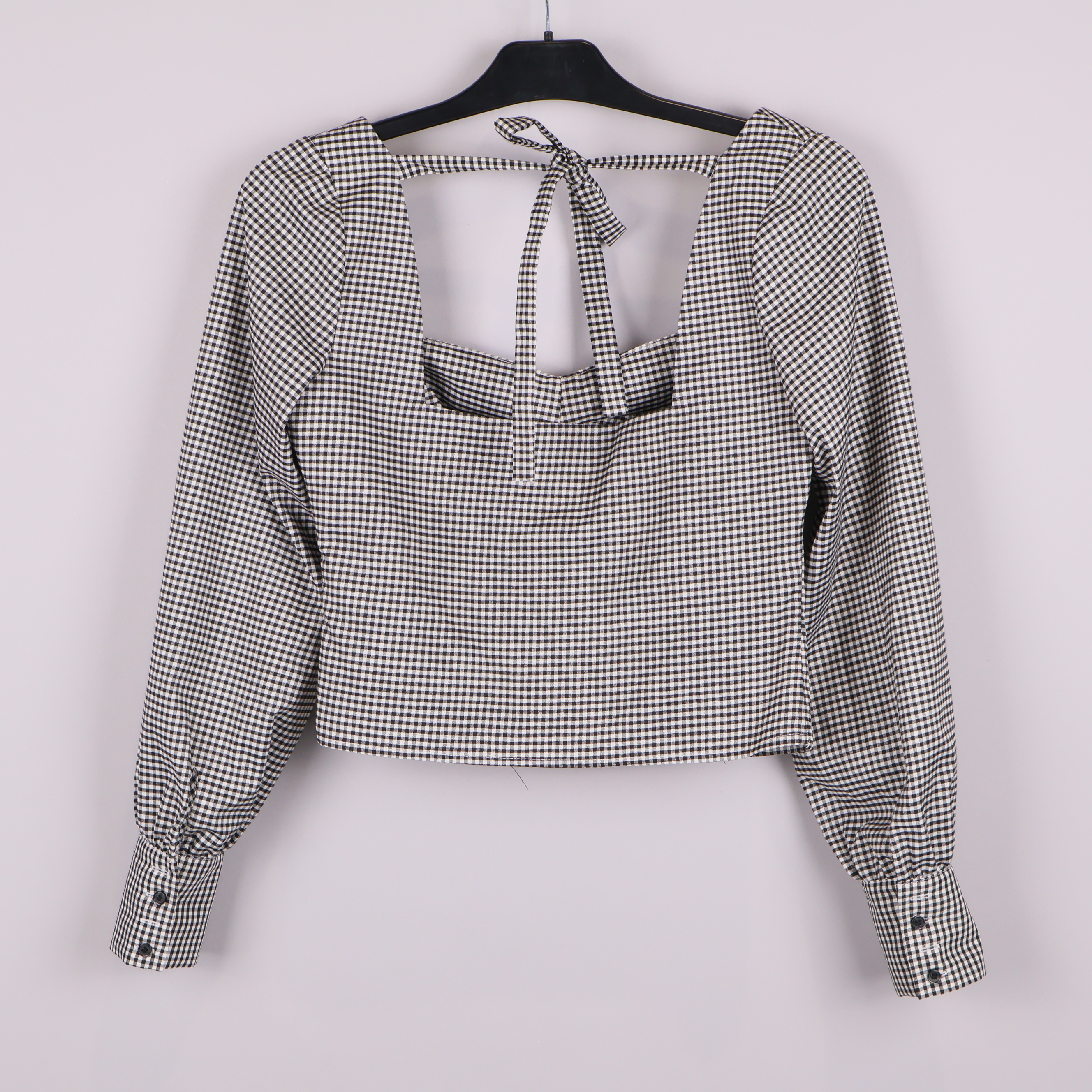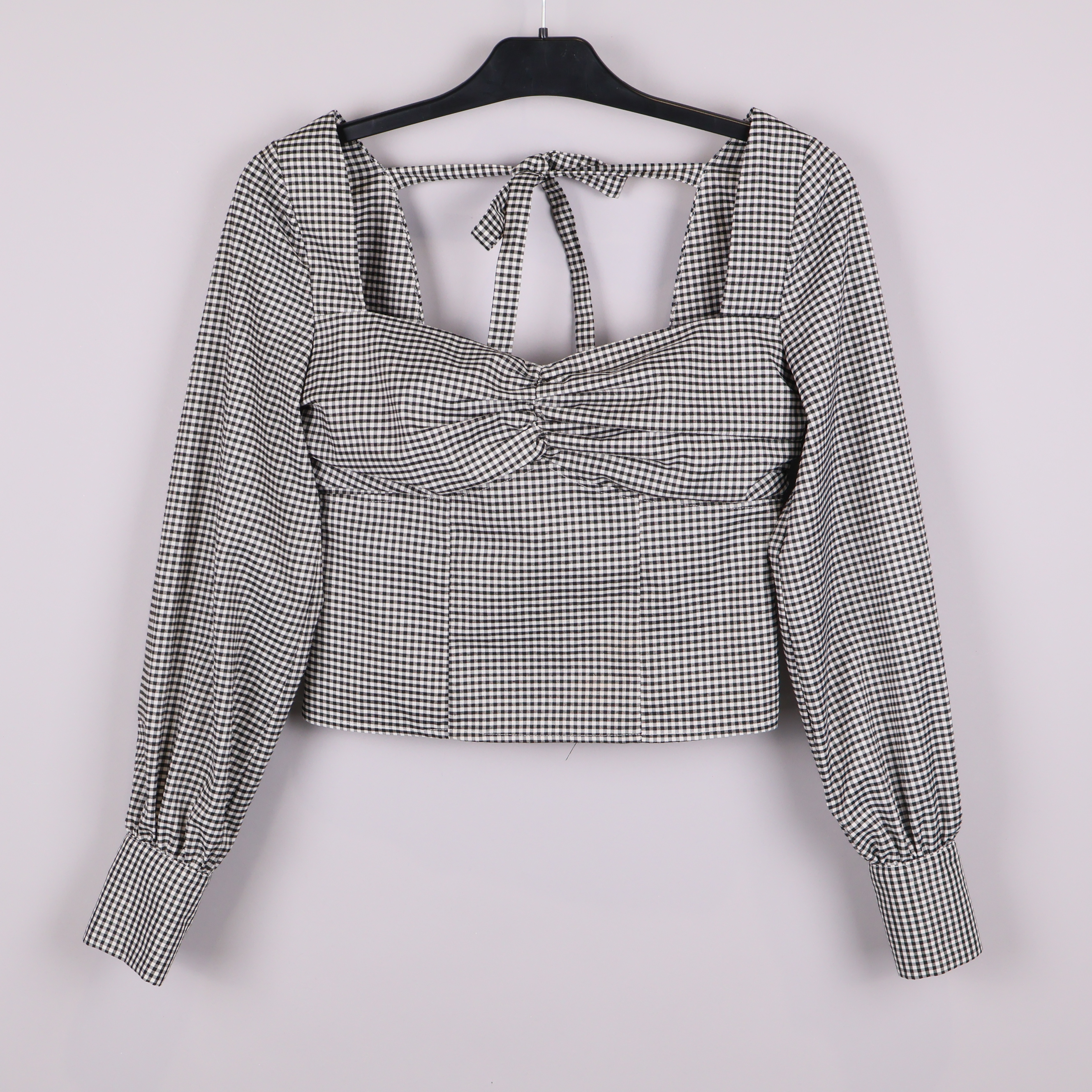 Denna topp har ett rutigt mönster med långa ärmar, breda manschetter och ett charmigt knytband bak. Dragkedja i sidan för enkel av- och påtagning samt twistad detalj framtill som ger en modern och lekfull känsla. Modellen är kortare i midjan och har en figurnära passform.