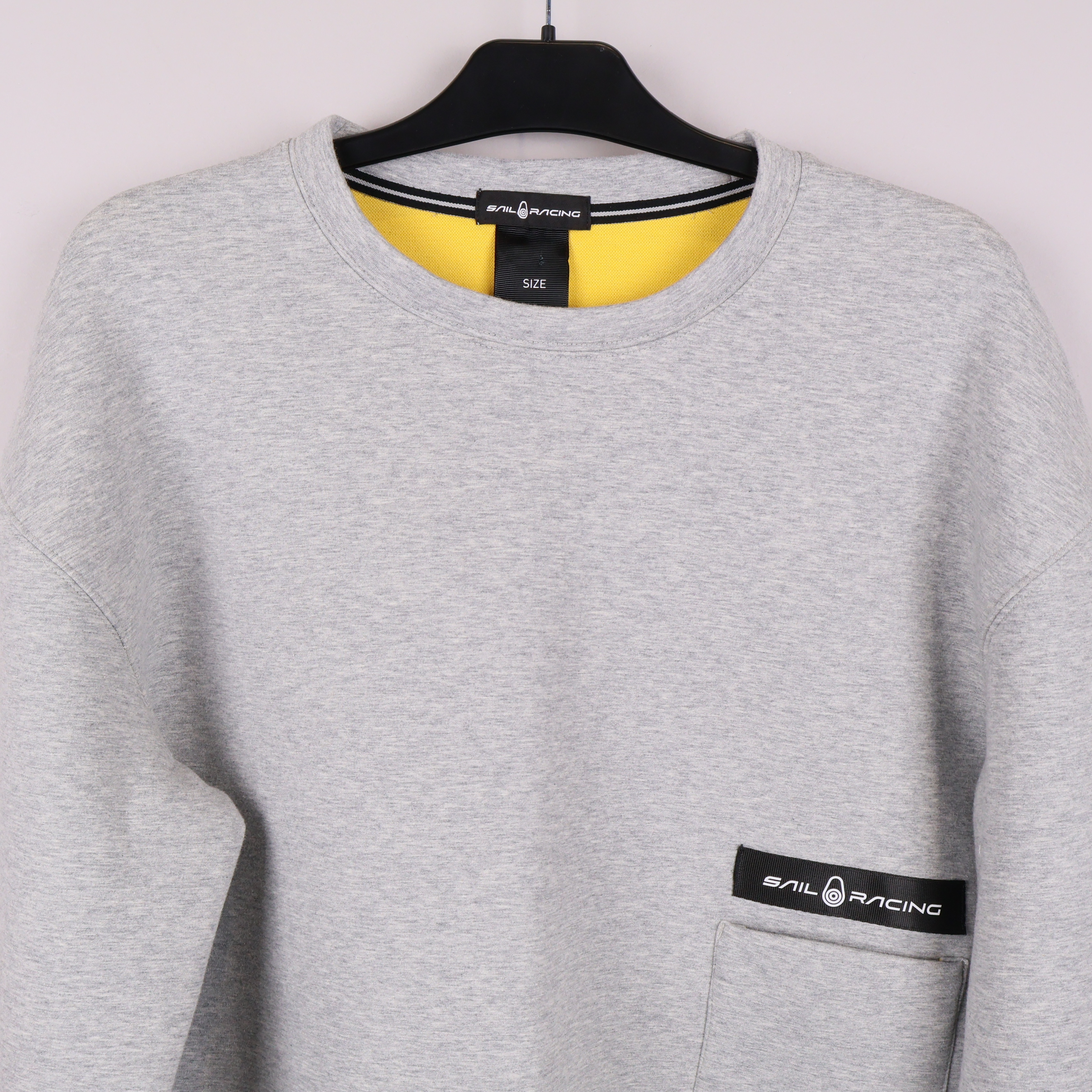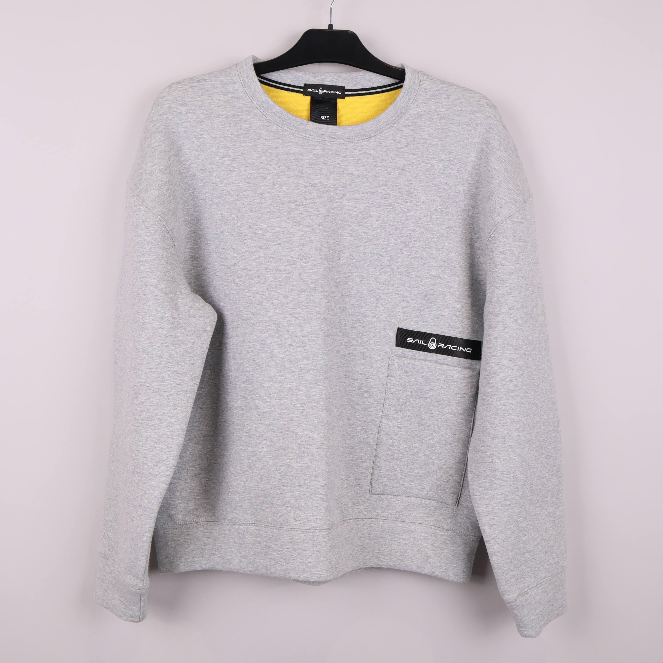 Sweatshirt i mjukt grått tyg med rak passform och rund halsringning. En stor framficka med diskret Sail Racing-logo skapar en clean och sportig look. Insidan har kontrasterande gul färg för en unik touch. Ribbstickade muddar.