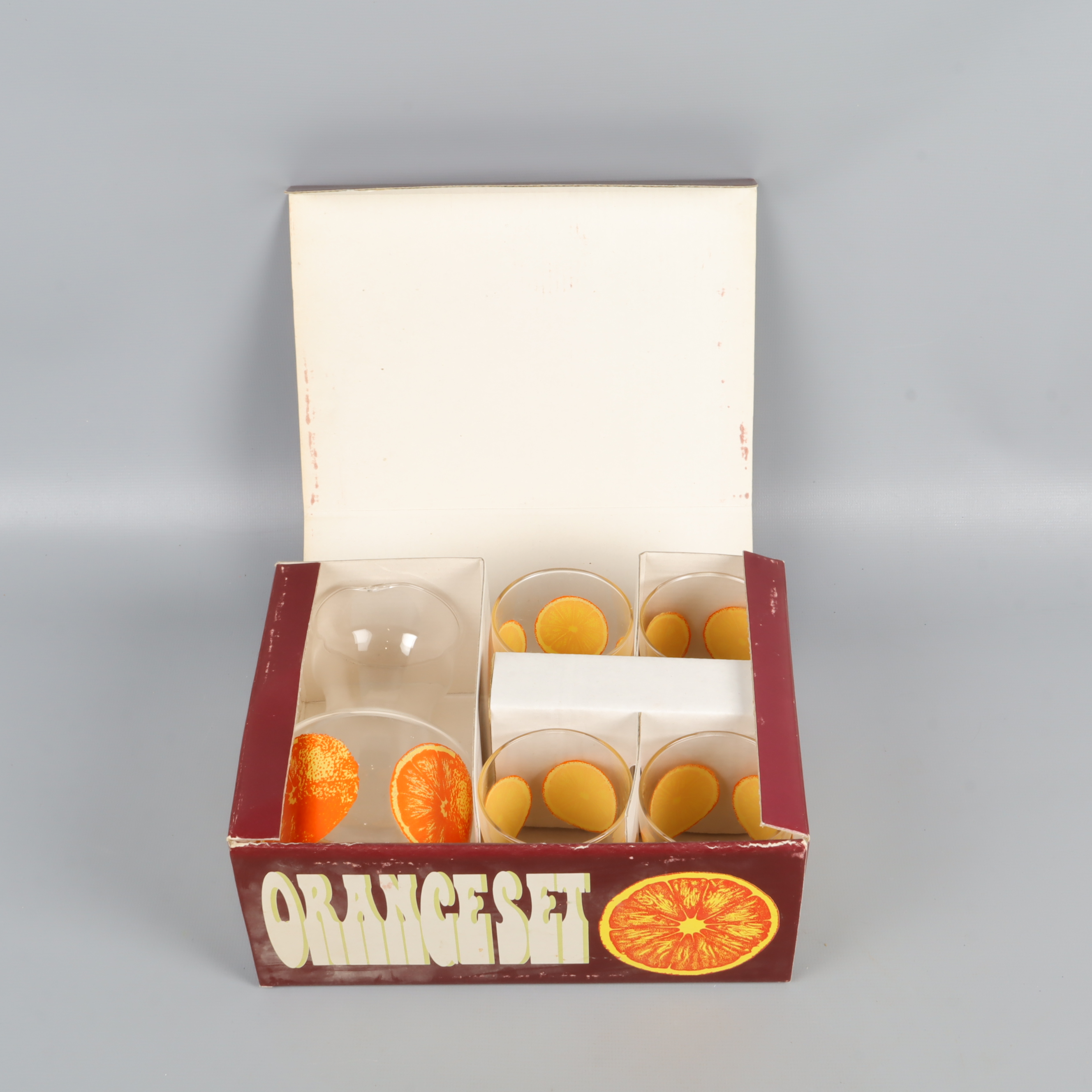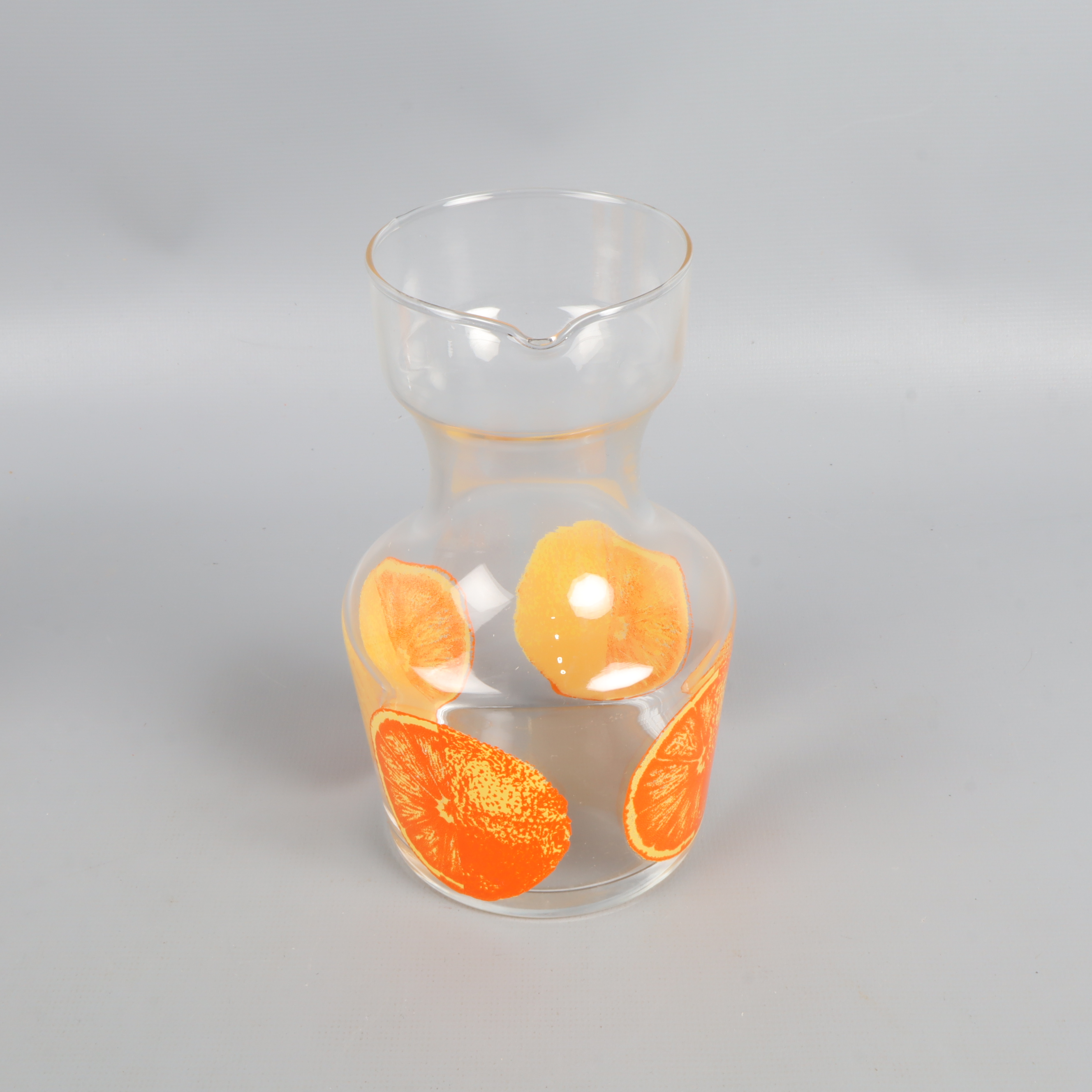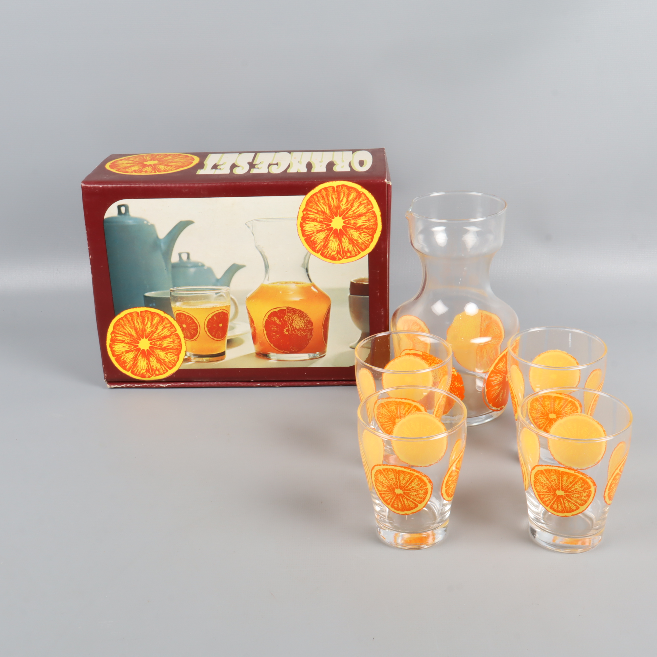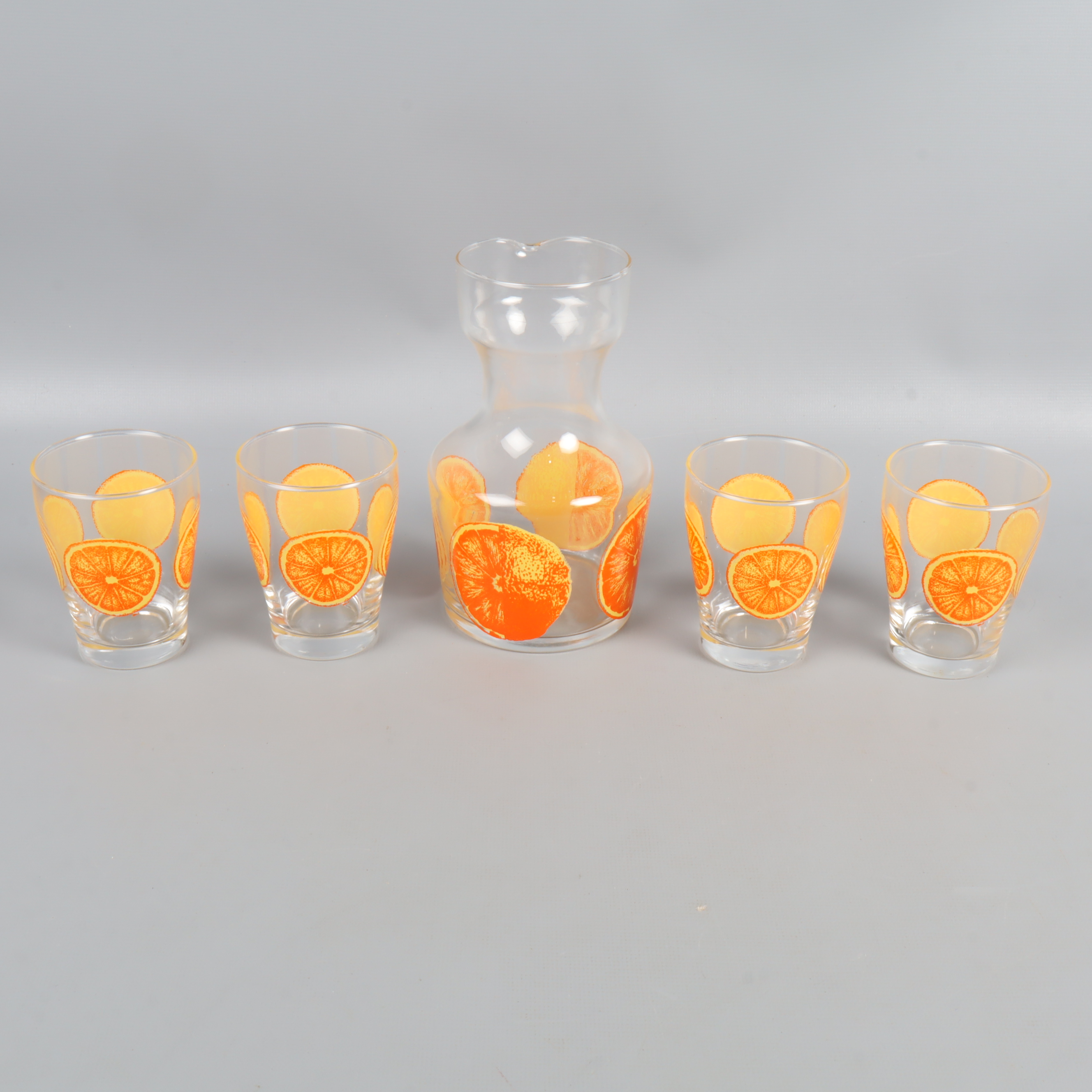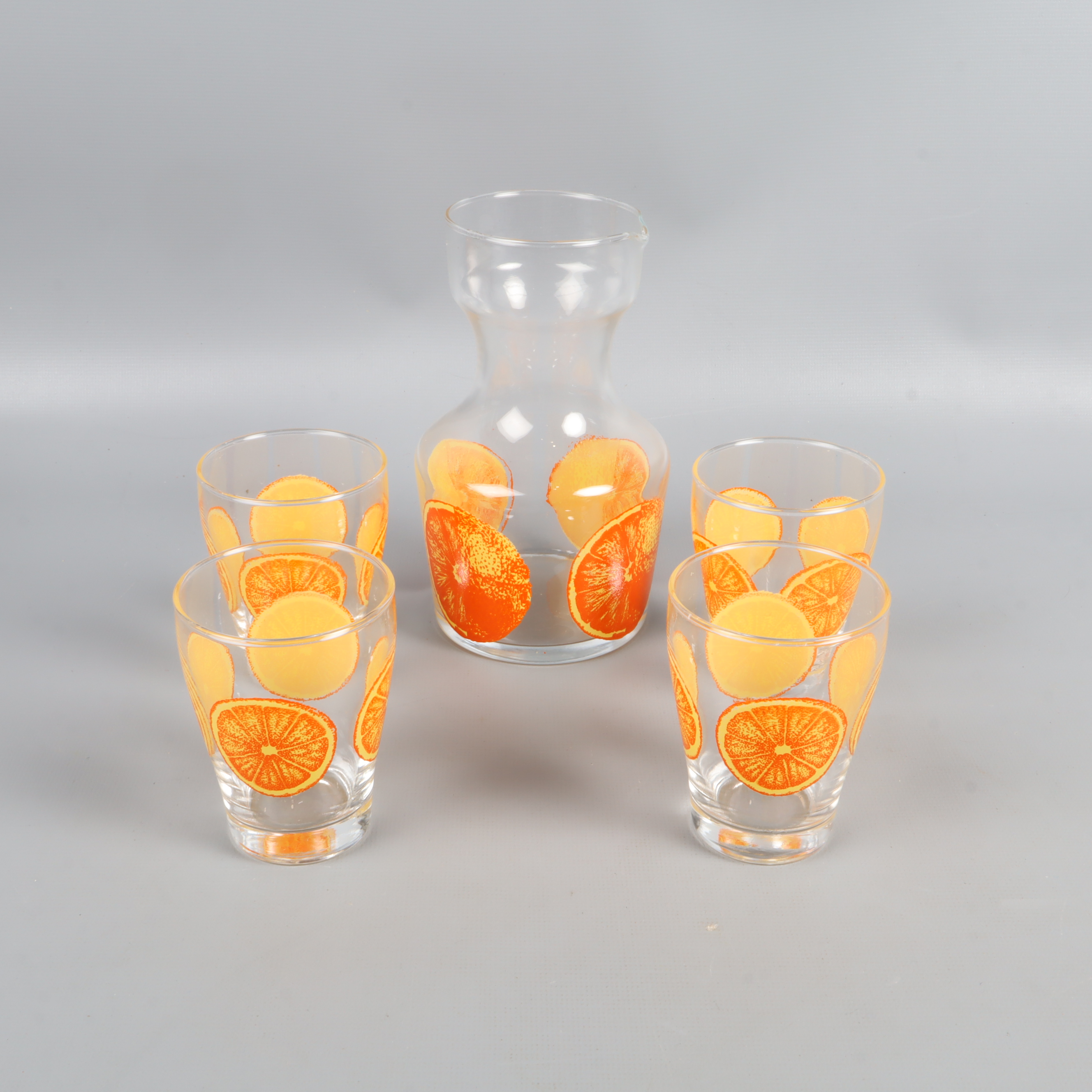 Set med karaff och fyra matchande glas, alla i transparent glas och dekorerade med färgstarka apelsinmotiv för en lekfull retro-känsla. Karaffen har klassisk form och glasen är raka och stadiga—perfekt att plocka fram för juice eller andra drycker vid frukostbordet.