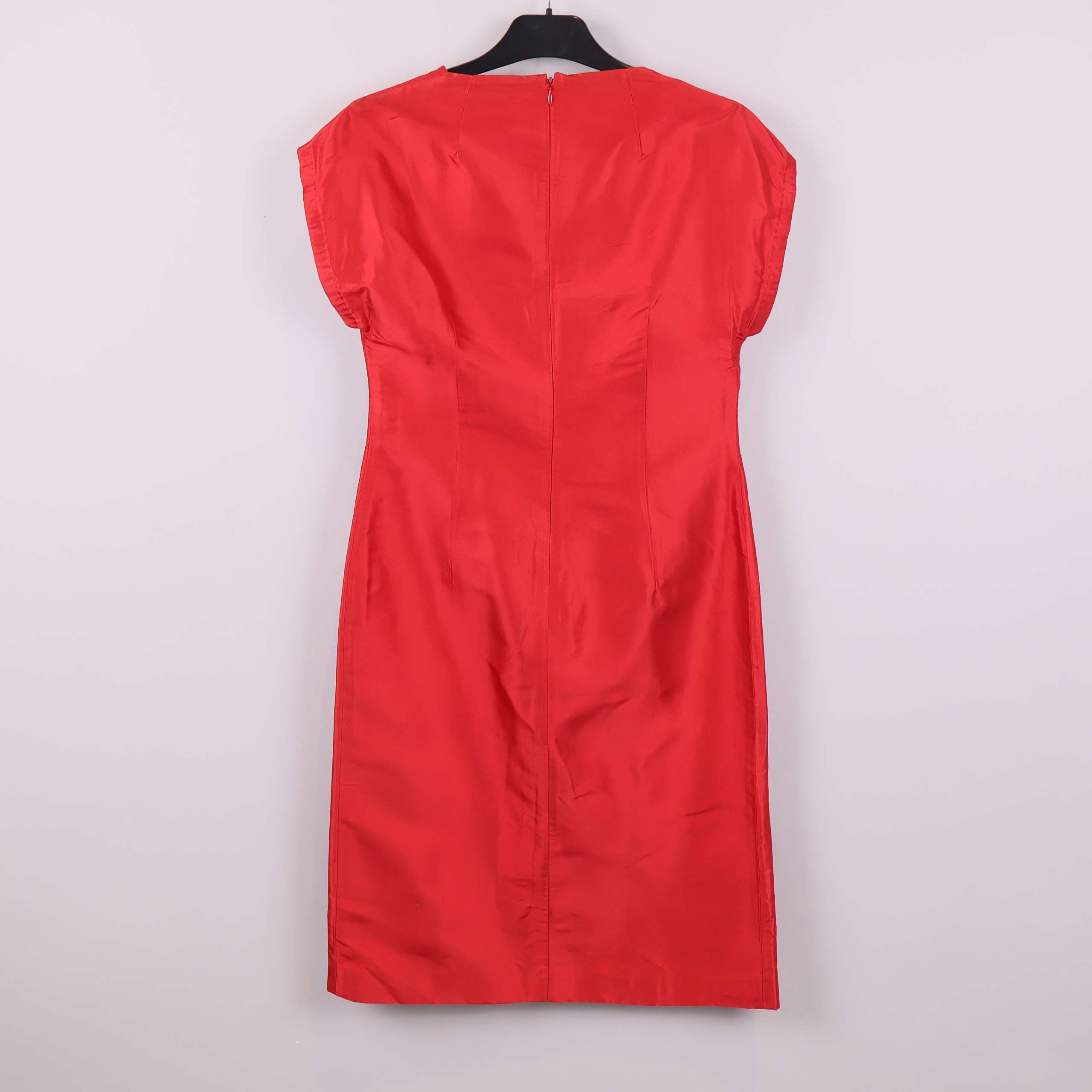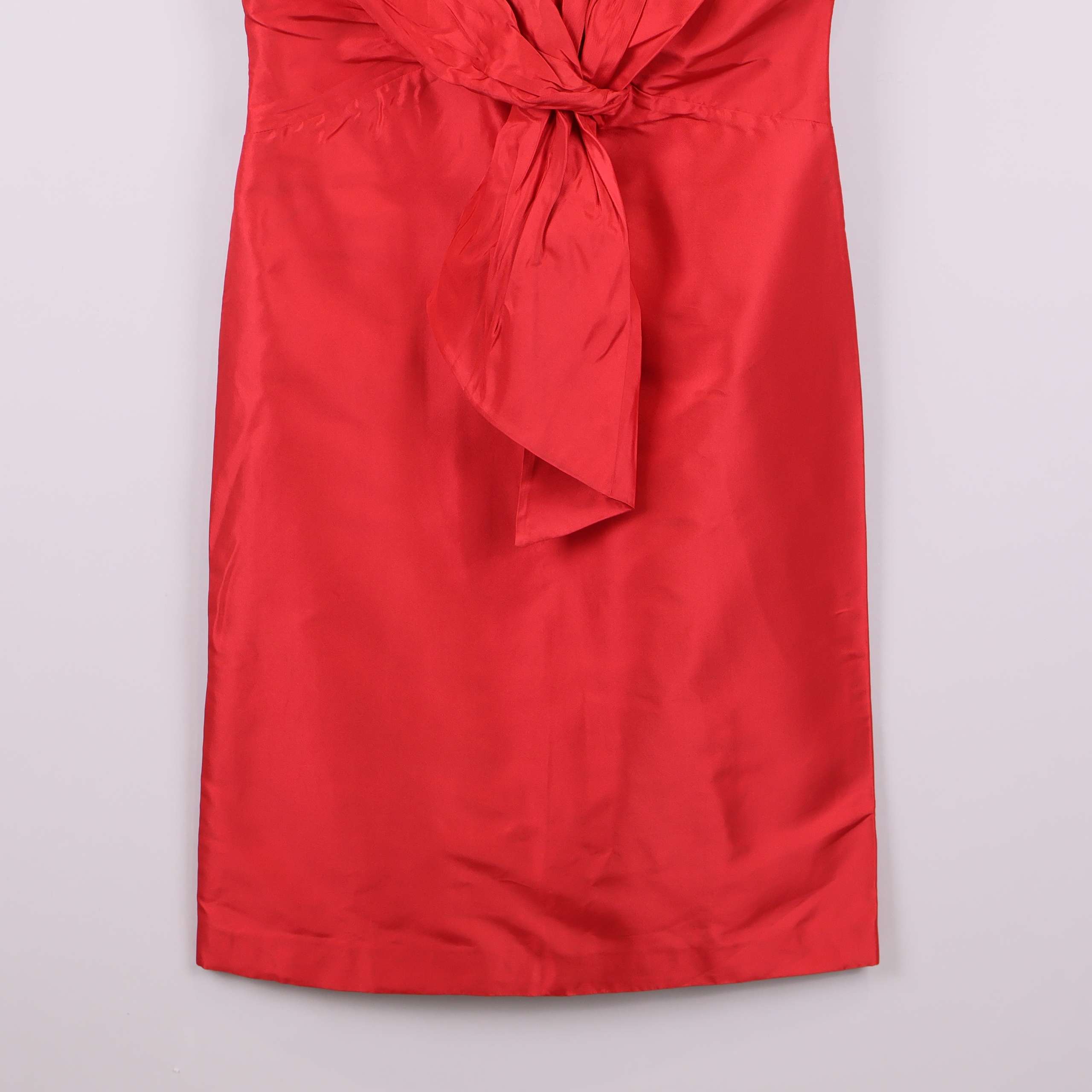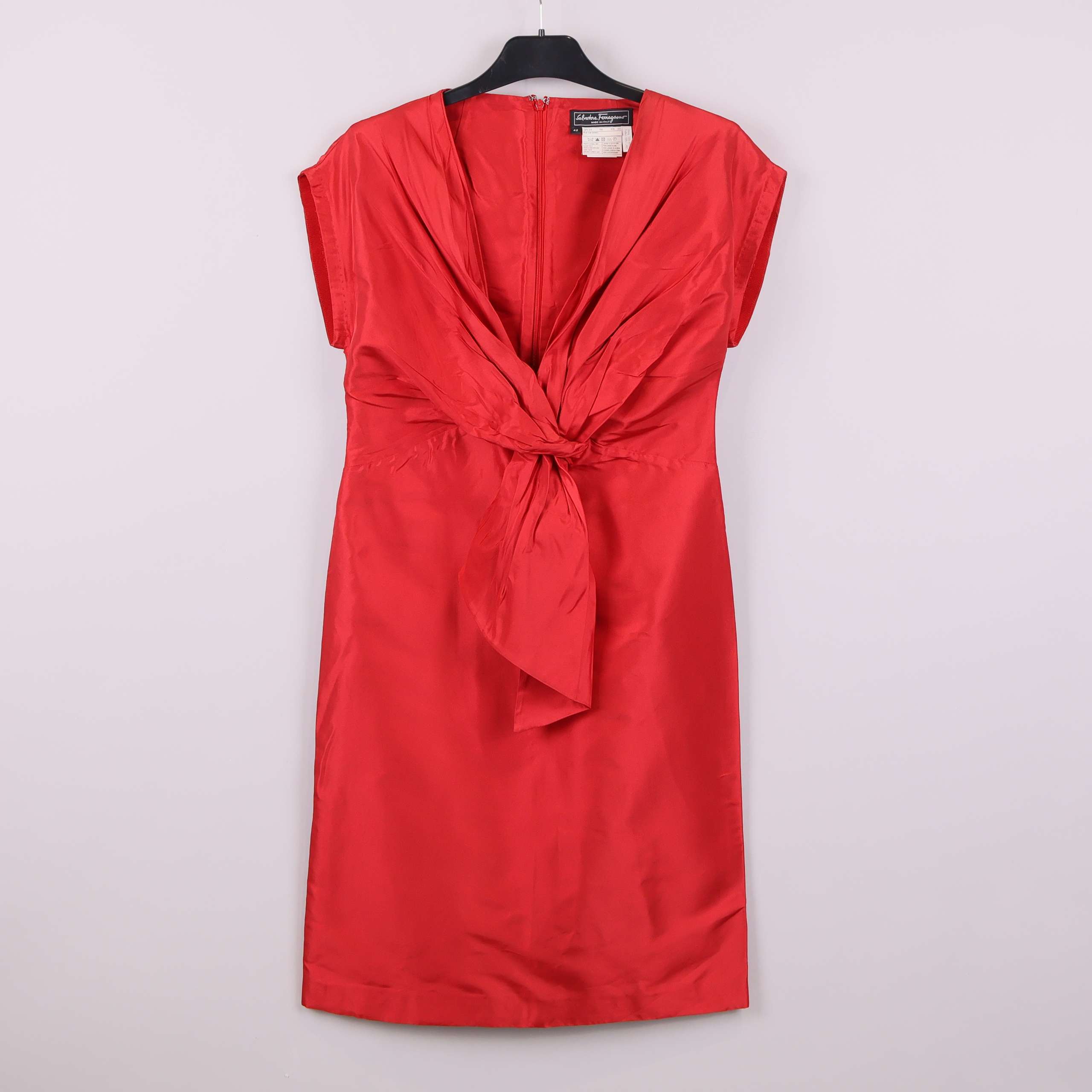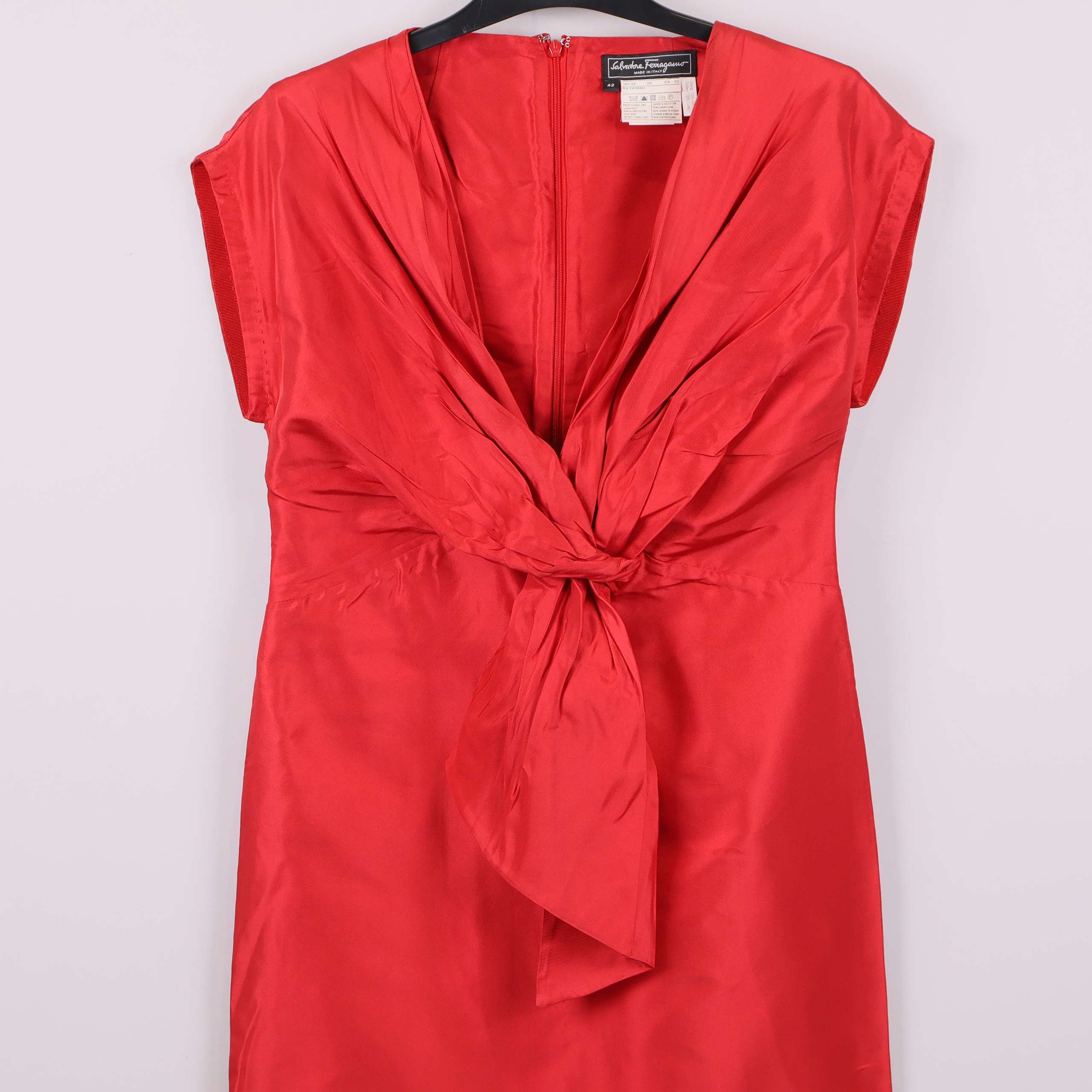 Elegant röd klänning från Salvatore Ferragamo med vacker knytdetalj framtill. Modellen har korta ärmar och djupt veckat tyg över bysten för en smickrande siluett. Tunt siden ger en lyxig känsla och slät yta.