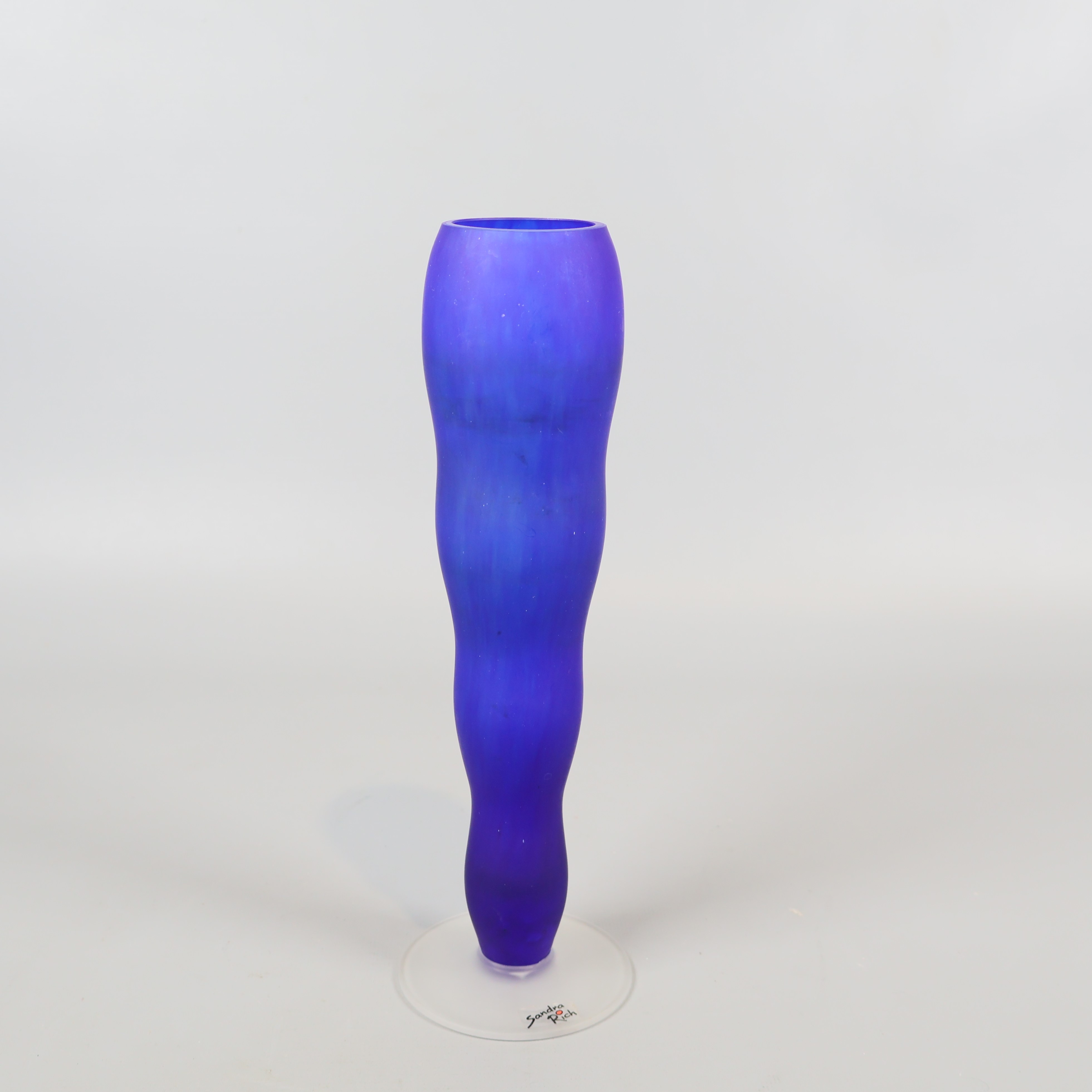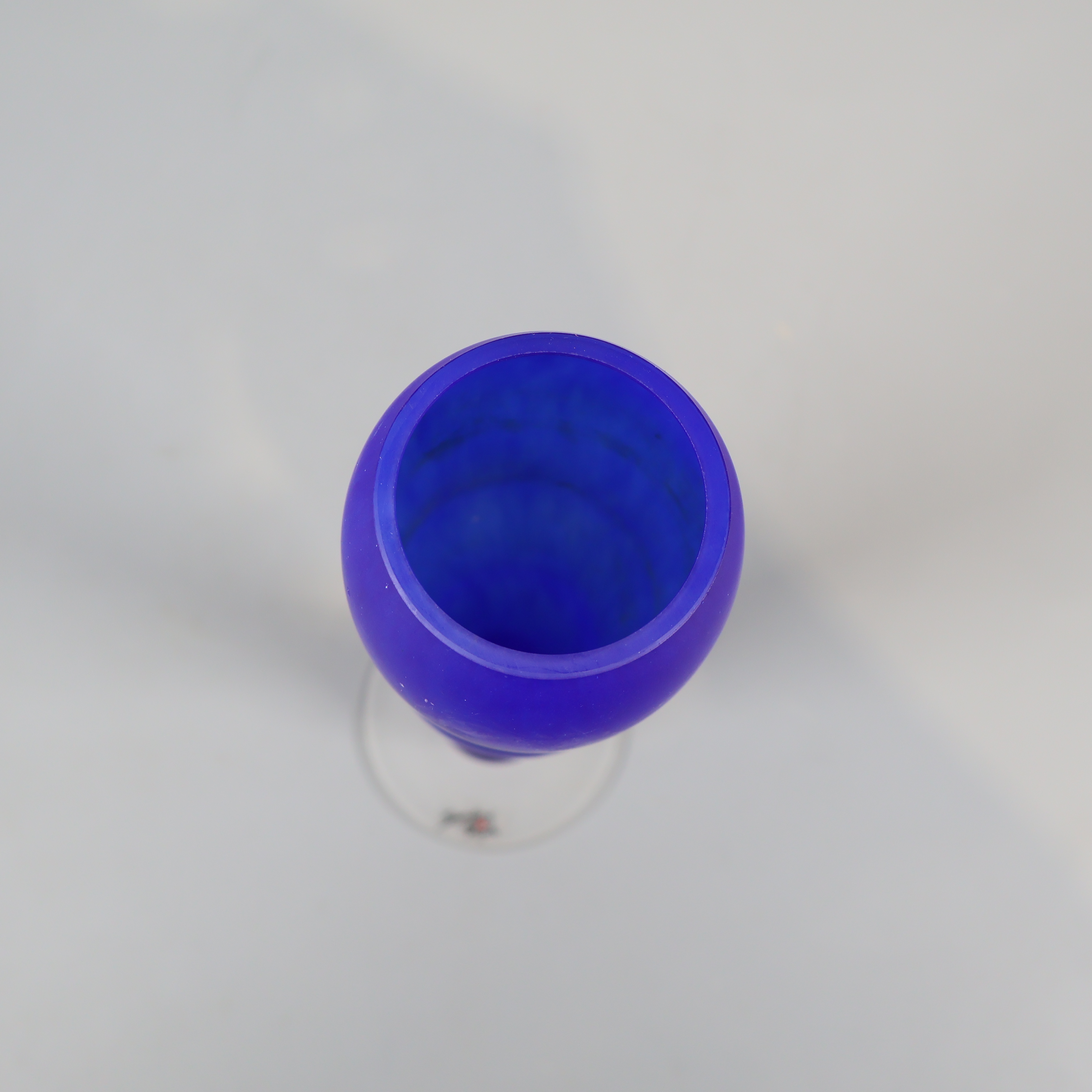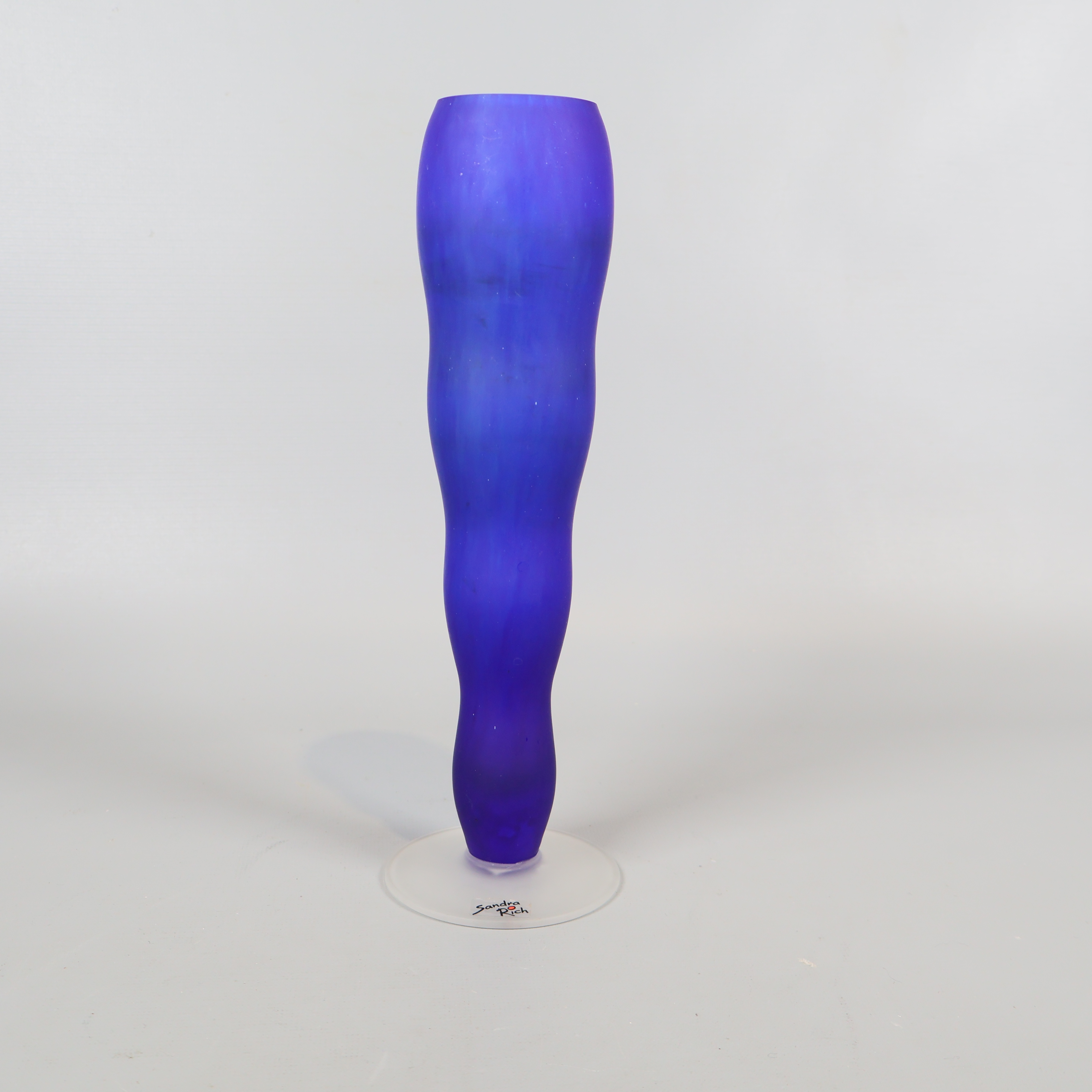 En hög, blå glasvas med unik vågform och matt finish. Designen skapar en modern look samtidigt som den transparenta glaskanten ger ett fräscht intryck.
