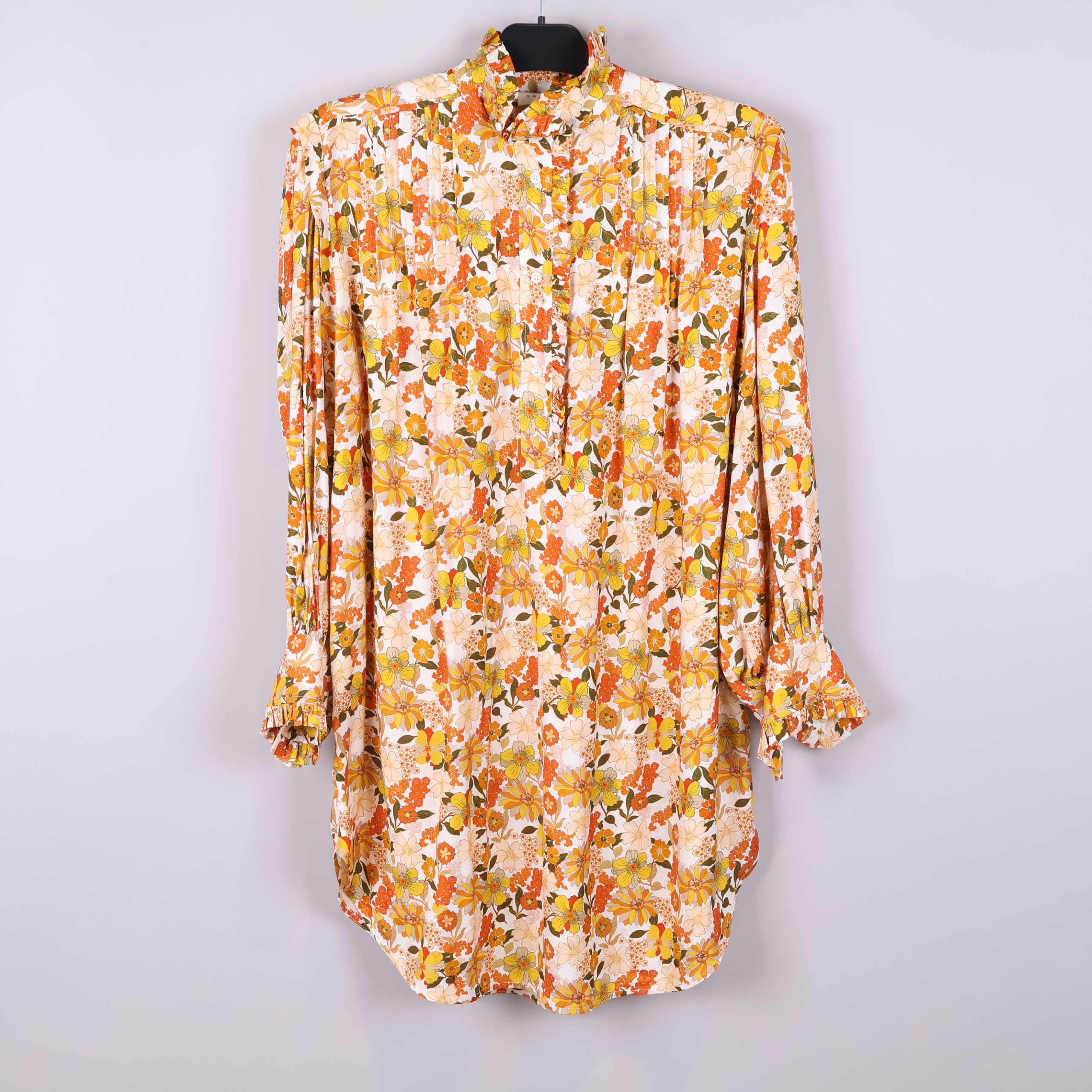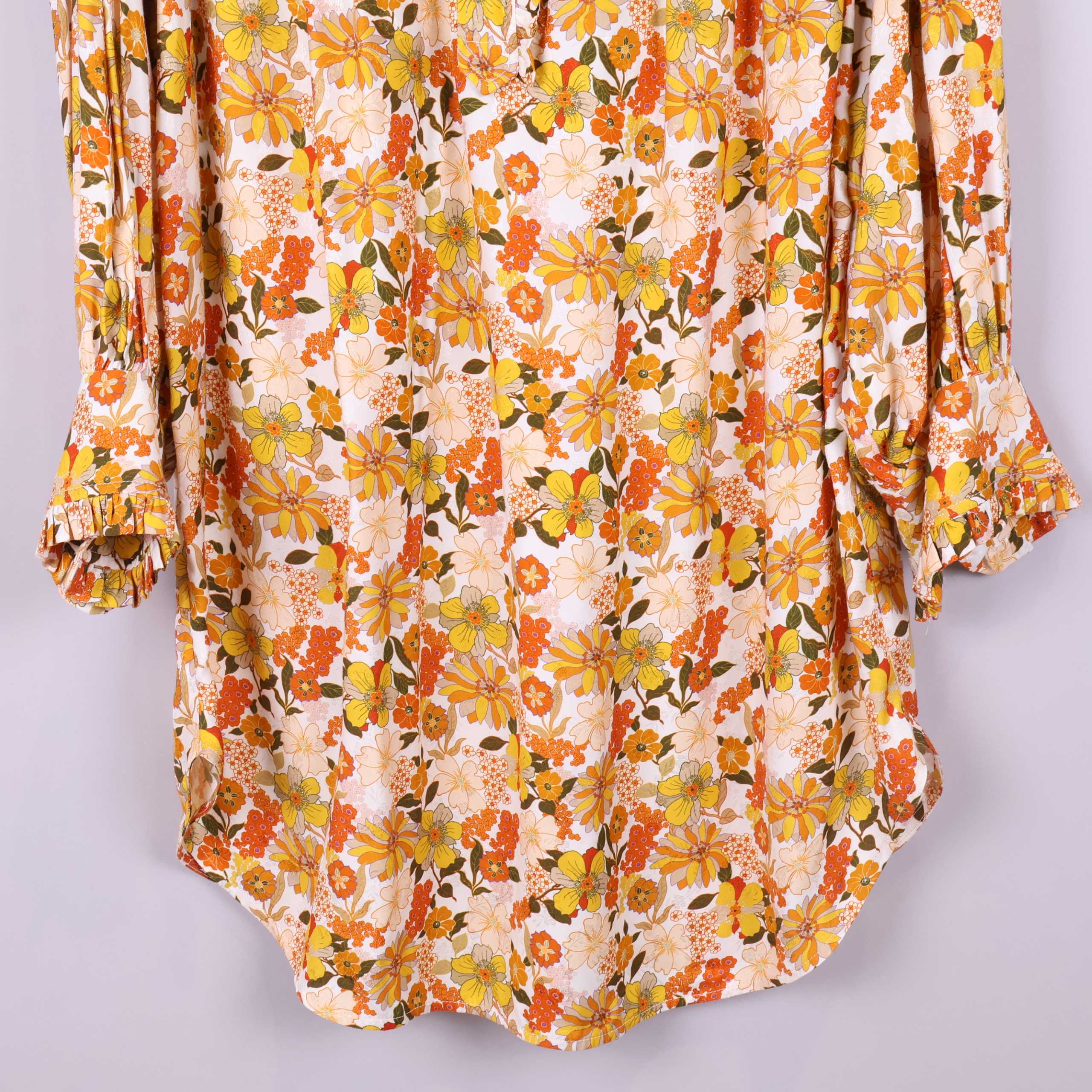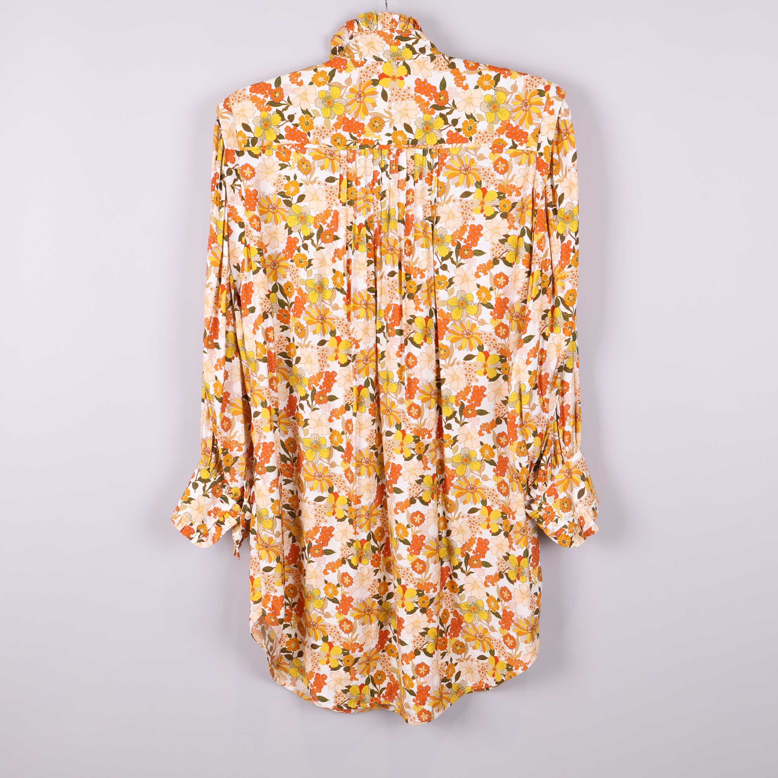 Ny skjortklänning med etiketter kvar. Den här färgglada skjortklänningen har ett härligt blommigt mönster i gult, orange och beige med en avslappnad fit och volangkant kring kragen. Långa ärmar med knäppta muddar och lätt böjt avslut ger en ledig och modern stil som funkar lika bra till vardags som till fest. Tunt, mjukt tyg i viskos ger fin känsla och rörelse.