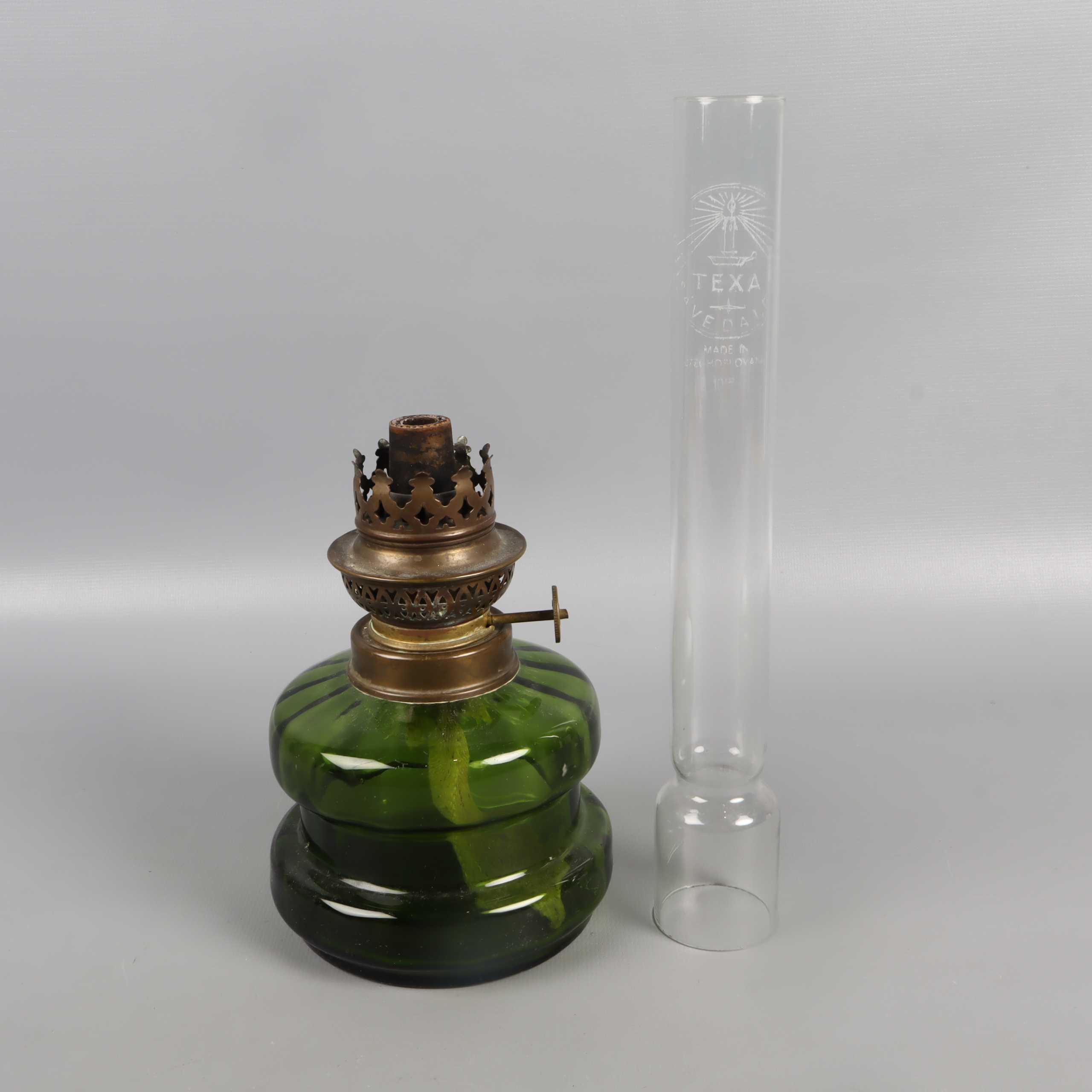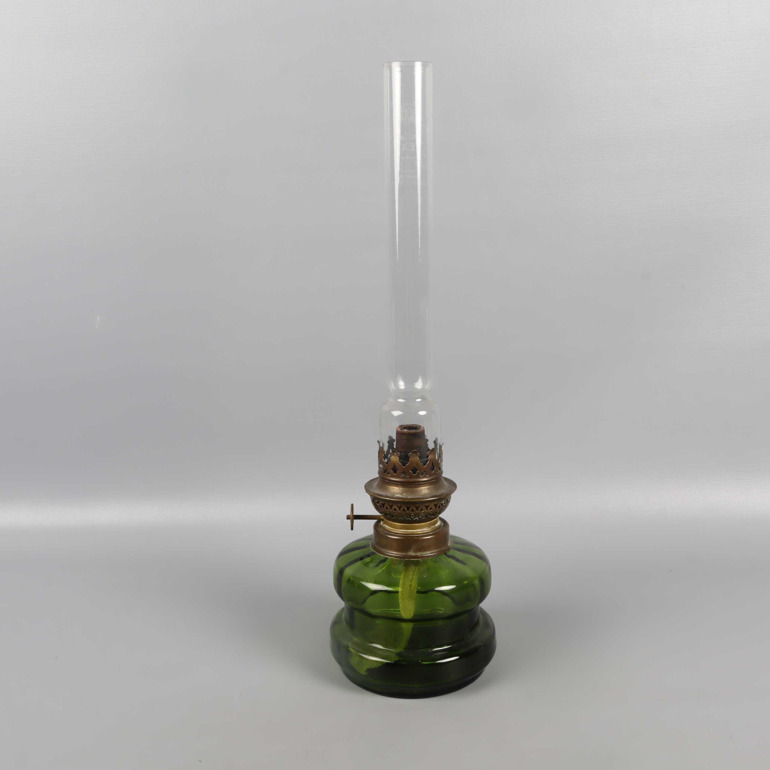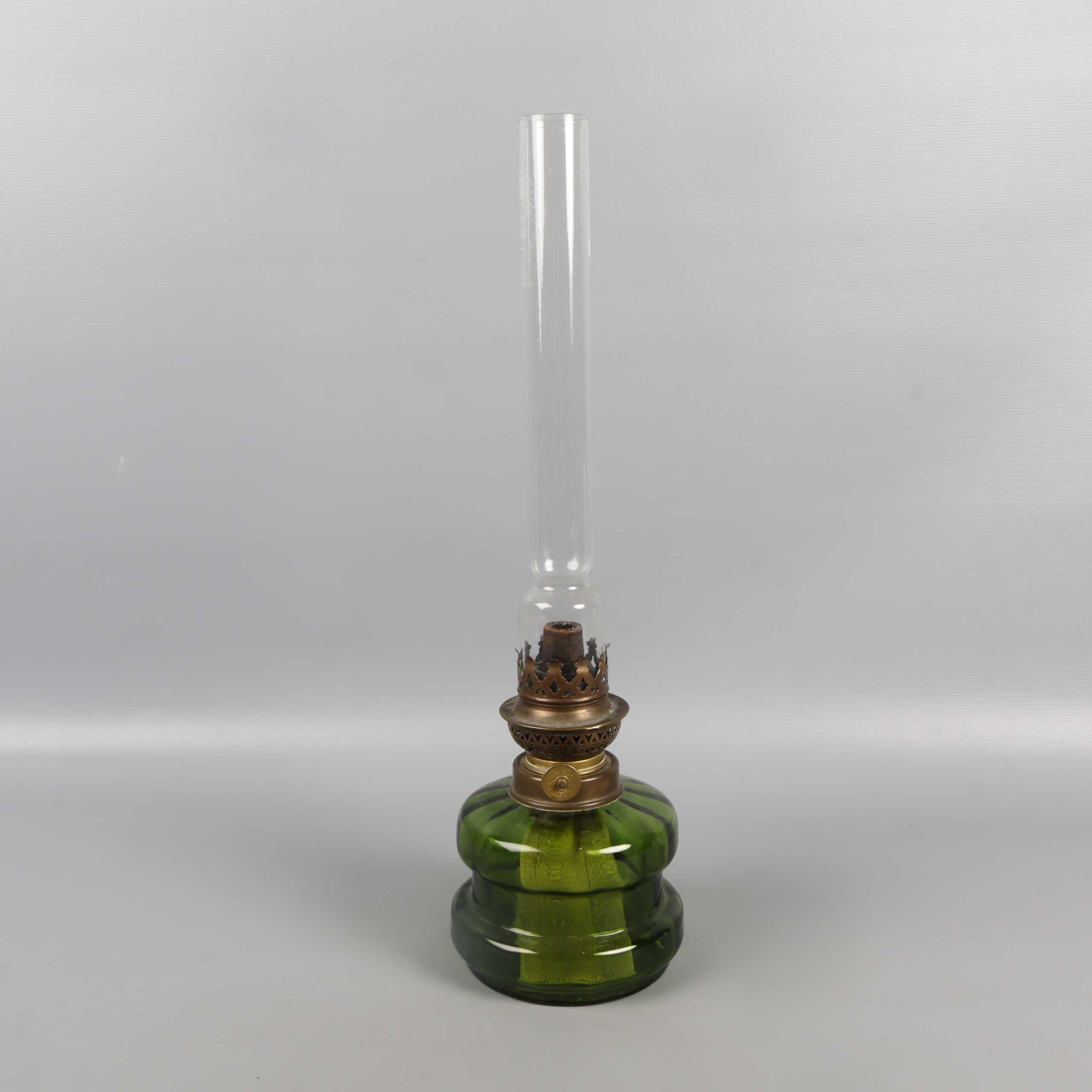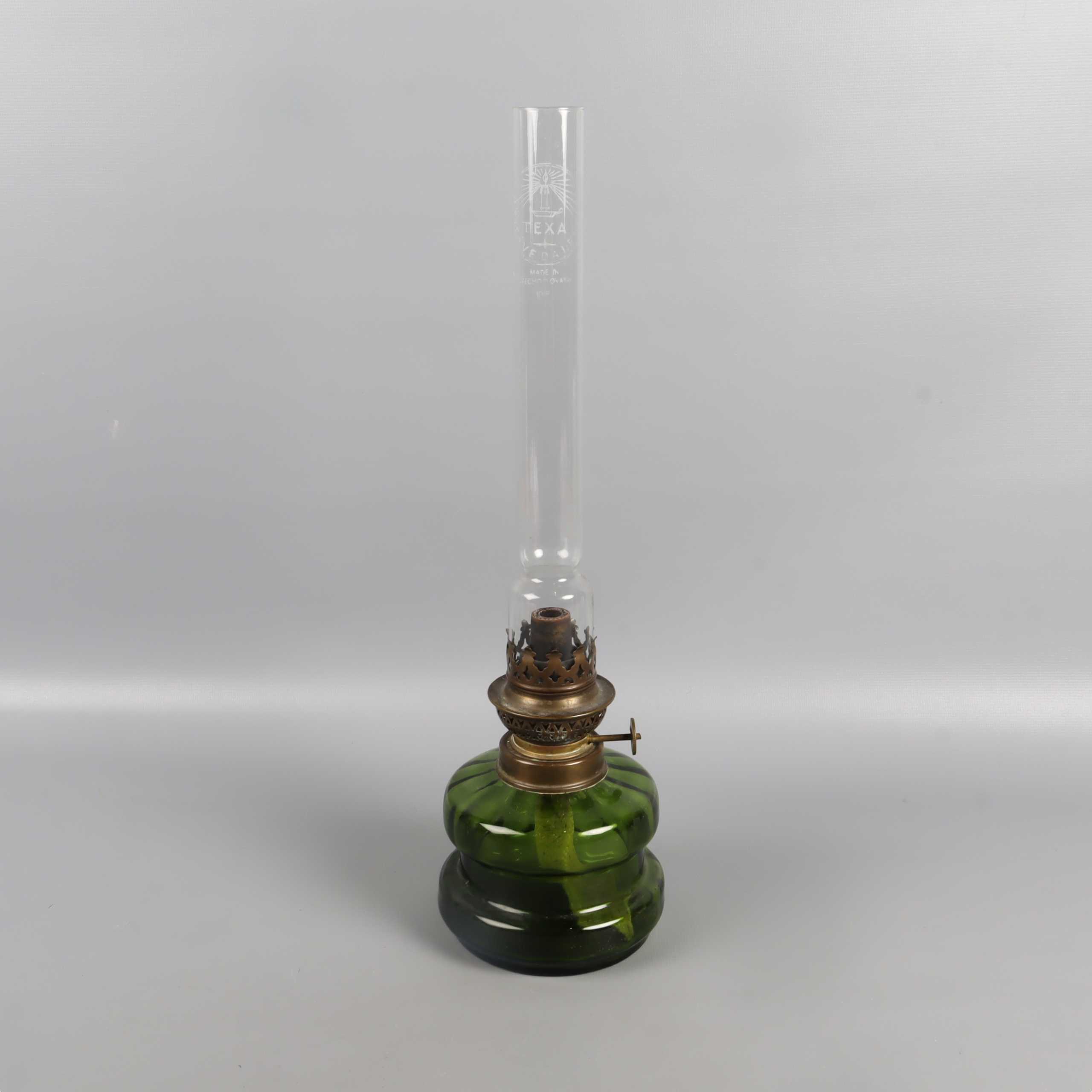 Klassisk fotogenlampa med vacker grön glasfot och högt klart glasrör. Messingfärgade detaljer ger en retro känsla som passar i många hem. Glasröret är märkt med Texa. Ett dekorativt och tidlöst inslag med vintage vibe.