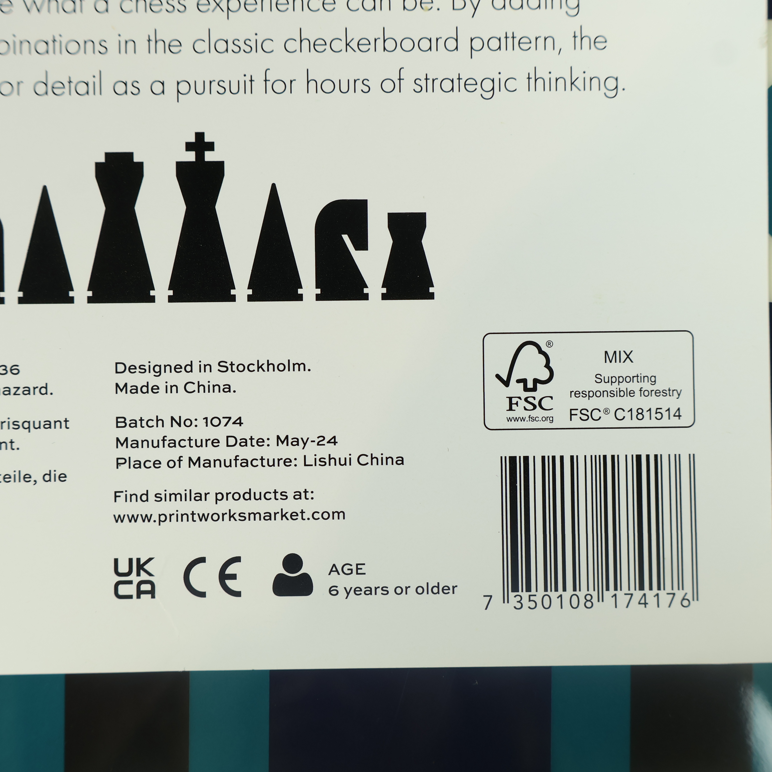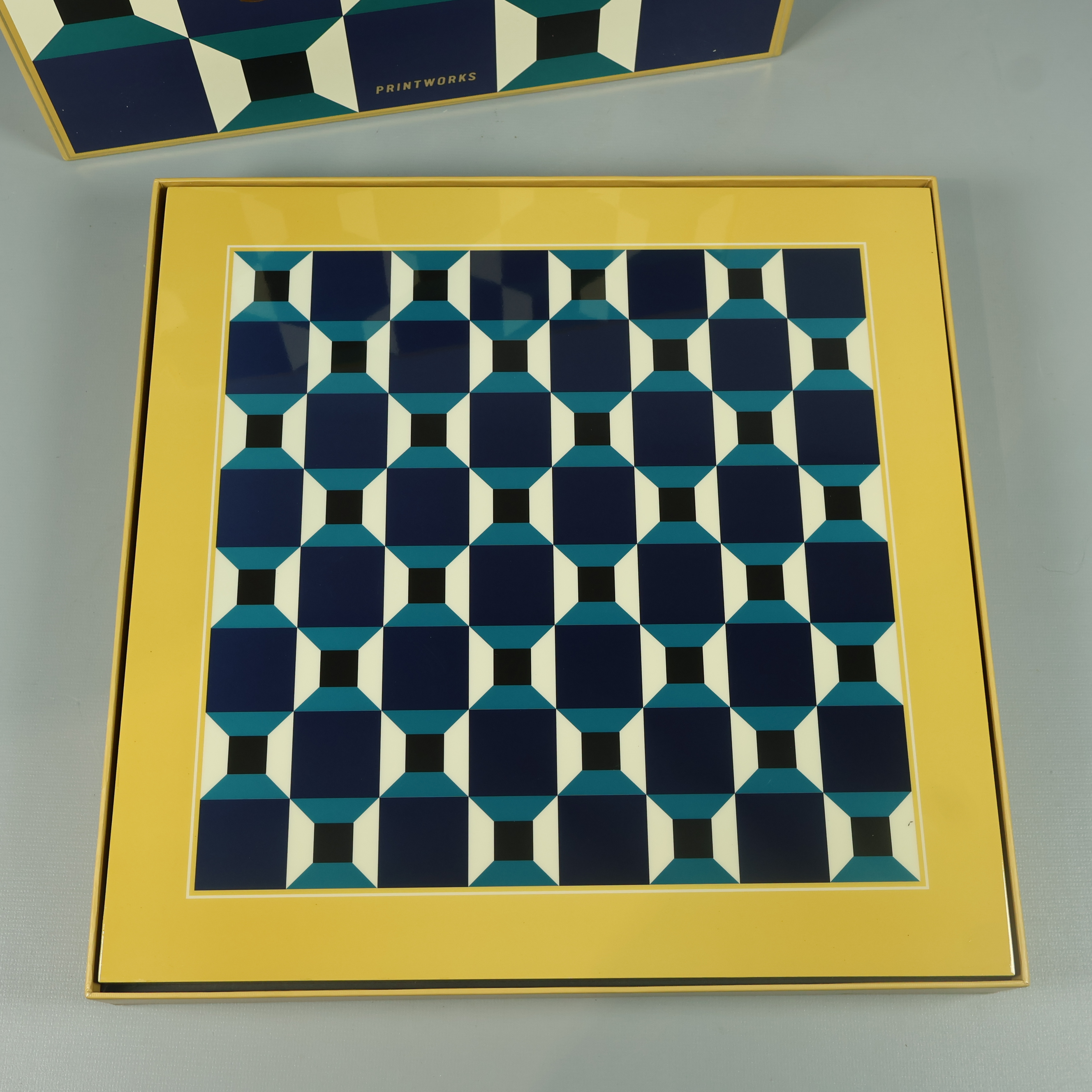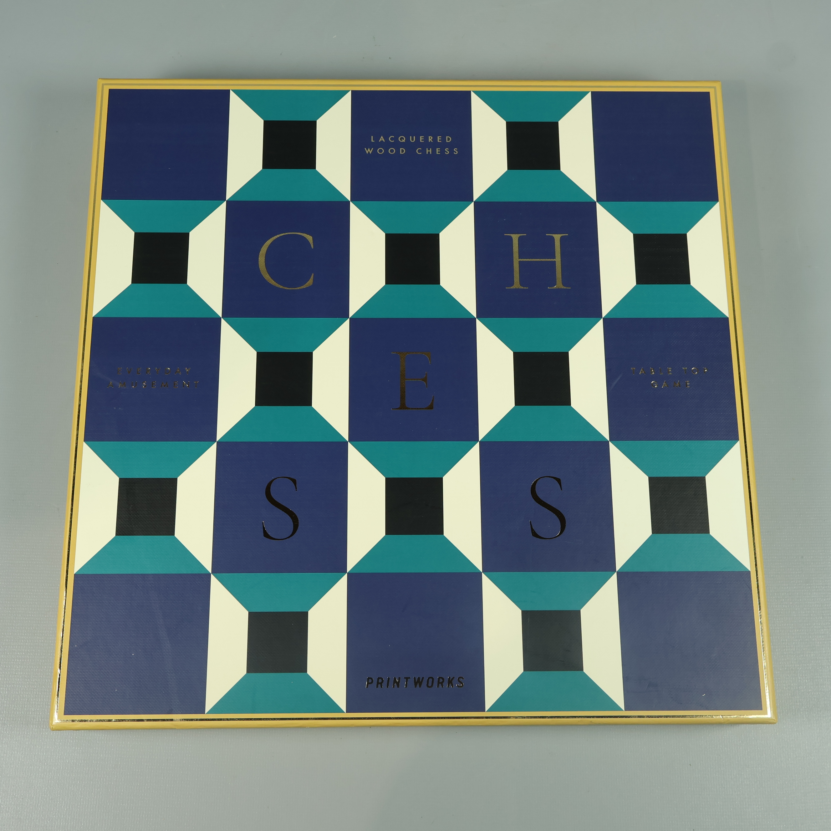 Schackspel i snygg, modern design med geometriskt mönstrad spelplan och schackpjäser i blått. Kubformad kartong med guldgul ram ger ett exklusivt intryck, perfekt för att stå framme även när spelet är över. En stilren detalj att ha hemma och en samlarfavorit för dig som gillar sällskapsspel.