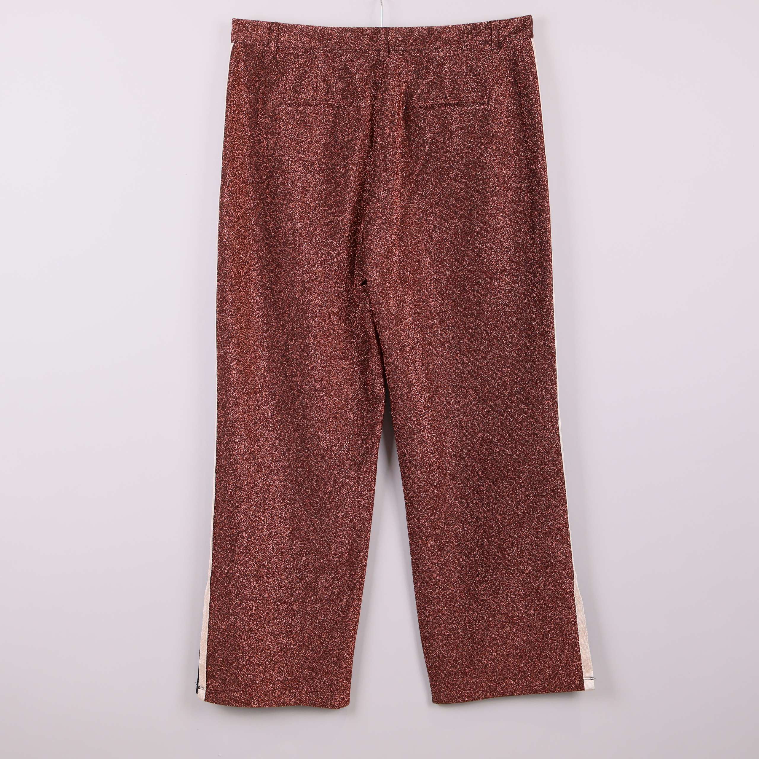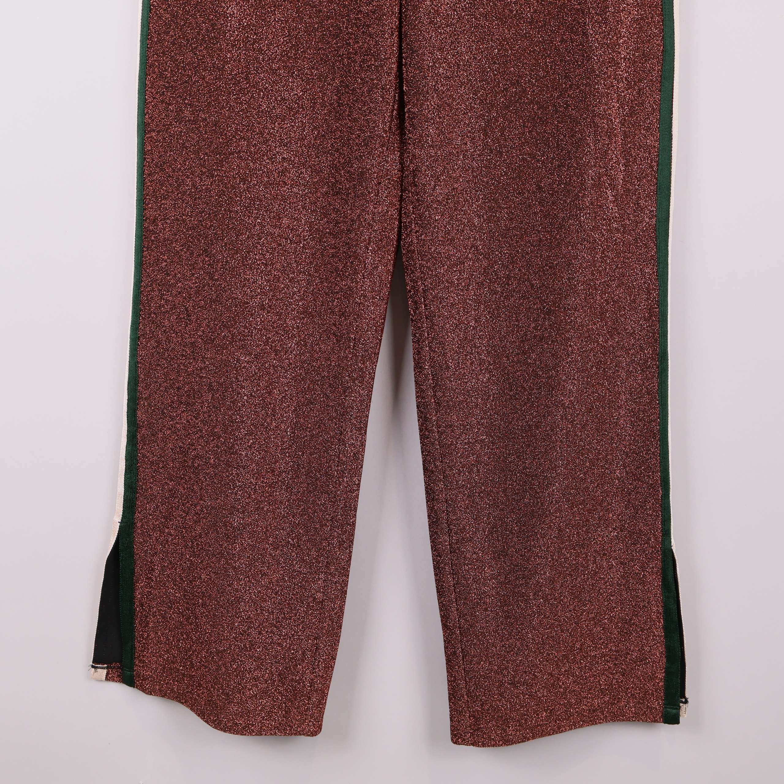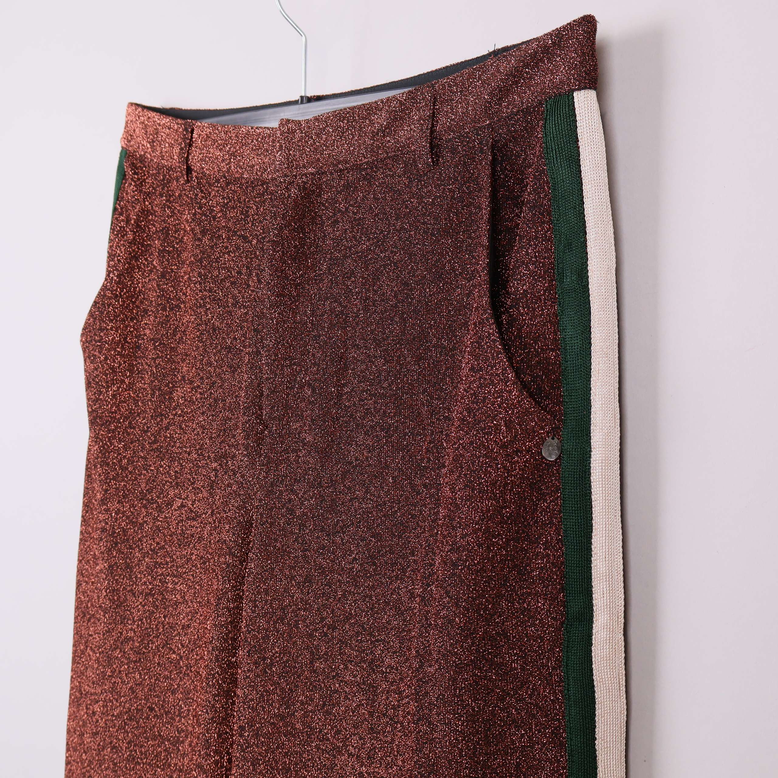 Vida byxor med en glittrande kopparfärg och kontrasterande ränder längs sidorna i grönt och vitt. Stilren design med slits nertill och raka ben, samt bekväma sidfickor.