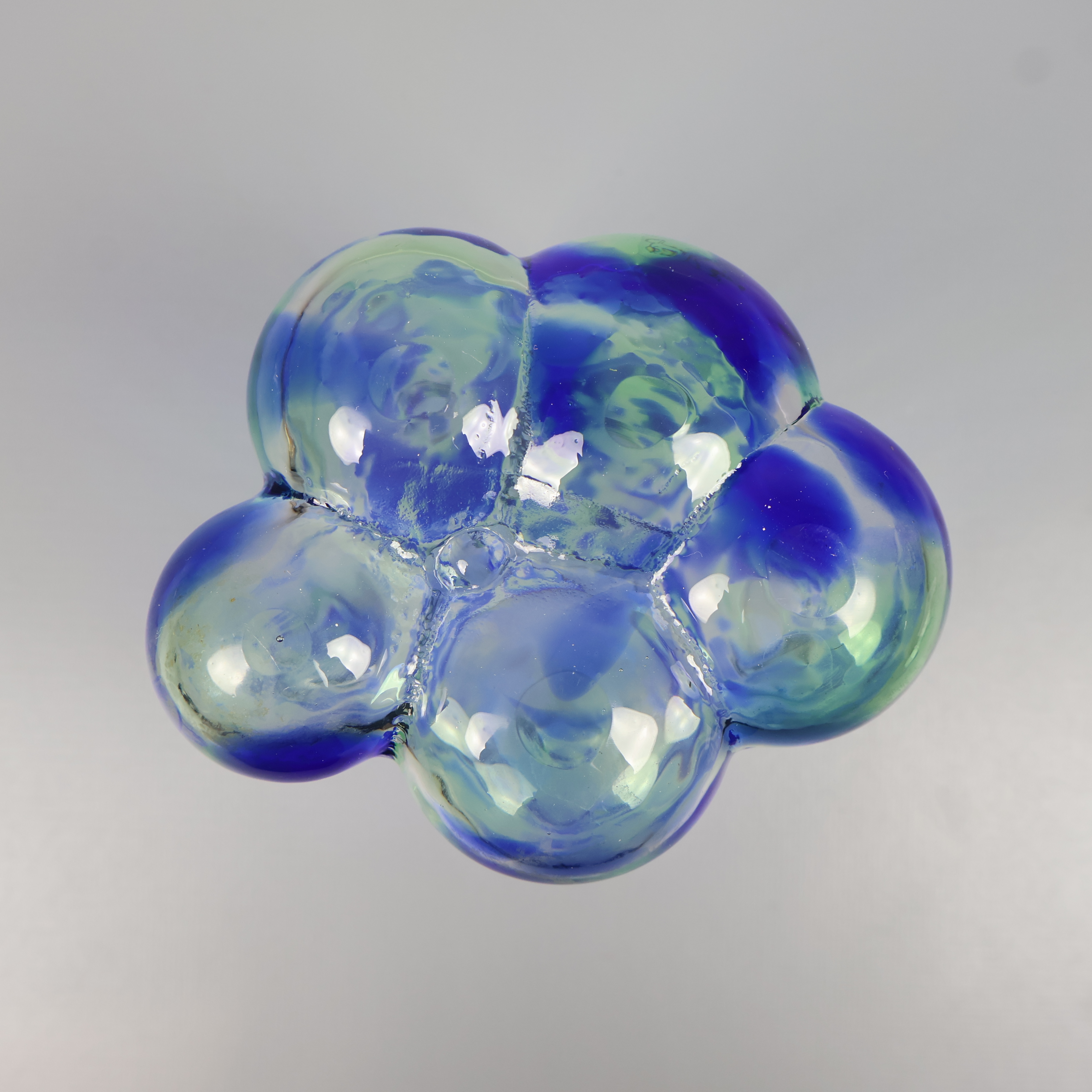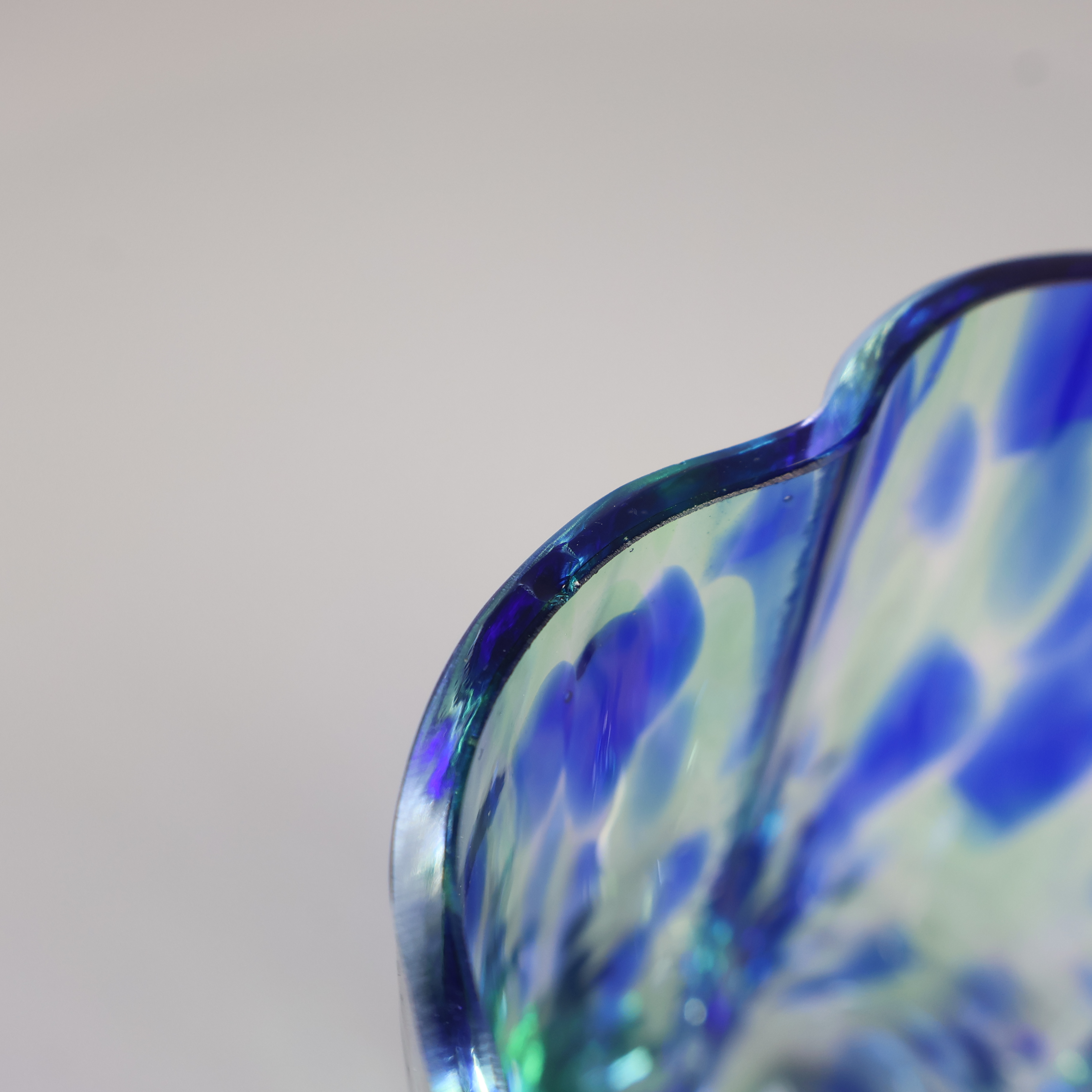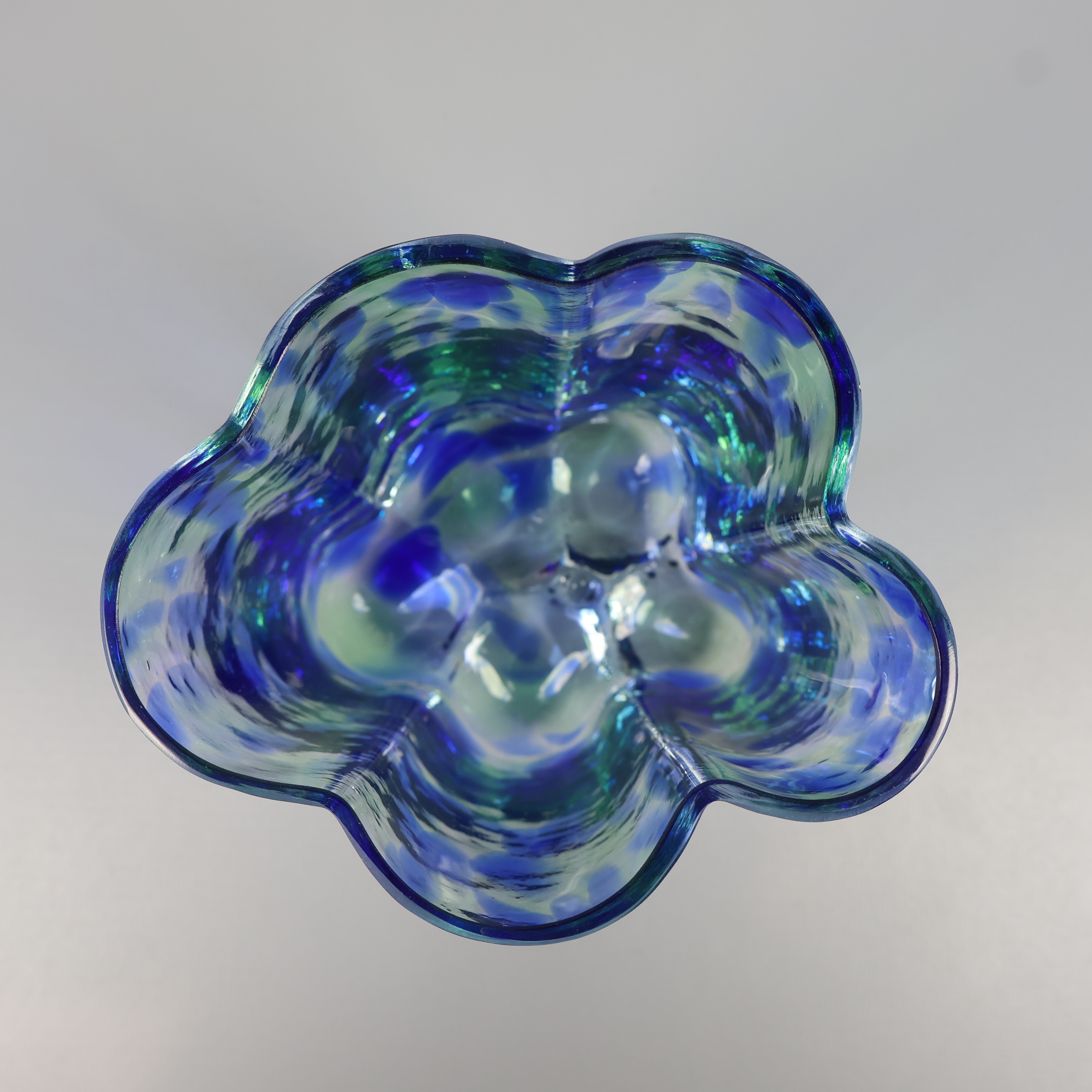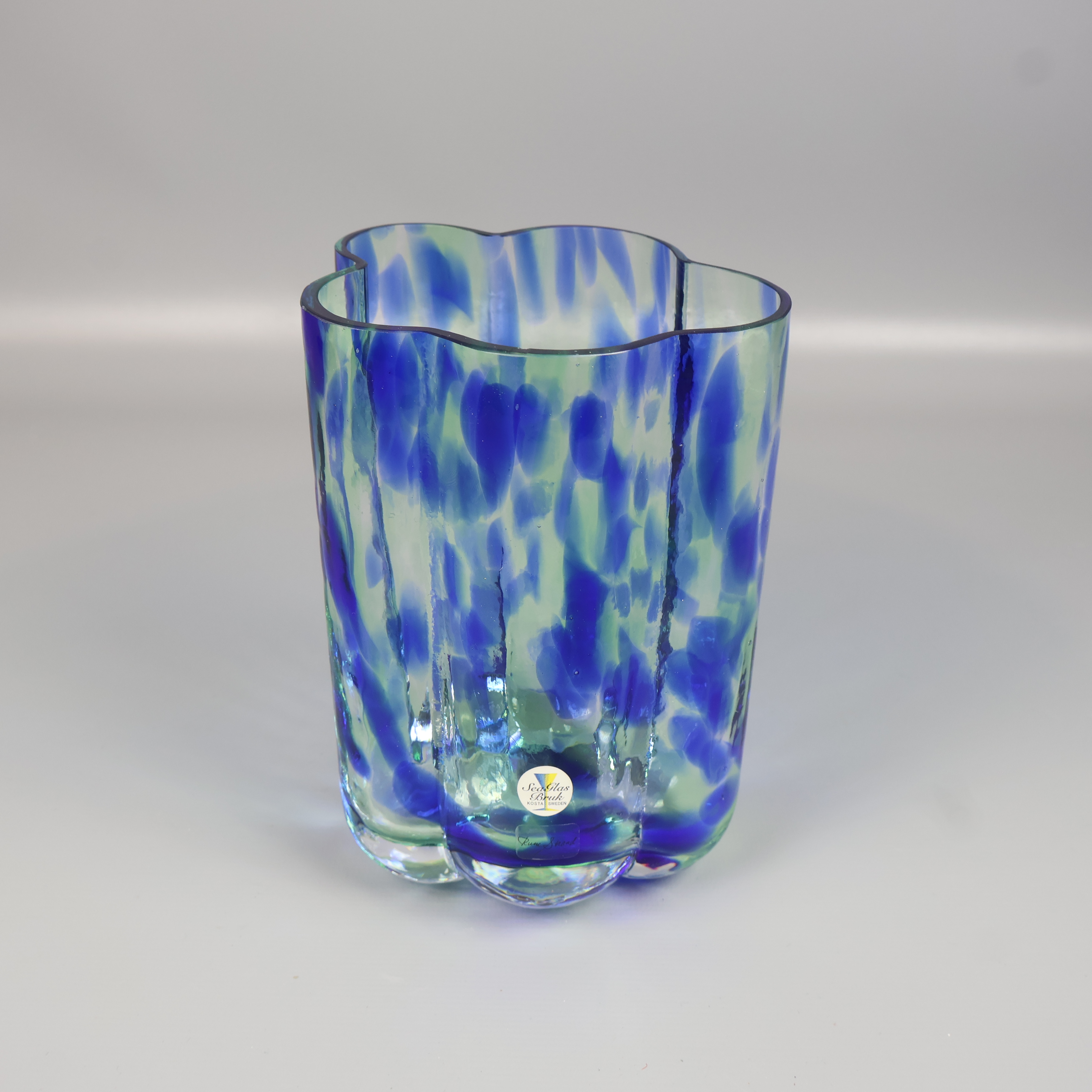 Vas i konstfullt blå spräckligt glas med organiskt, böljande form och rundad blomliknande botten.