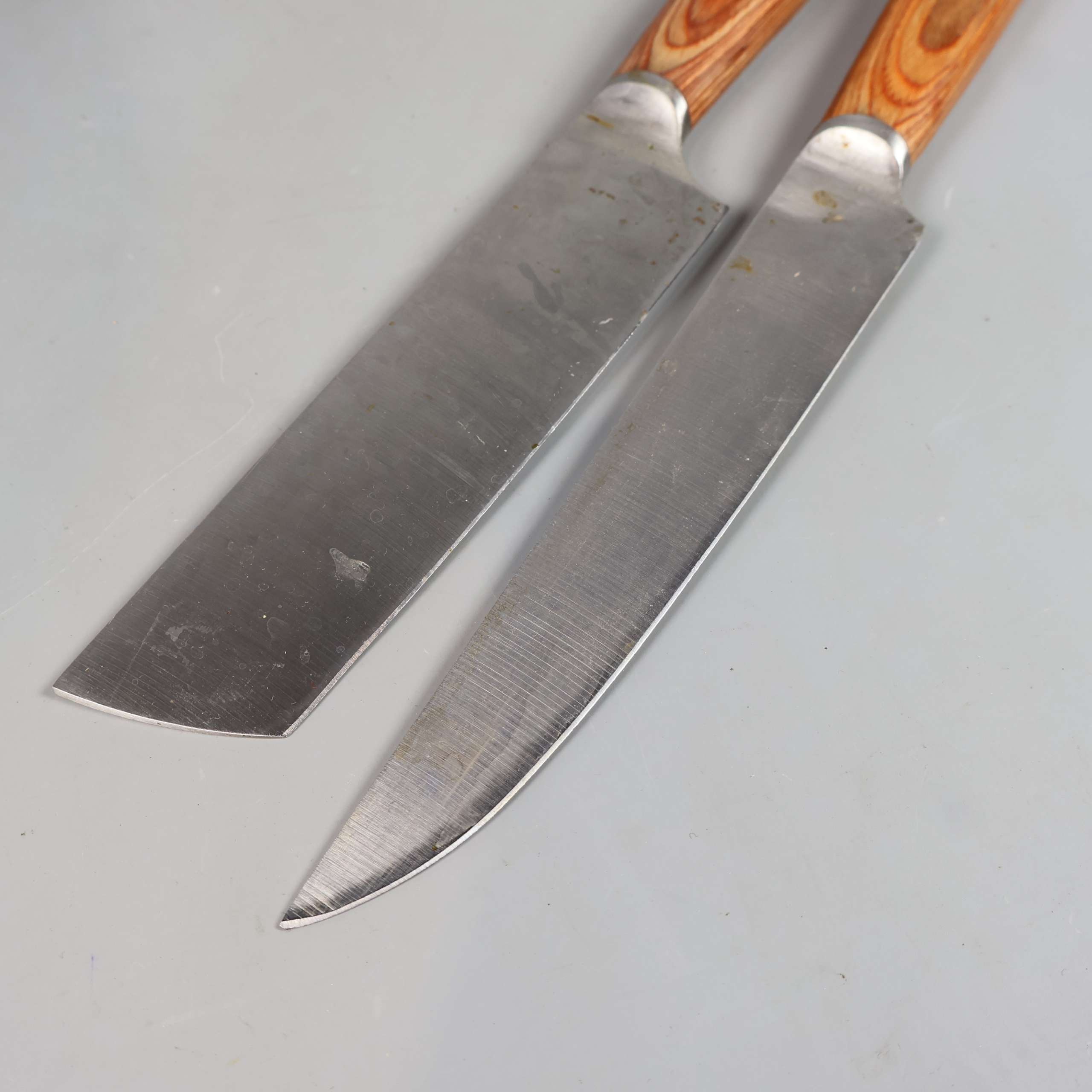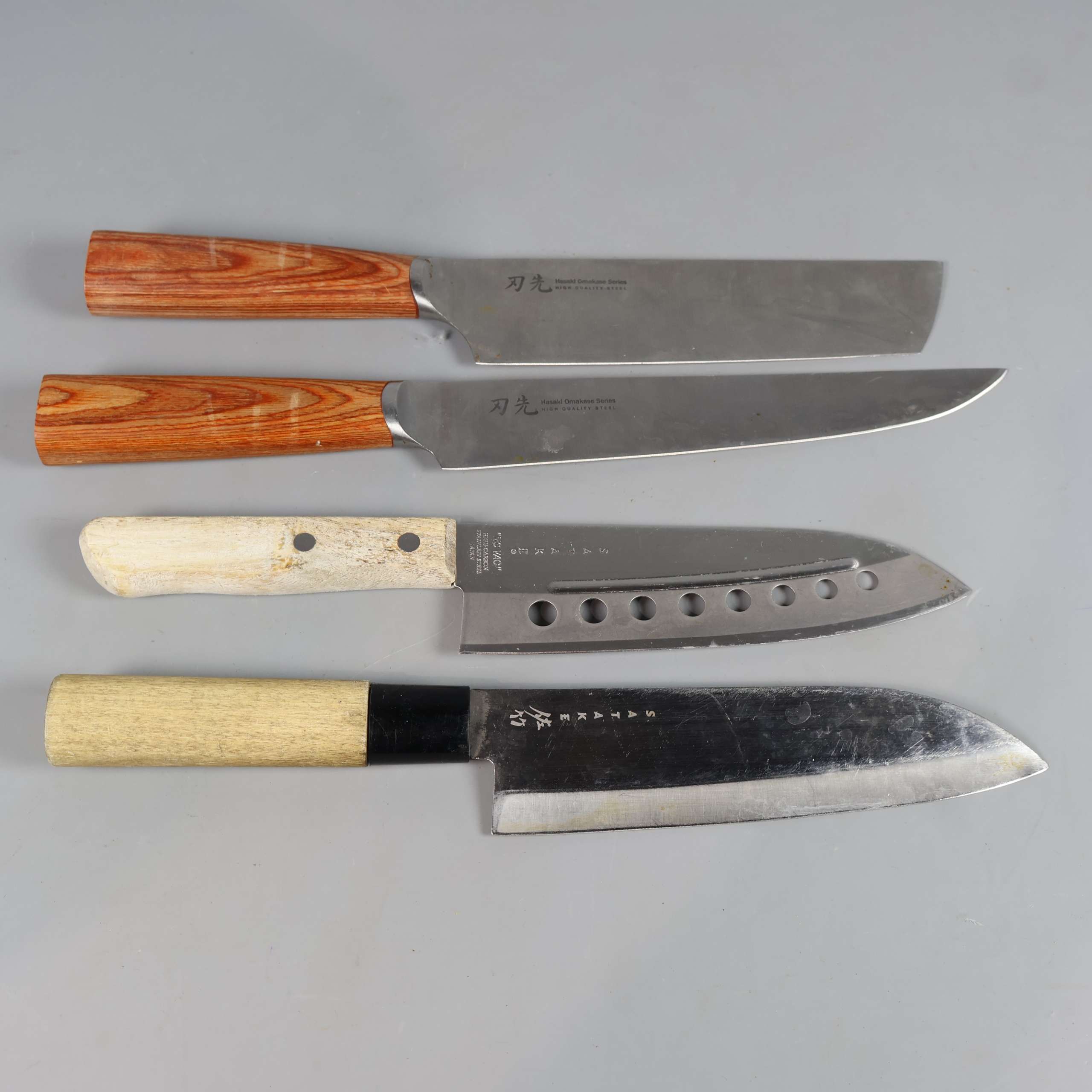 NO VAC och Hasaki Omakase, SATAKE. Japanskt knivset med fyra distinkta köksknivar, två med ljusa träskaft och två med mörkare trälook. Klassisk design med släta och perforerade blad, passar dig som uppskattar både funktion och estetik i köket. Mix av traditionell och modern stilkänsla.