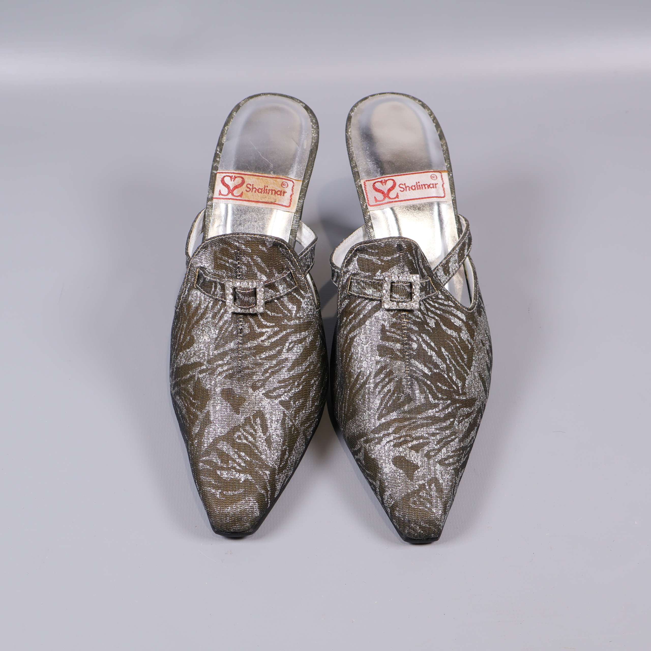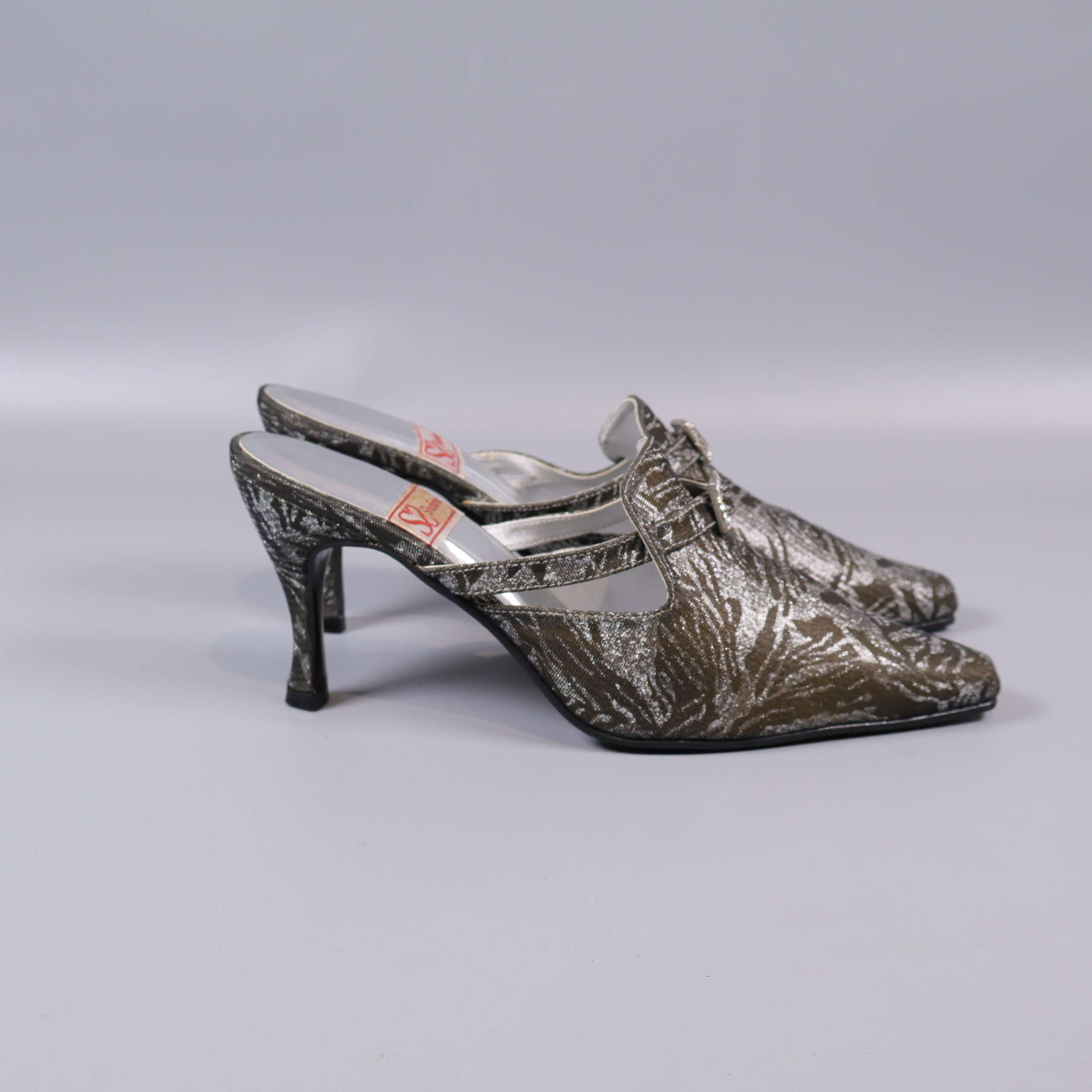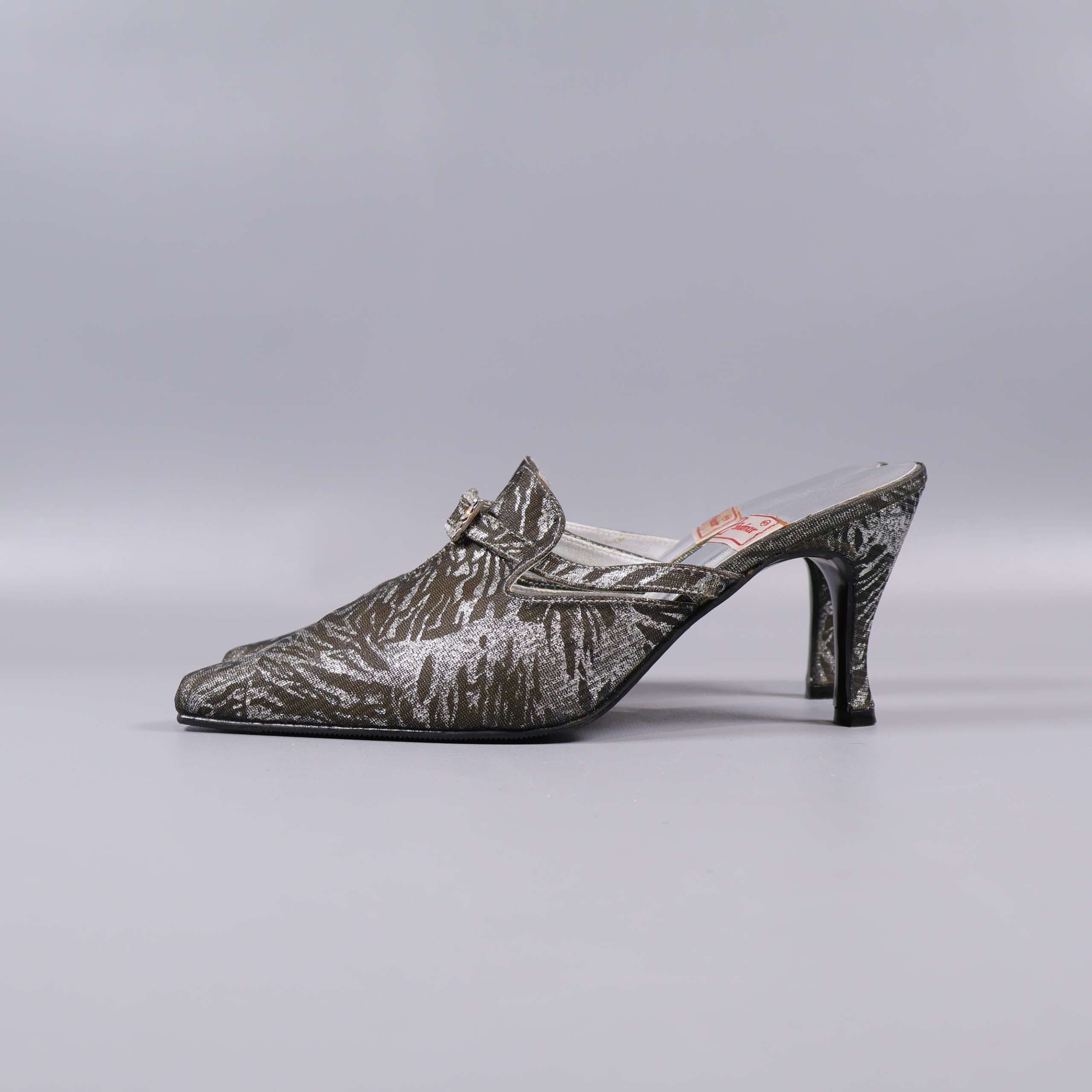 Dessa unika klackskor har spetsig tå och dekorativt mönster i metallic-glansig finish. Skorna har klassisk mule-modell med öppen häl, ett elegant spänne över vristen och mönstrad ovandel som ger ett vintagedoftande intryck. Perfekta för dig som vill addera en touch av glamour till din outfit.