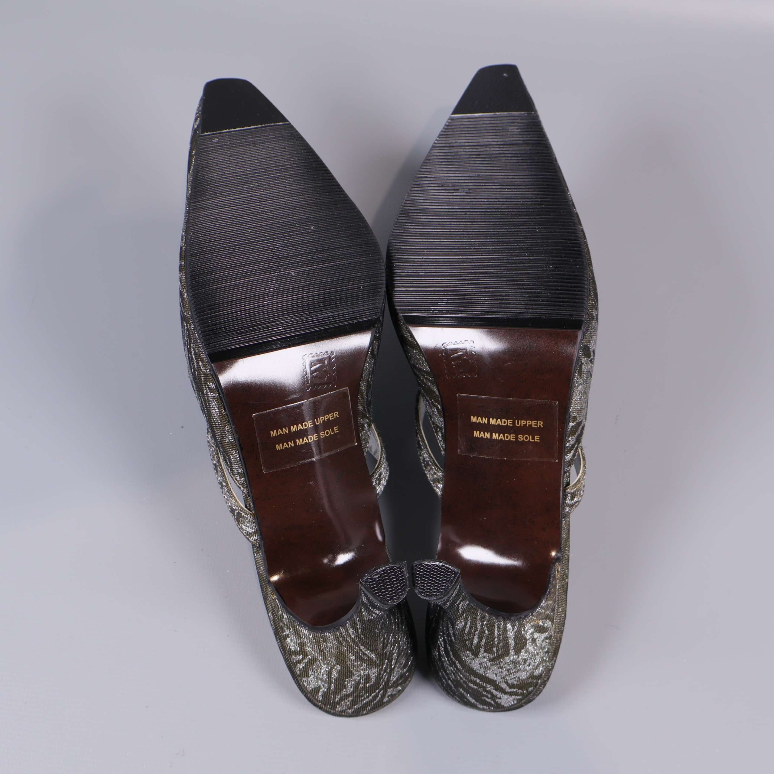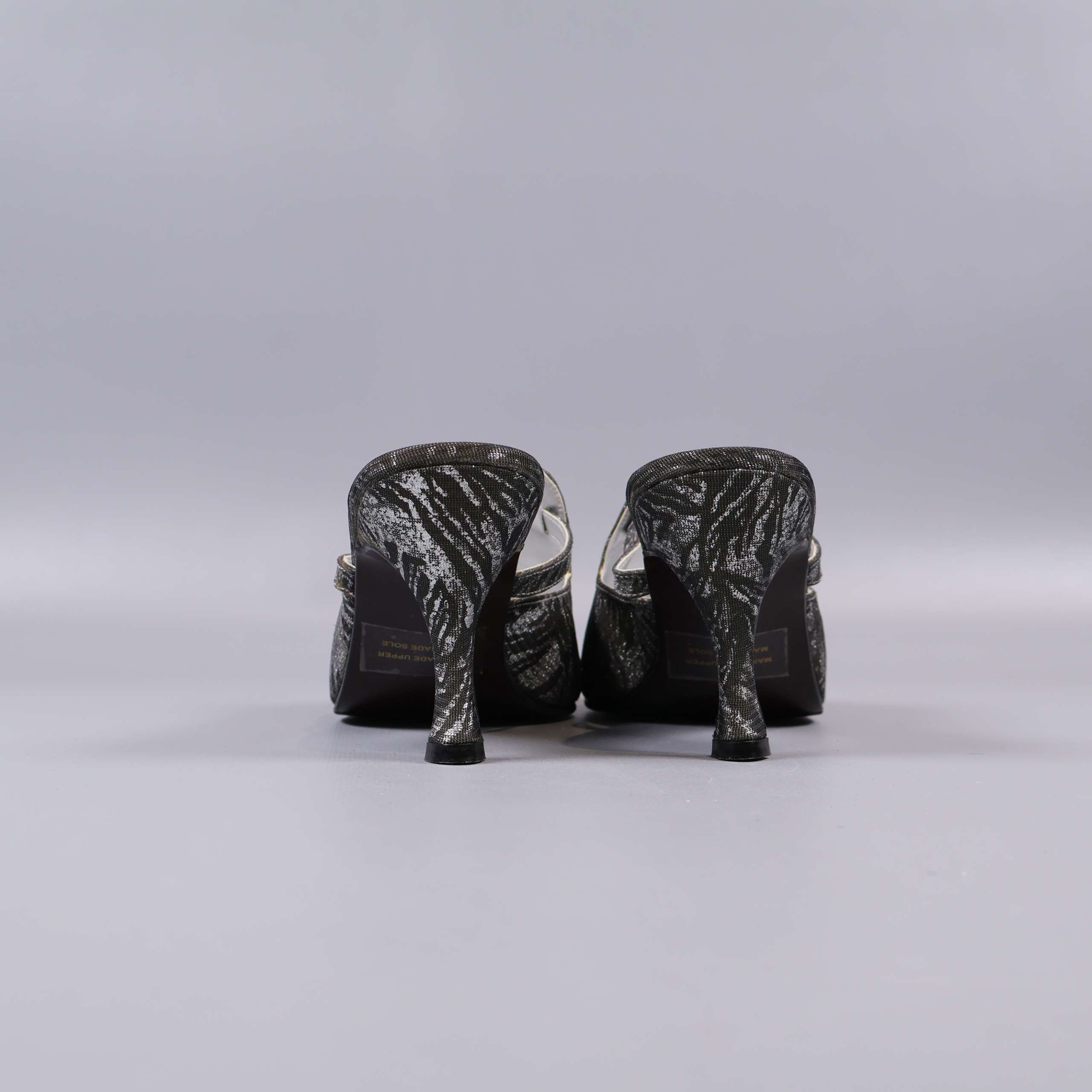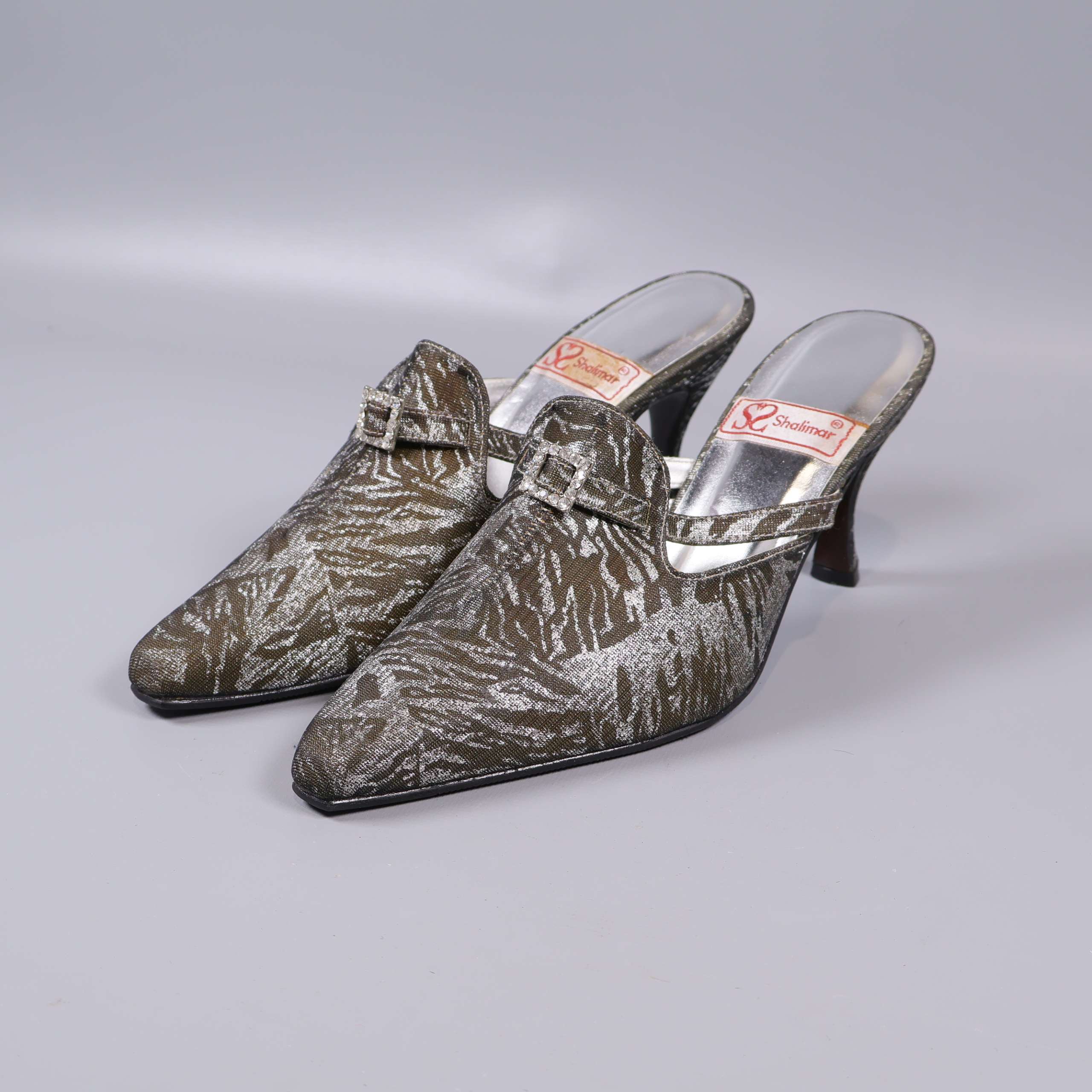 Dessa unika klackskor har spetsig tå och dekorativt mönster i metallic-glansig finish. Skorna har klassisk mule-modell med öppen häl, ett elegant spänne över vristen och mönstrad ovandel som ger ett vintagedoftande intryck. Perfekta för dig som vill addera en touch av glamour till din outfit.