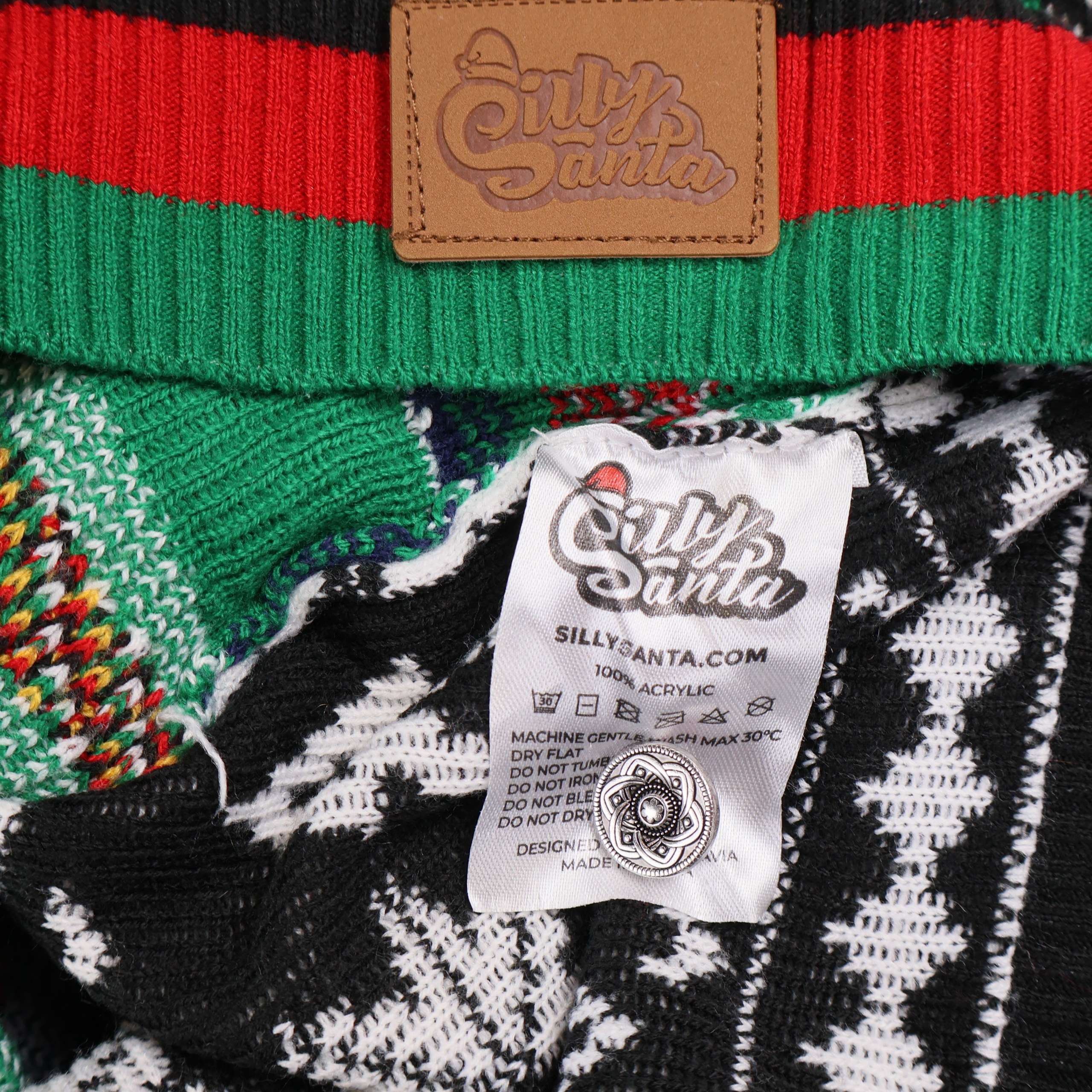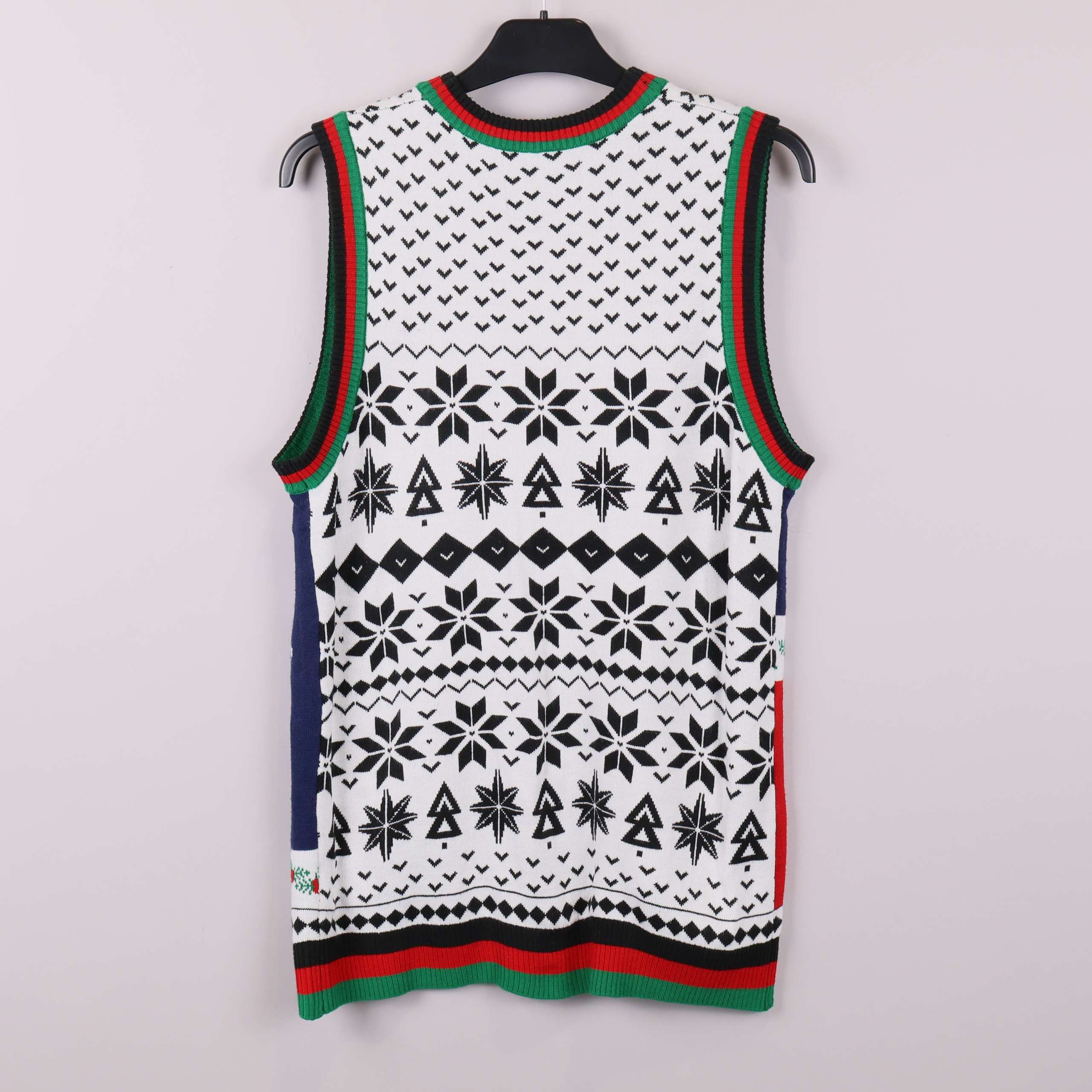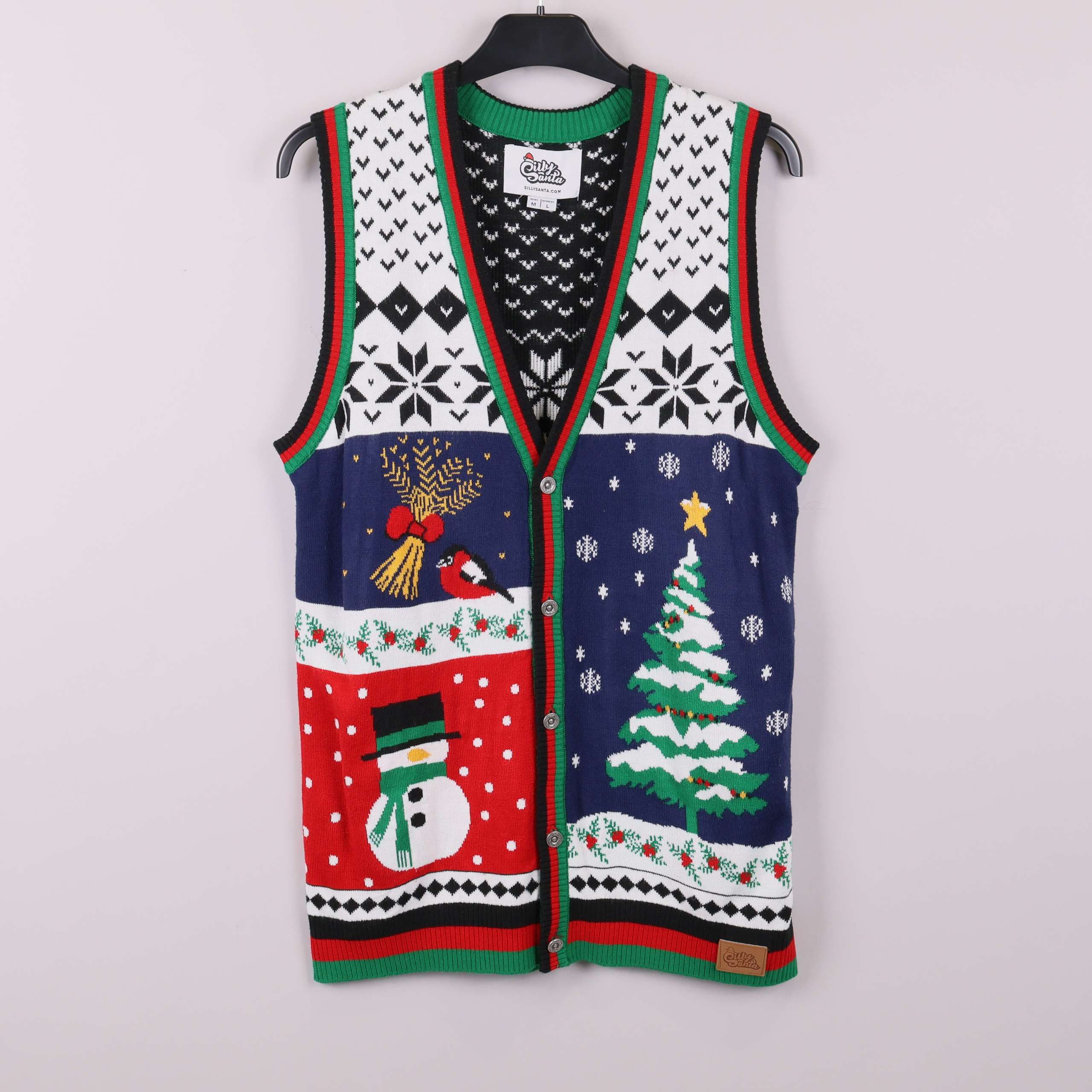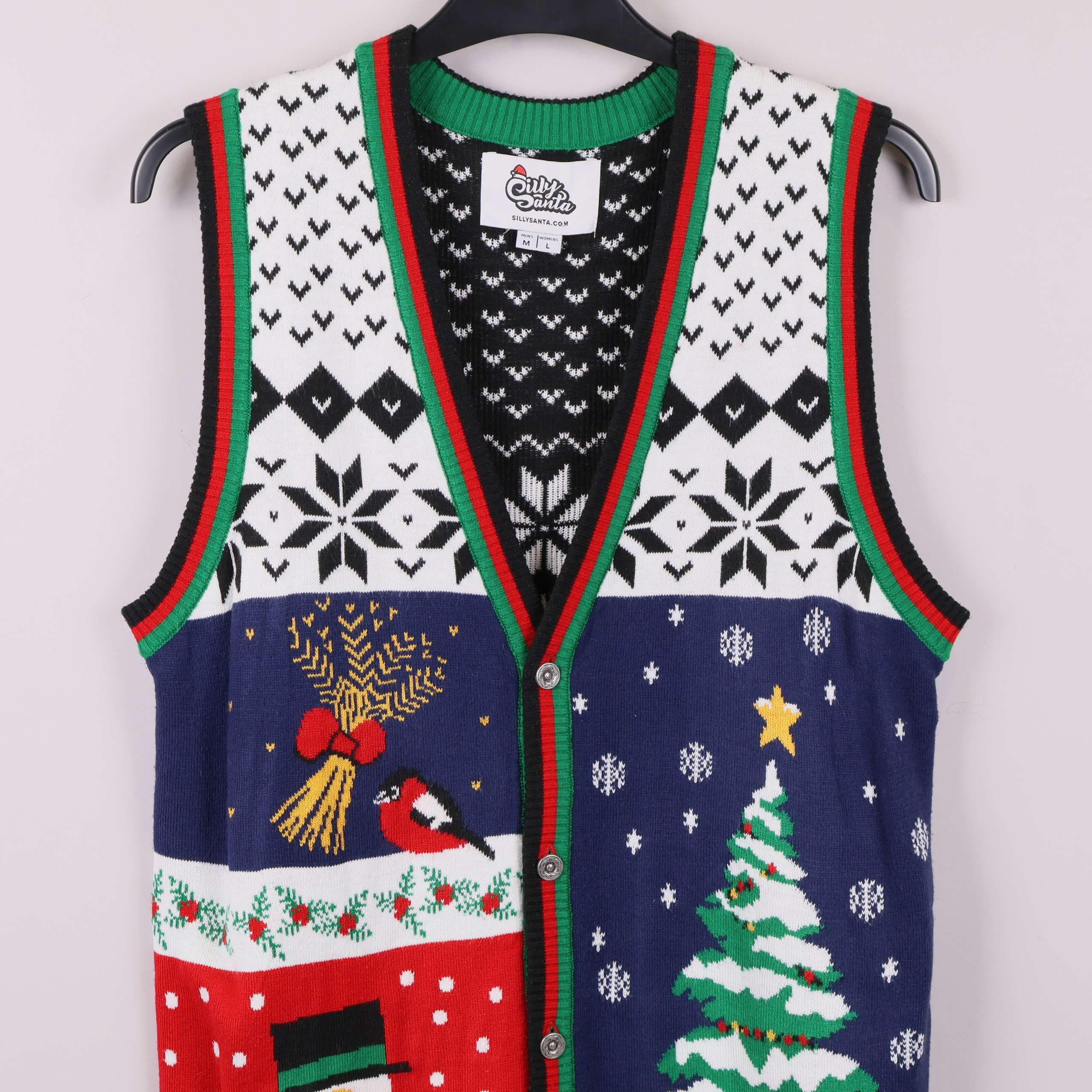 Rolig och färgglad unisex stickad julväst med flera klassiska vintermotiv som snögubbe, julgran och dekorativa detaljer. Stickade partier i vitt, blått, rött, grönt och svart ger en lekfull och iögonfallande look.