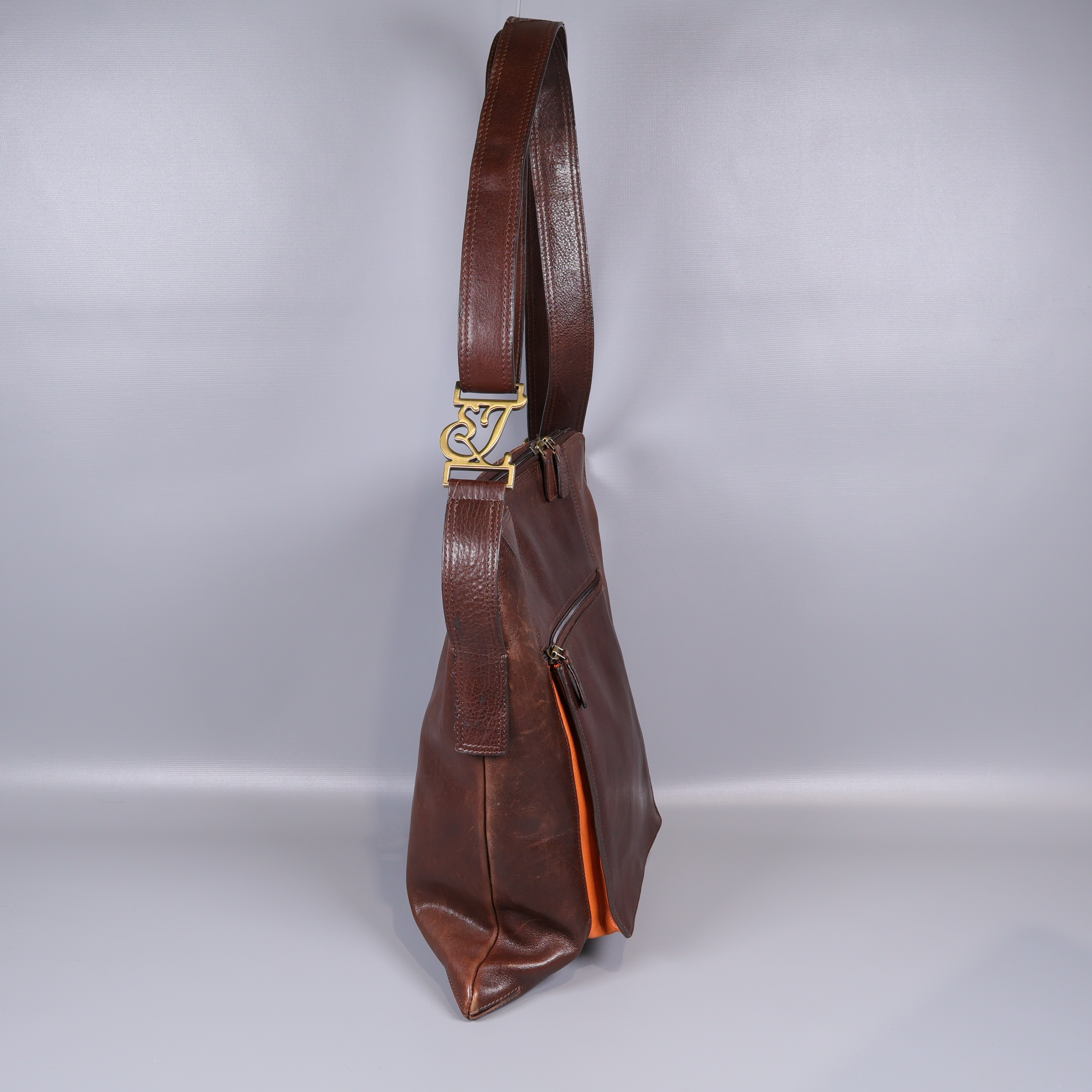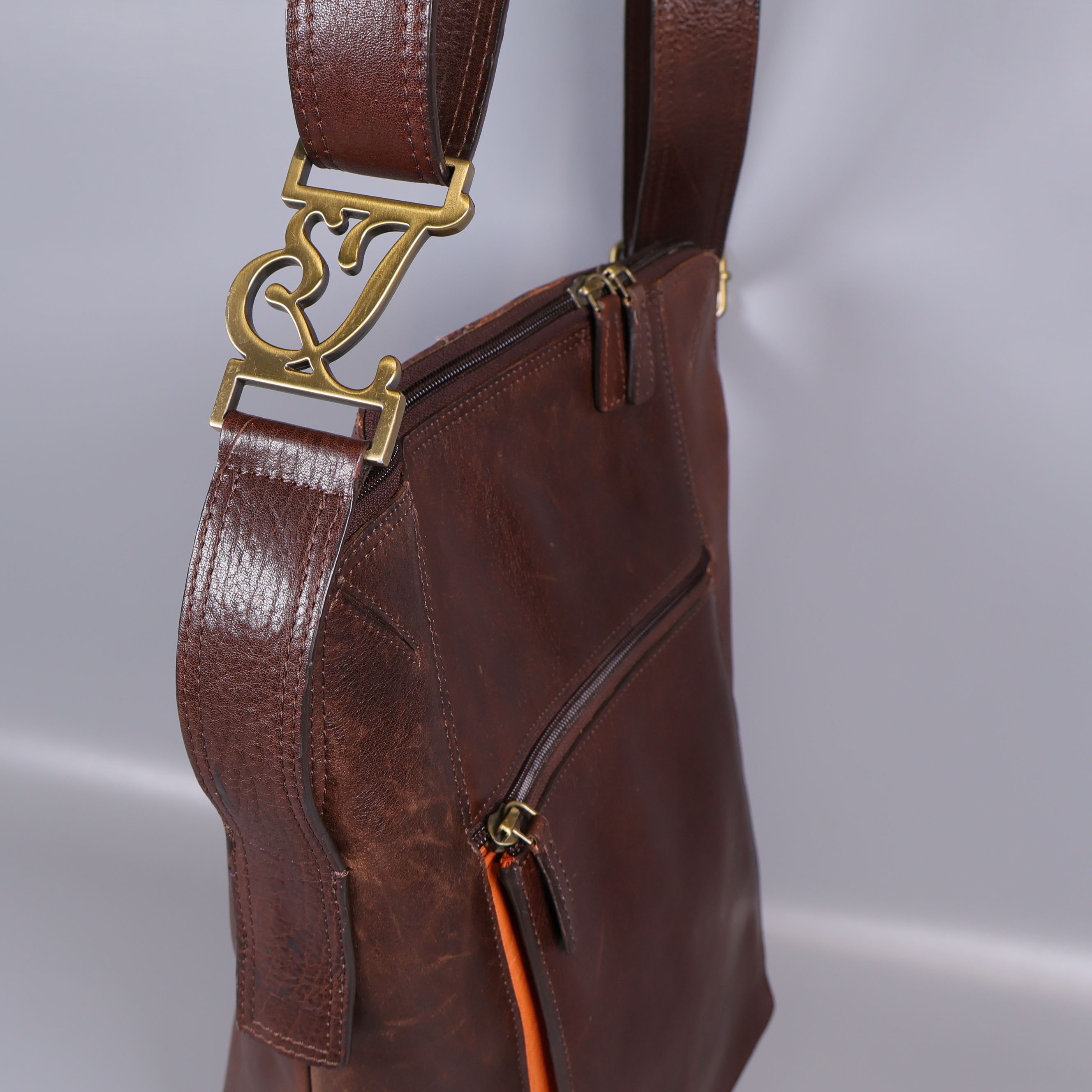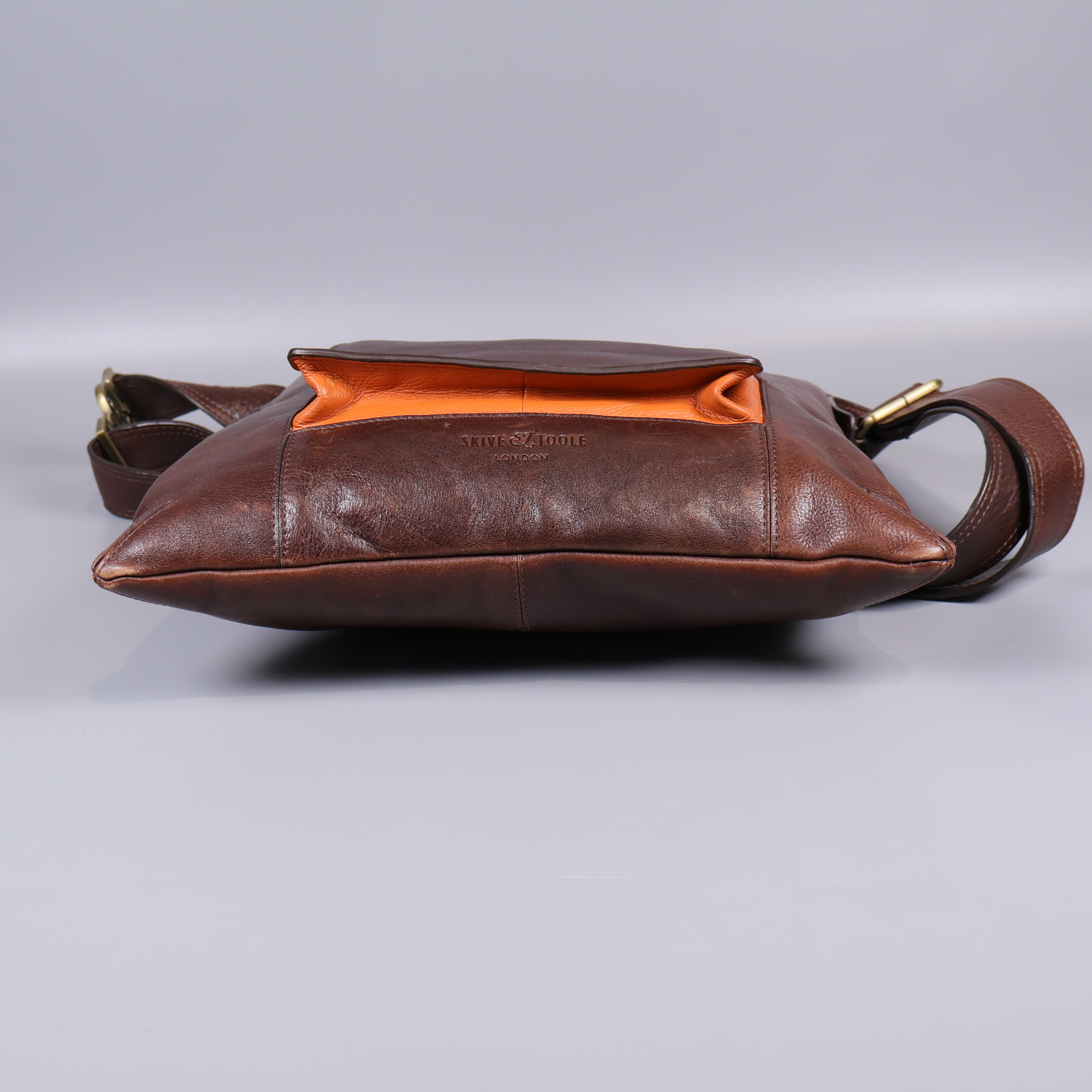 Stilren axelremsväska i brunt läder med flera dragkedjeförsedda fickor och justerbart axelband. Väskan har ett slätt, glansigt yttre och insida i orange textil för en färgstark kontrast.