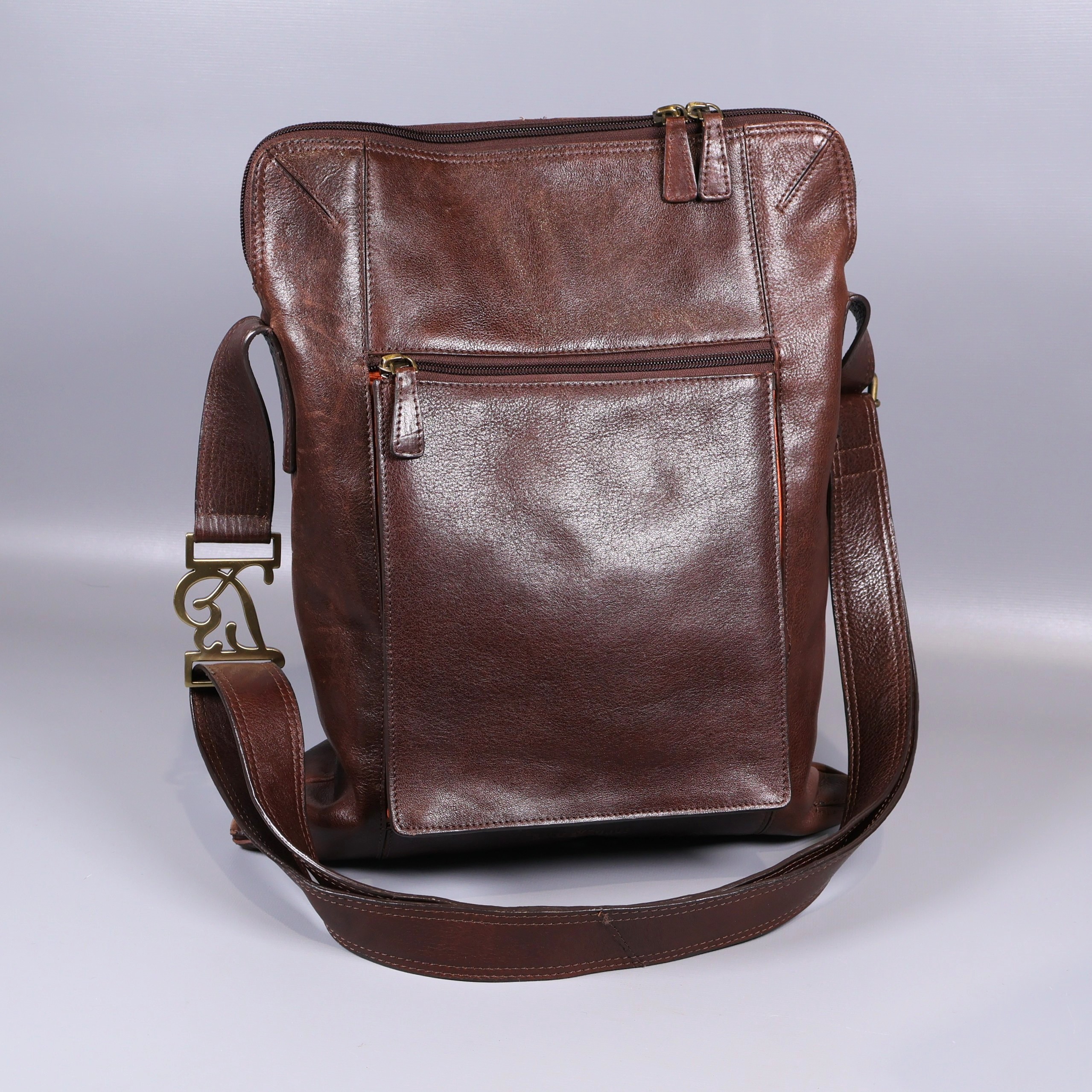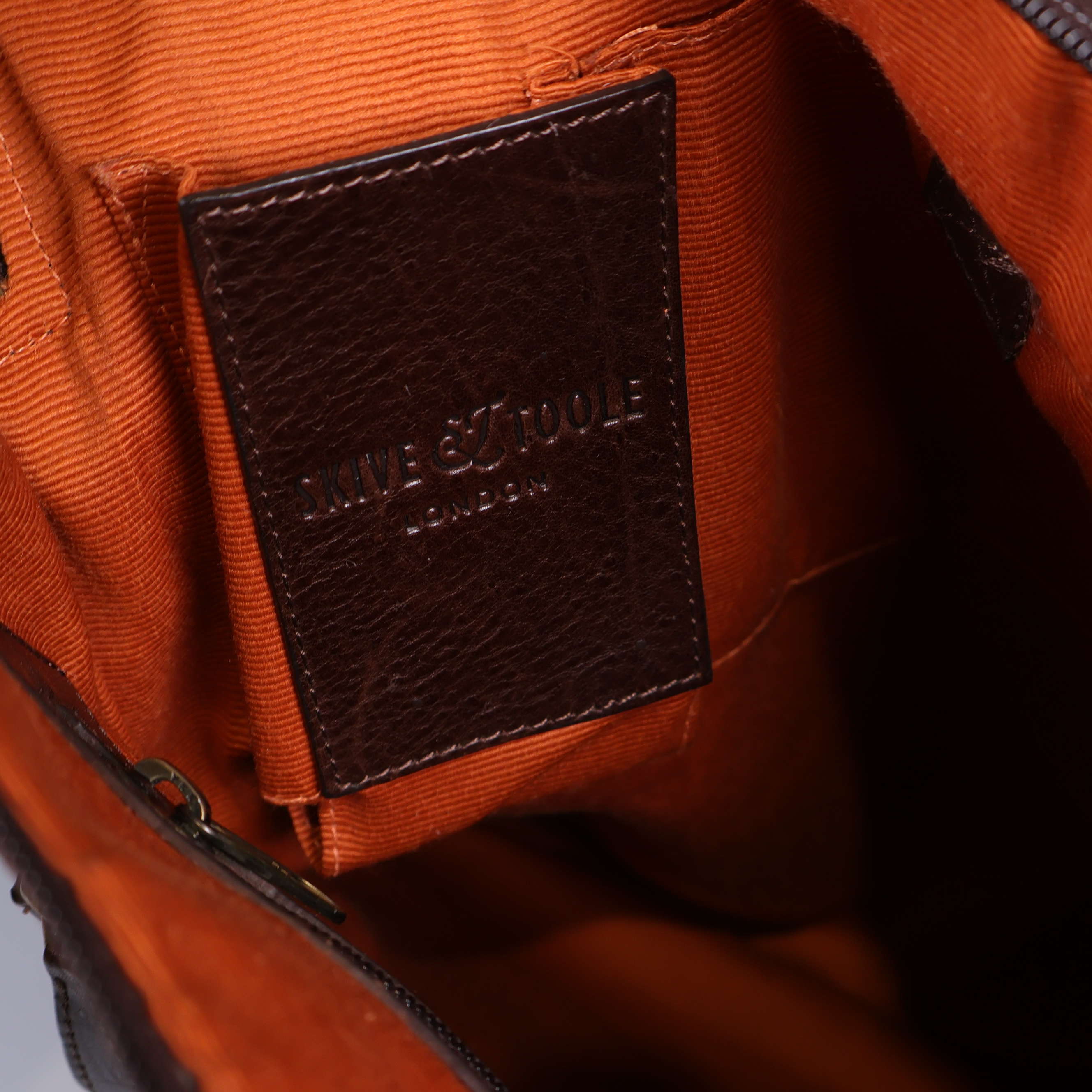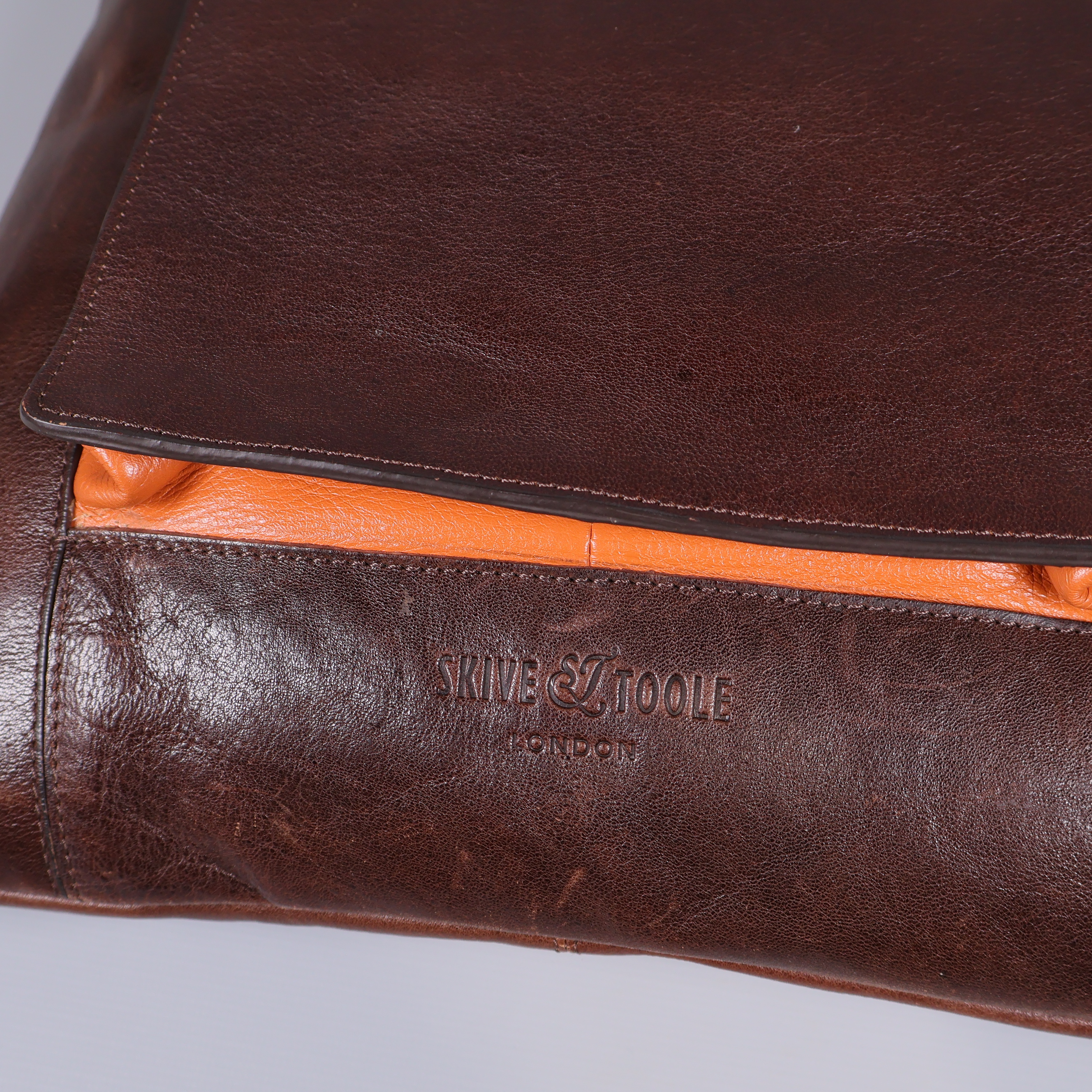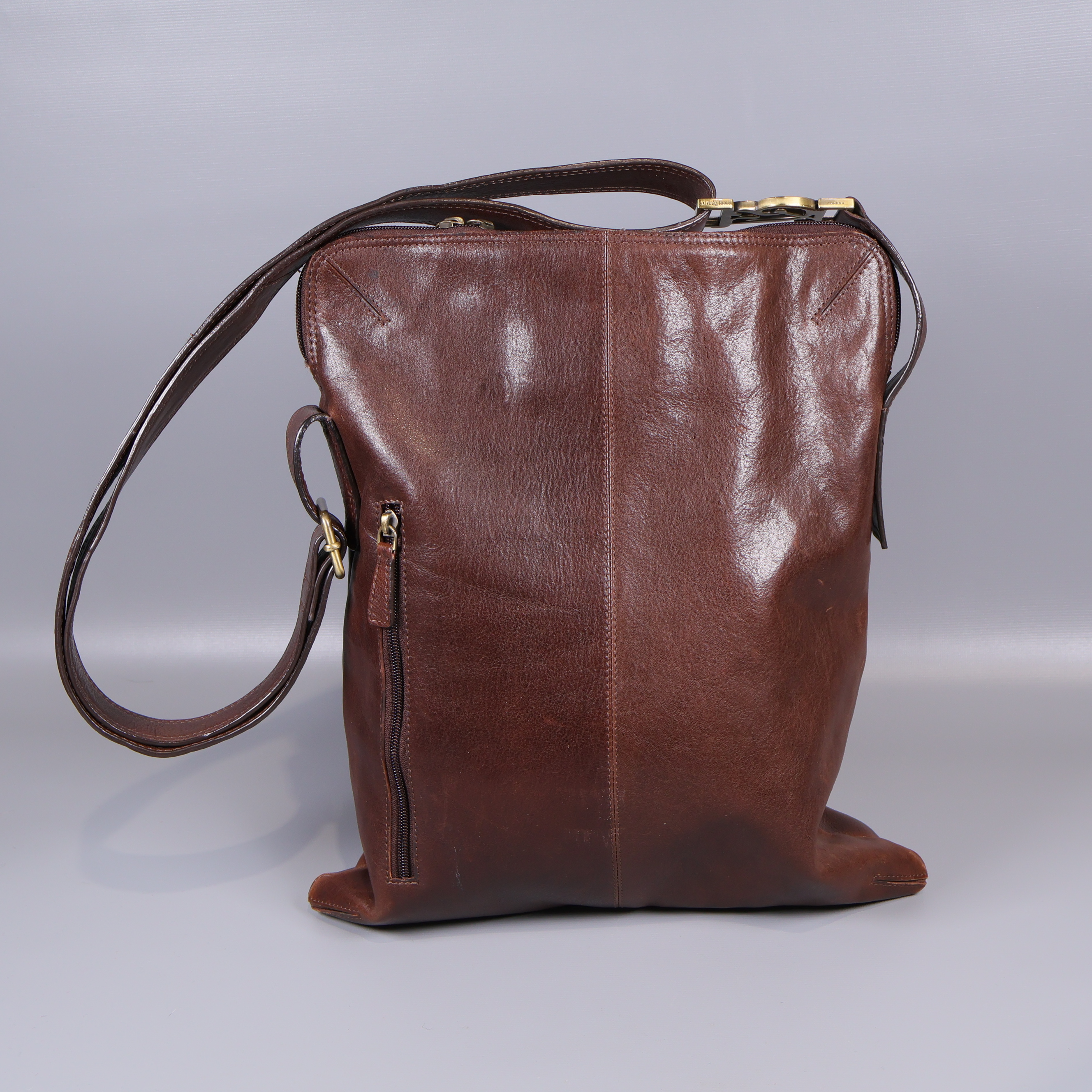 Stilren axelremsväska i brunt läder med flera dragkedjeförsedda fickor och justerbart axelband. Väskan har ett slätt, glansigt yttre och insida i orange textil för en färgstark kontrast.