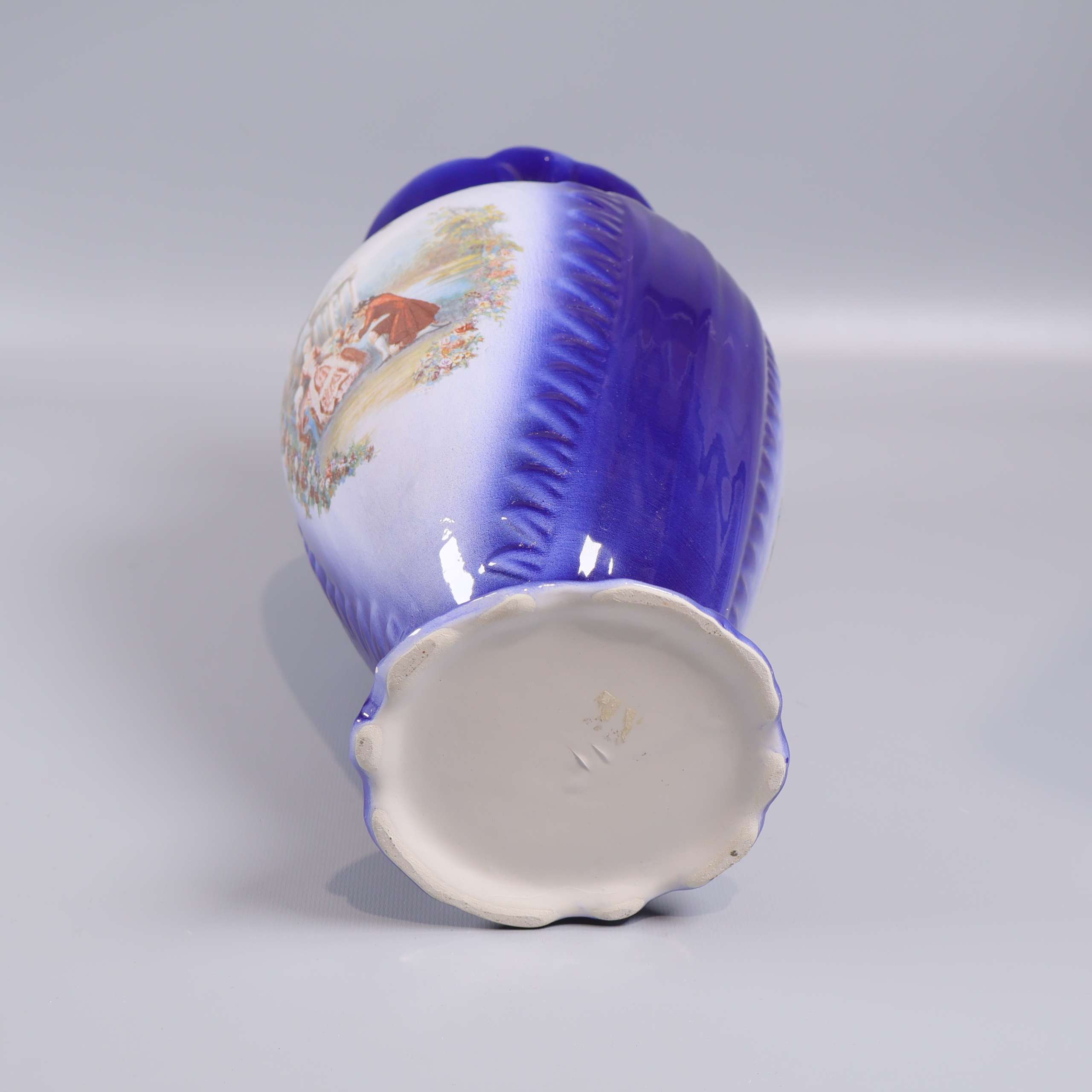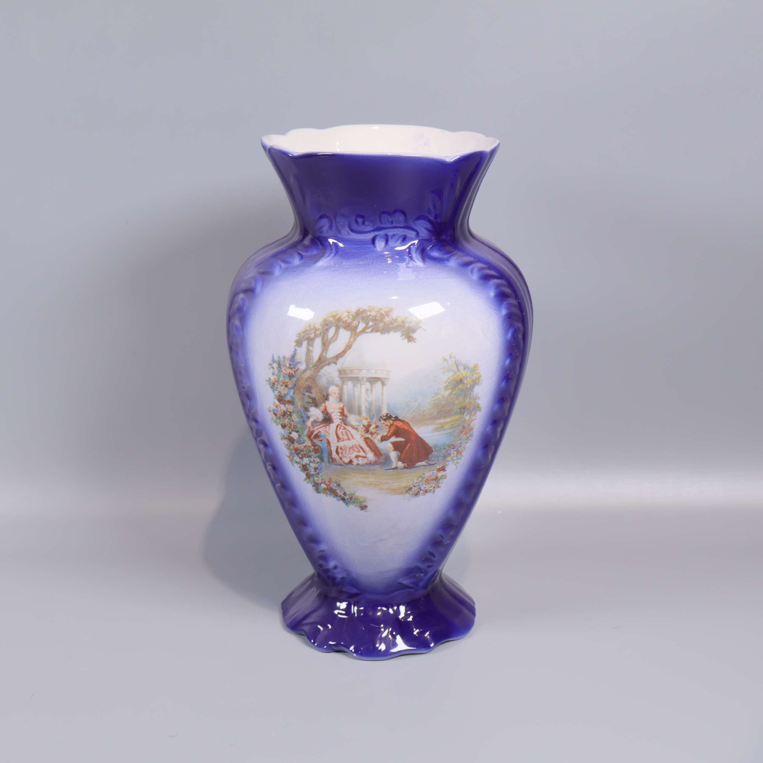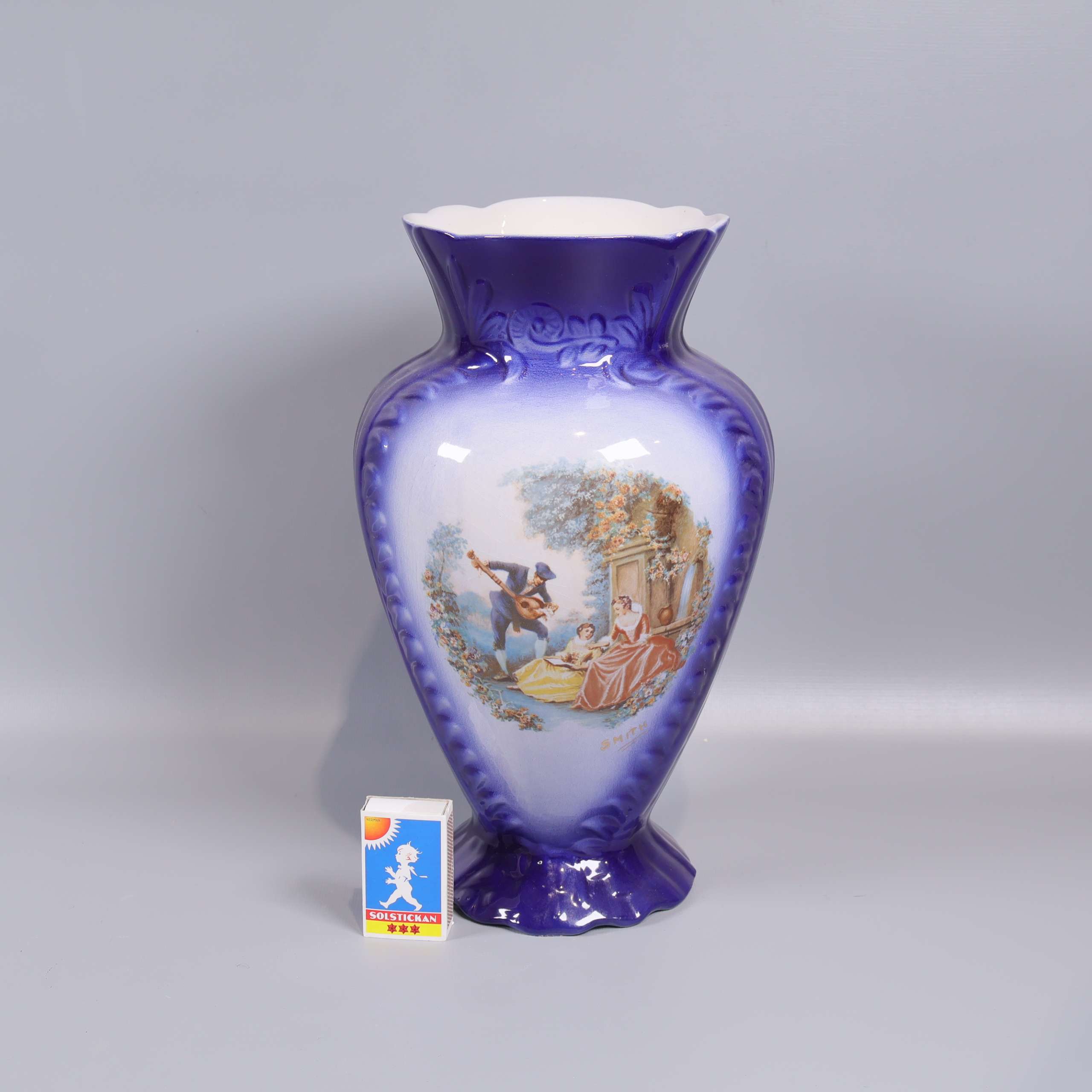 Vas med markerad blå färg och glansig finish, smyckad med romantiska motiv i klassisk stil på båda sidor. Formen är rundad med vågig kant och reliefdetaljer längs kanterna, vilket ger en distinkt vintage vibe.