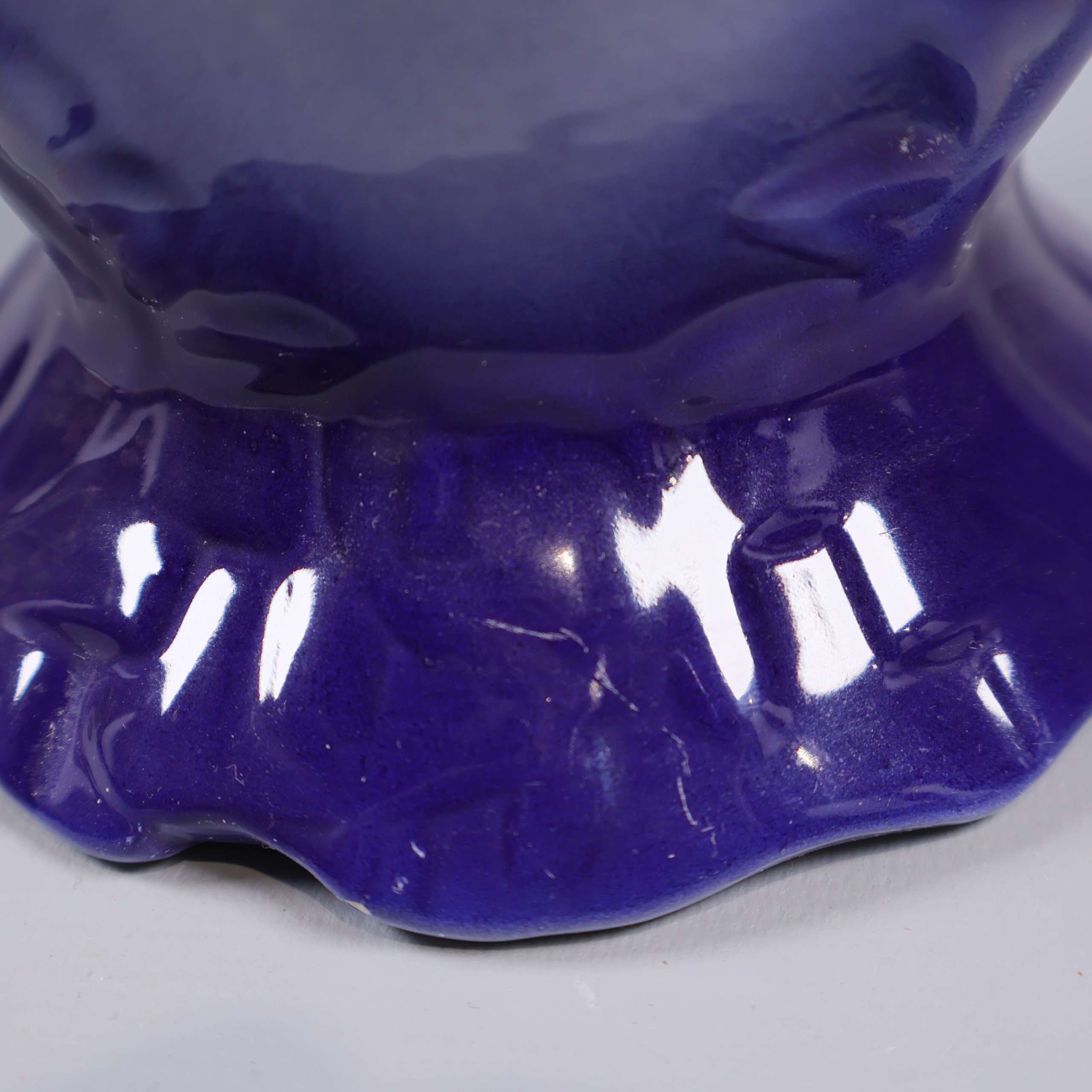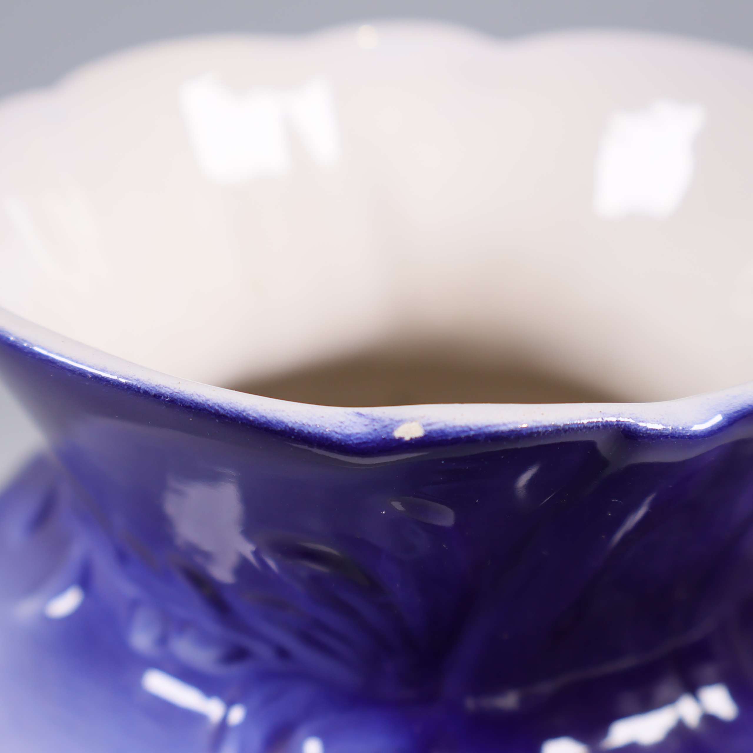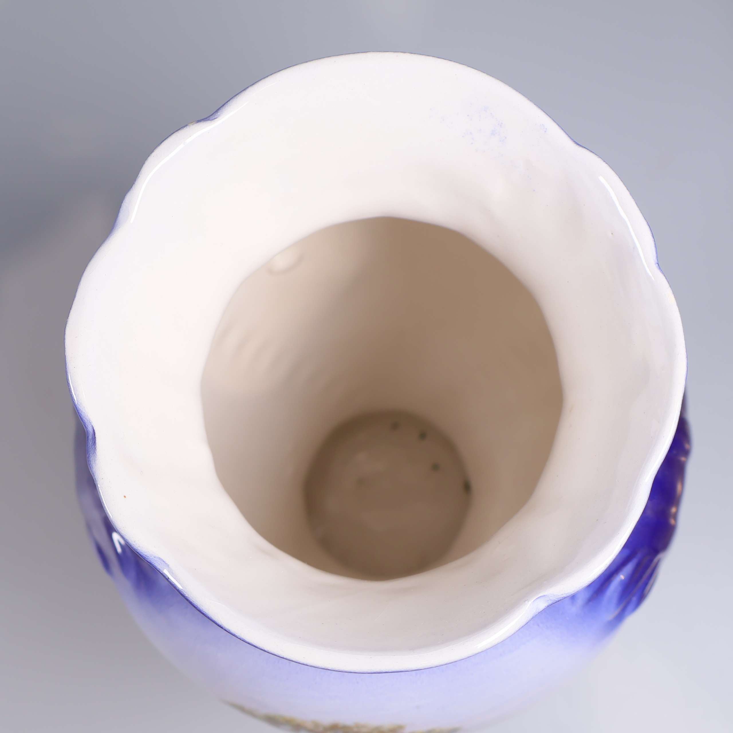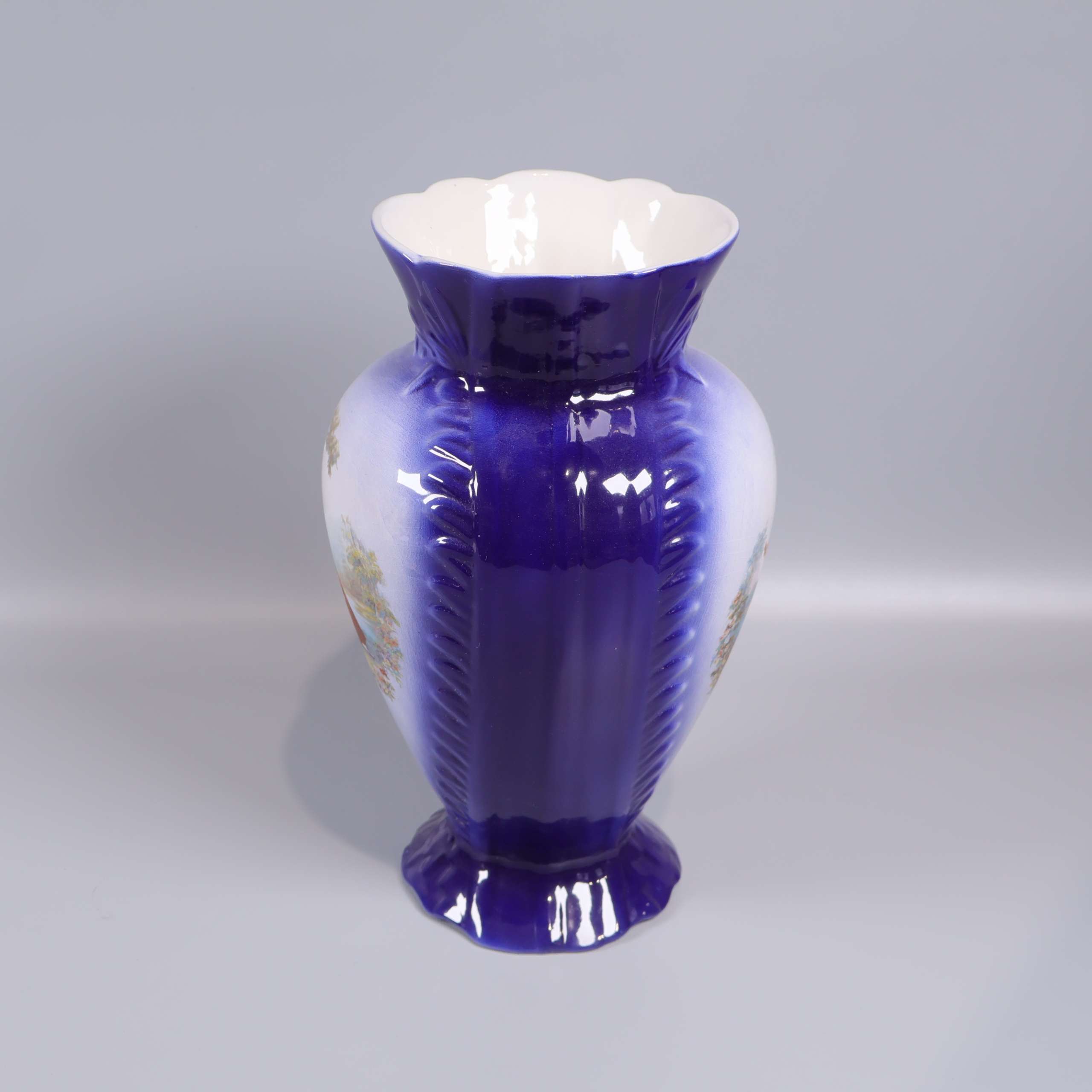 Vas med markerad blå färg och glansig finish, smyckad med romantiska motiv i klassisk stil på båda sidor. Formen är rundad med vågig kant och reliefdetaljer längs kanterna, vilket ger en distinkt vintage vibe.