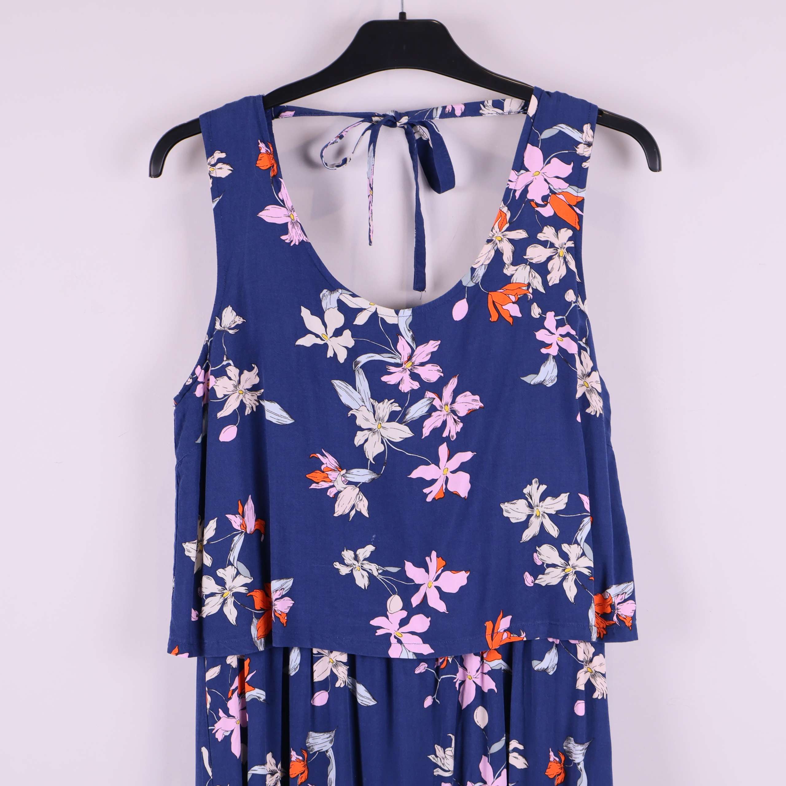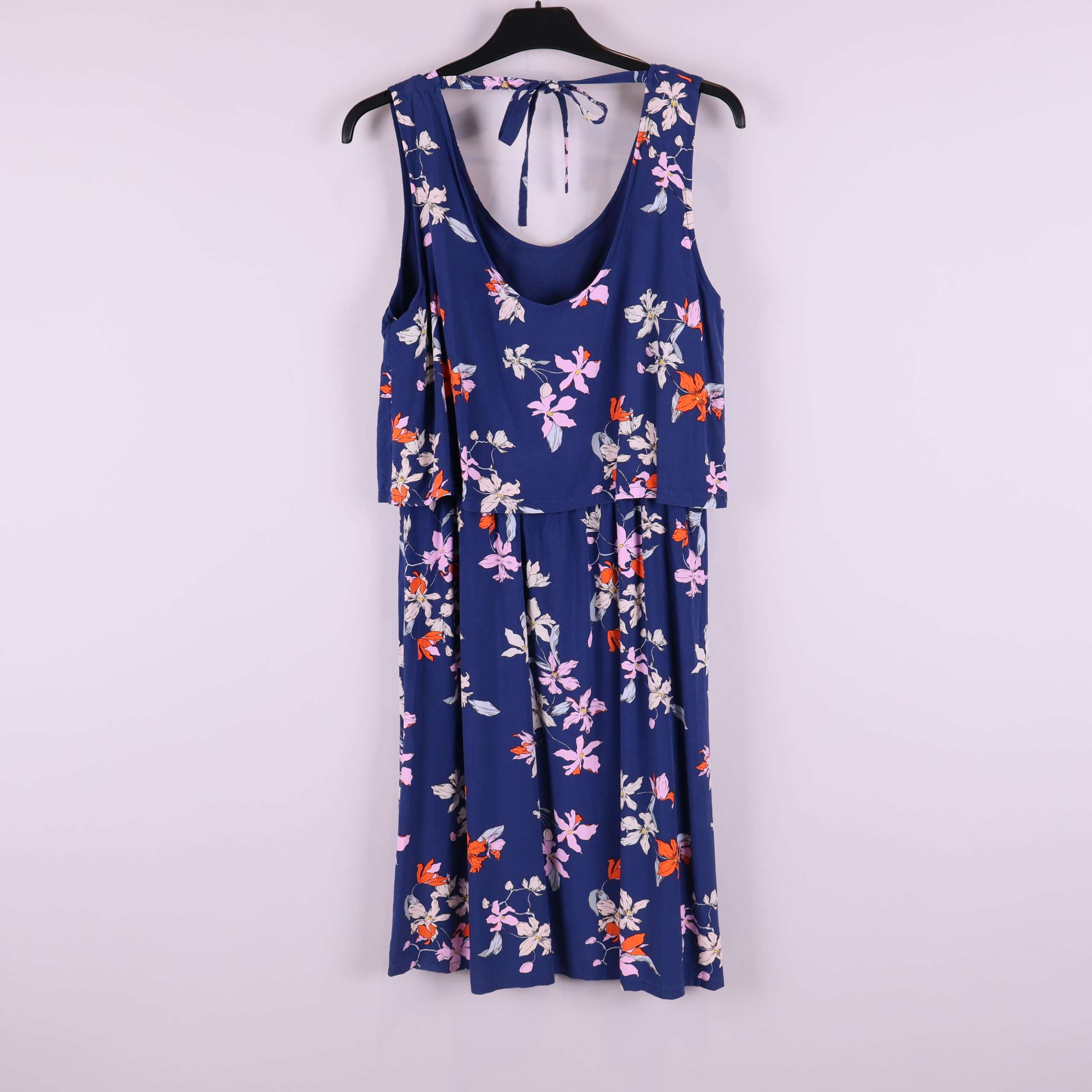 En snygg klänning i blått tyg med blommigt mönster och avslappnad passform. Överdelen har ett dubbelt lager och fin knytning bak i nacken. Modellen har rundad halsringning och ett fall som ger en ledig och fräsch känsla, perfekt när du vill sticka ut lite extra med ett färgglatt print.