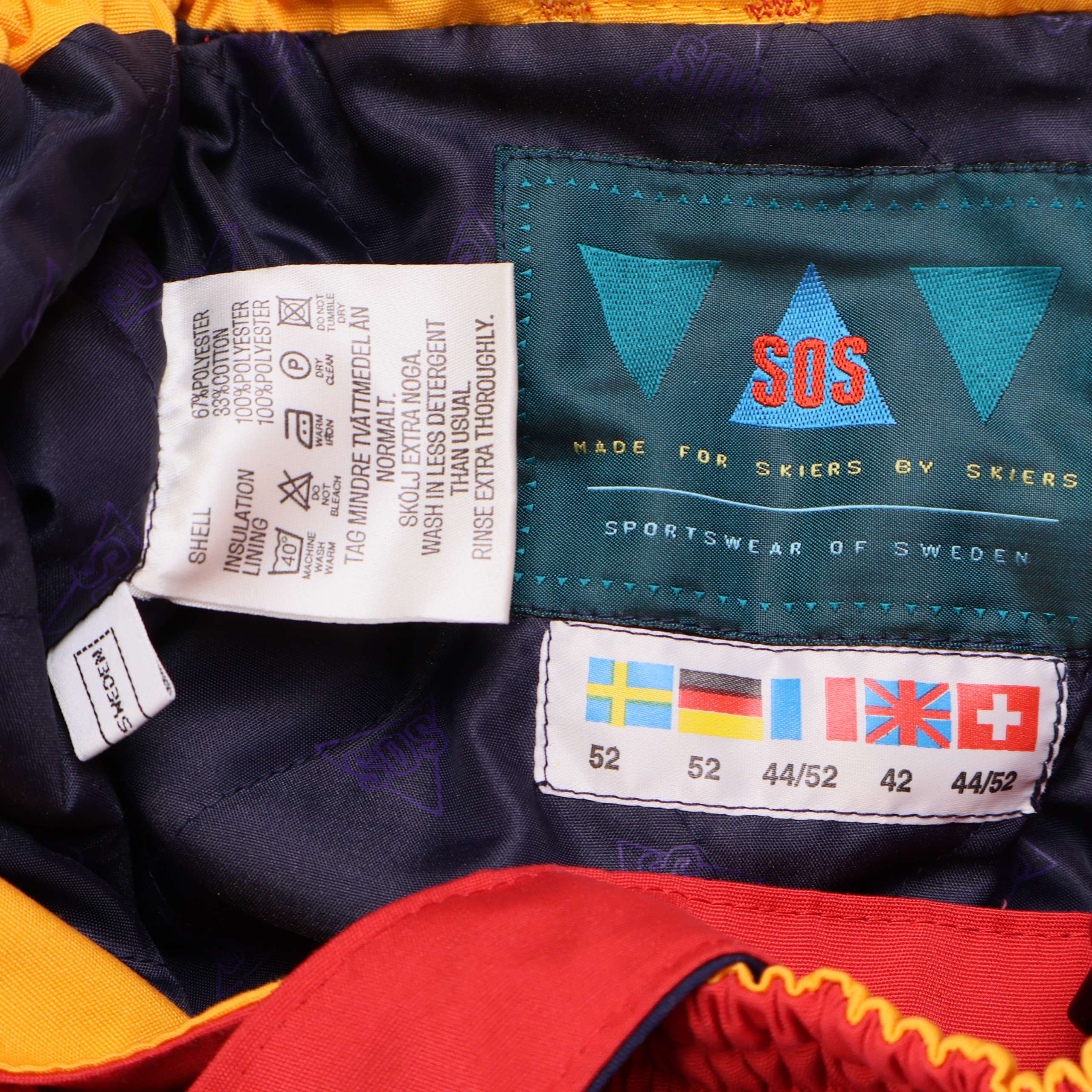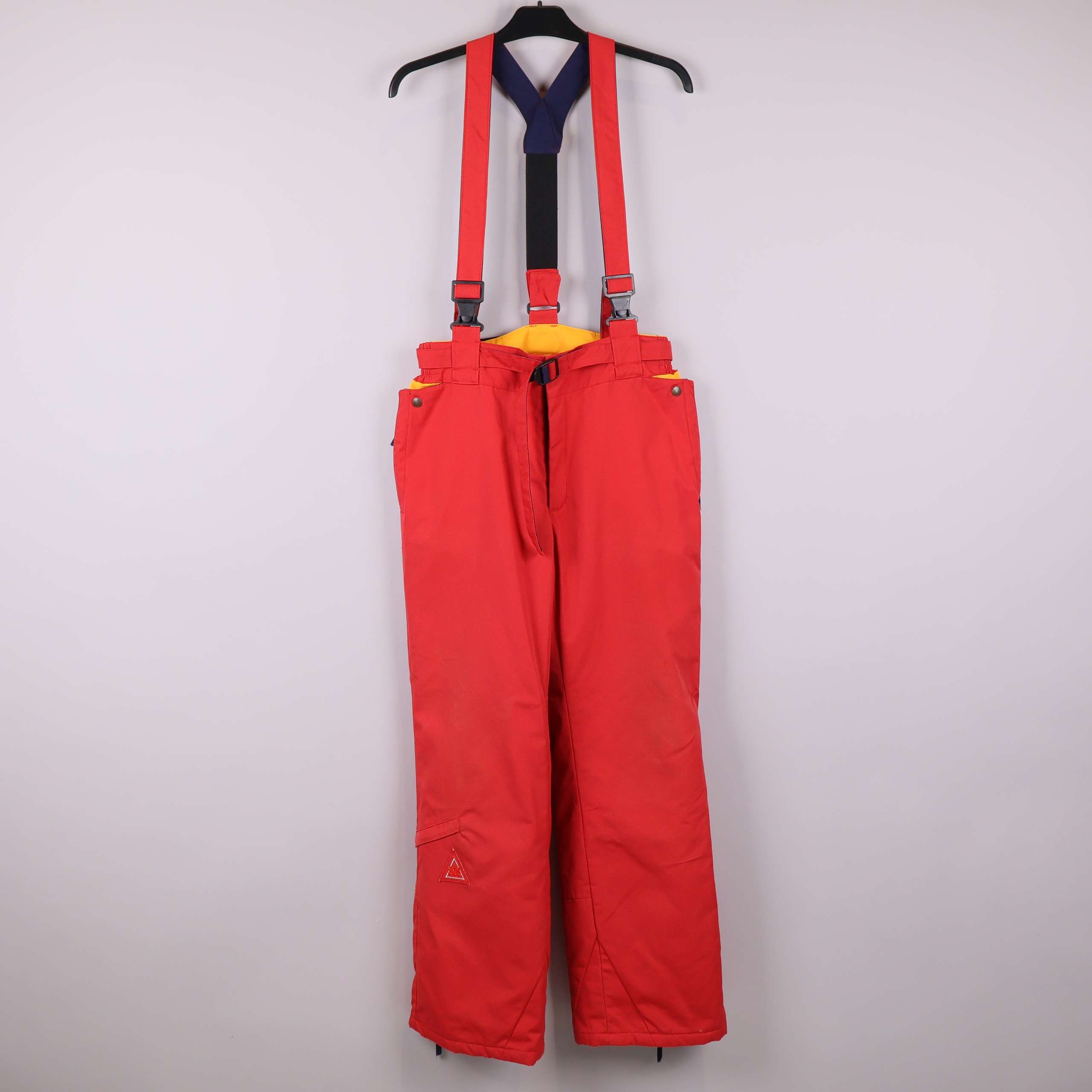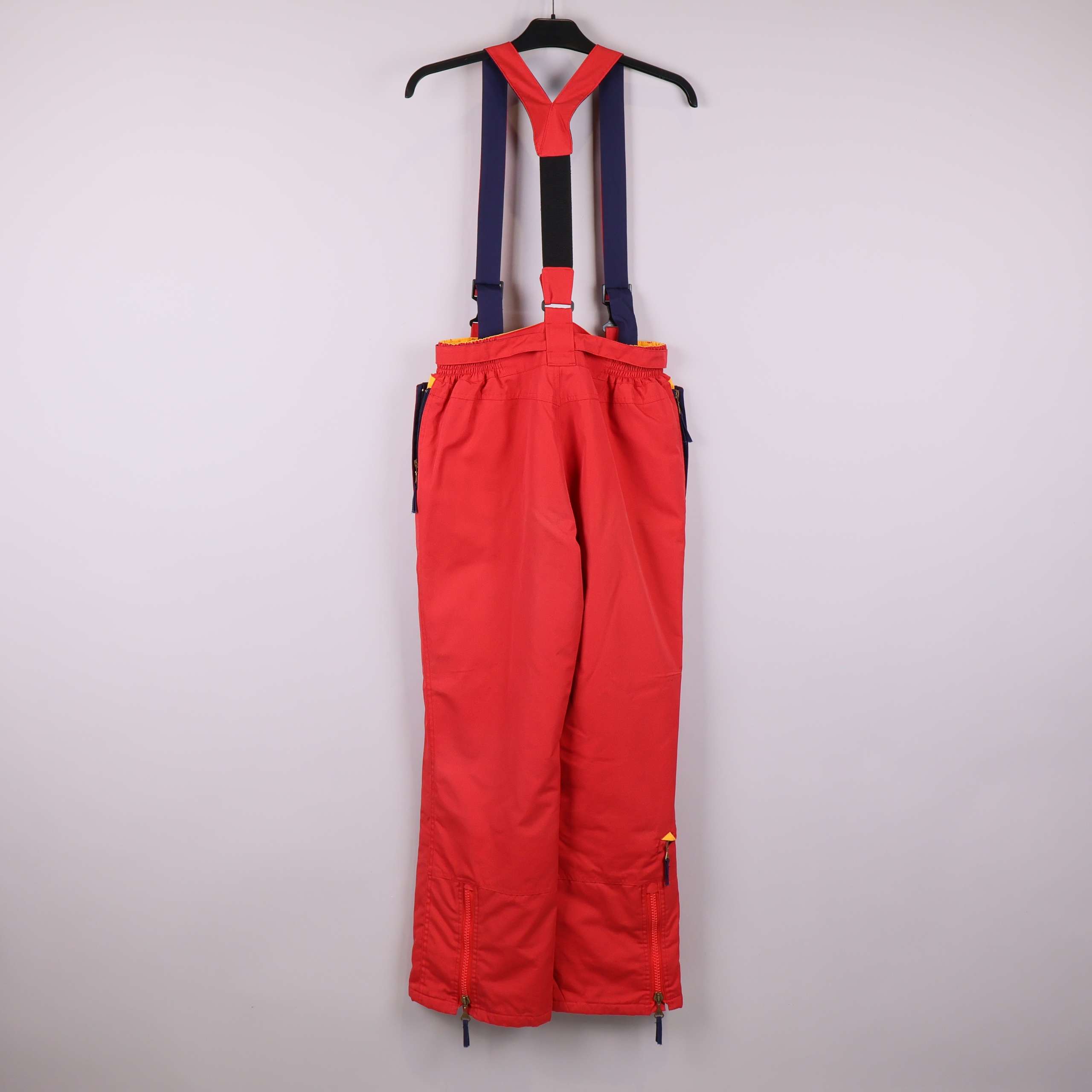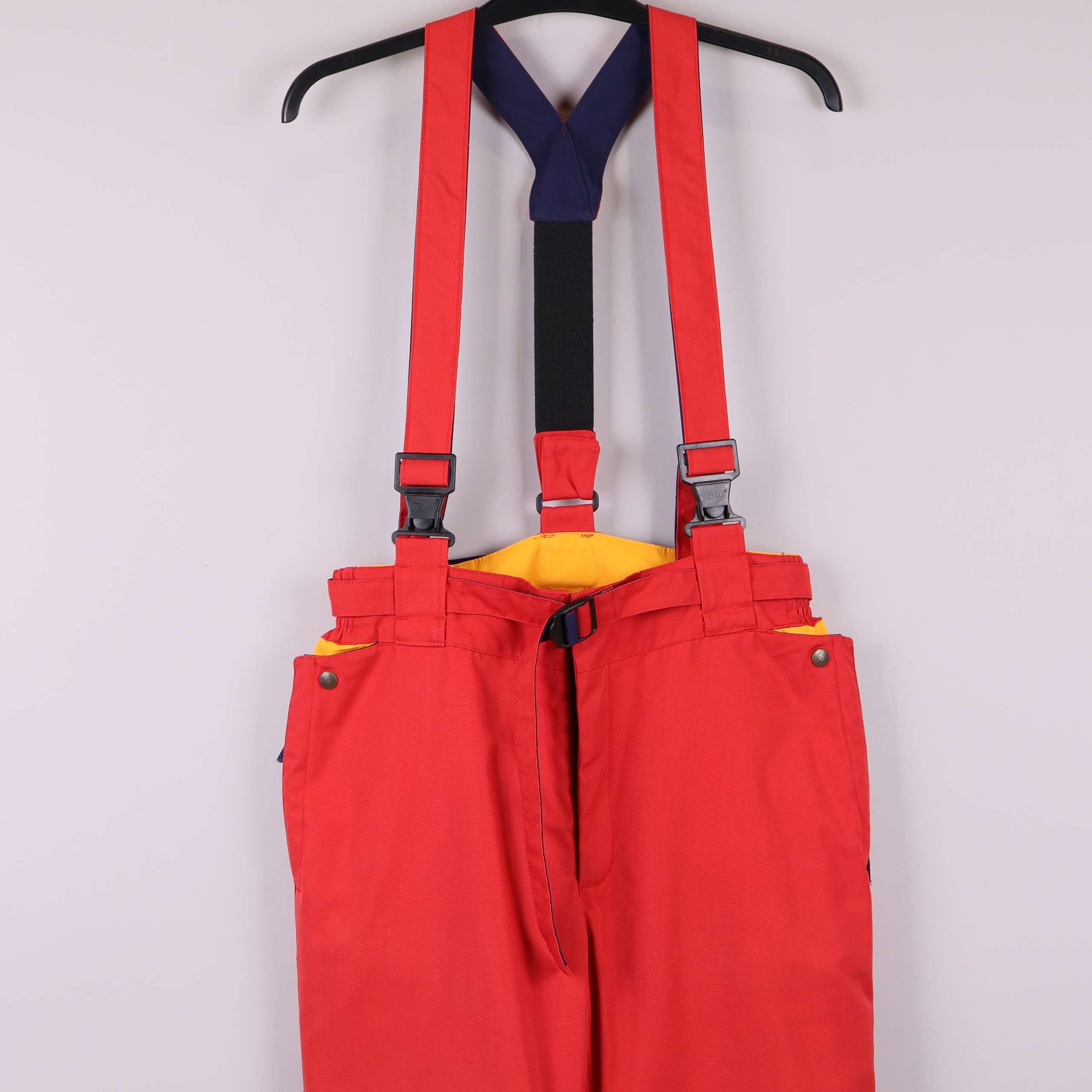 Färggranna vintage skidbyxor med justerbara hängslen och detaljer i kontrastfärg. Byxorna har praktiska fickor, dragkedjor vid benslut och robusta spännen för enkel anpassning. Insidan är fodrad för extra komfort och värme.