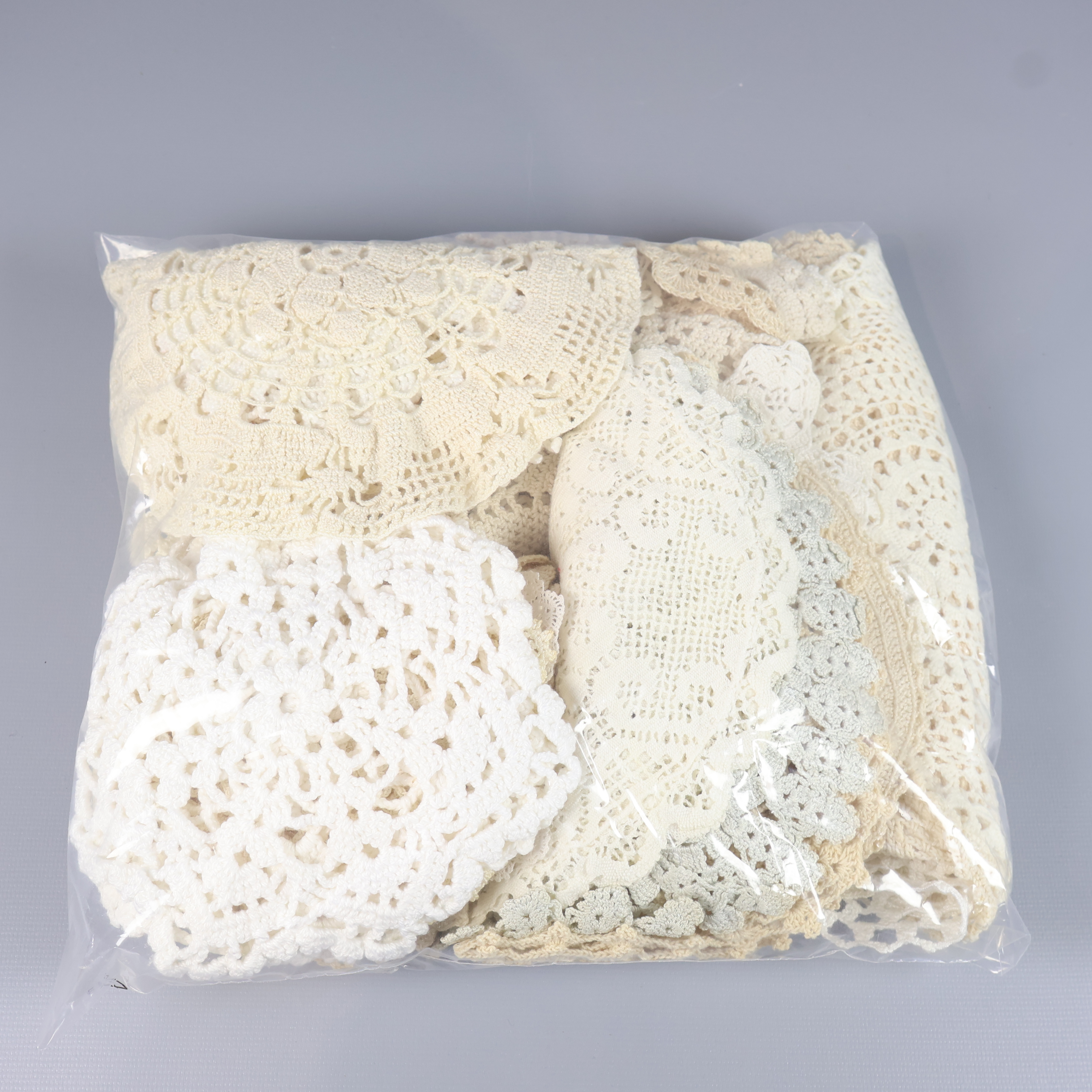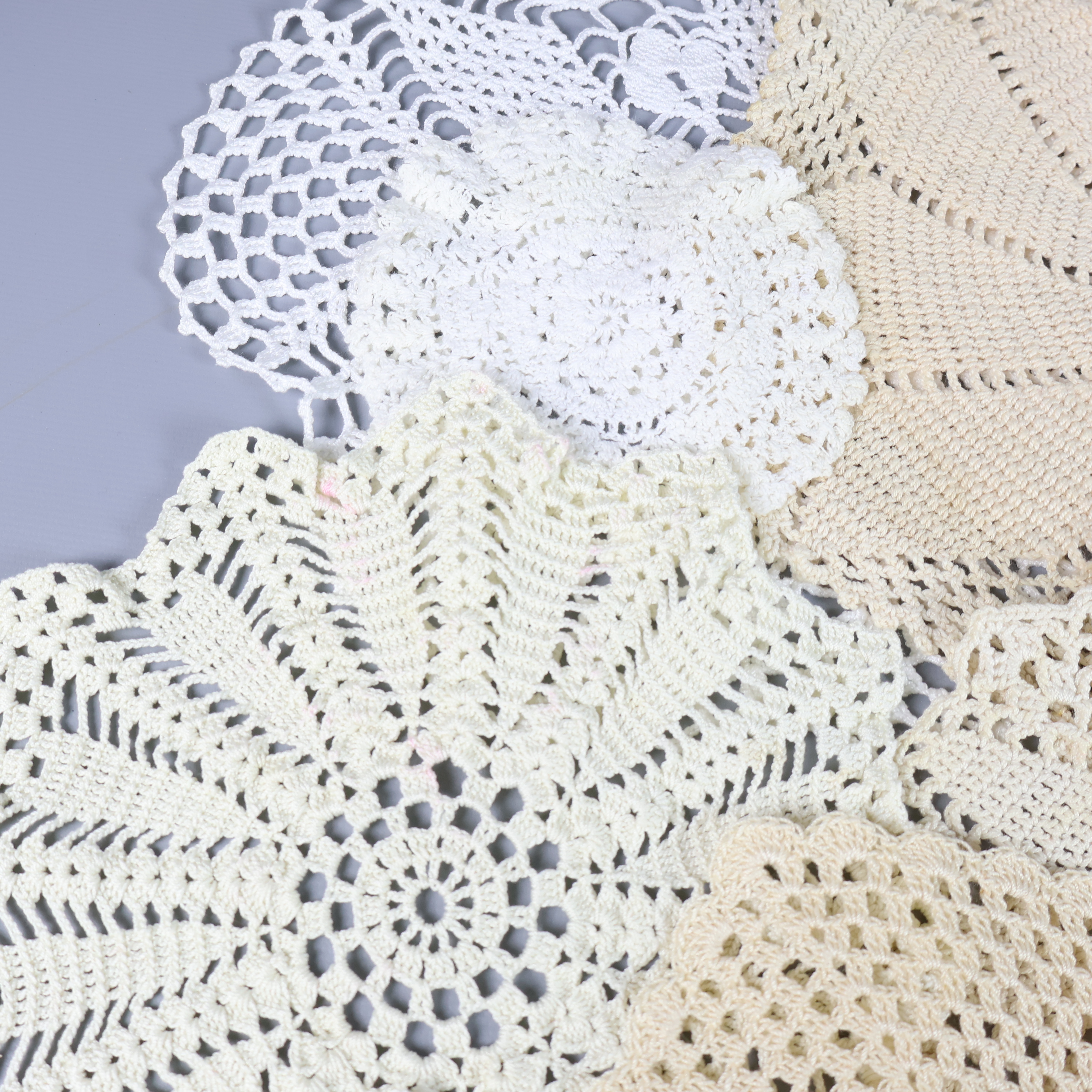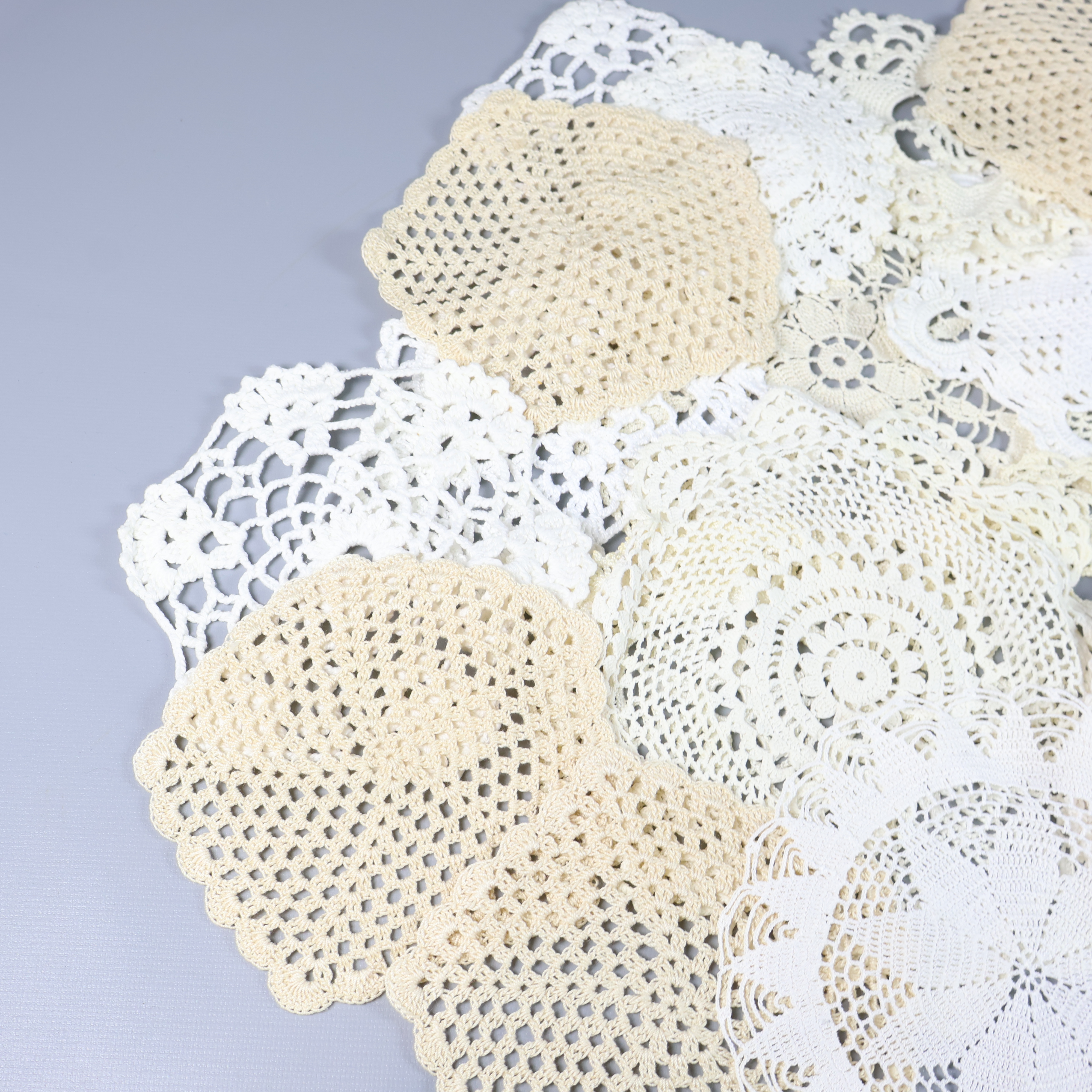 Flera handgjorda virkade spetsdukar i olika storlekar och former, med vackra mönster i ljusa naturtoner från vitt till beige. Skapar en mysig och vintage vibe i vilket rum som helst. Varje duk har unika detaljer och ett klassiskt uttryck som ger en charmig känsla. Perfekt till att använda tillsammans eller var och en för sig som dekoration.