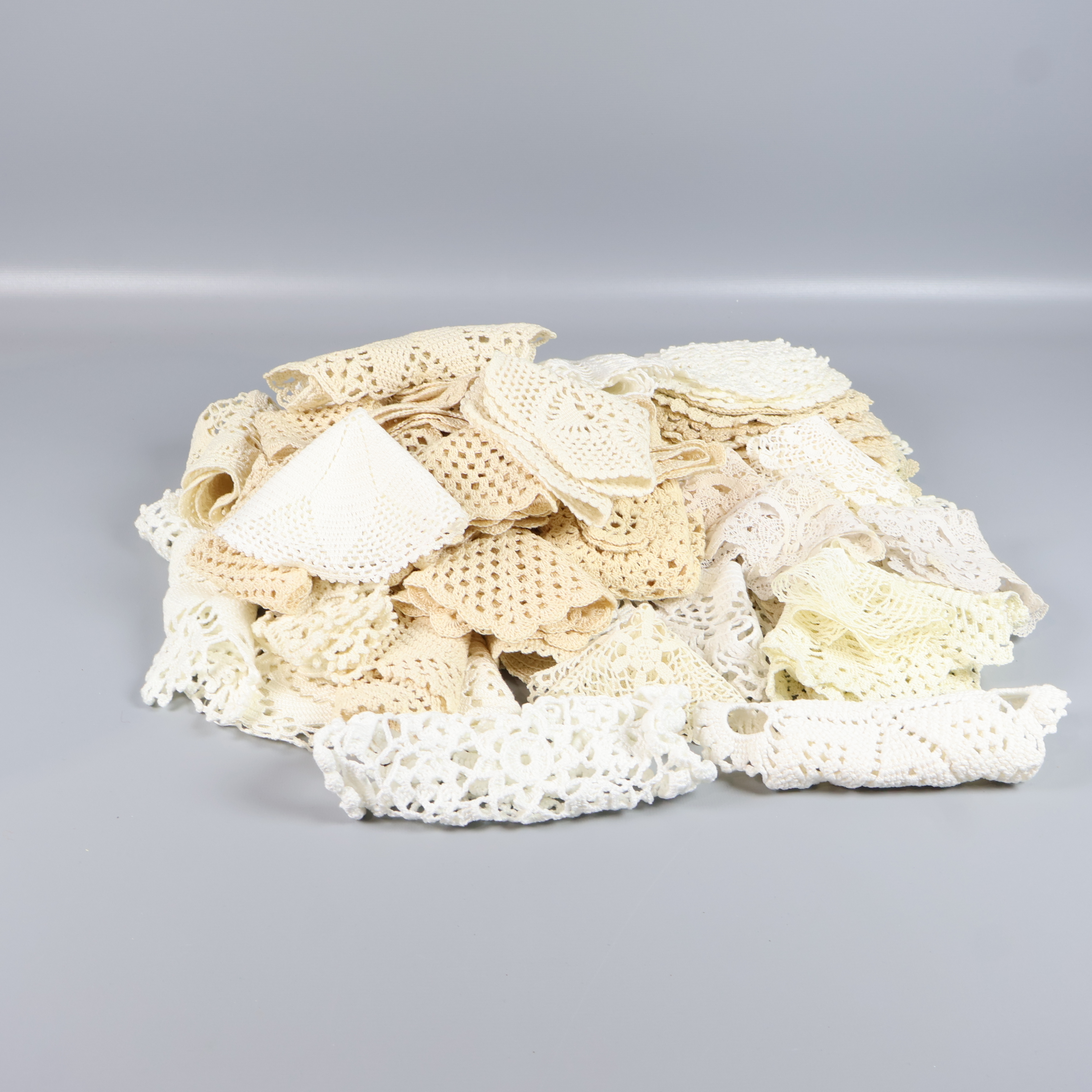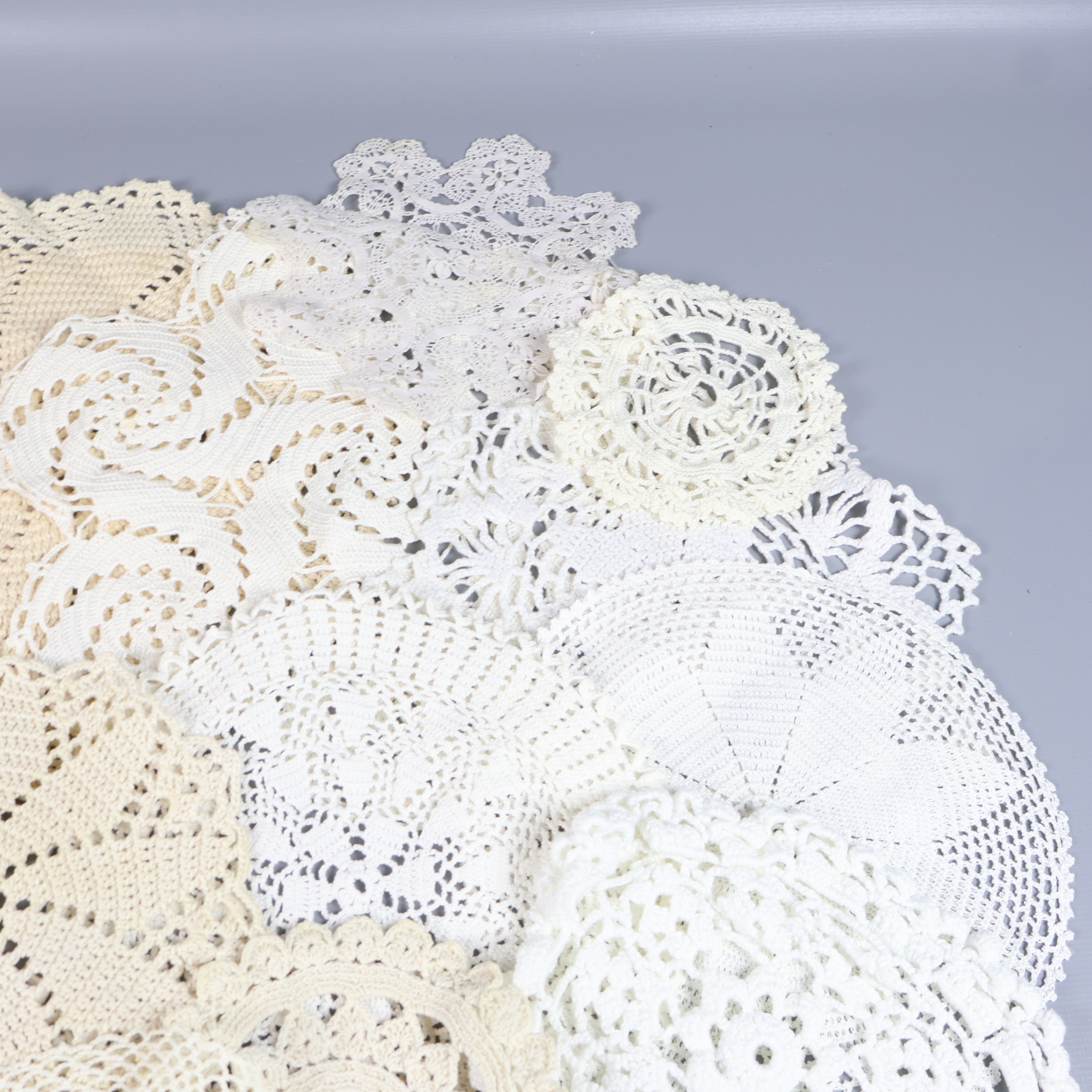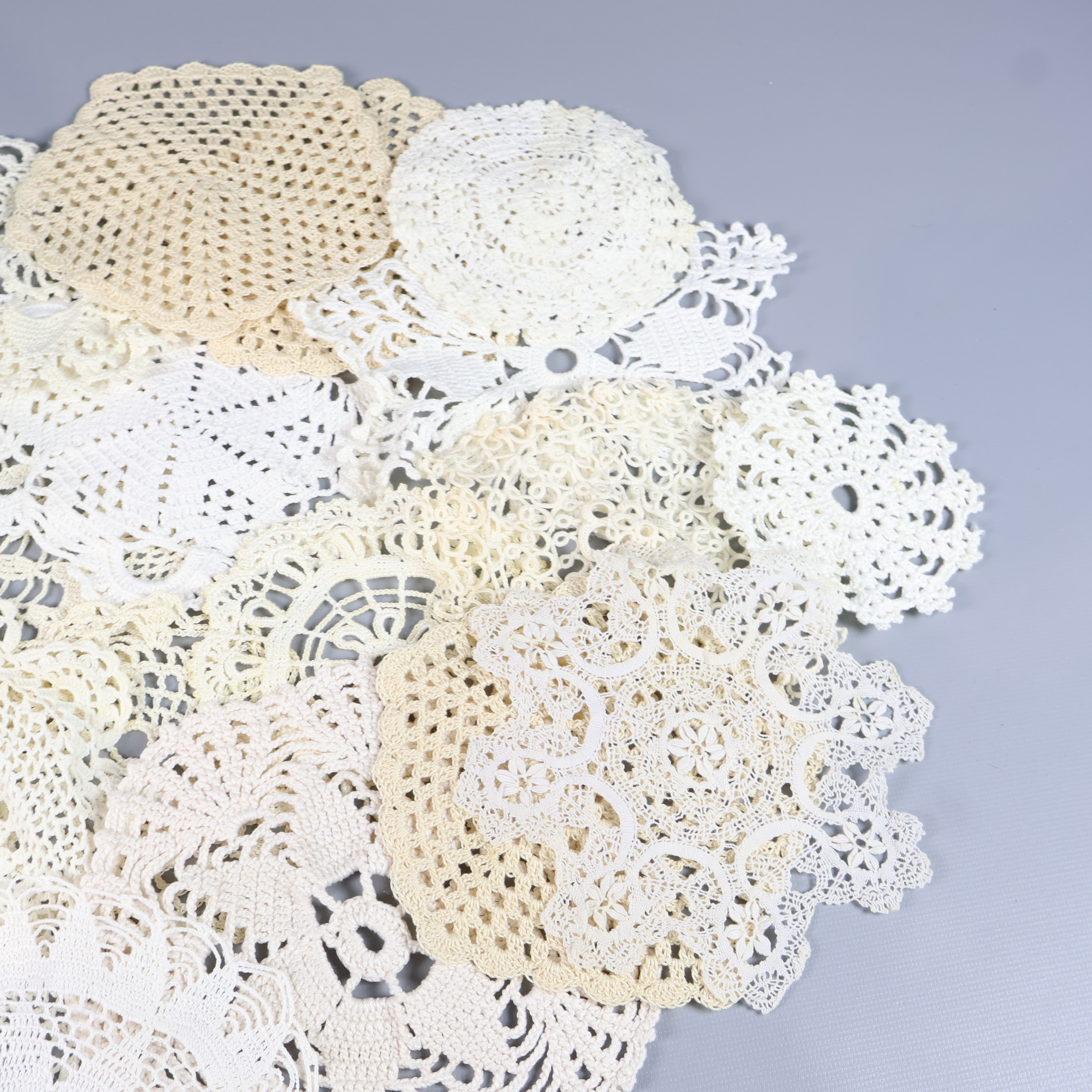 Flera handgjorda virkade spetsdukar i olika storlekar och former, med vackra mönster i ljusa naturtoner från vitt till beige. Skapar en mysig och vintage vibe i vilket rum som helst. Varje duk har unika detaljer och ett klassiskt uttryck som ger en charmig känsla. Perfekt till att använda tillsammans eller var och en för sig som dekoration.