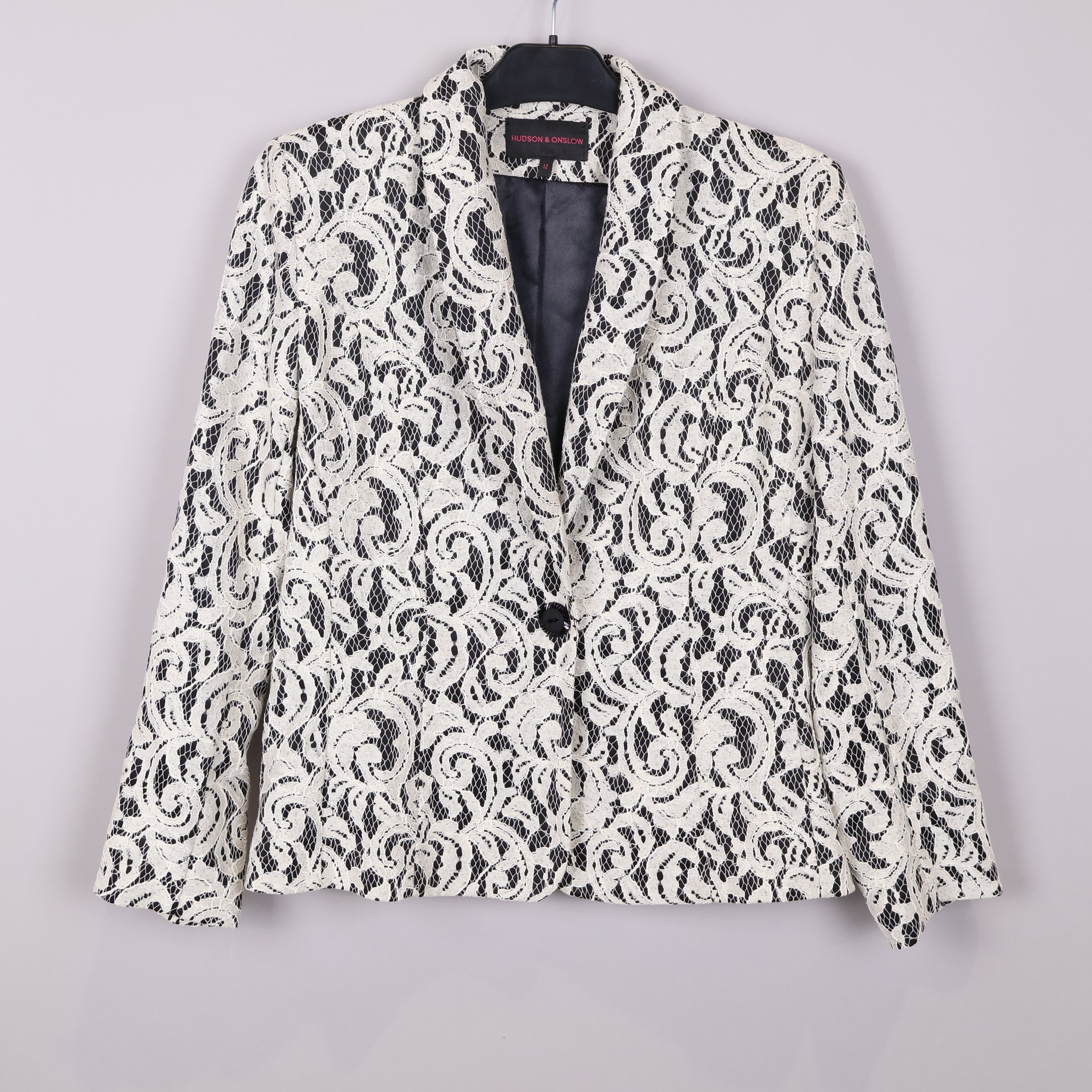 Elegant blazer med spetsmönster i svart och vitt. Klassisk design med enkelknäppning och öppen framstil. Detaljerad spets ger en unik touch som passar både formella och avslappnade tillfällen. Tillverkad för en bekväm passform med avslappnad känsla.
