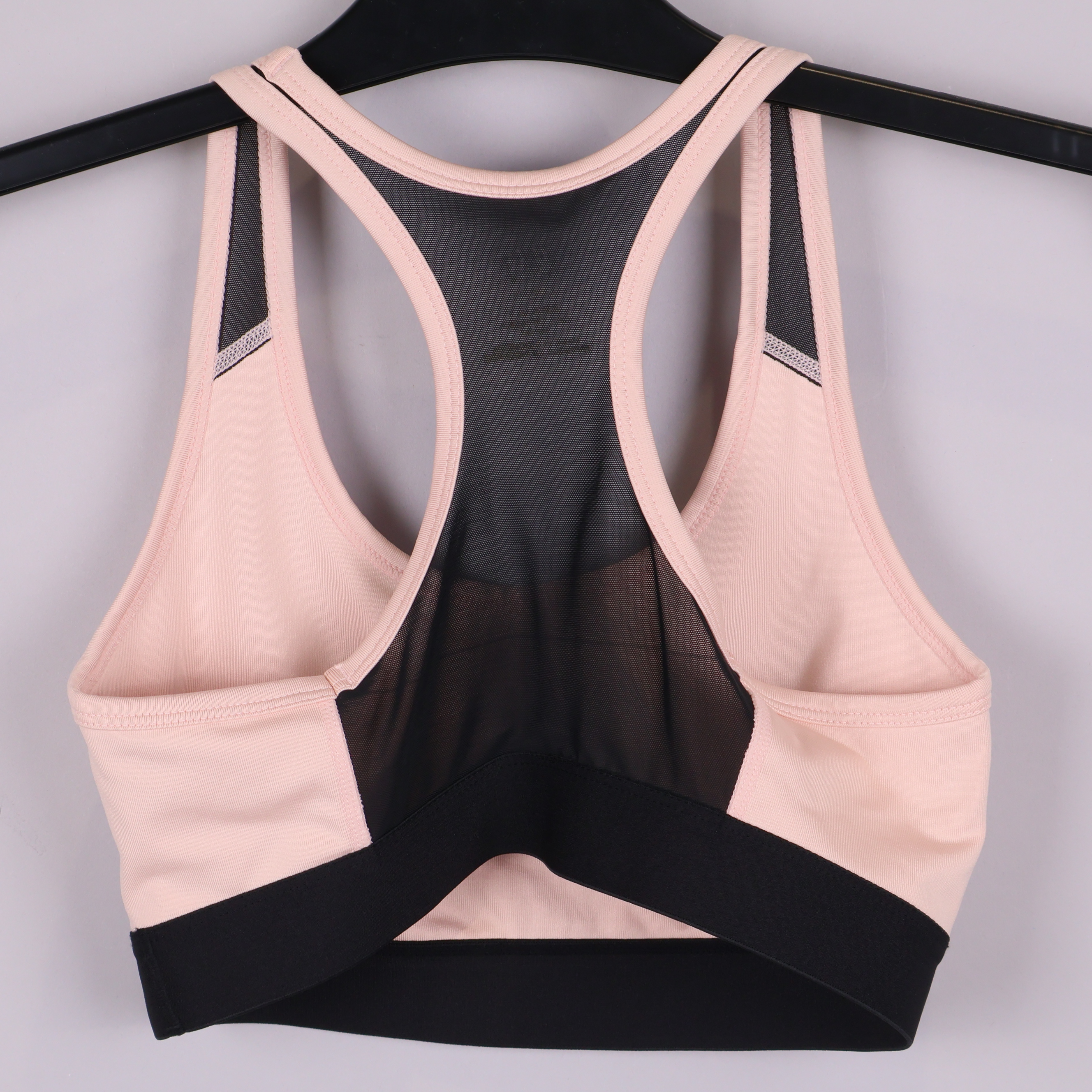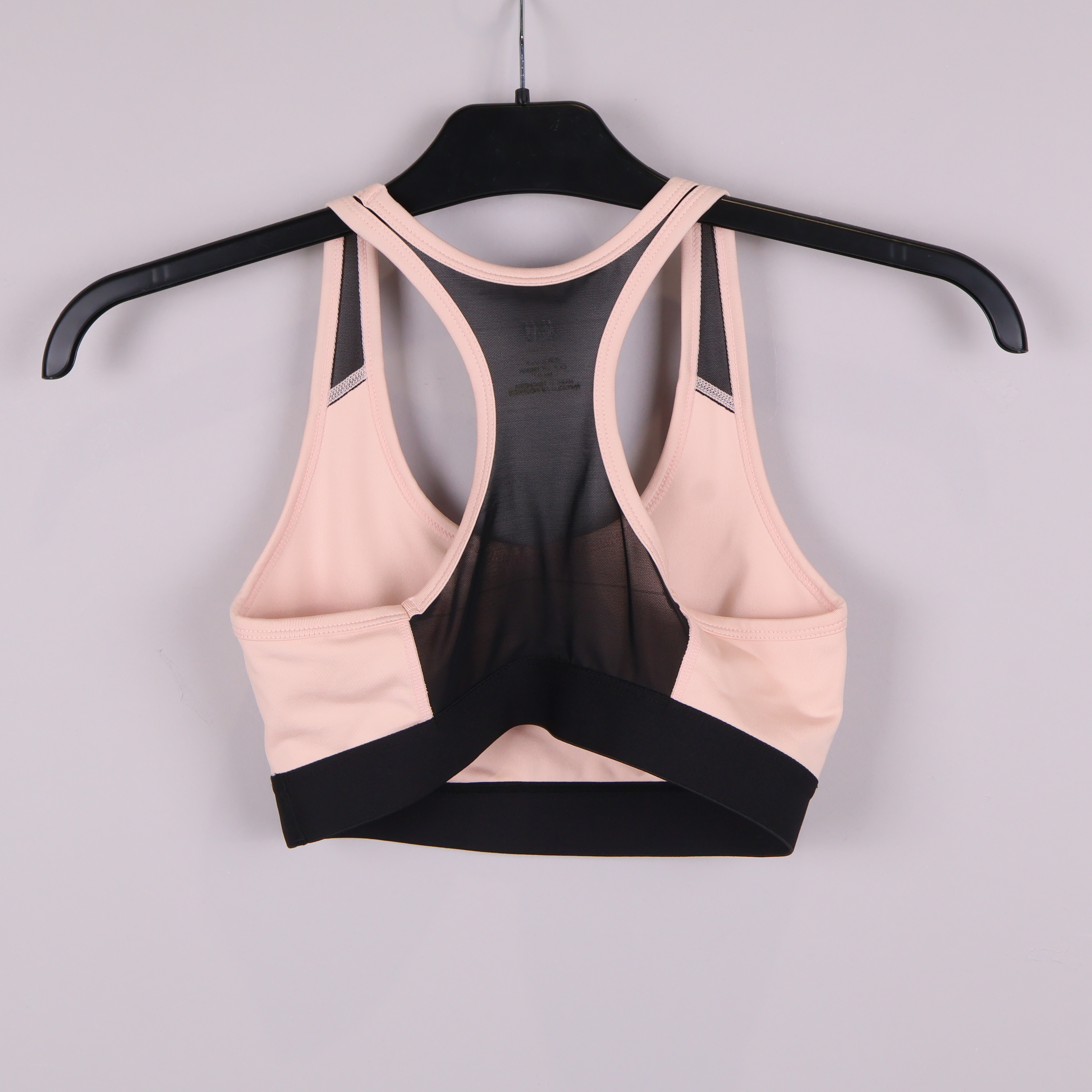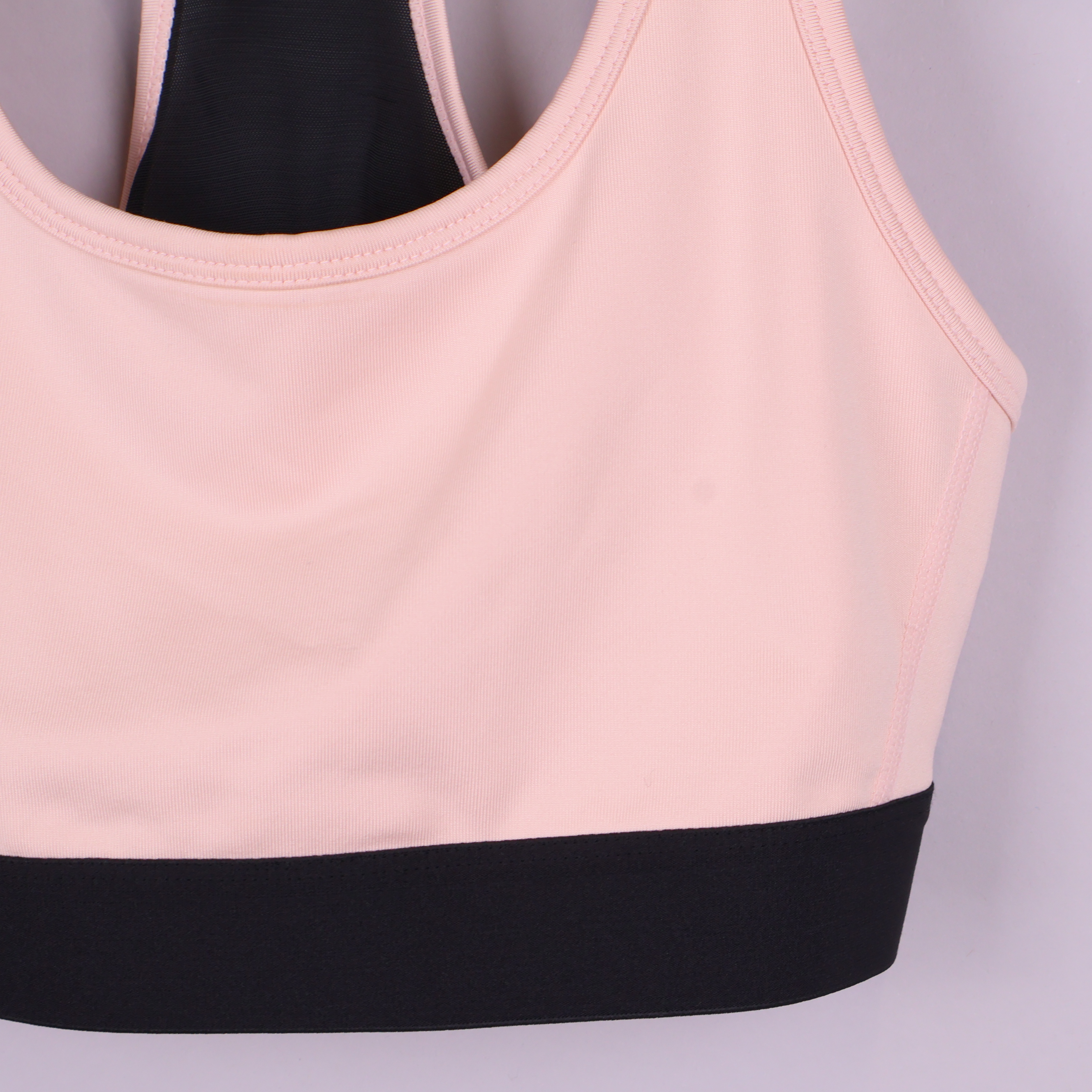 Sport-bh i ljusrosa med svarta meshdetaljer och bred svart resår nertill. Brottarrygg ger en sportig och modern look medan meshpartierna säkerställer extra ventilation.