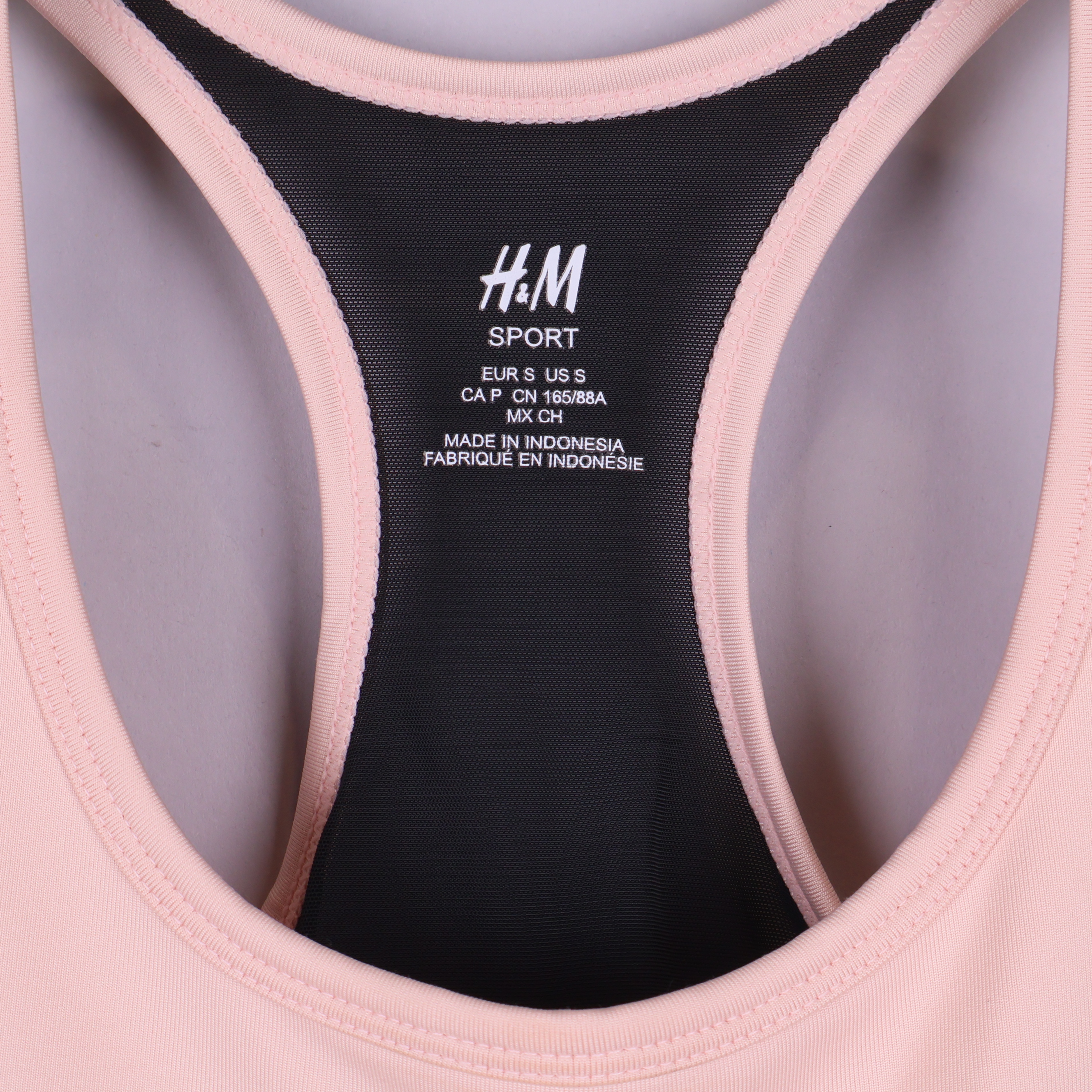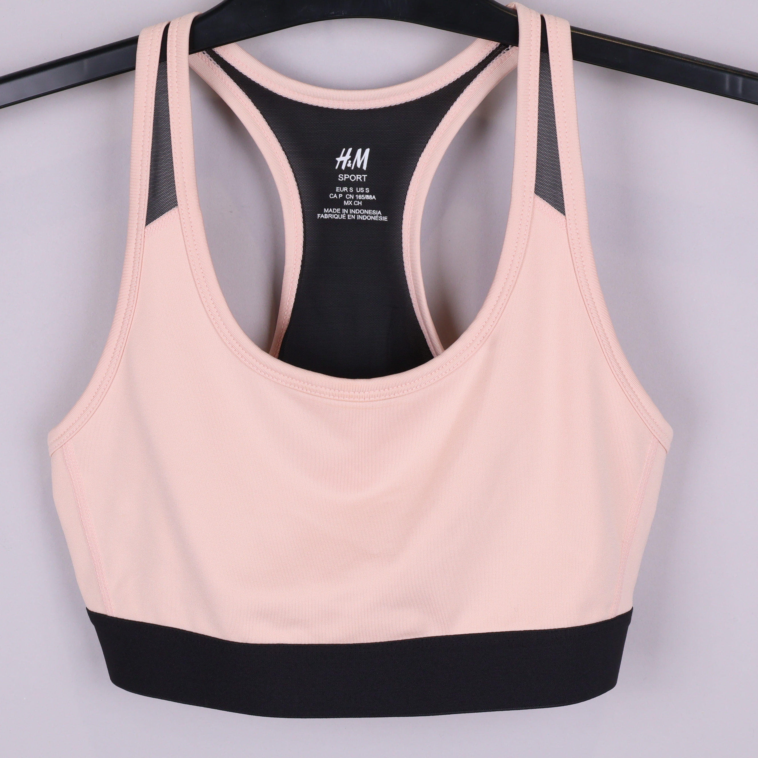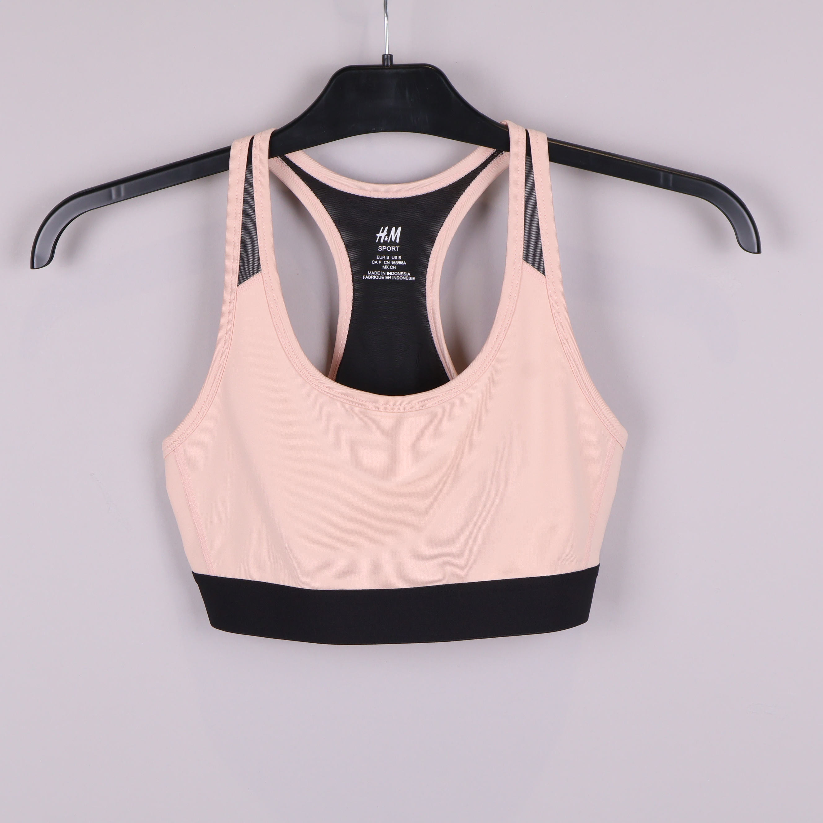 Sport-bh i ljusrosa med svarta meshdetaljer och bred svart resår nertill. Brottarrygg ger en sportig och modern look medan meshpartierna säkerställer extra ventilation.