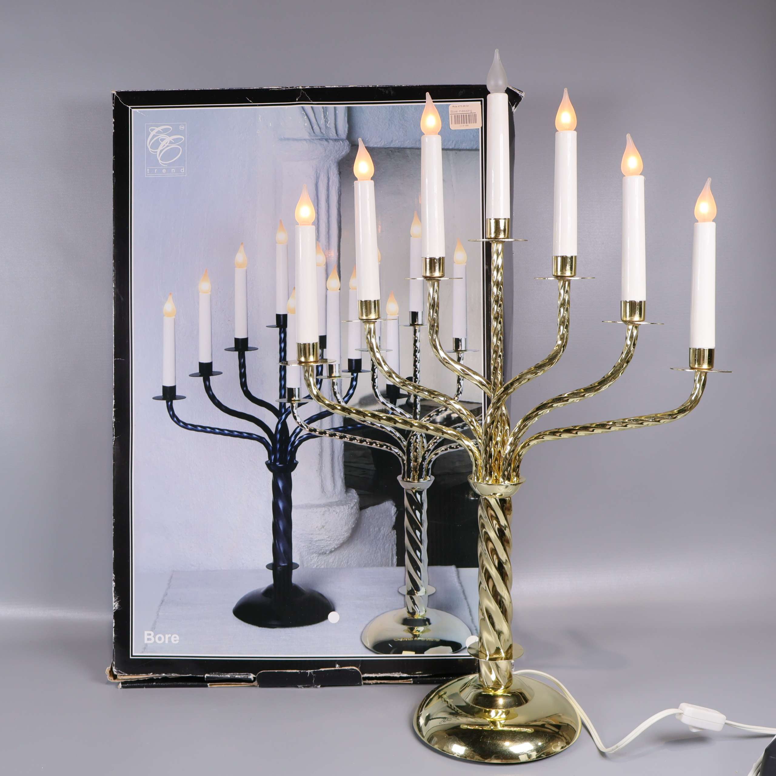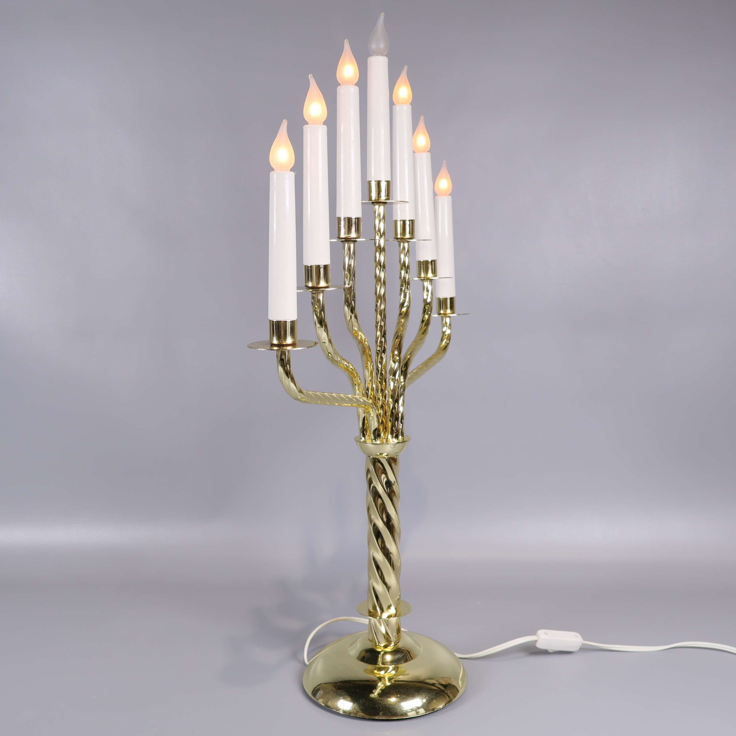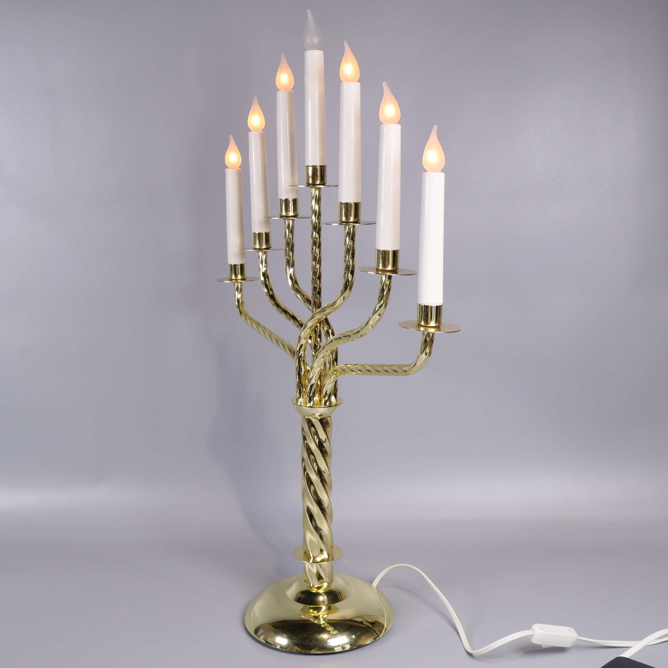 Stilren elektrisk ljusstake med sju armar och klassiskt mässingsfärgat stativ. Spiralvriden design i metallen ger ett elegant uttryck. Utrustad med sju vita ljus som skapar en varm och inbjudande känsla i rummet, perfekt för fönster eller bord.