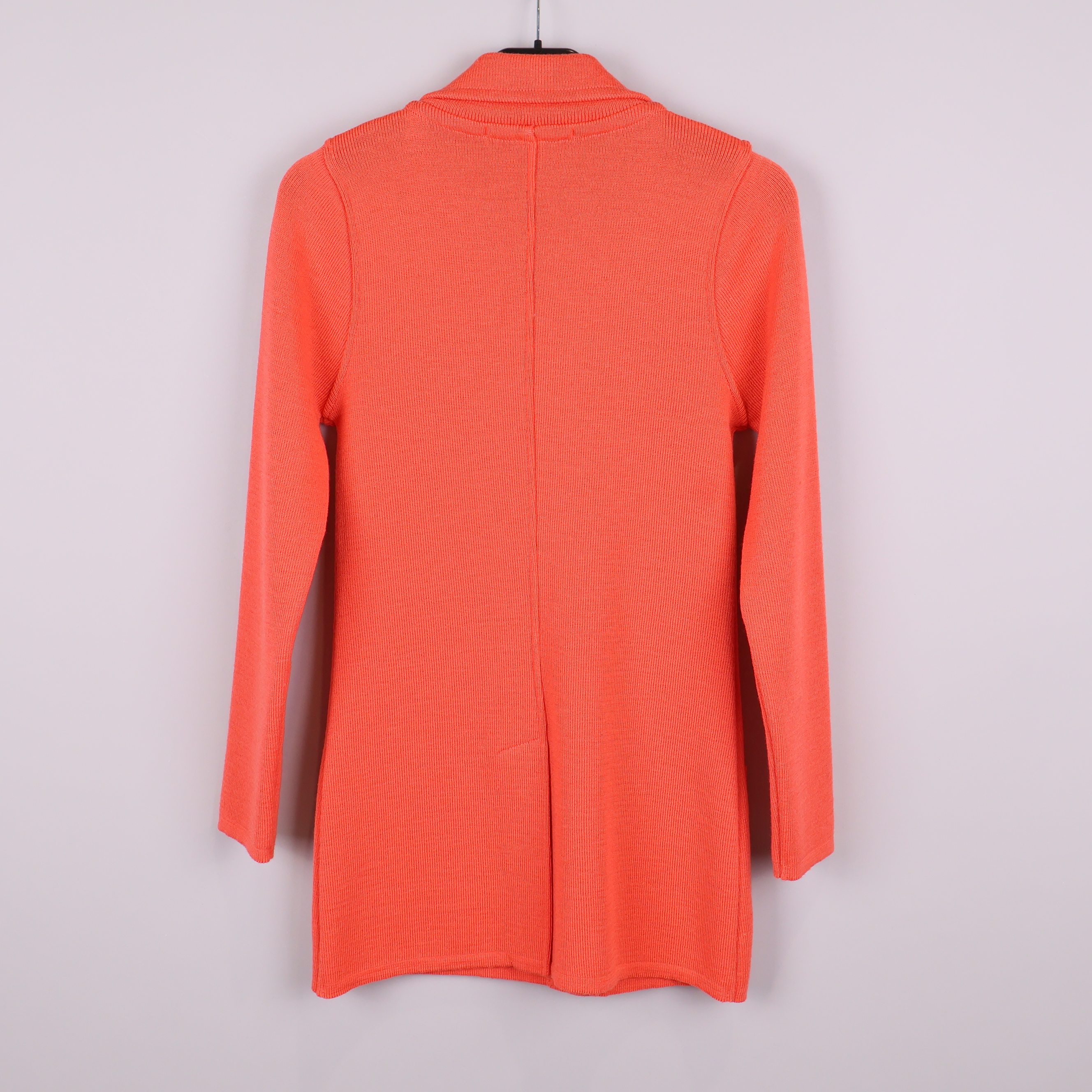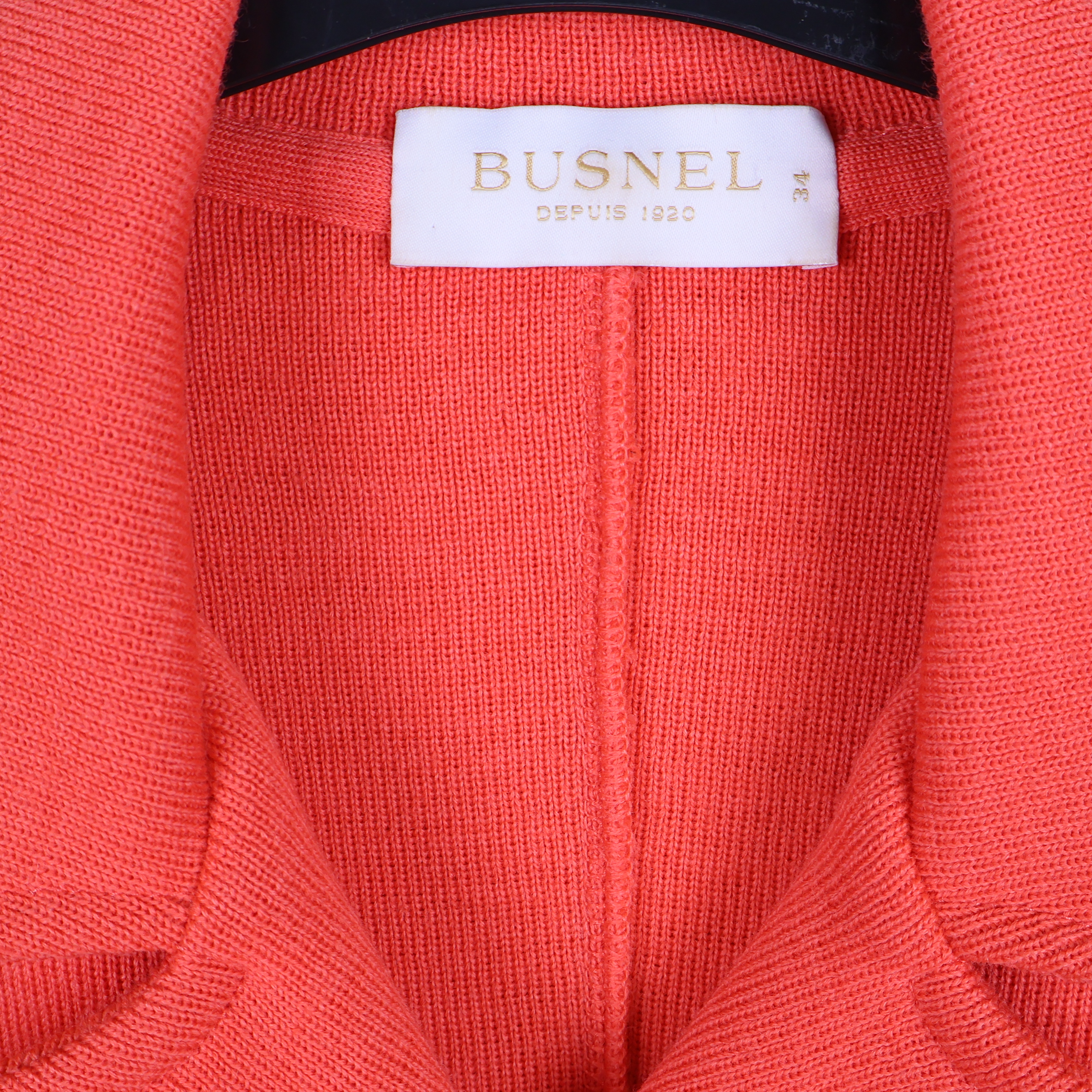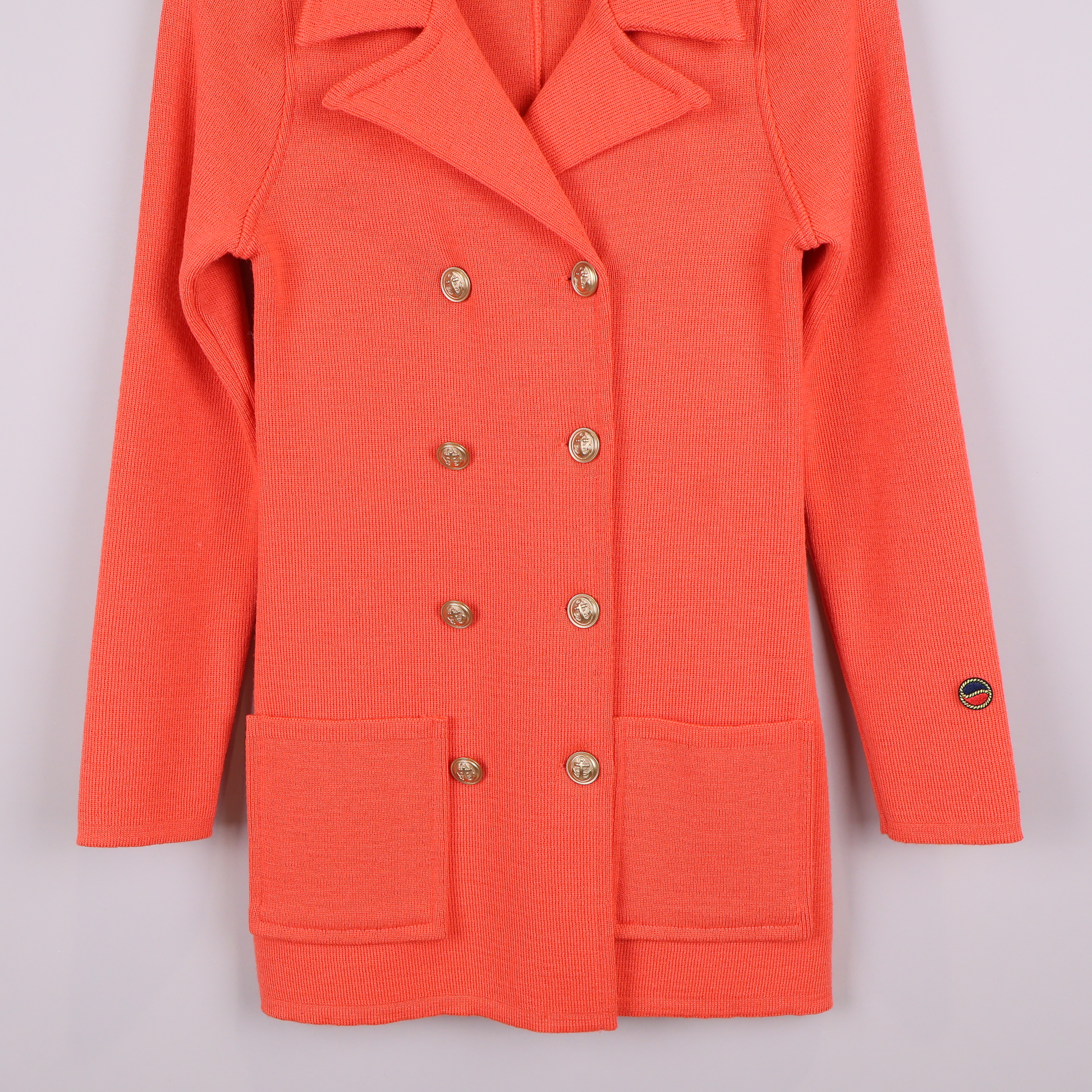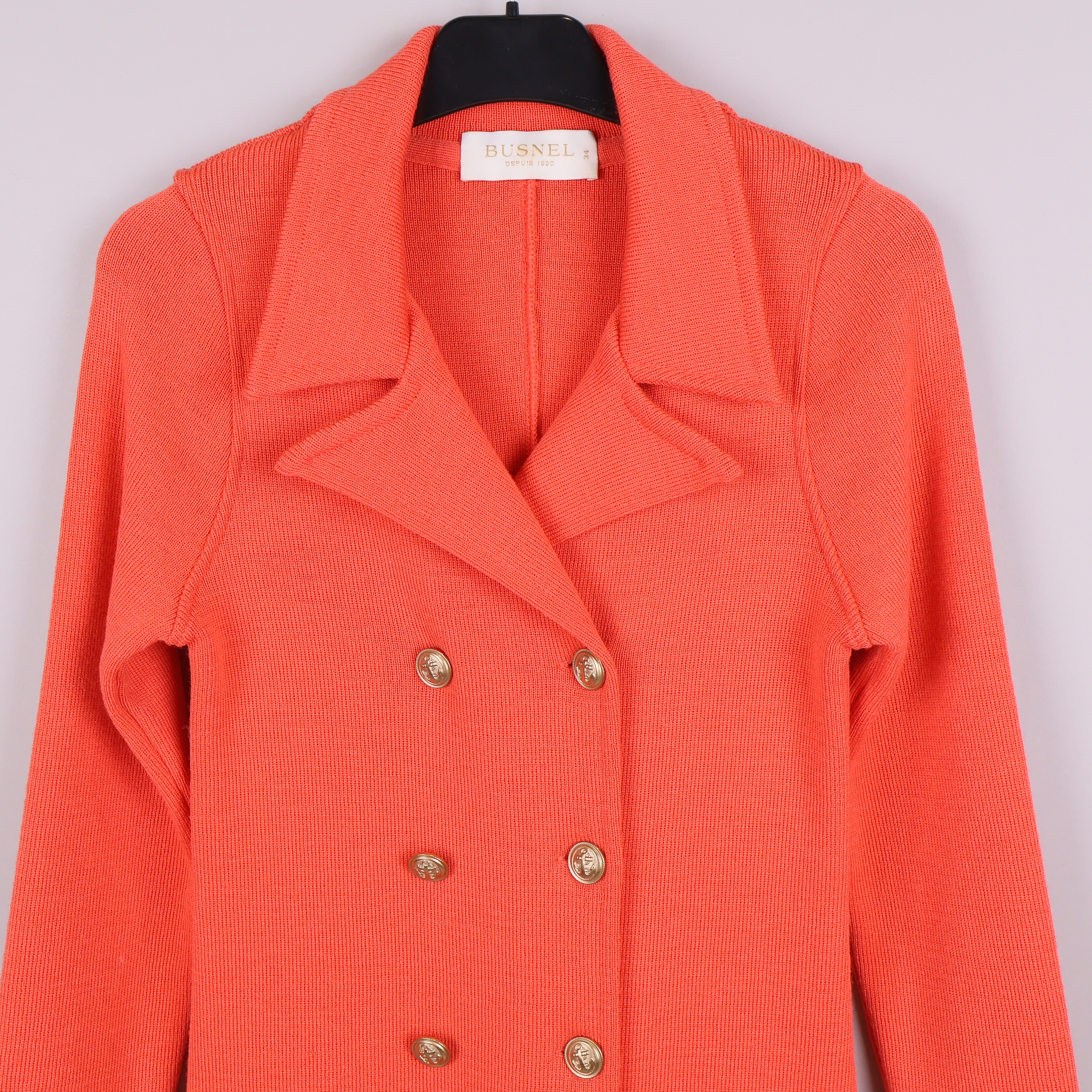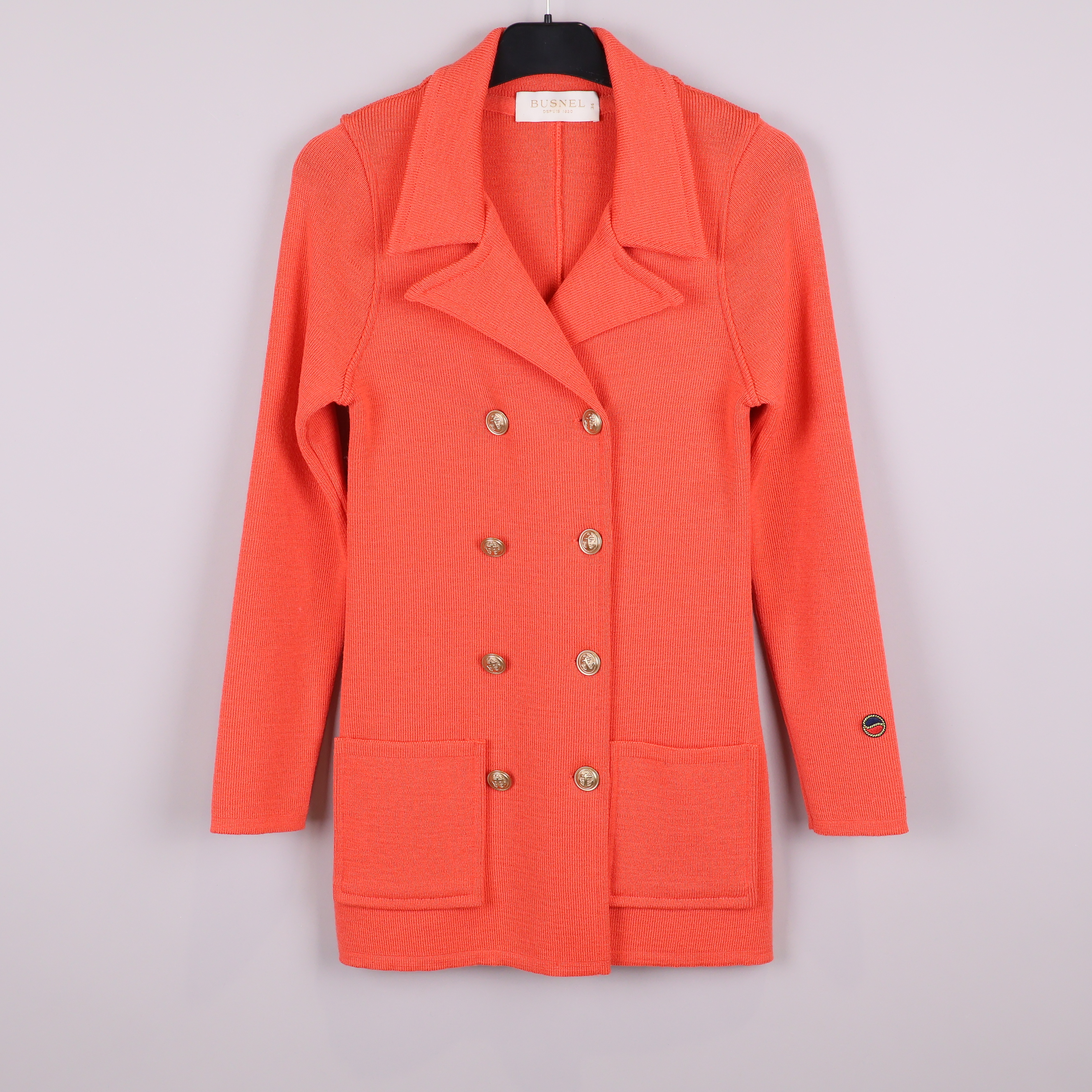 Den här stickade kavajen från Busnel har en härlig aprikos ton och är designad med eleganta guldknappar, bred krage och två stora framfickor. Plagget är gjort i 100% ull och har en stretchig känsla som ger en bekväm och flexibel passform.