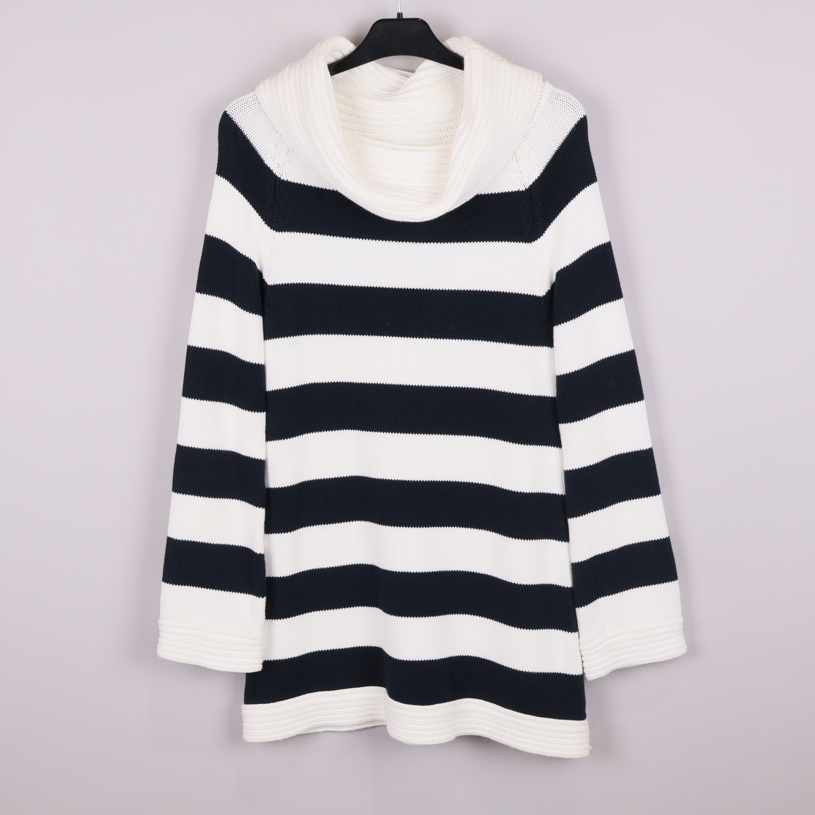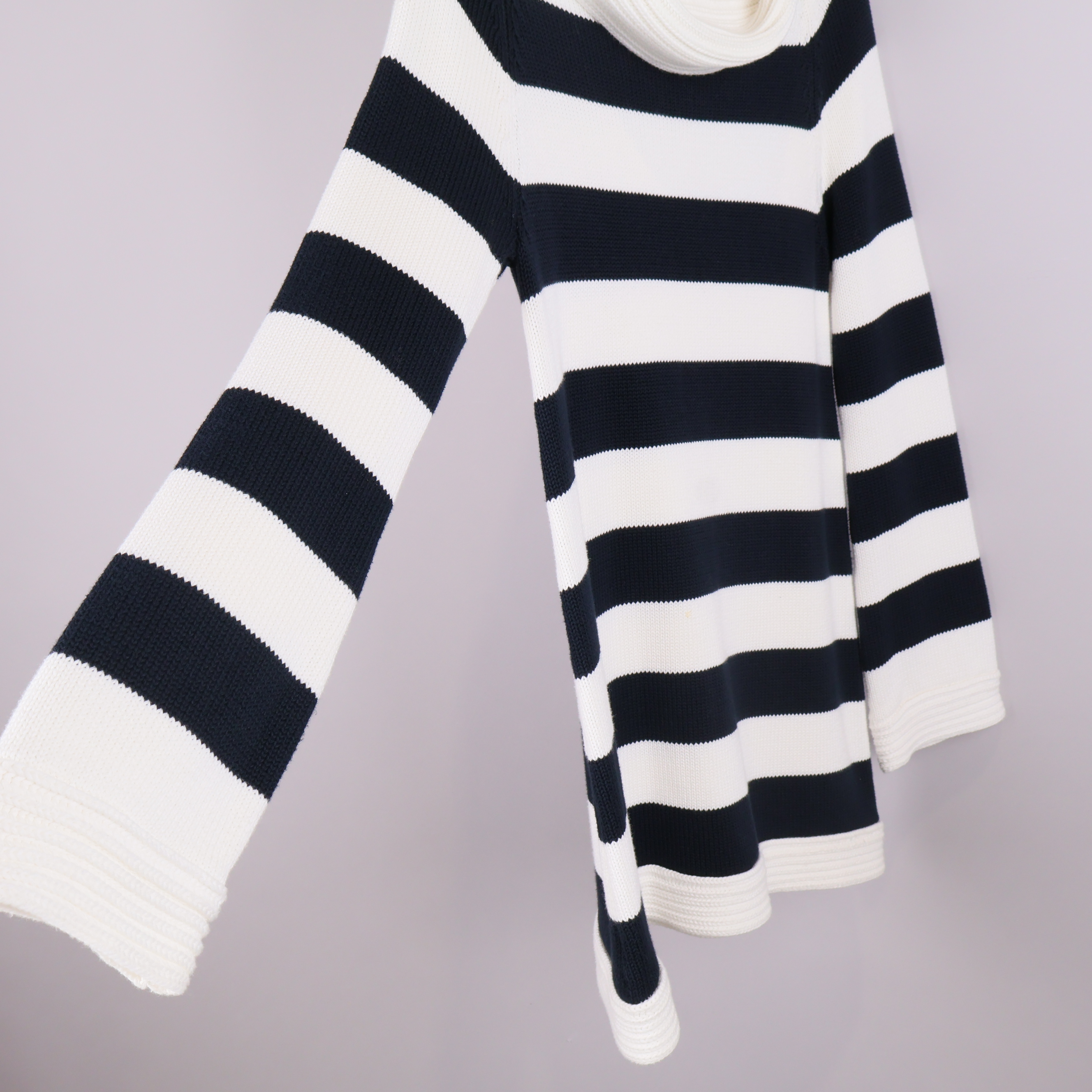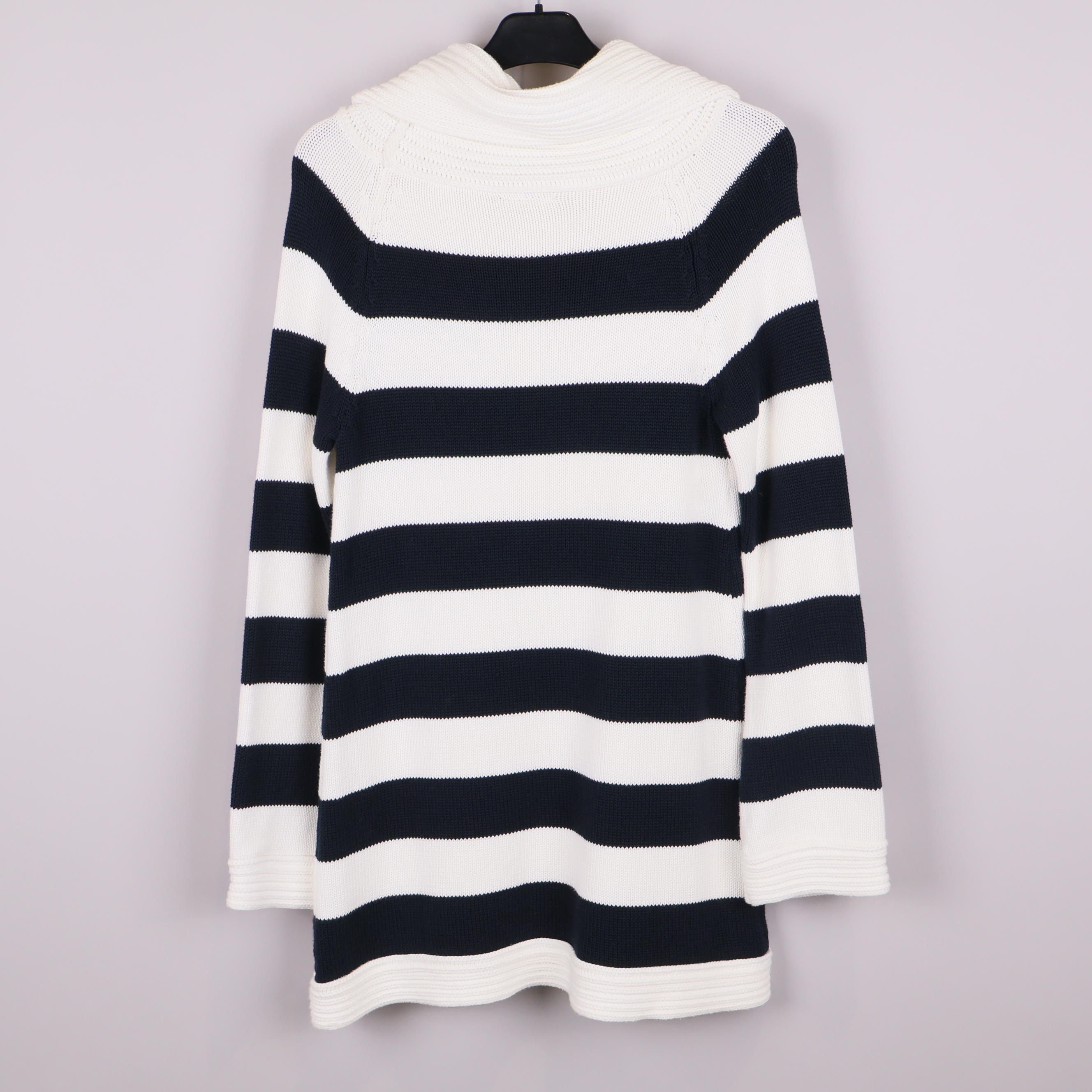 Randig stickad tröja/tunika med breda svart och vita blockränder och en bred sjalkrage som ger en mysig och modern känsla.