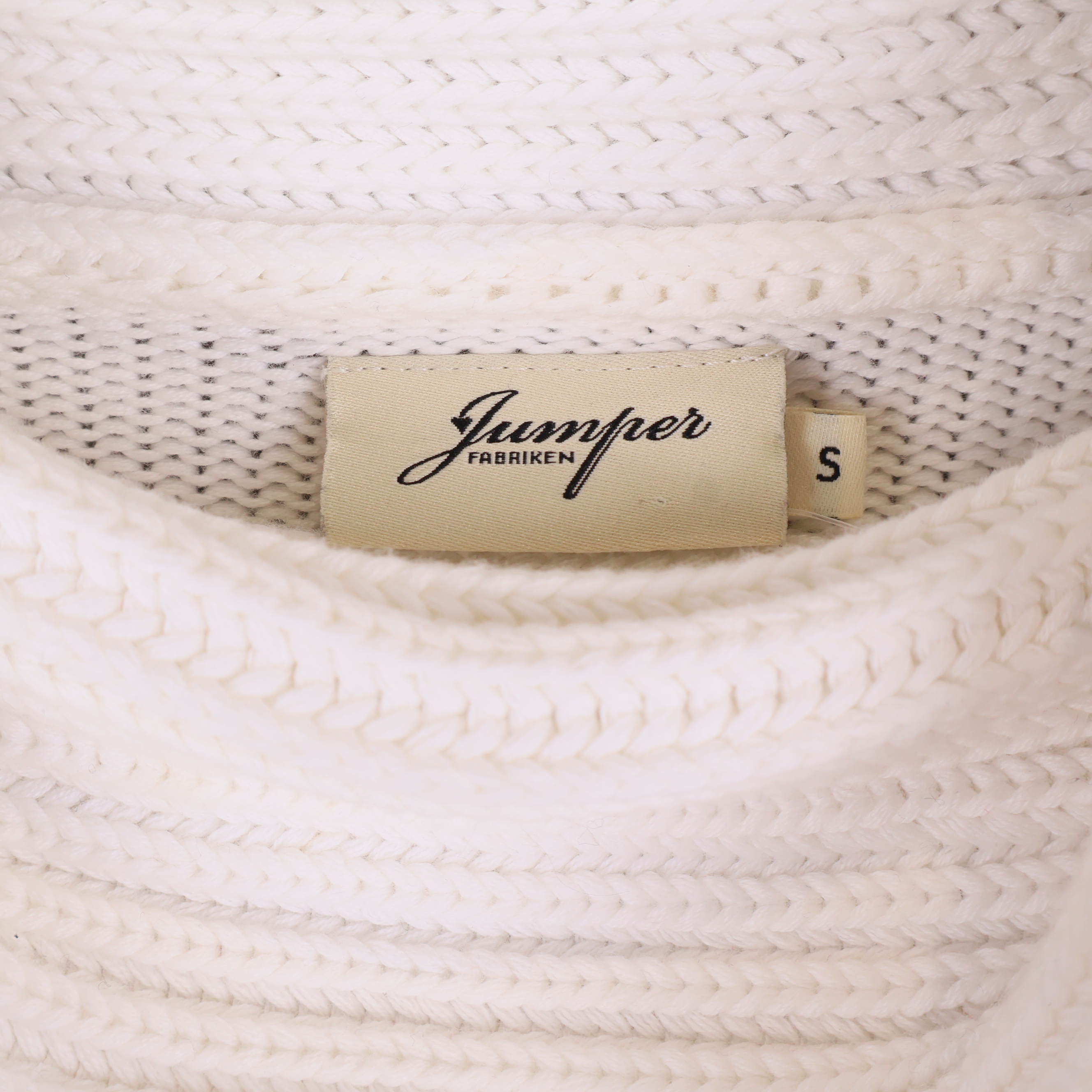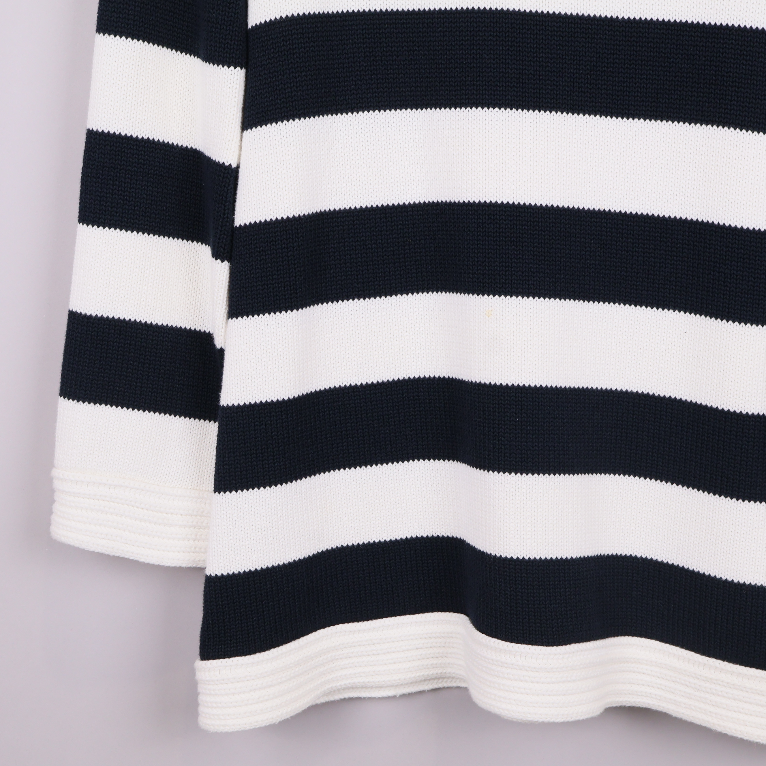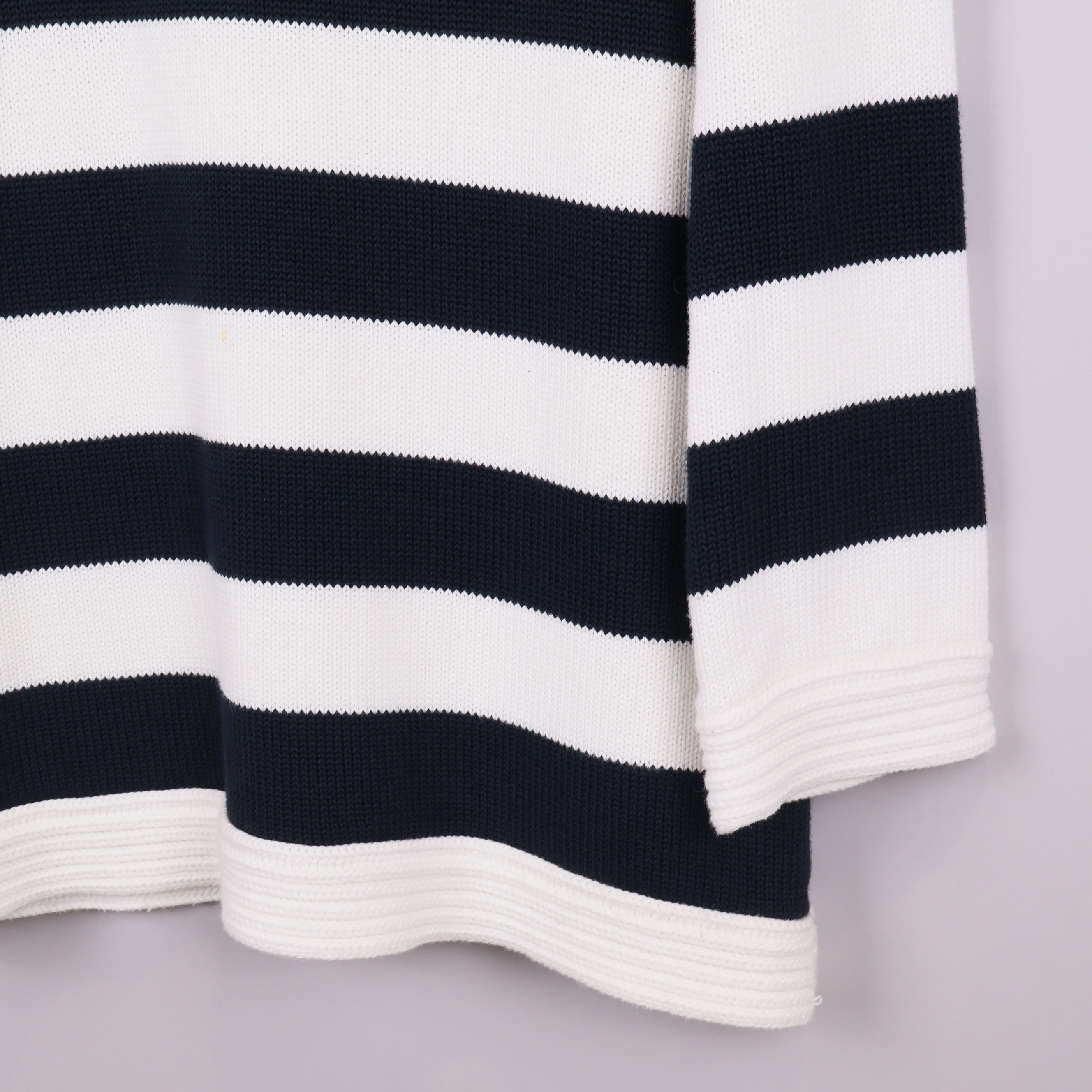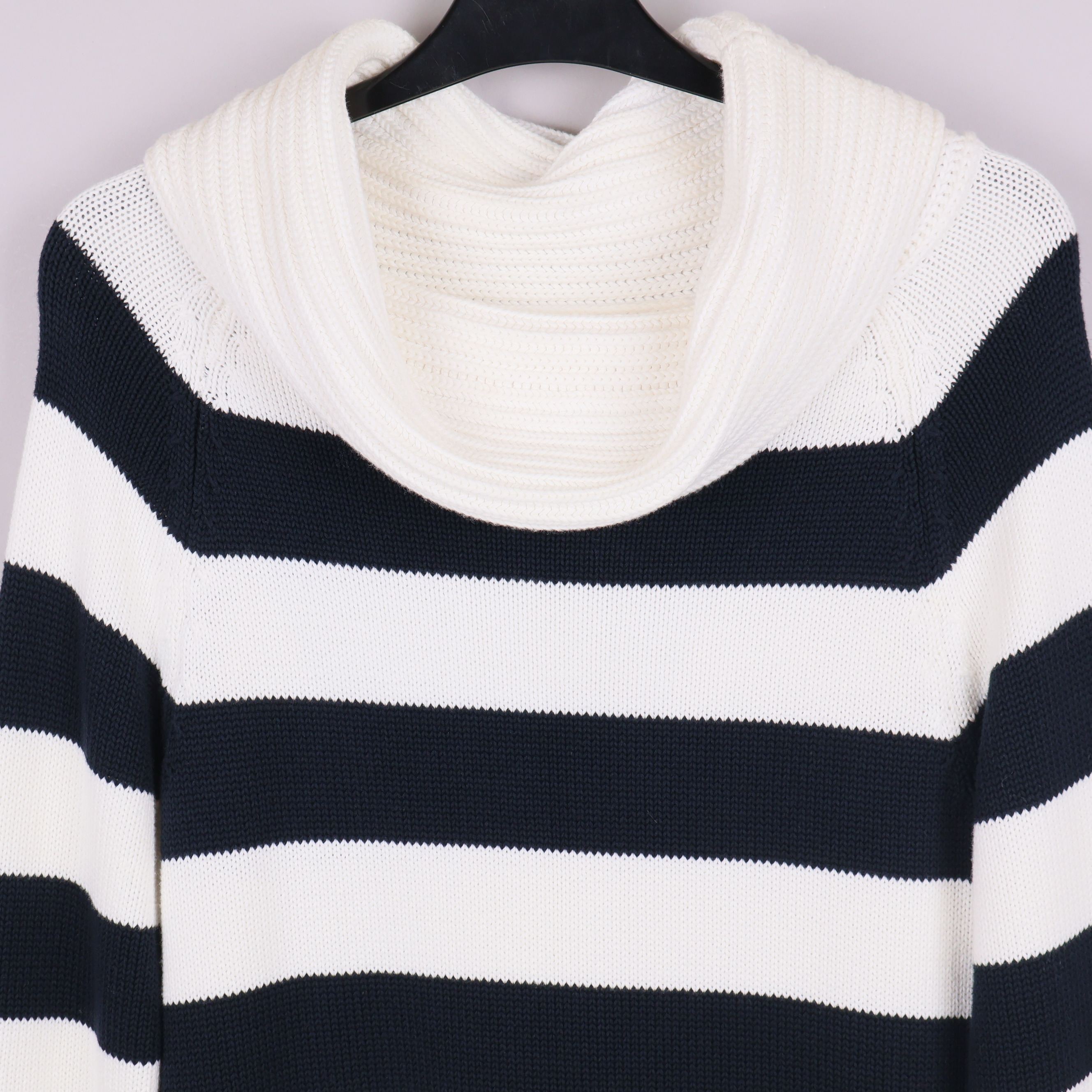 Randig stickad tröja/tunika med breda svart och vita blockränder och en bred sjalkrage som ger en mysig och modern känsla.