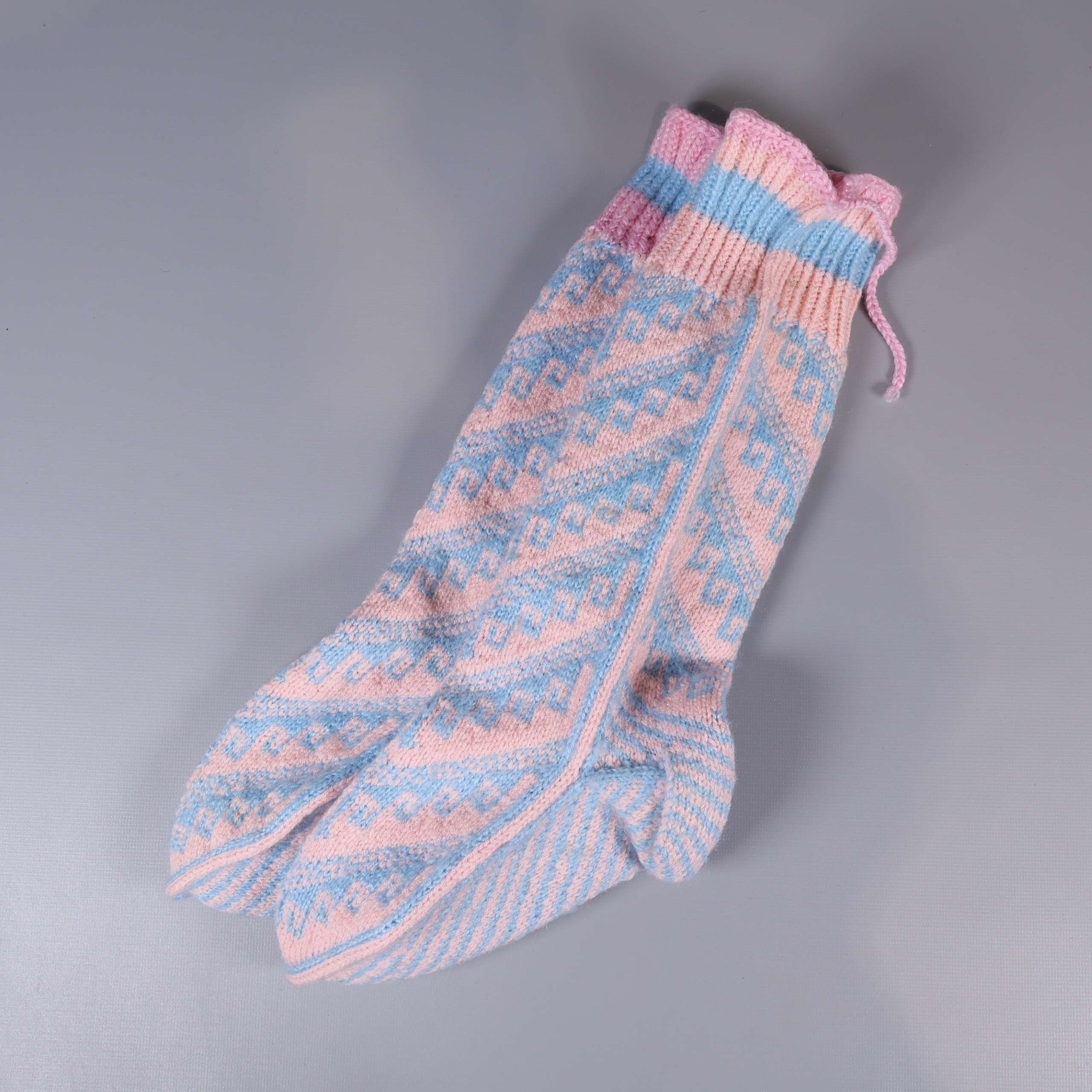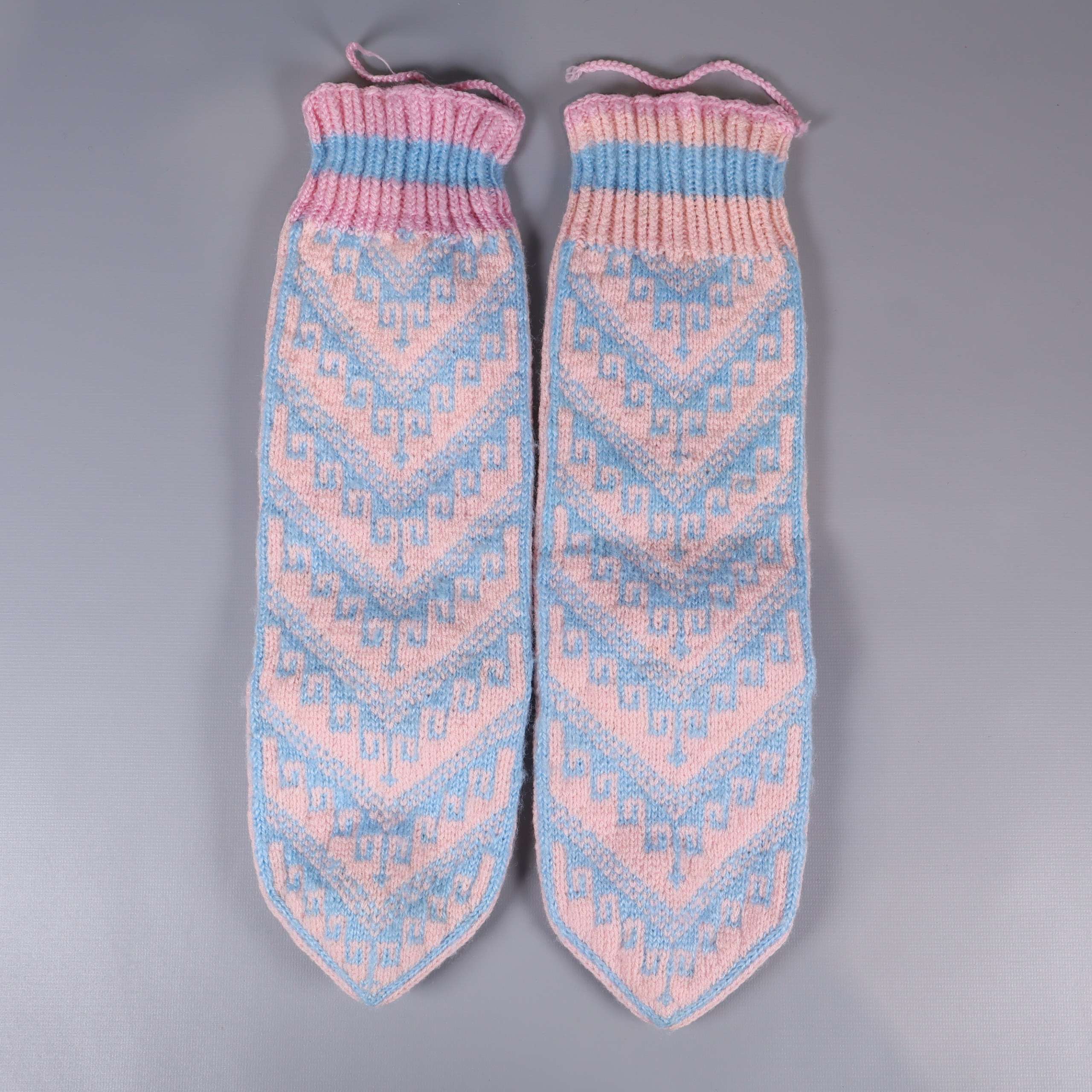 Mjuka stickade sockor i pastellfärger med dekorativt mönster och resår upptill. De kombinerar ljusrosa och ljusblå nyanser och ger en härlig retrokänsla – perfekta för dig som gillar färgglada accessoarer. Storlek: ca 36