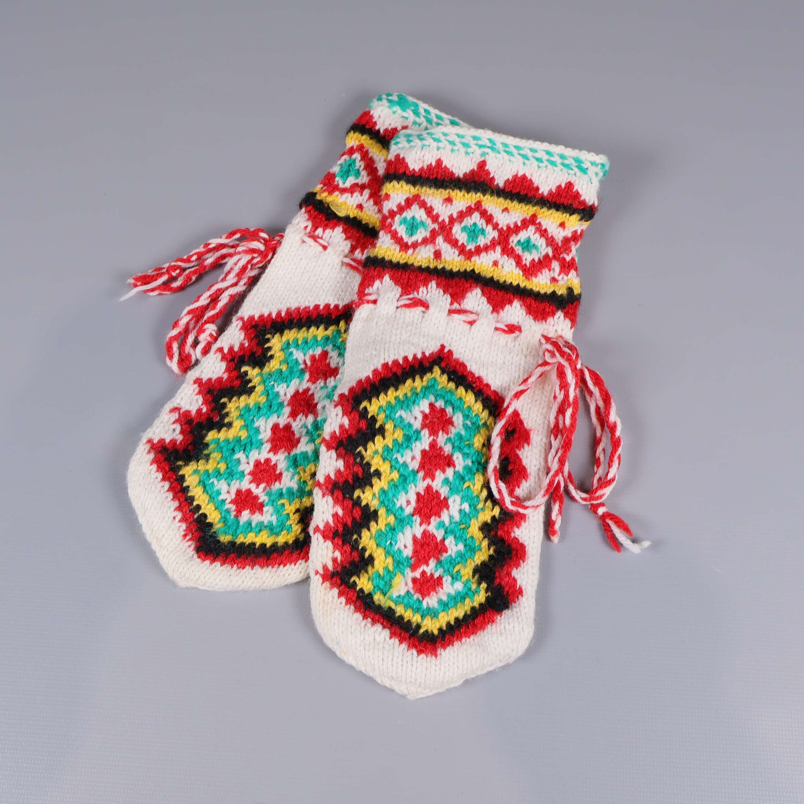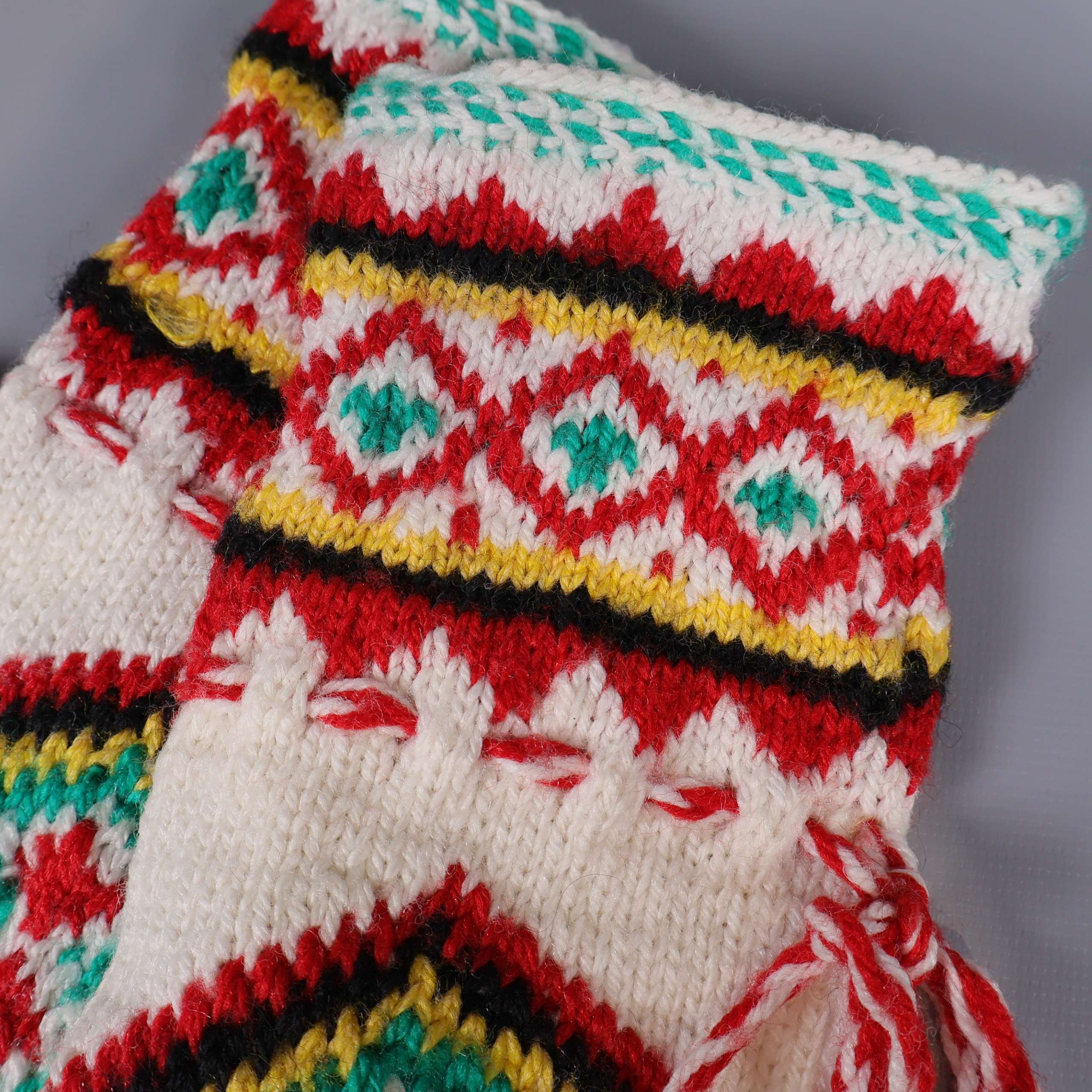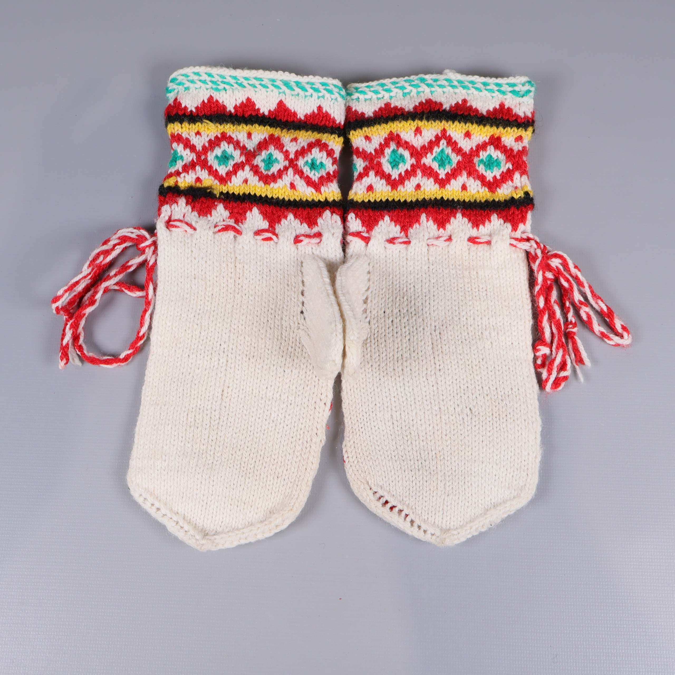 Färgglada stickade tumvantar med härligt mönster och charmiga snoddar i rött och vitt vid handleden. Designen bjuder på lekfulla färger som röd, grön, svart och gul på en vit grund, vilket ger ett riktigt livfullt uttryck. Perfekt för dig som gillar det handgjorda och vill ha ett unikt accessoar-tillbehör med traditionell känsla.