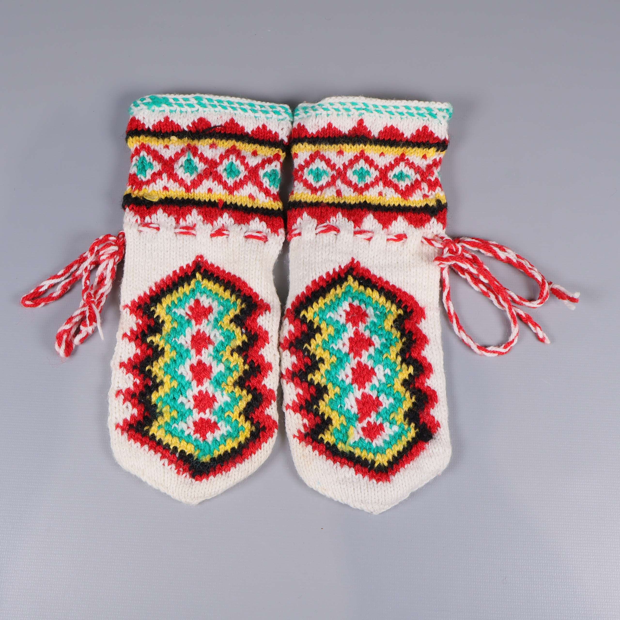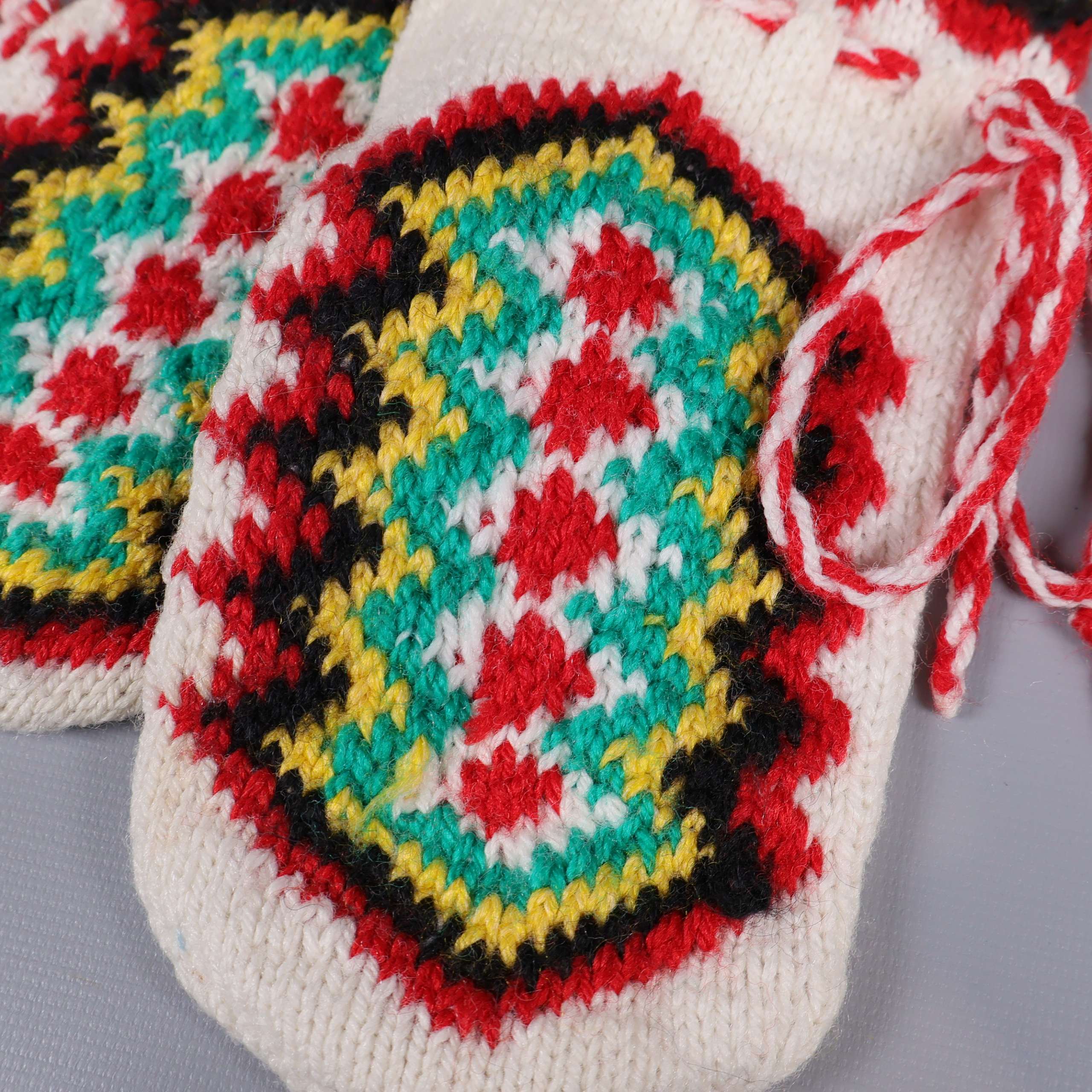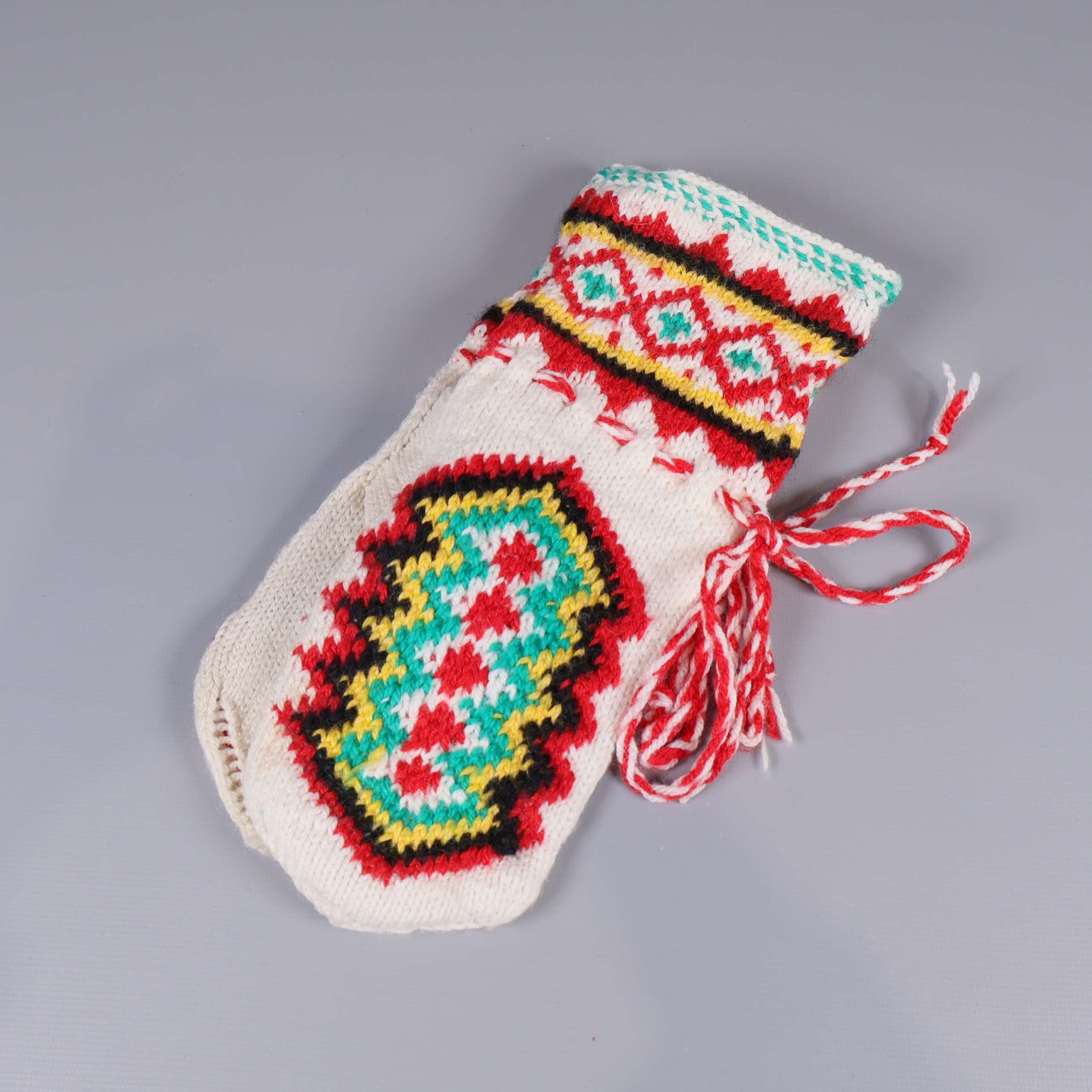 Färgglada stickade tumvantar med härligt mönster och charmiga snoddar i rött och vitt vid handleden. Designen bjuder på lekfulla färger som röd, grön, svart och gul på en vit grund, vilket ger ett riktigt livfullt uttryck. Perfekt för dig som gillar det handgjorda och vill ha ett unikt accessoar-tillbehör med traditionell känsla.