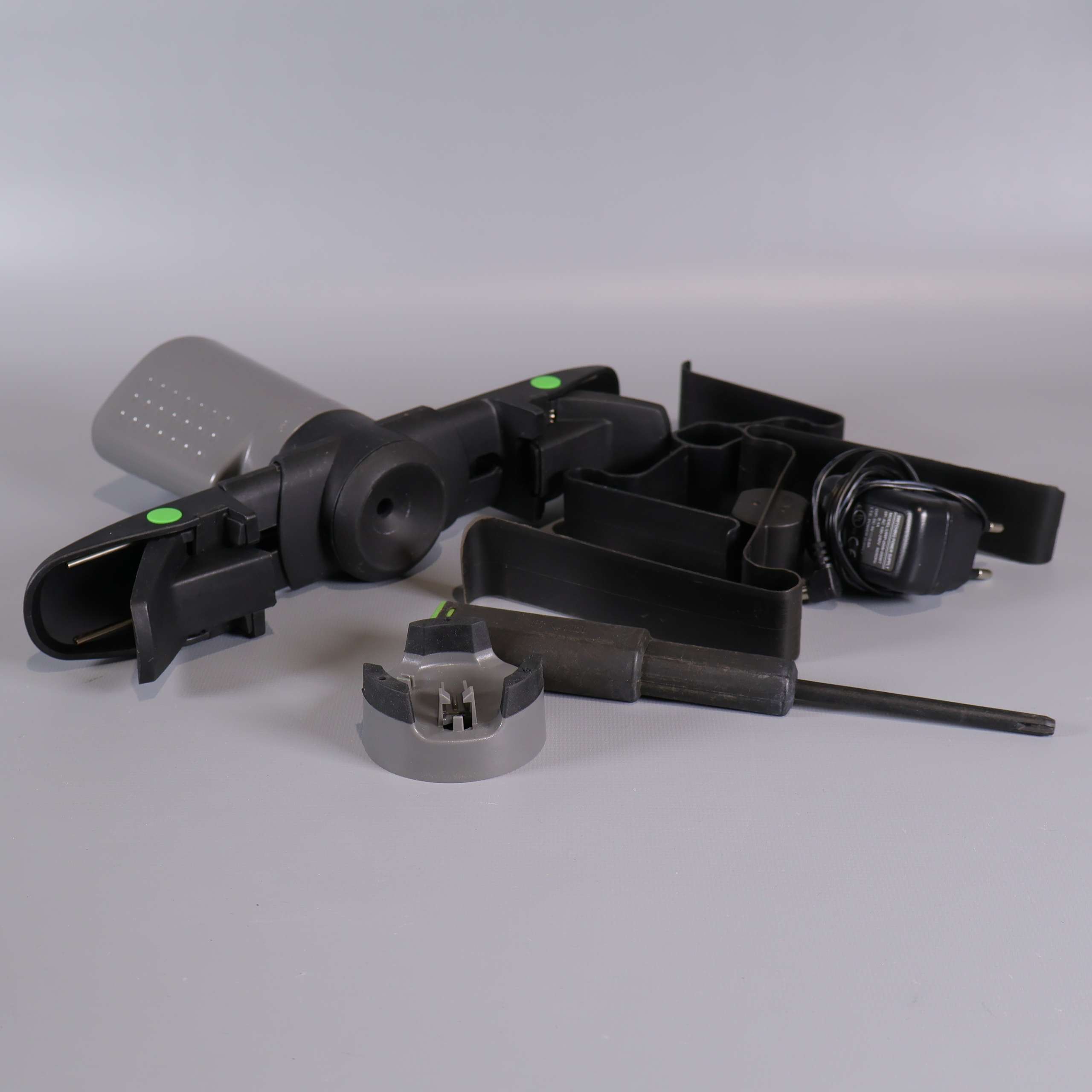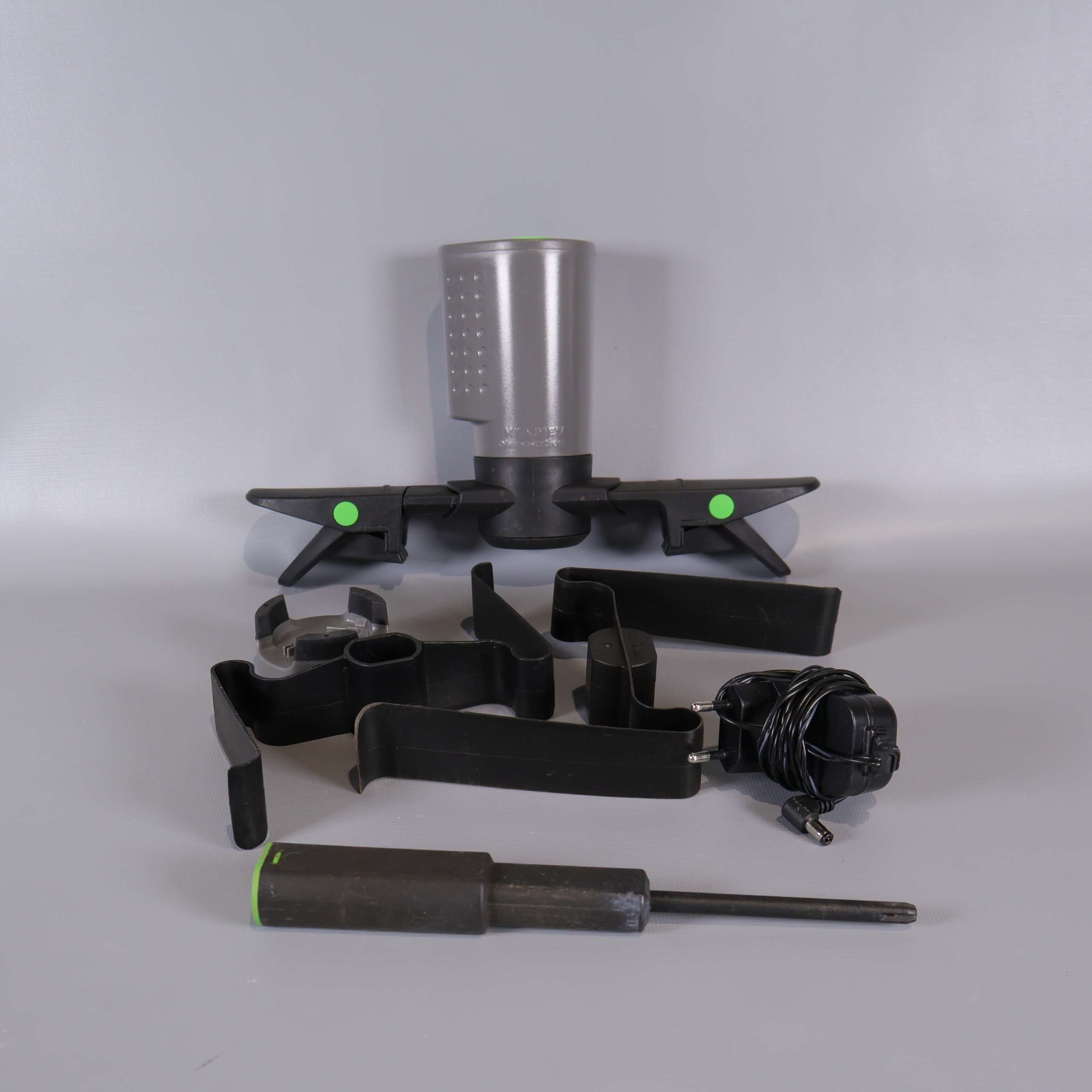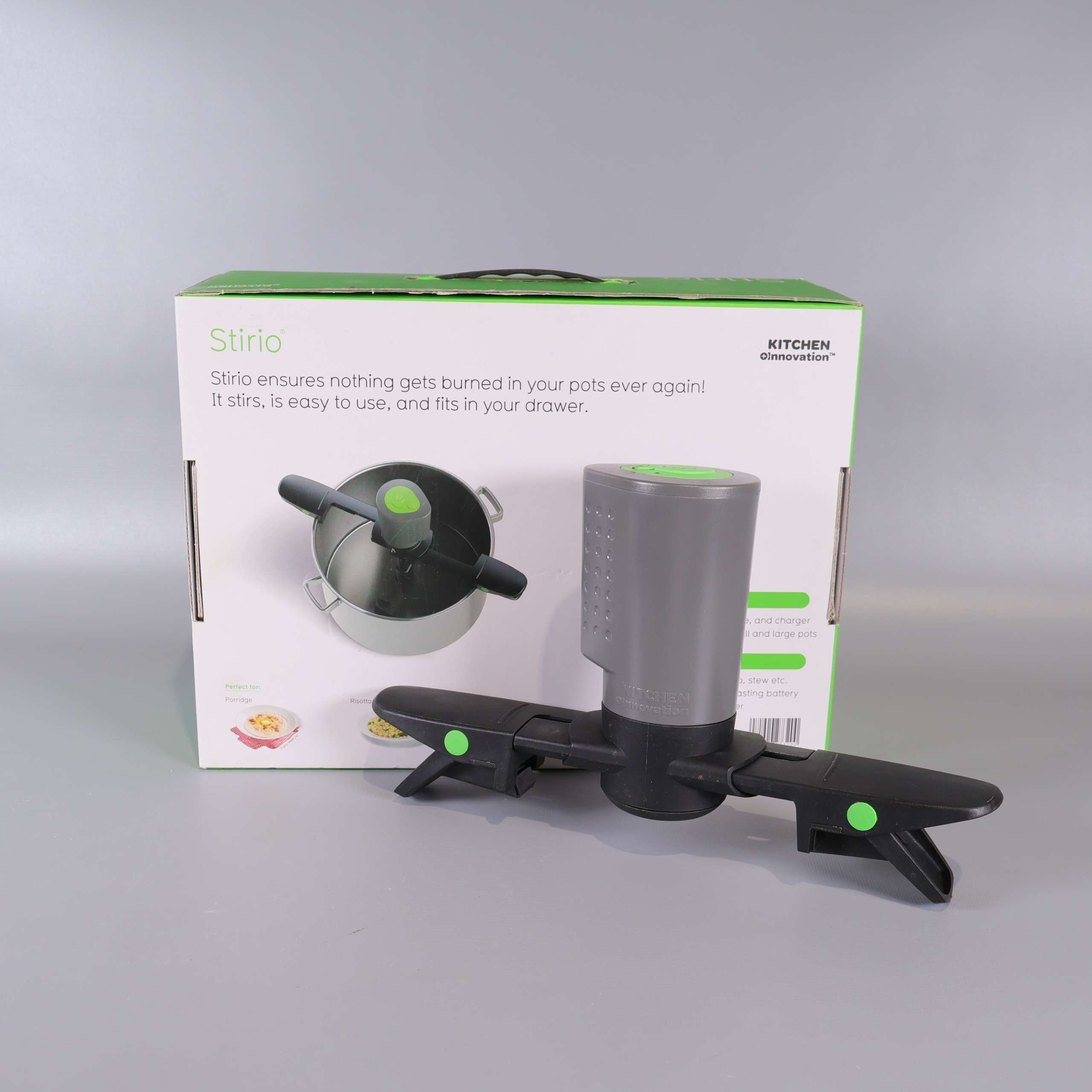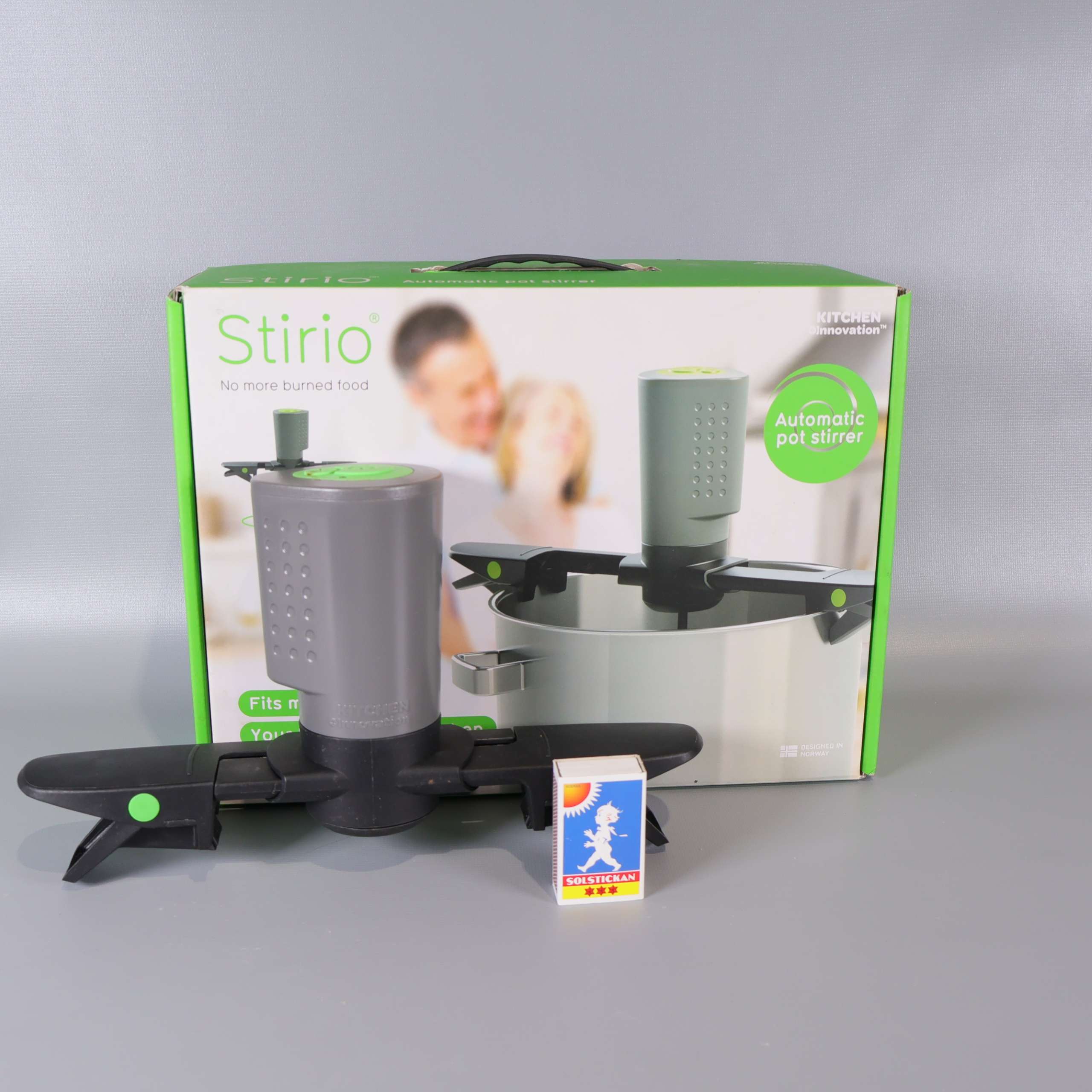 Smart automatisk omrörare för kastruller, med stilren design i svart och grått samt gröna detaljer. Utrustad med enkla reglage på ovansidan och anpassningsbara ben. Perfekt för dig som vill ha handsfree-styrning vid matlagning och en modern köksaccessoar.