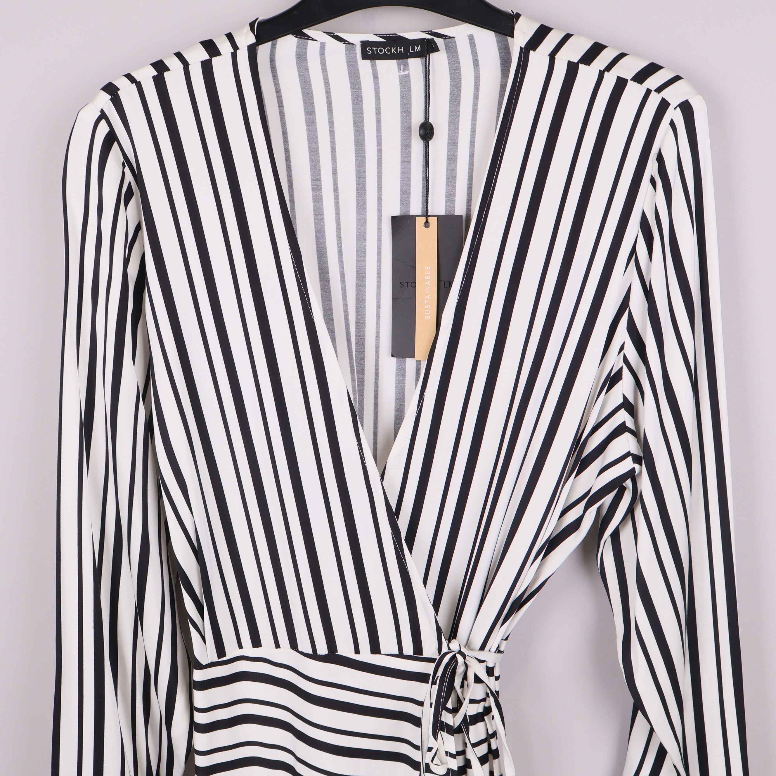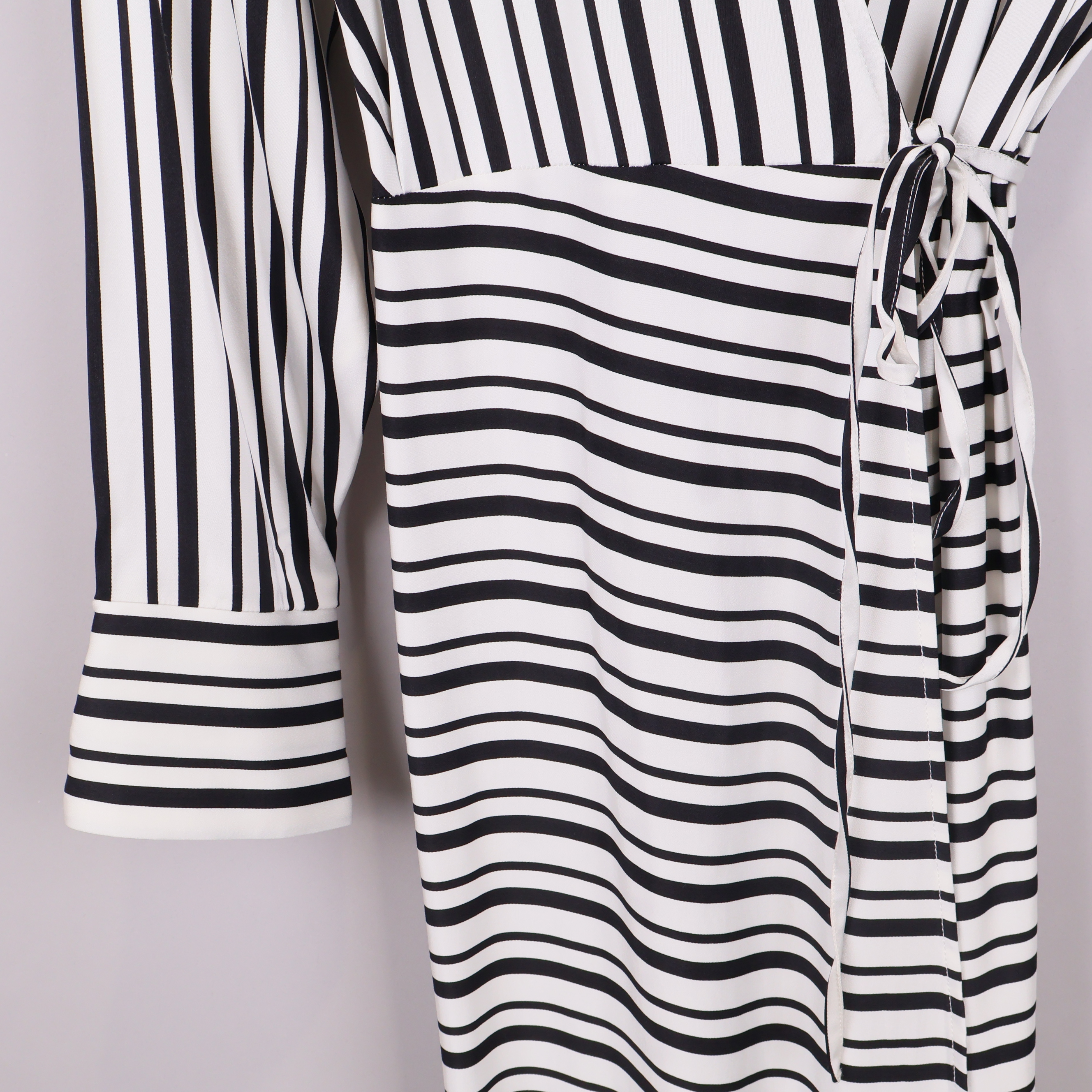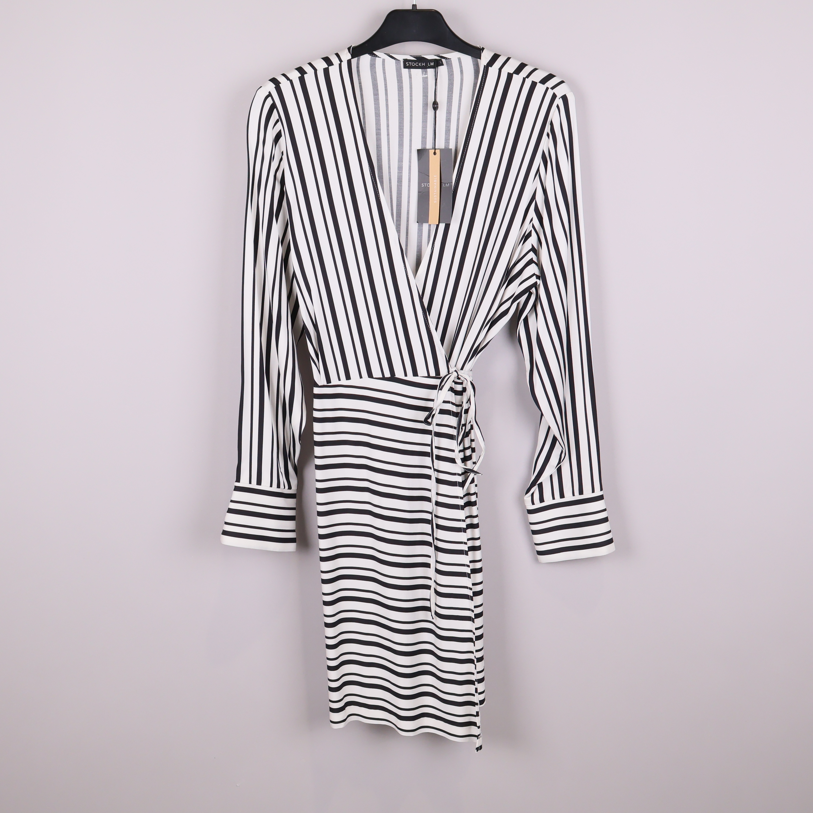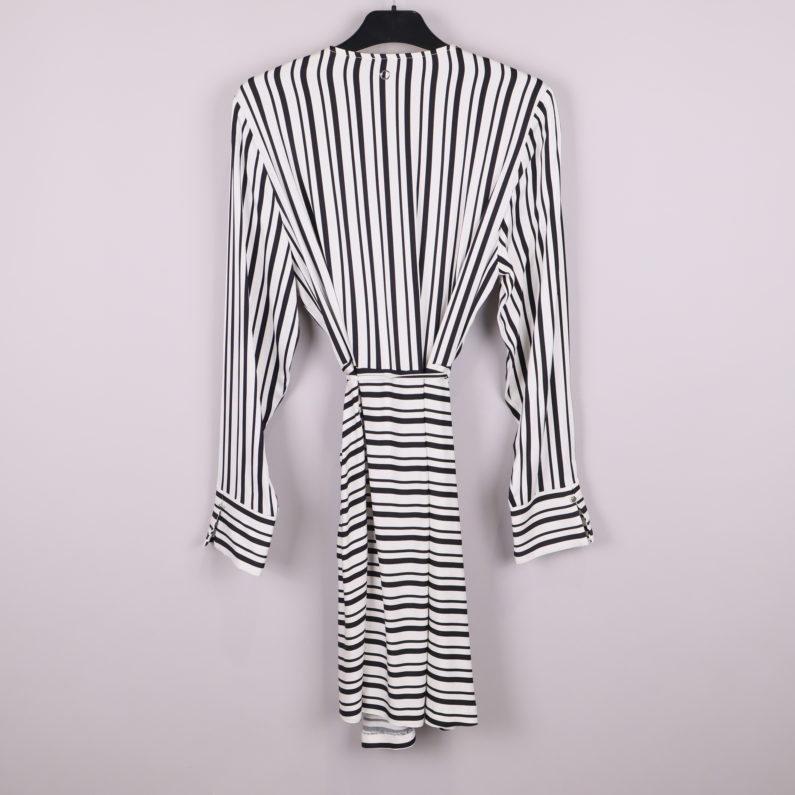 Omlottklänning från STOCKH LM med svartvita ränder och knytband i midjan. Lång ärm med bred manschett och djup v-ringning ger en stilren och modern look.