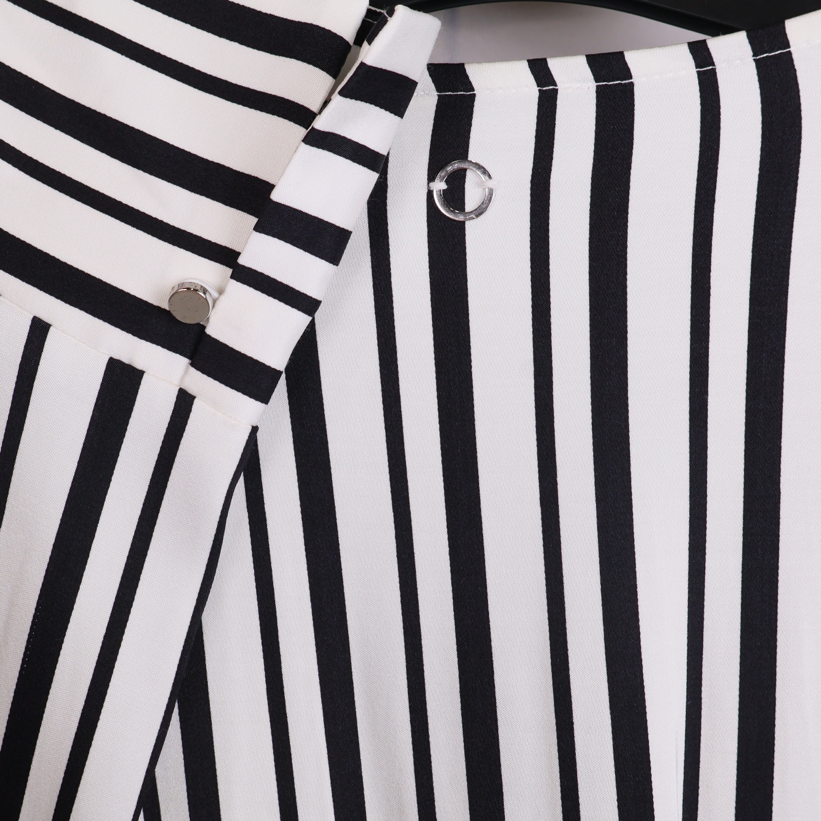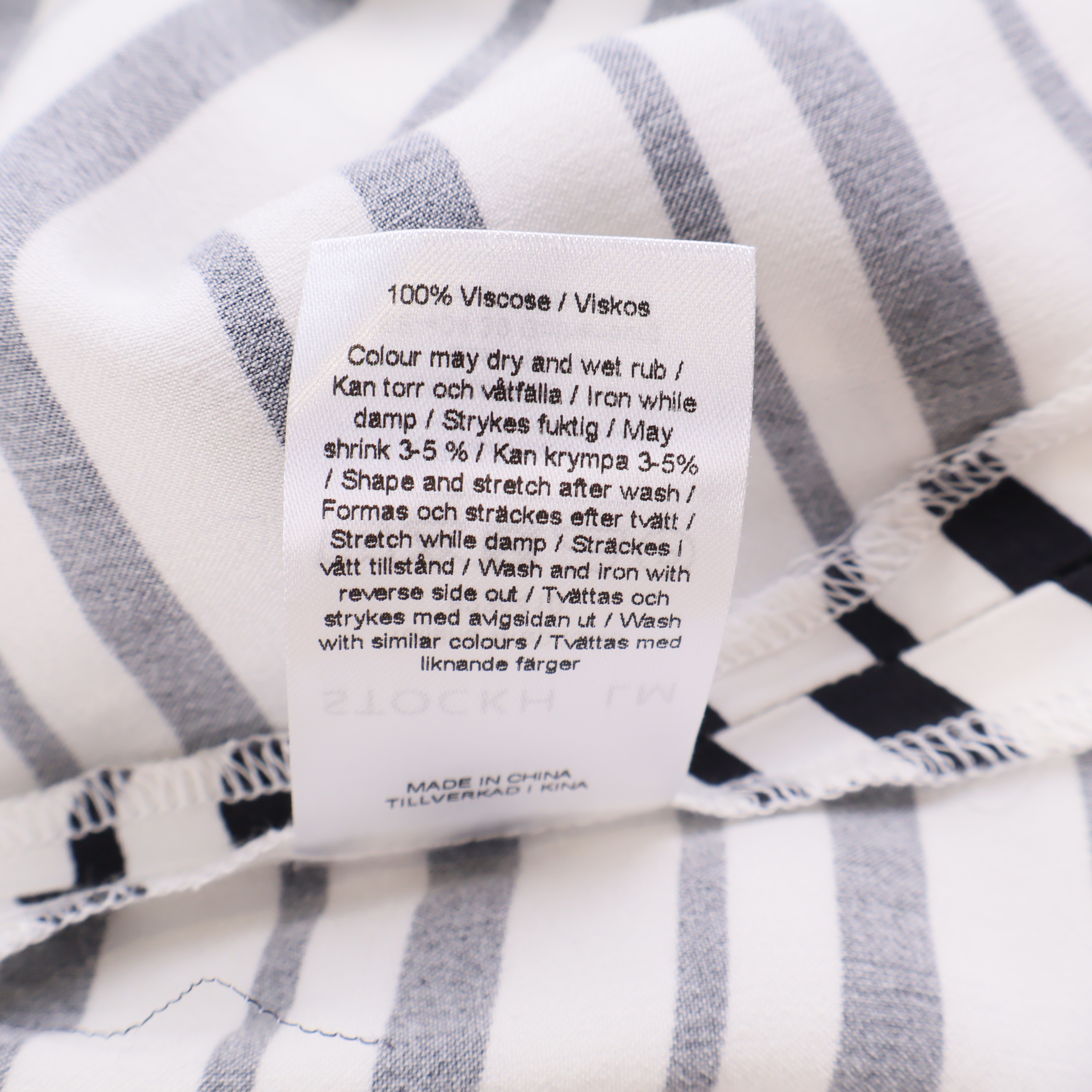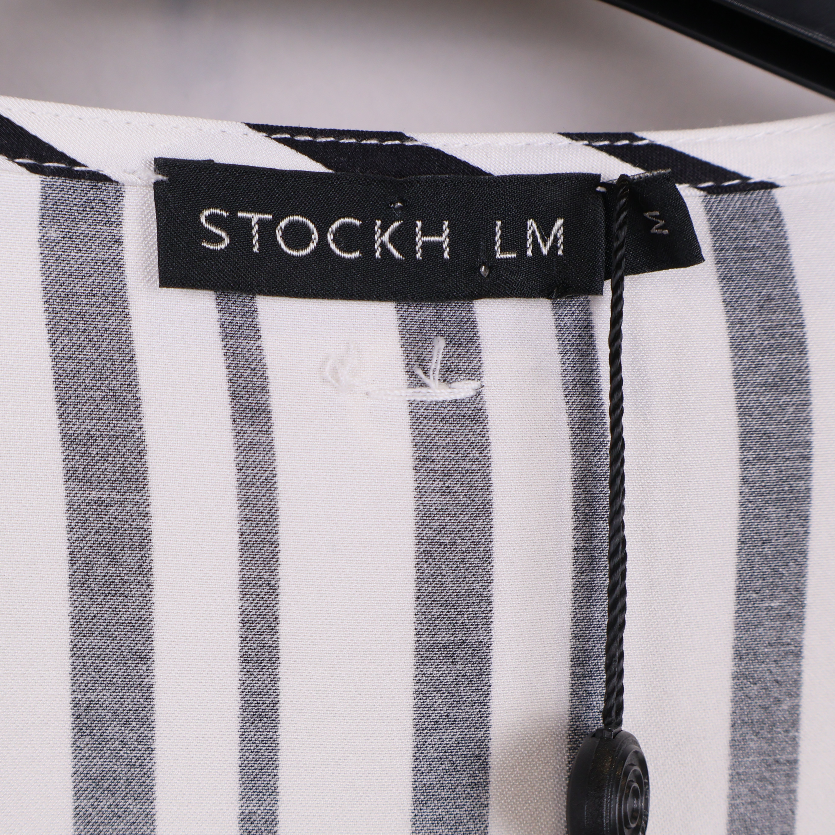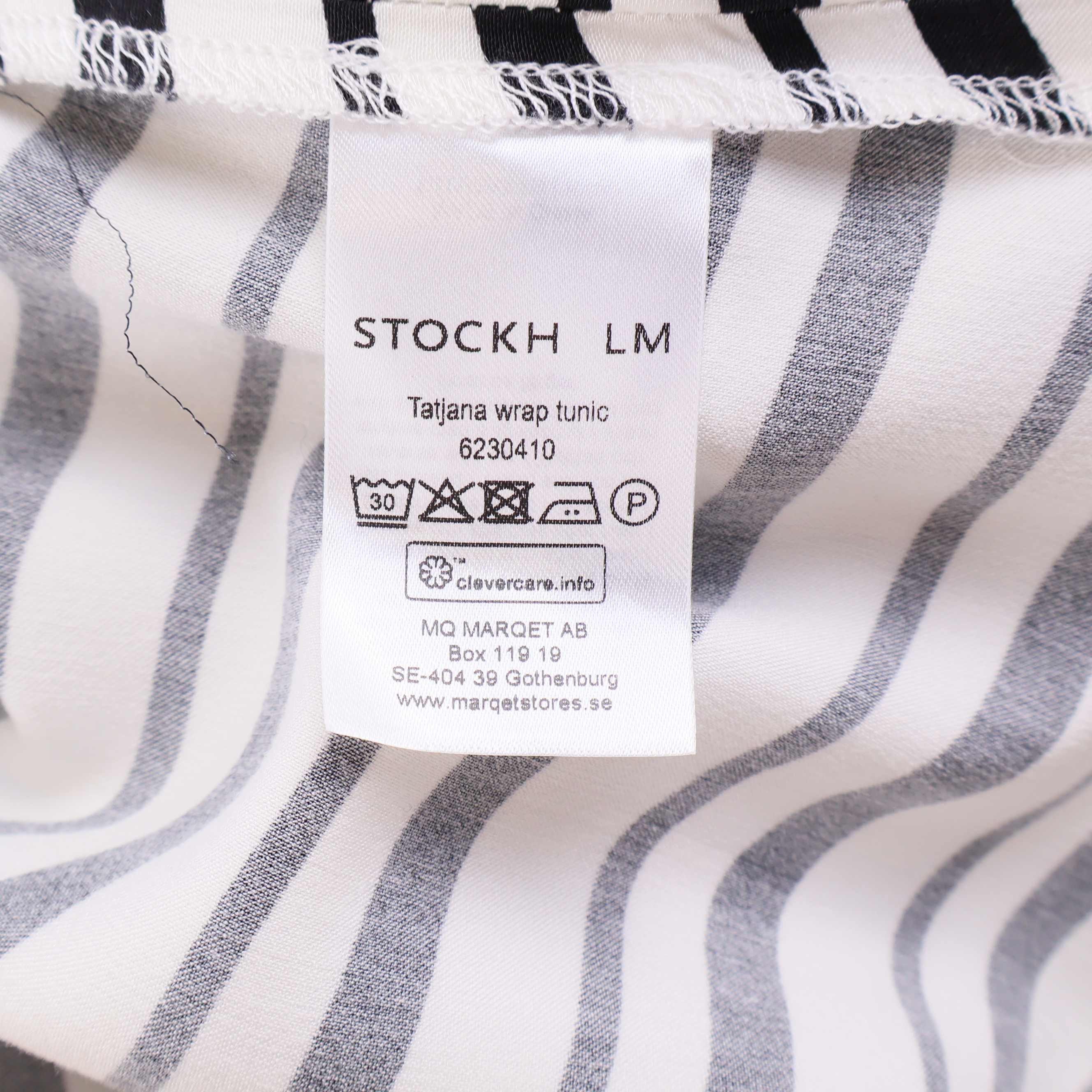 Omlottklänning från STOCKH LM med svartvita ränder och knytband i midjan. Lång ärm med bred manschett och djup v-ringning ger en stilren och modern look.