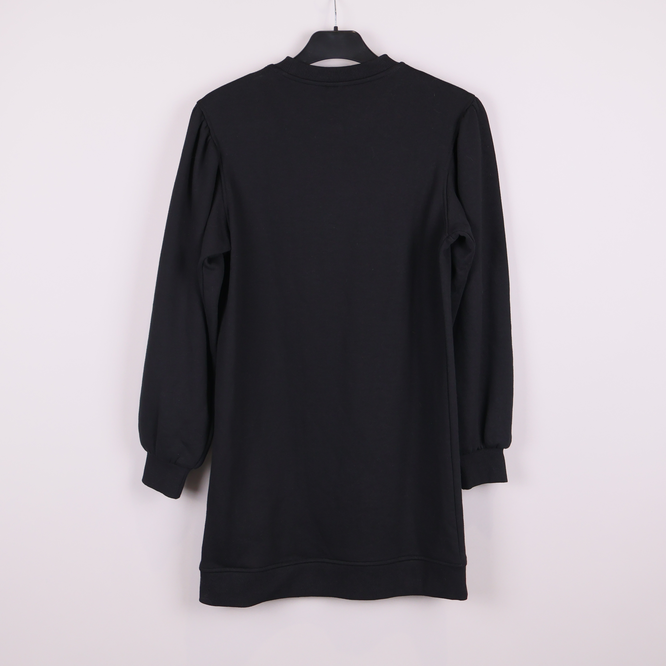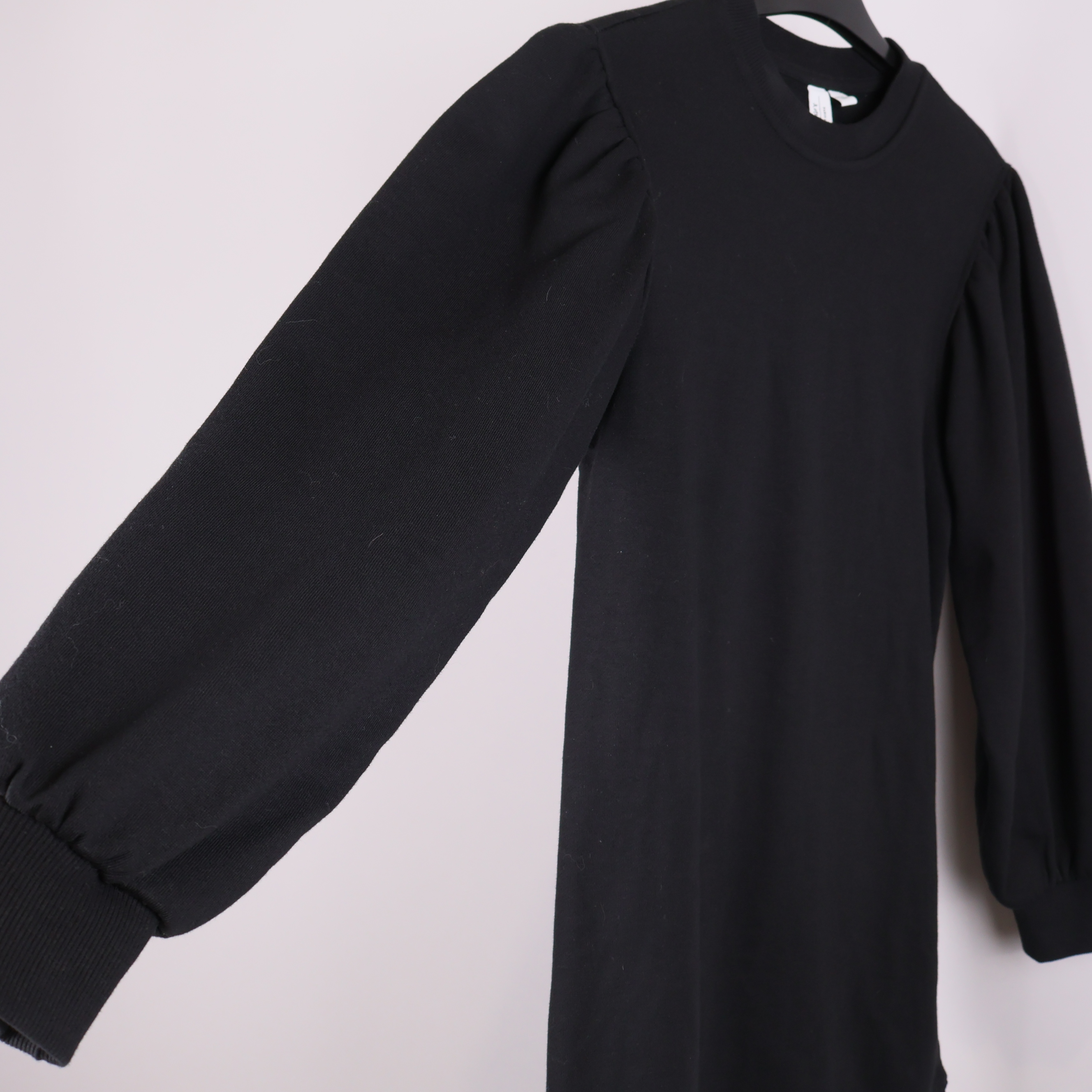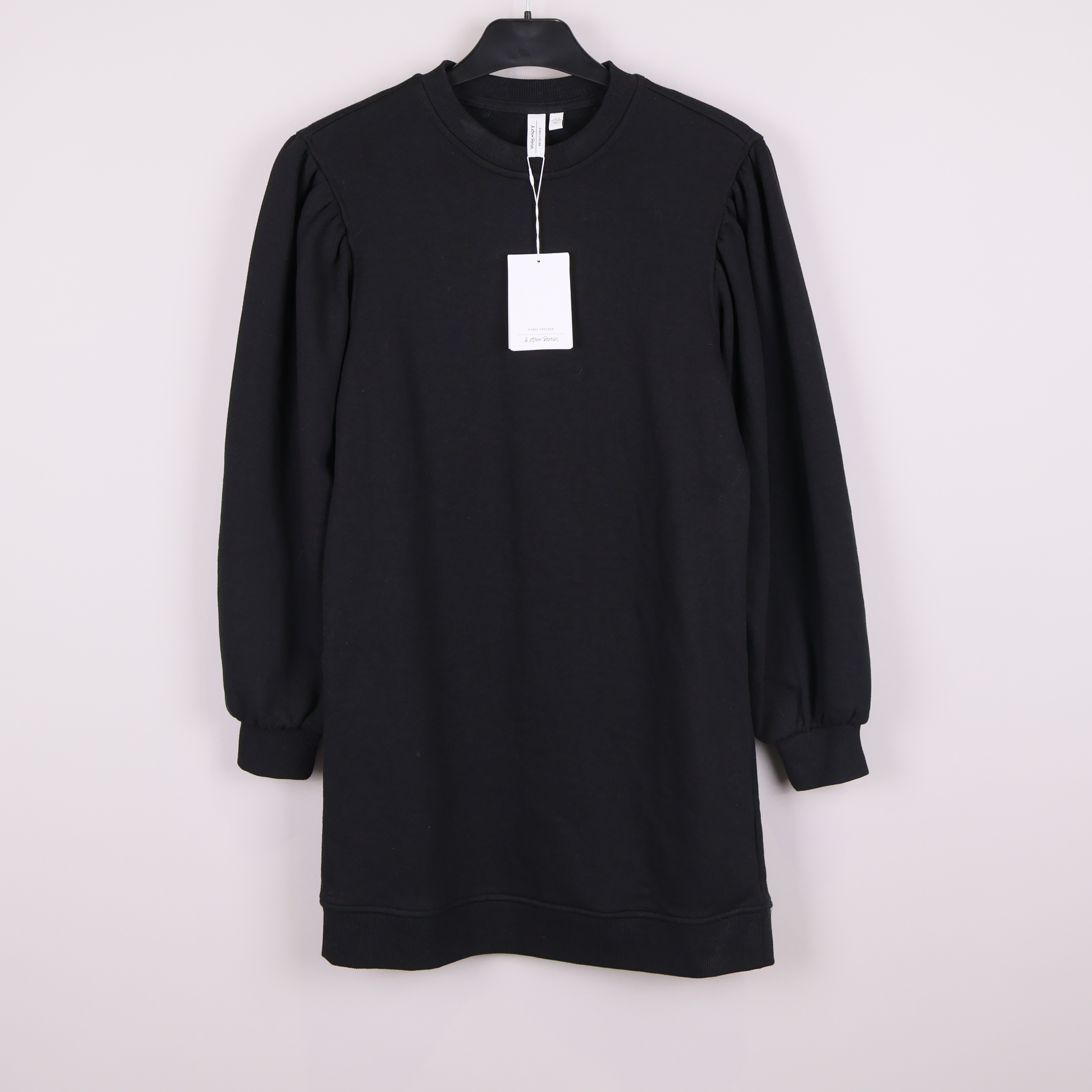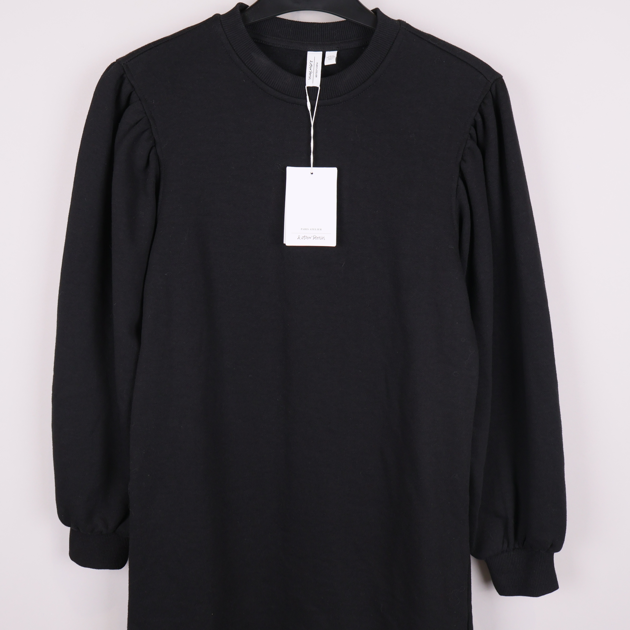 Mjuk och snygg tröjklänning i svart med puffiga ärmar och ribbad mudd vid ärmslut och nederkant. Rak, avslappnad passform som ger en modern och enkel stil. Materialmixen med bomull och polyester ger en behaglig känsla och håller formen. Rund halsringning och diskret design gör den lätt att styla både till vardag och chill dagar.