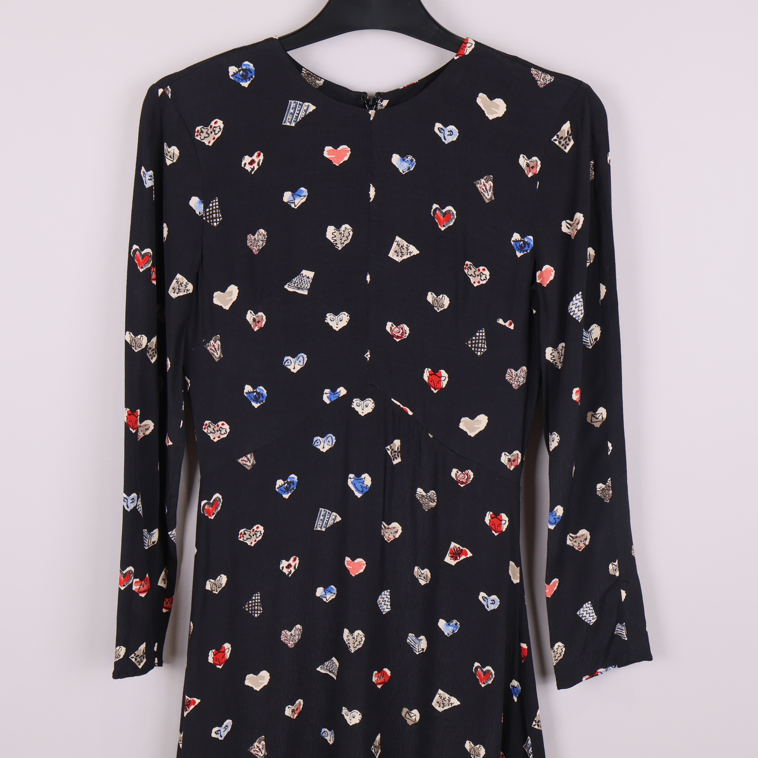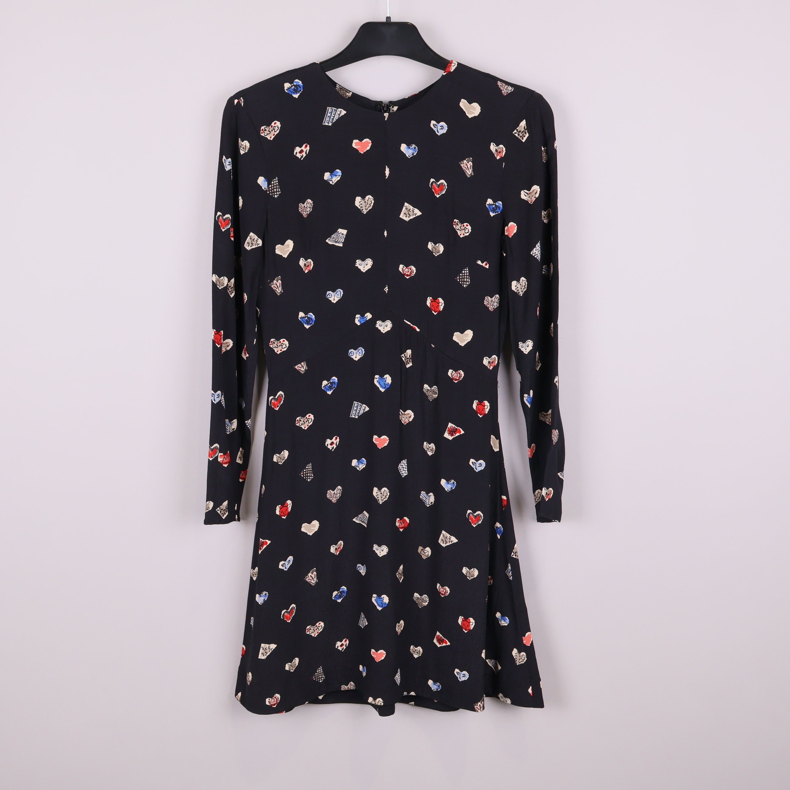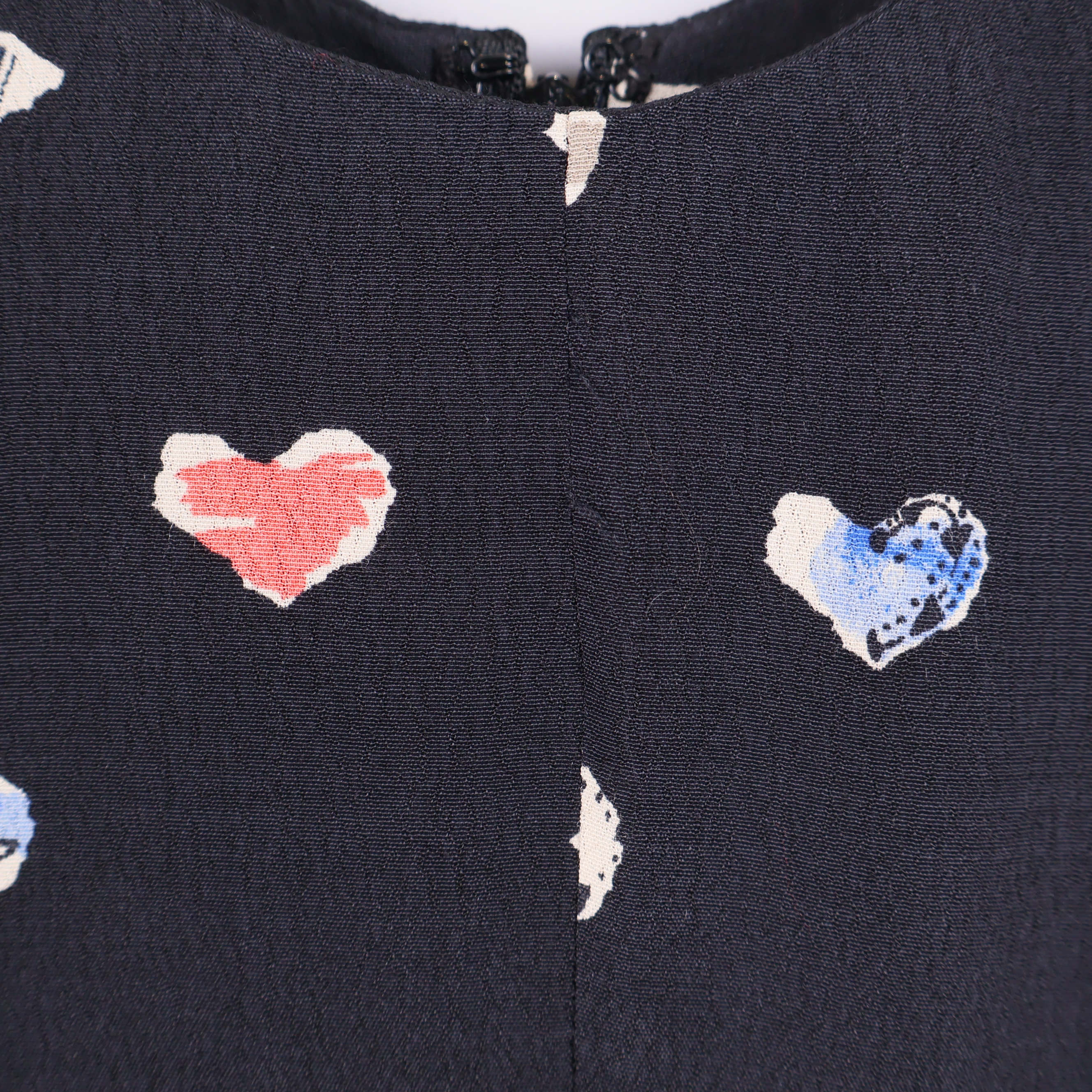 Klänningen har ett charmigt hjärtmönster i olika färger mot en svart botten, vilket ger en lekfull och modern känsla.