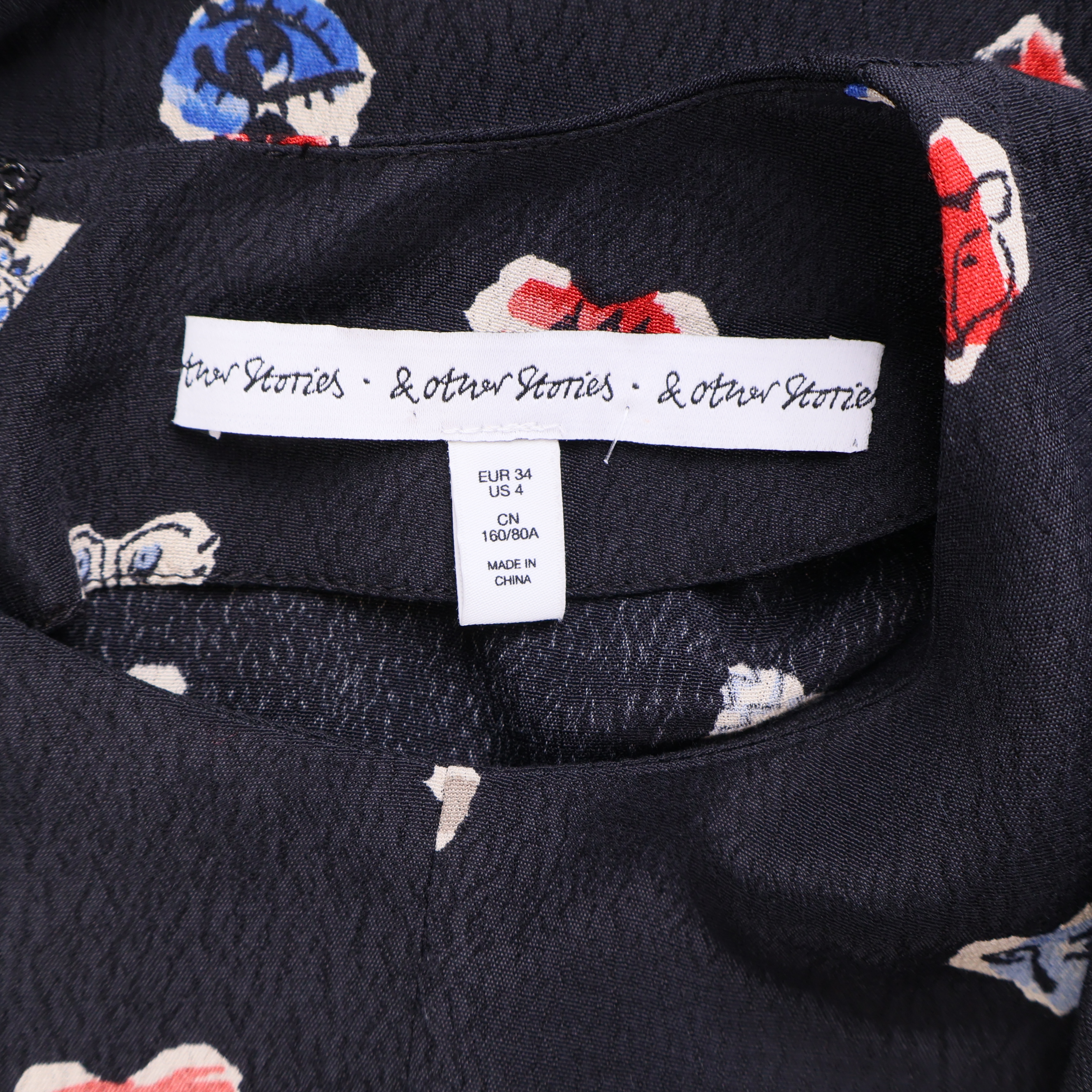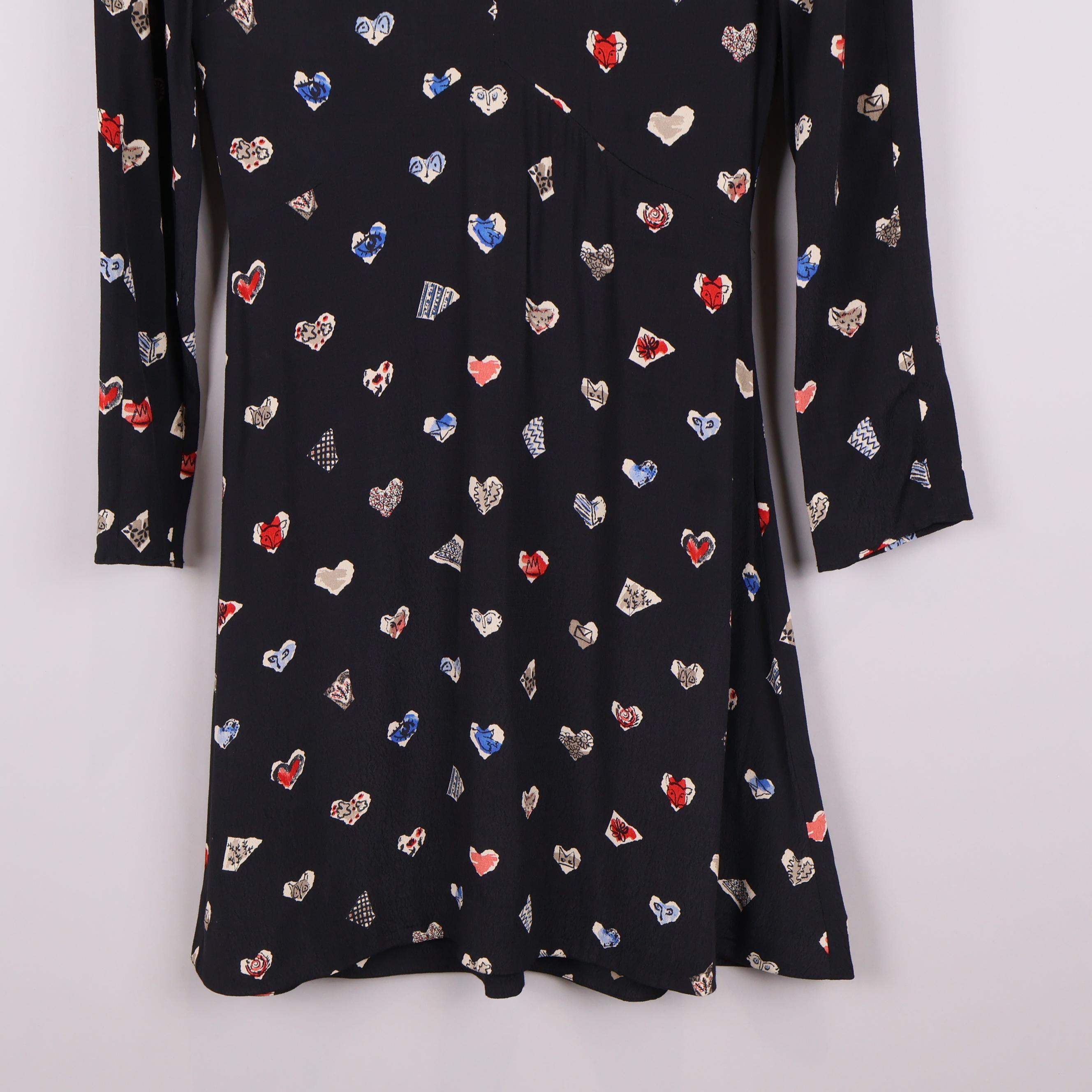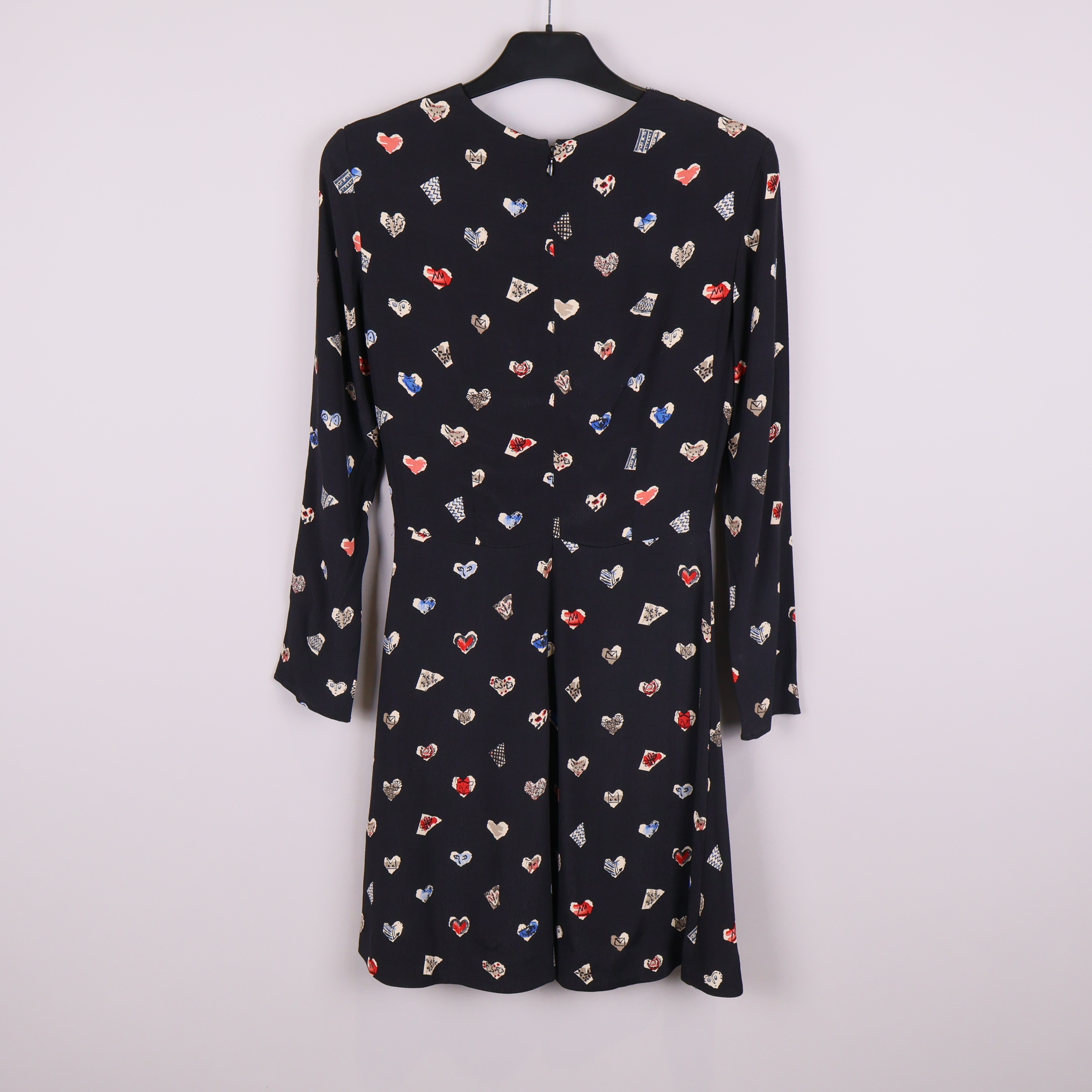 Klänningen har ett charmigt hjärtmönster i olika färger mot en svart botten, vilket ger en lekfull och modern känsla.