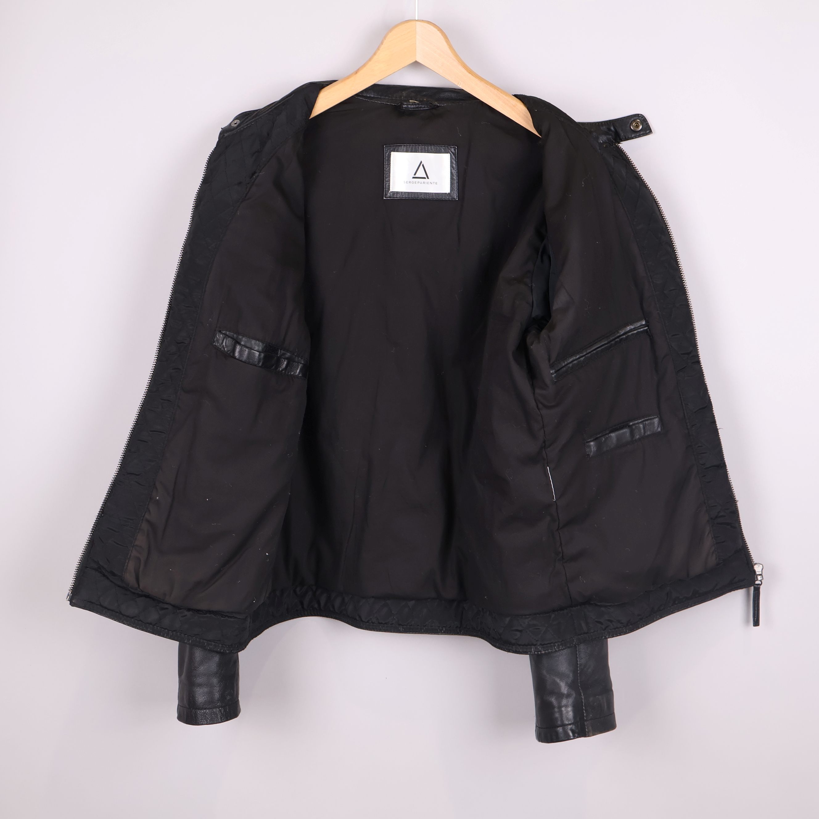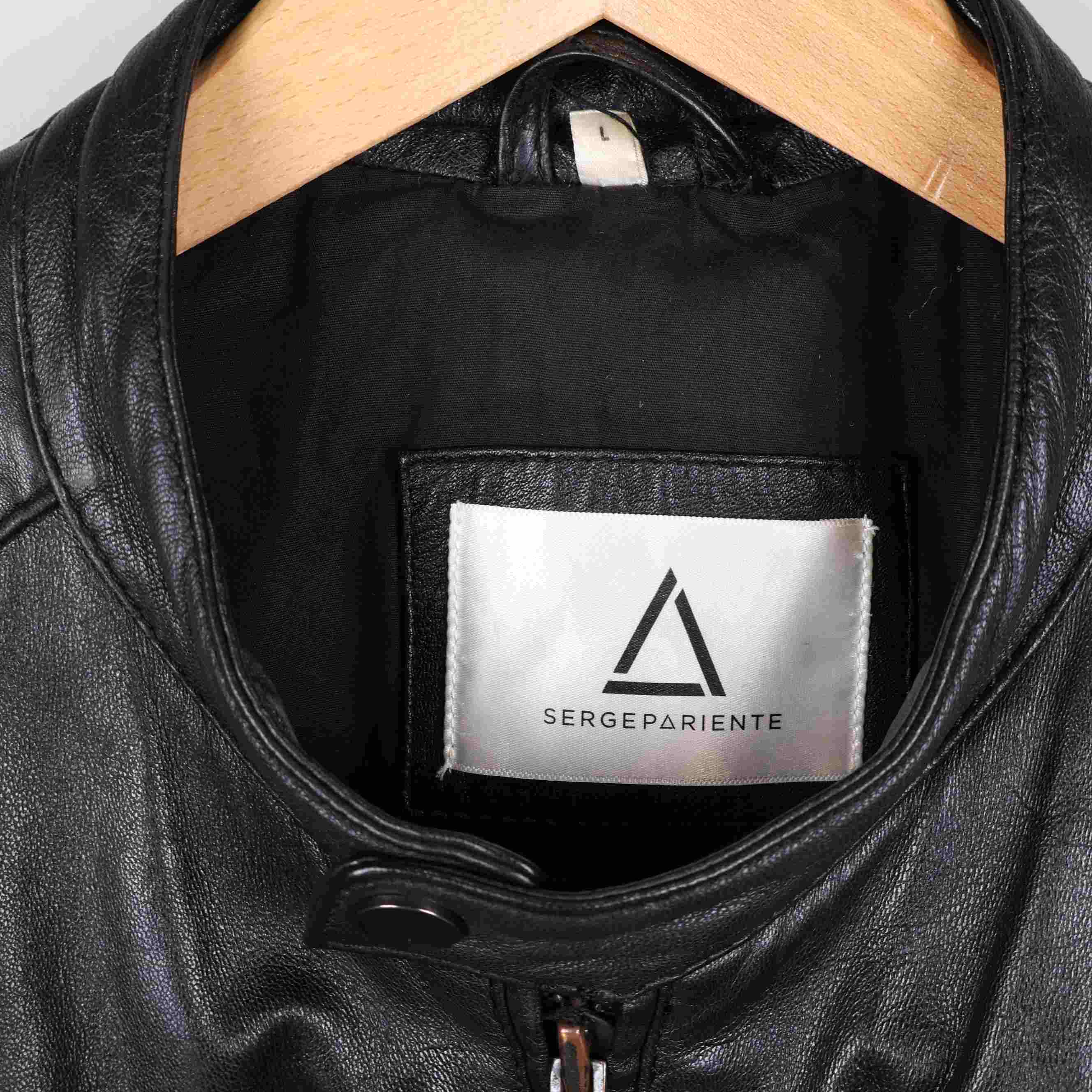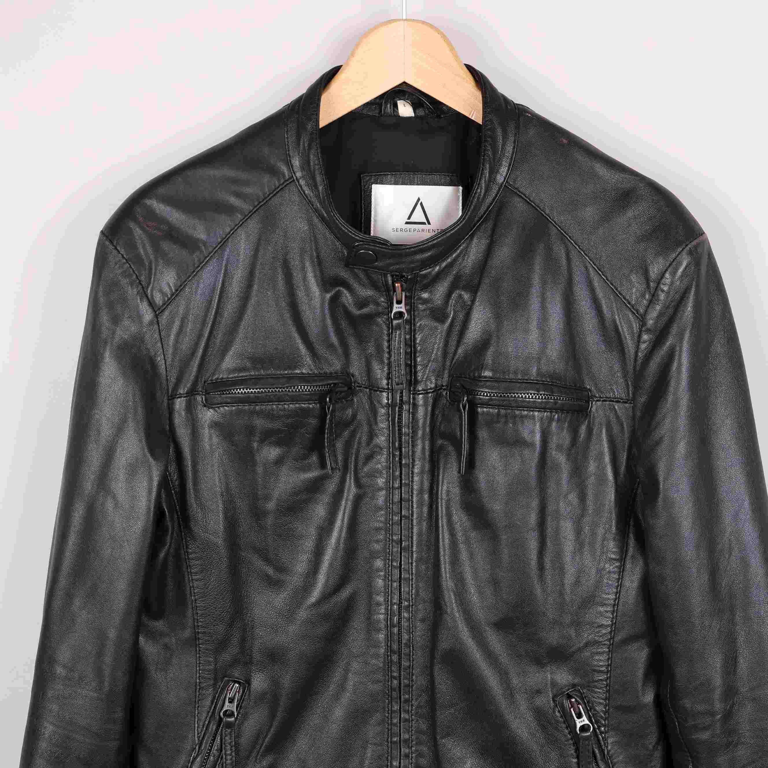 Stilren svart skinnjacka från Serge Pariente med hög krage, fyra dragkedjefickor framtill och något slimmad passform. Jackan har slät yta och diskreta sömdetaljer.