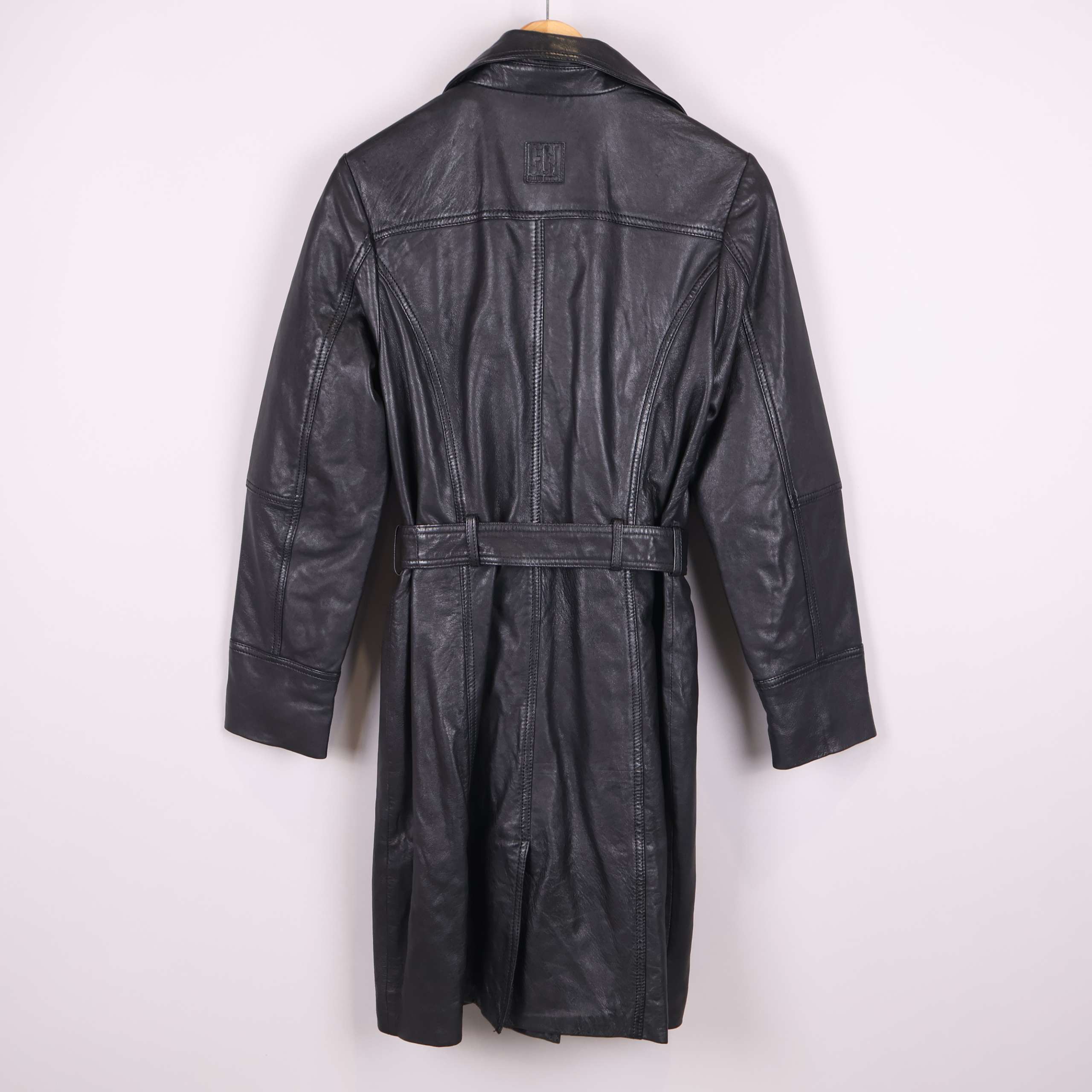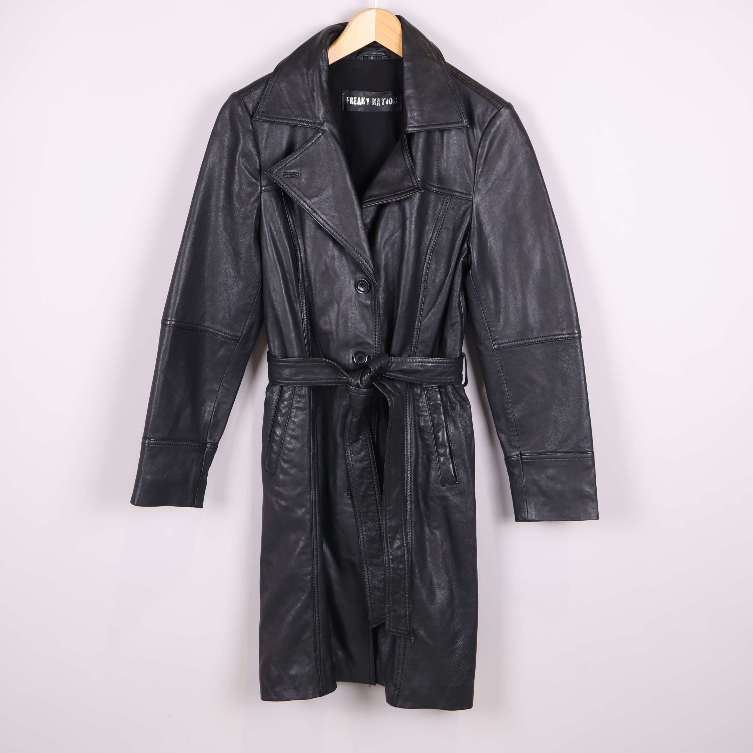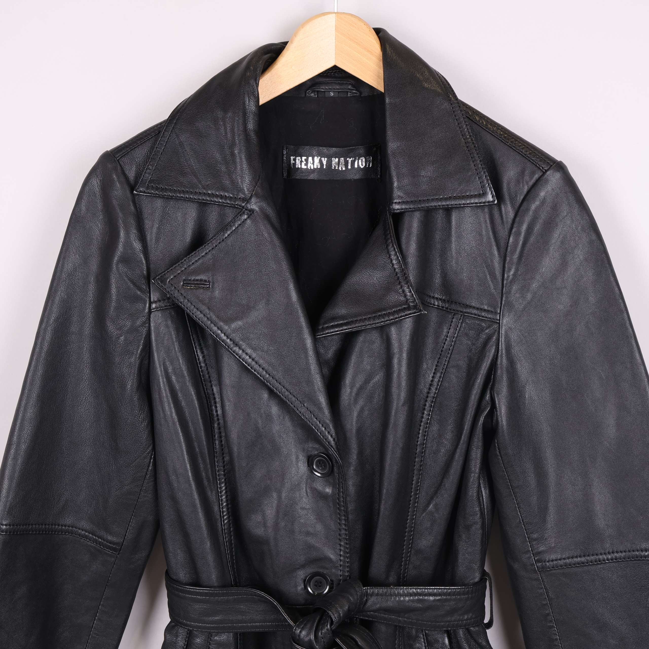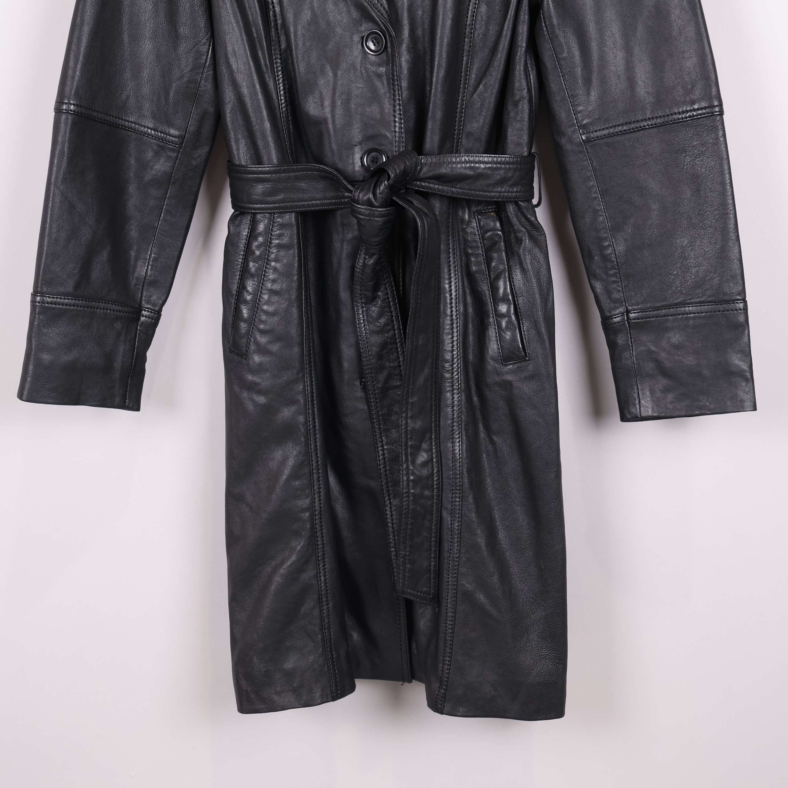 Lång svart skinnkappa i klassisk design med snygga sömdetaljer och ett tillhörande knytskärp i midjan. Modellen har en markerad krage och flera fickor framtill. Rocken ger ett stilrent uttryck och den mjuka känslan i materialet lyfter looken för en modern edge.
