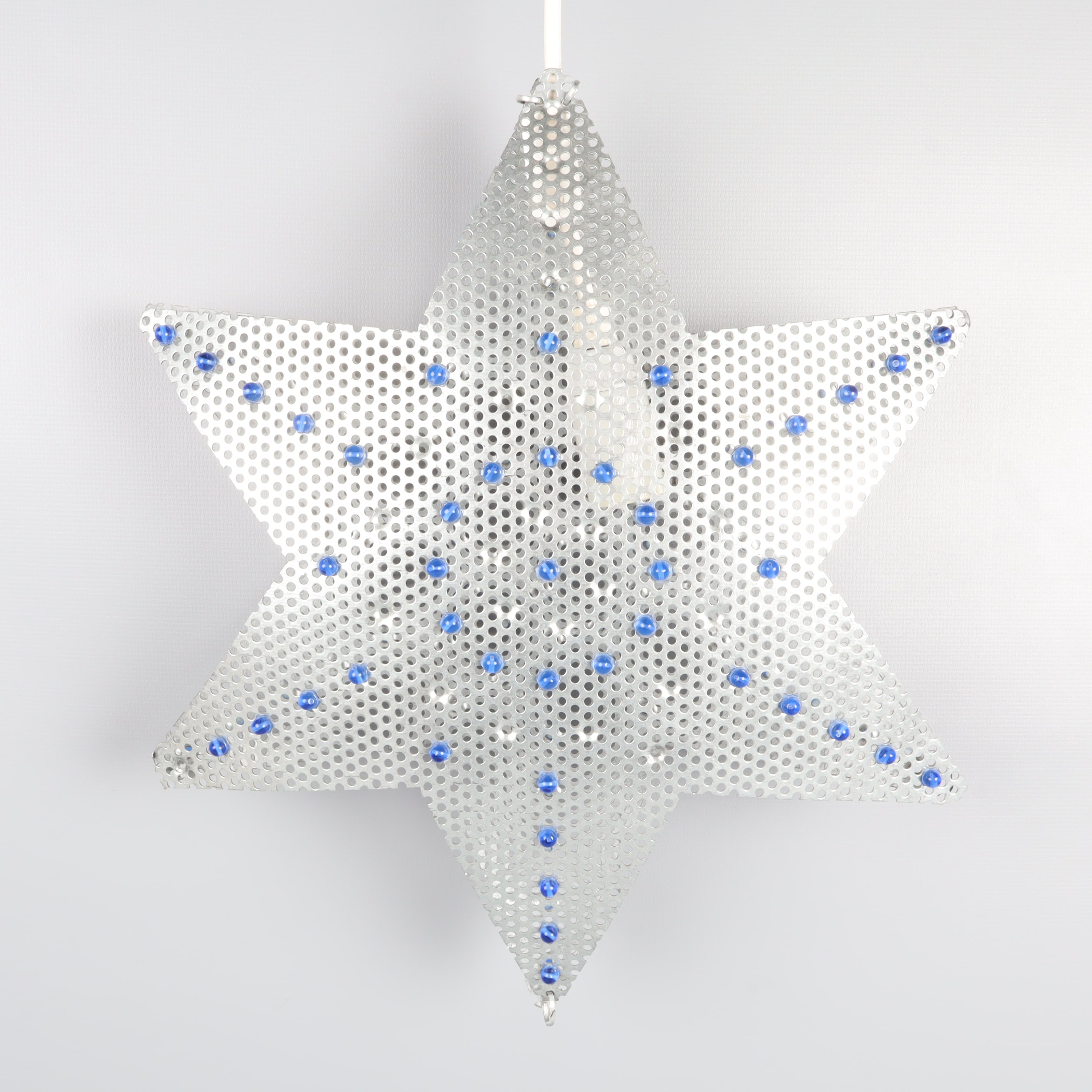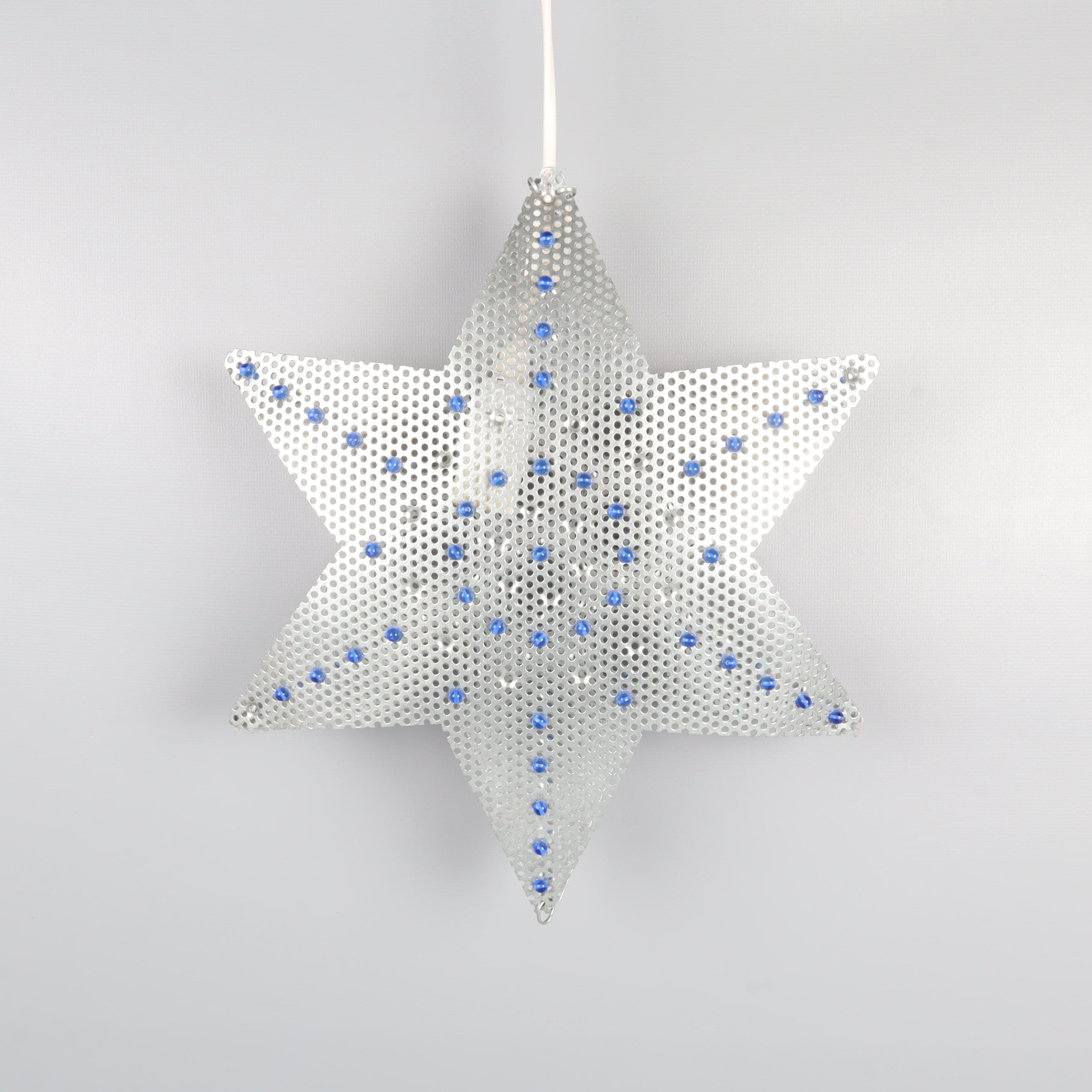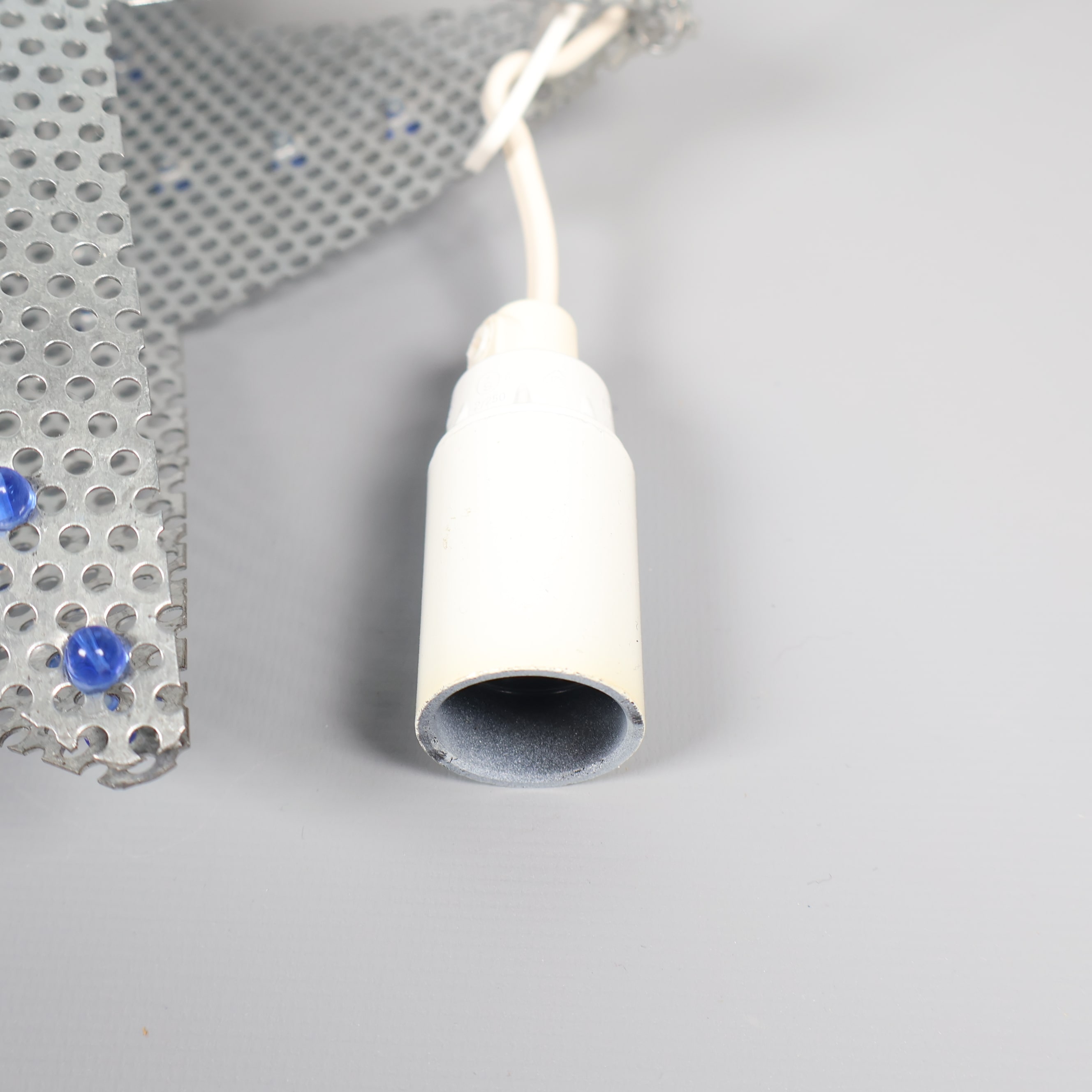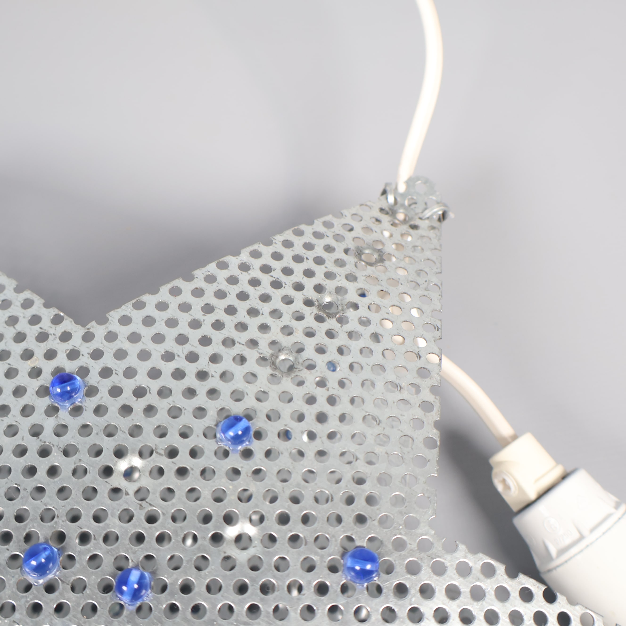 Unik stjärnformad lampa i galvaniserad plåt med blå glaspärlor som ger ett lekfullt och modernt uttryck. Lampan är designad av Barbro Fagerlind för Svensk Slöjd. Sju pärlor har lossnat, och det finns fyra extra i en påse.