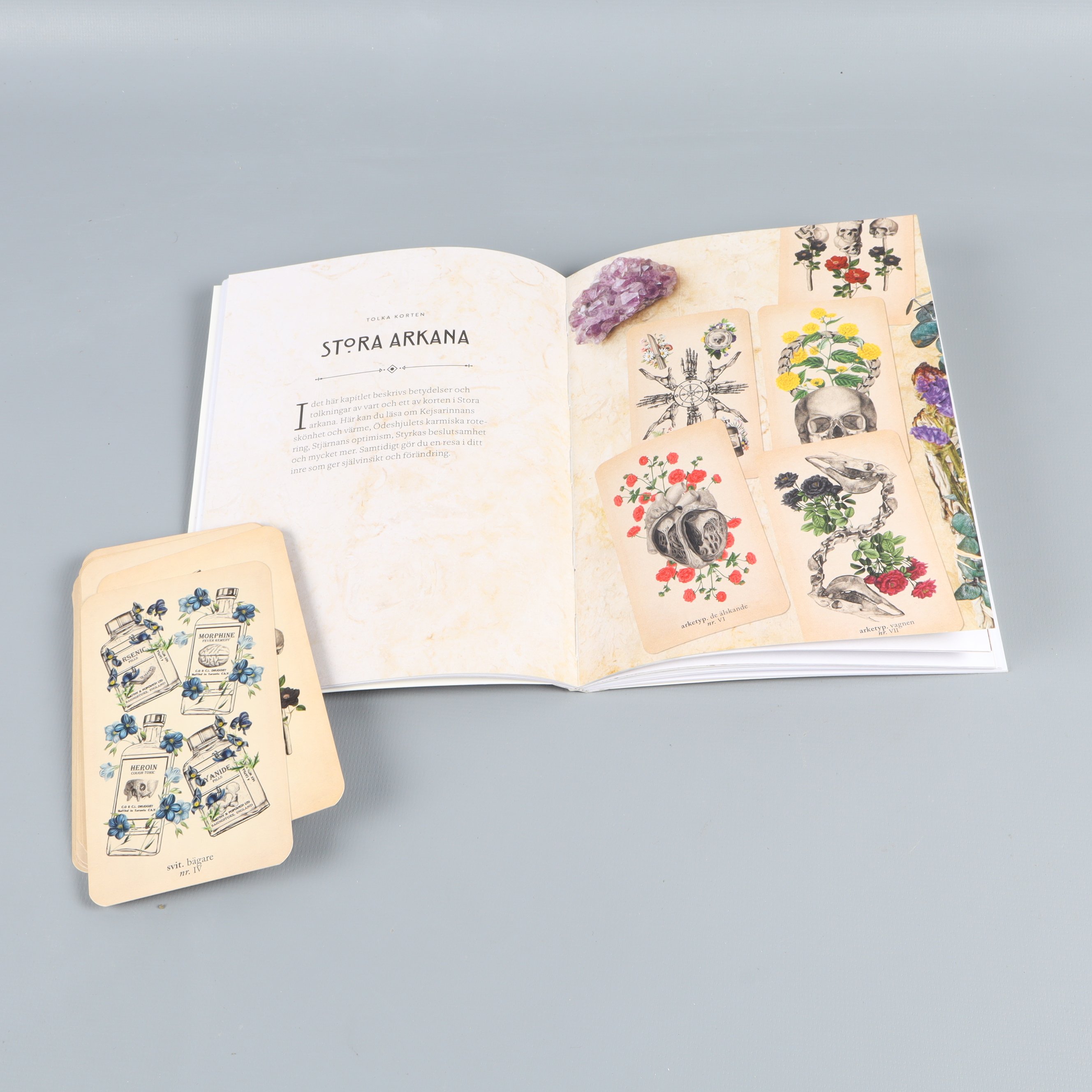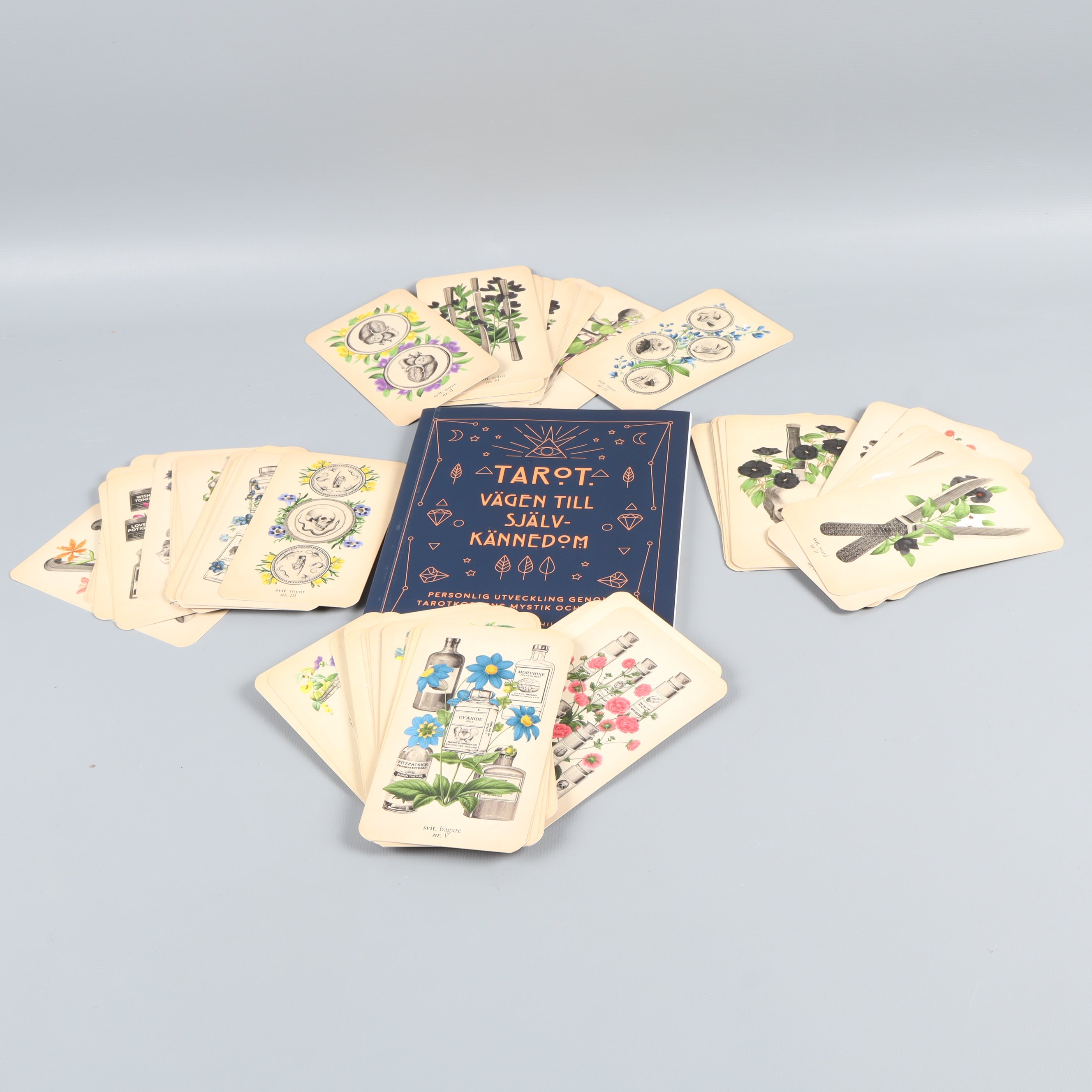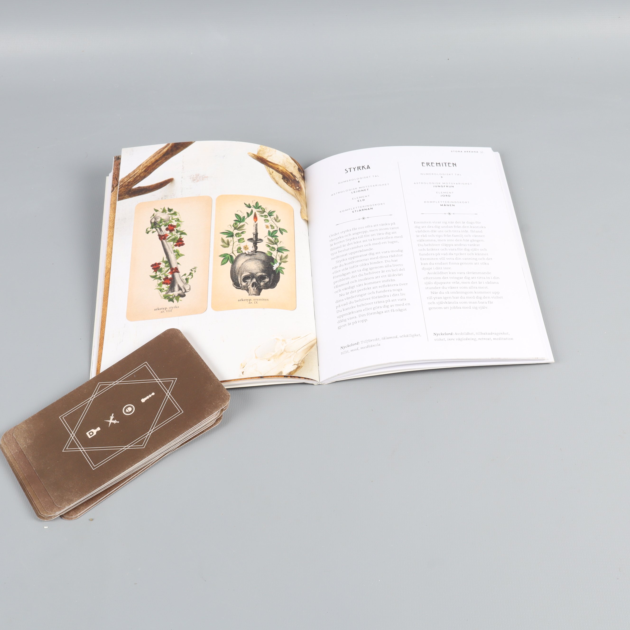Upptäck ett elegant tarotset med mörkblå box, guldfolierade detaljer och en illustrerad handbok på svenska. Setet innehåller vackert handritade tarotkort med botaniska motiv och en lättläst guide för tolkning av korten. Perfekt för dig som vill utforska tarot på ett inspirerande och tillgängligt sätt. Språk: Svenska Antal kort: 80 (7x12 cm) Antal sidor i guidebok: 80