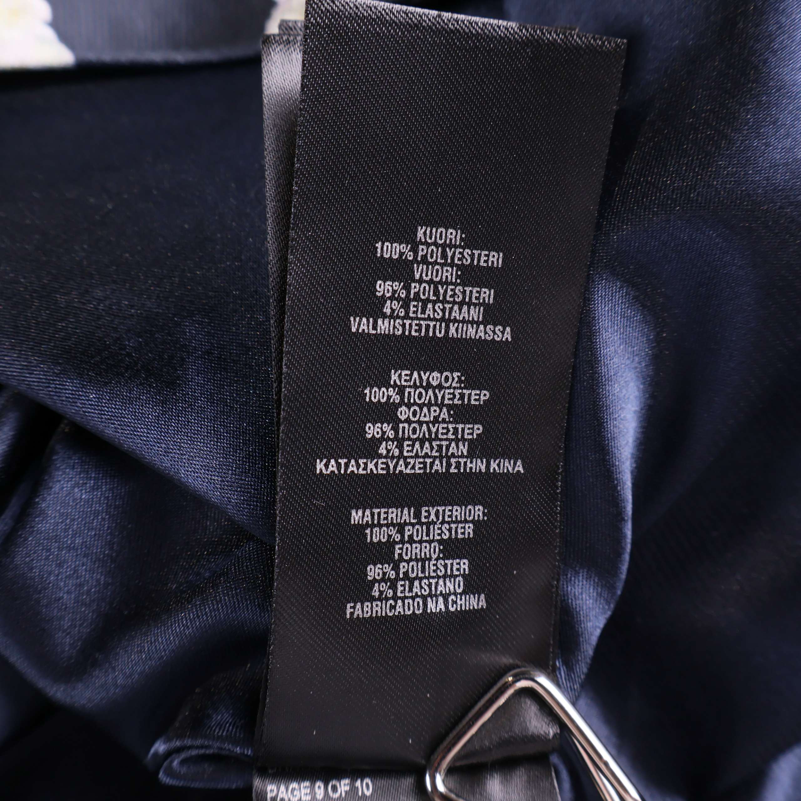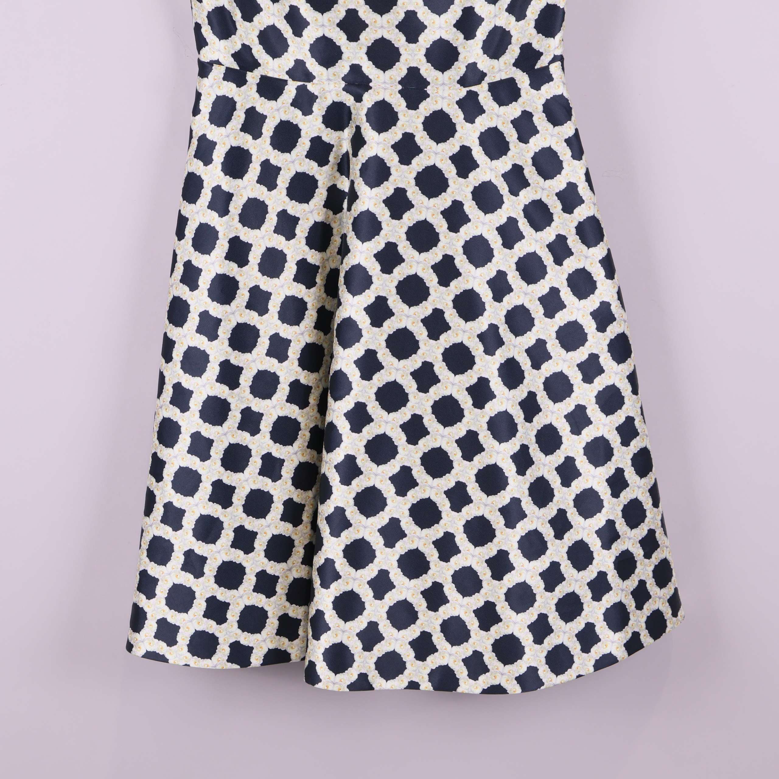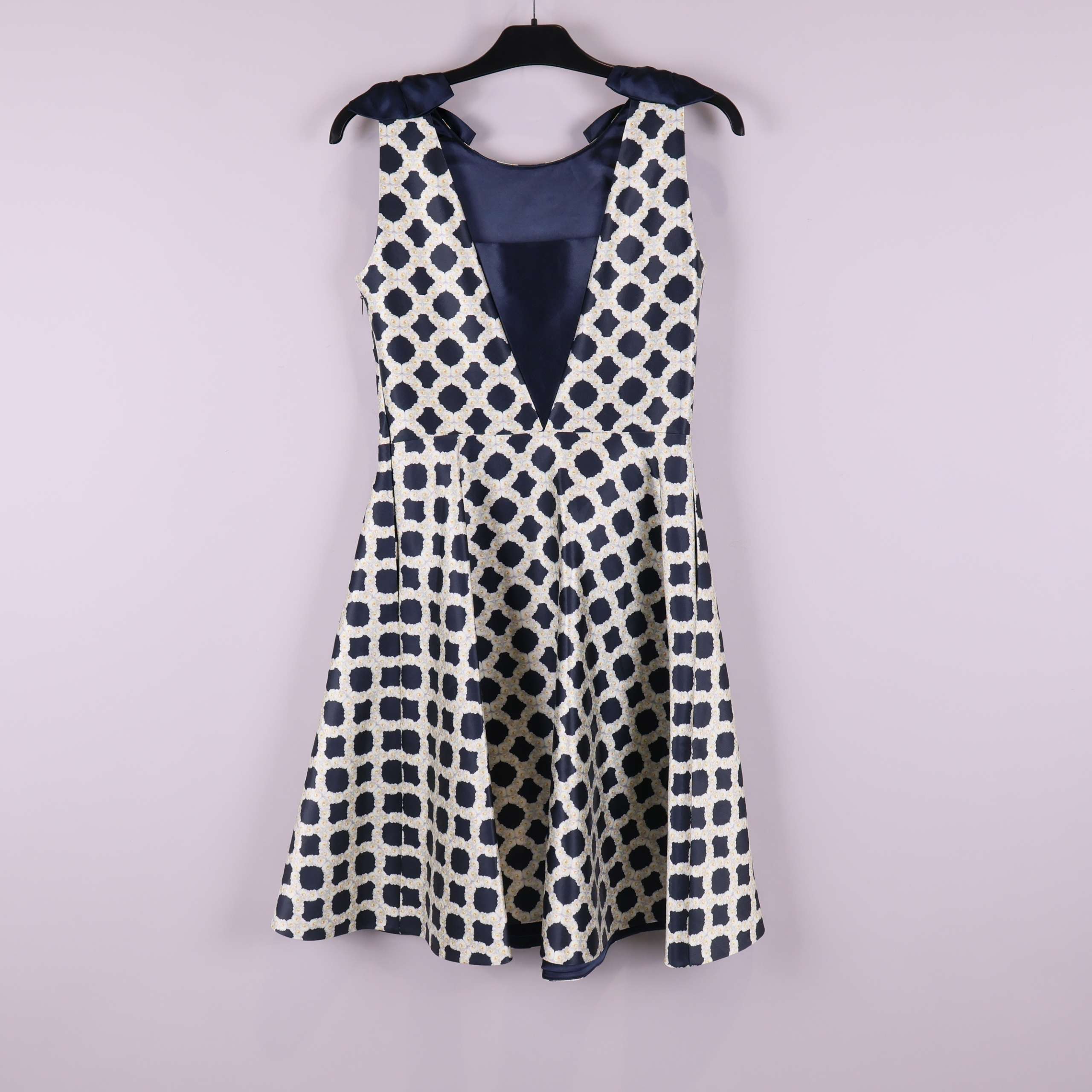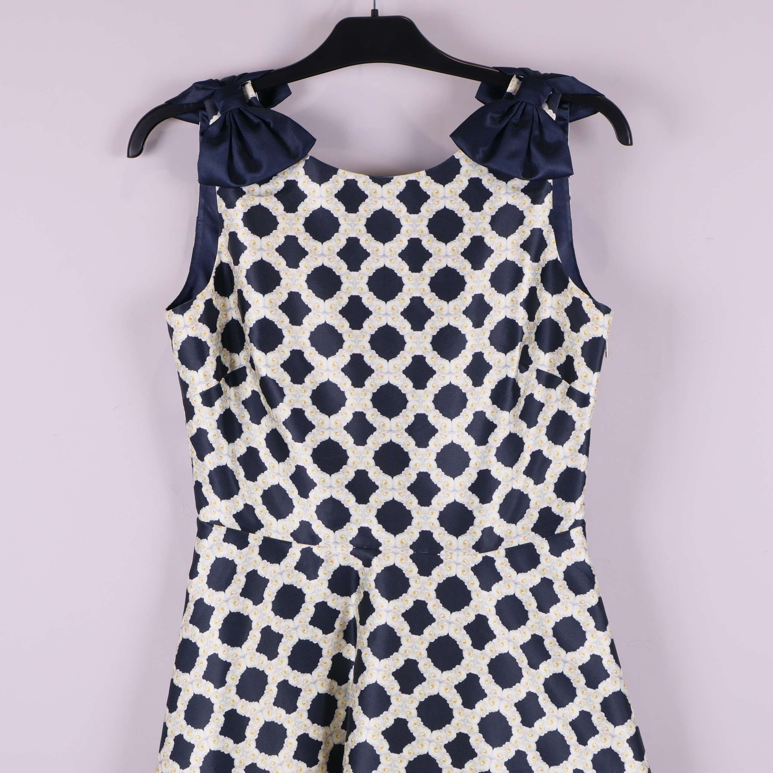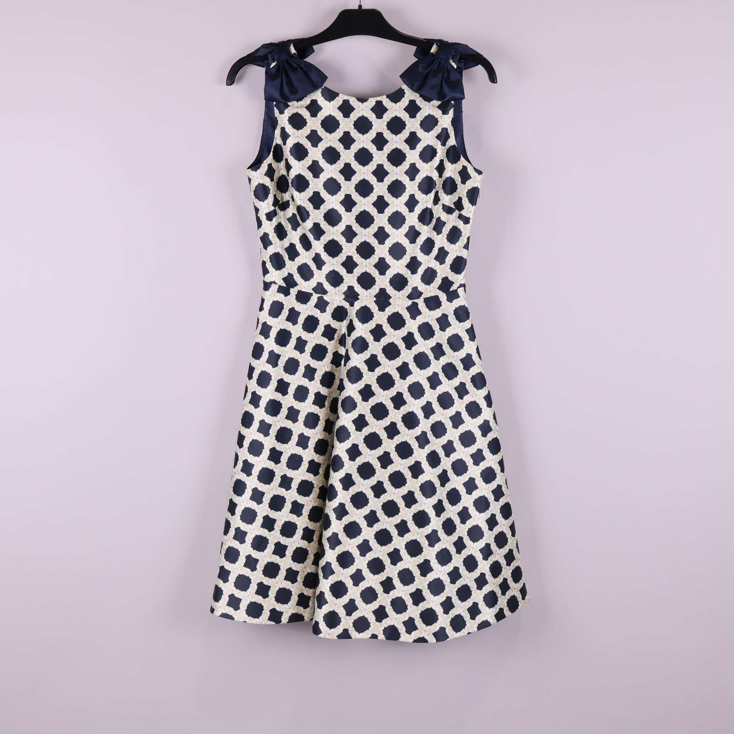Elegant klänning med grafiskt mönster i marinblått och vitt. Ärmlös design med vackra rosetter på axlarna och en v-ringning bak. Tyg med lite glans och stadga ger en exklusiv känsla. Figurnära överdel och utställd kjol skapar en tidlös siluett med samtida touch.