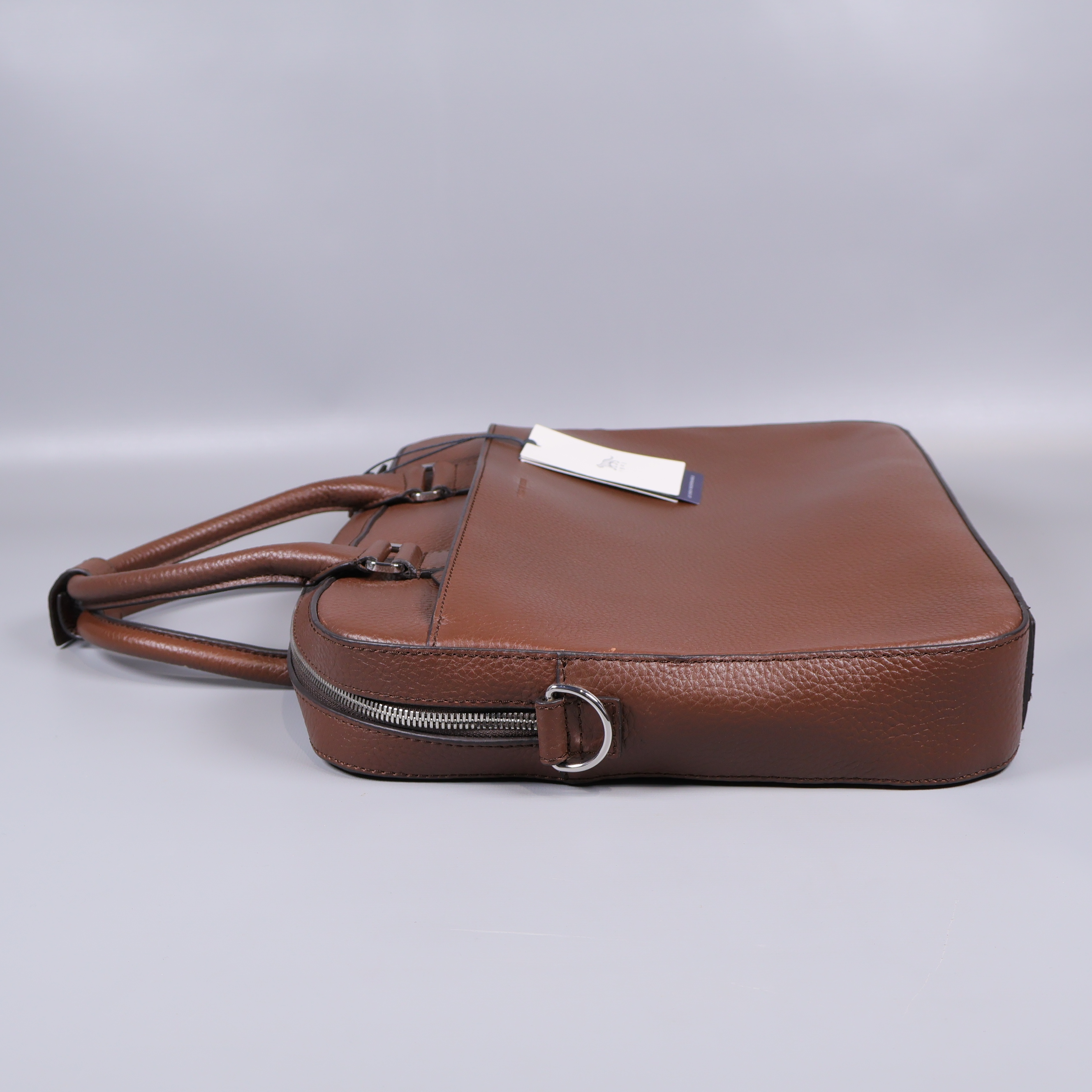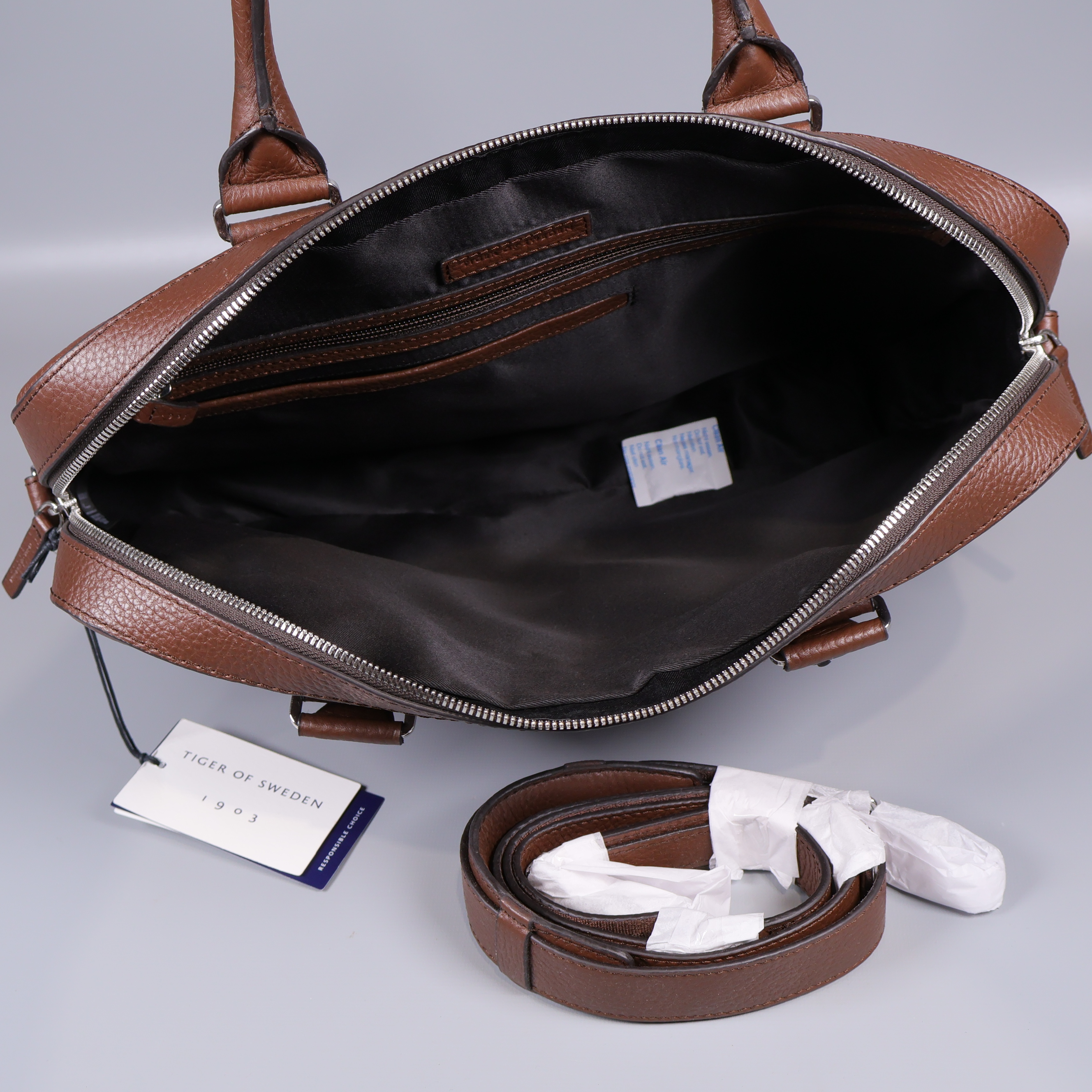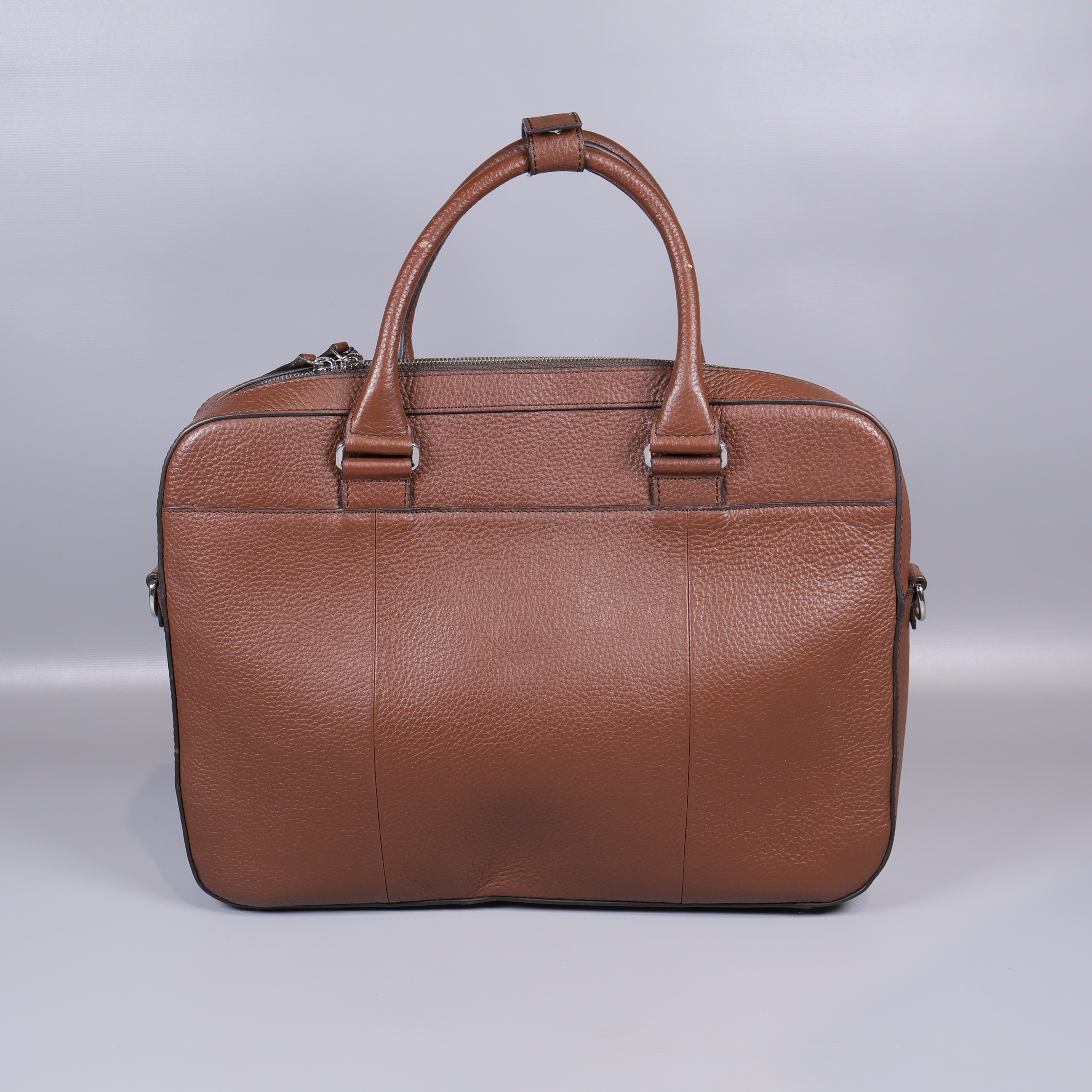 Elegant datorväska med stilren look i brun färg och strukturmönster. Utrustad med dubbla handtag, avtagbar axelrem och praktisk dragkedja. Invändigt finns flera fack för dina tillhörigheter.
