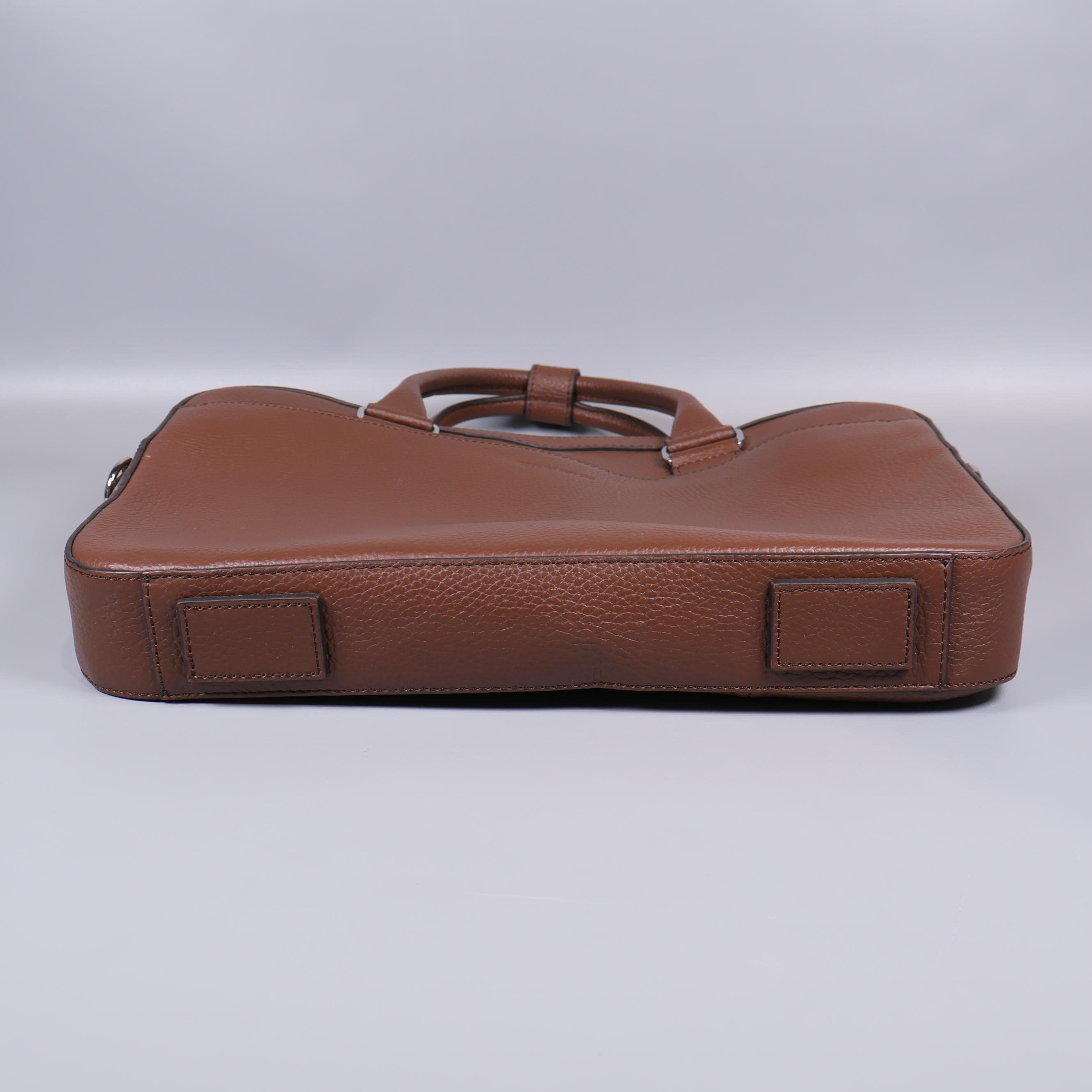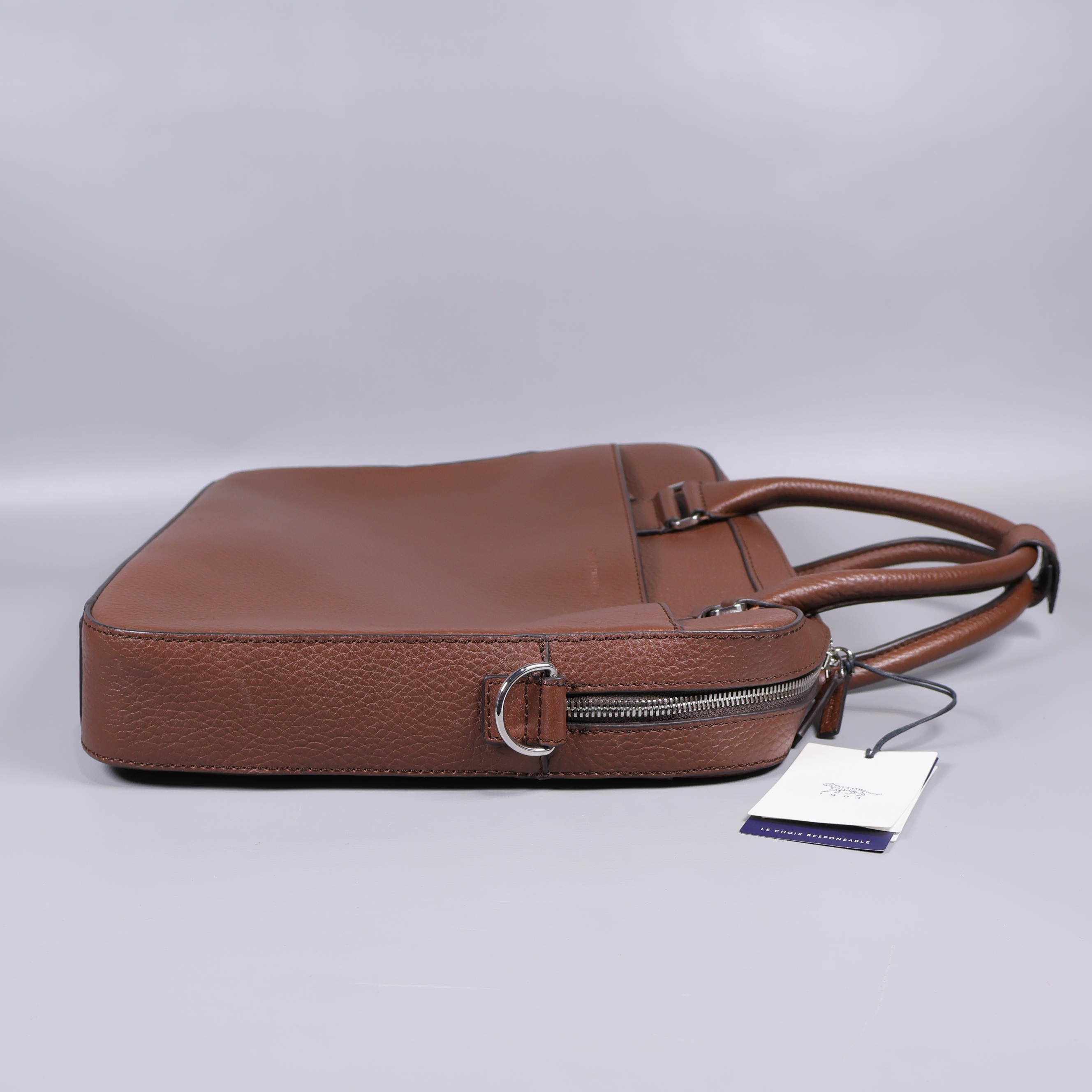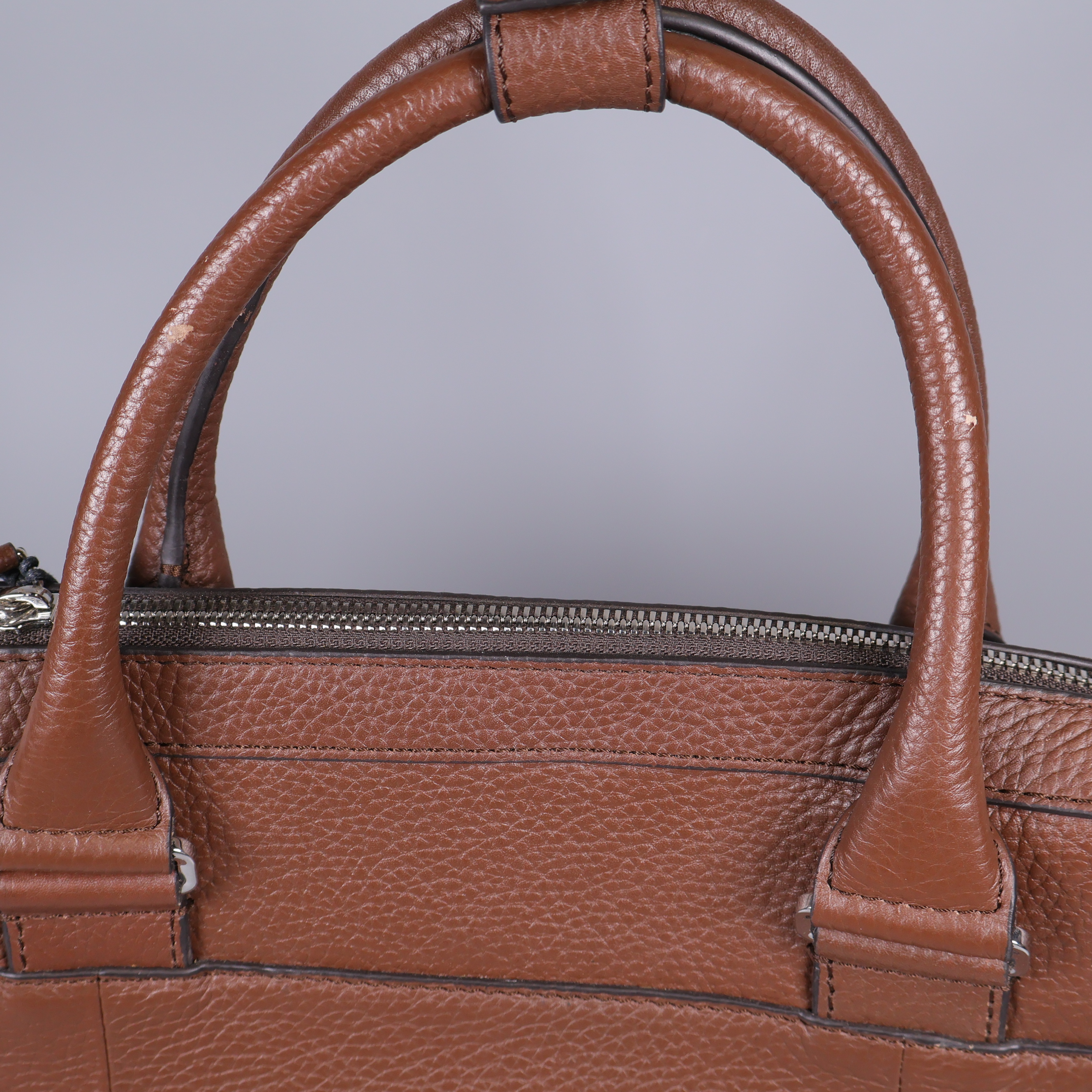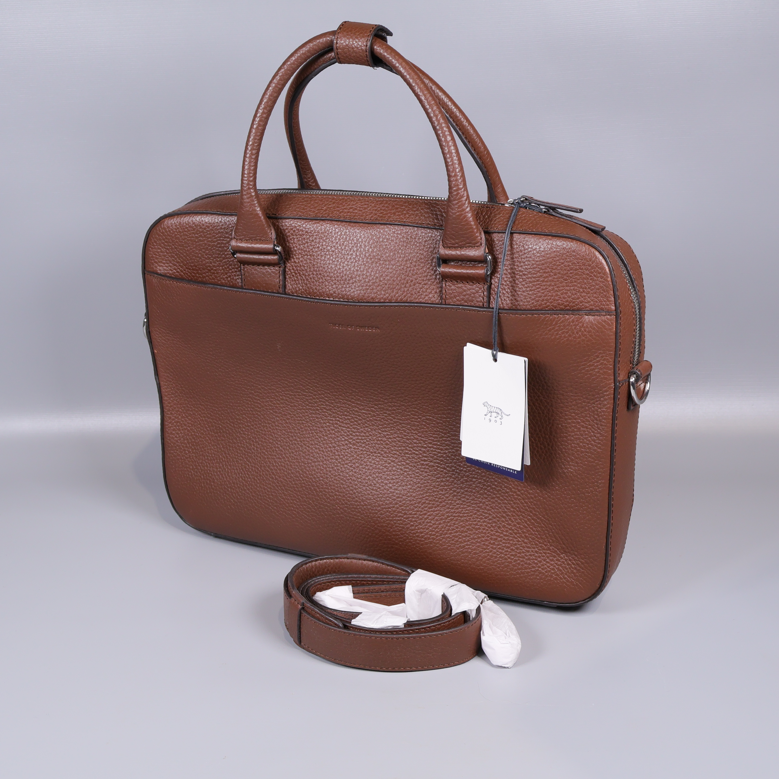 Elegant datorväska med stilren look i brun färg och strukturmönster. Utrustad med dubbla handtag, avtagbar axelrem och praktisk dragkedja. Invändigt finns flera fack för dina tillhörigheter.