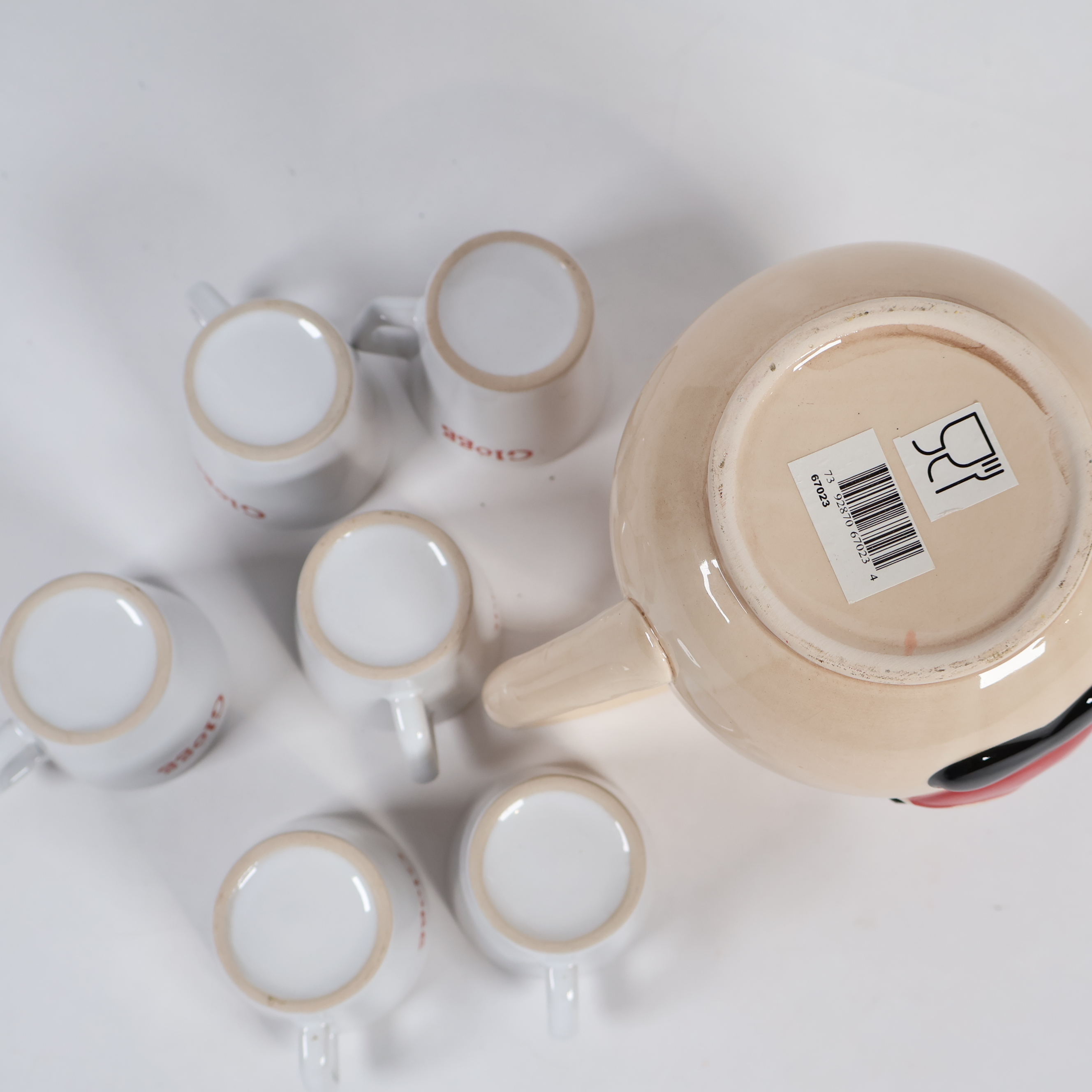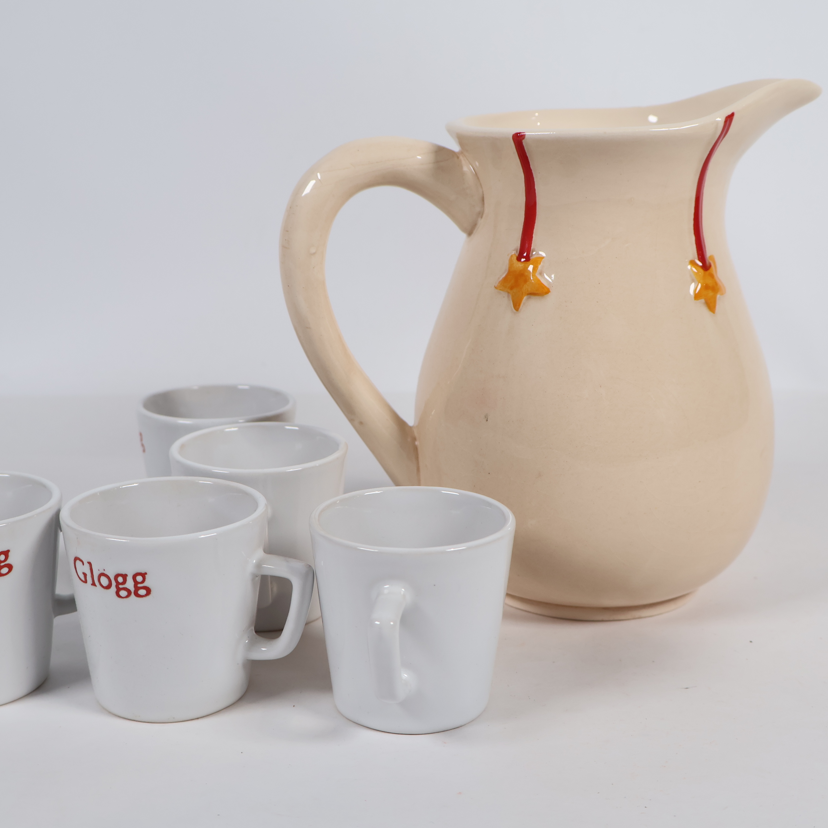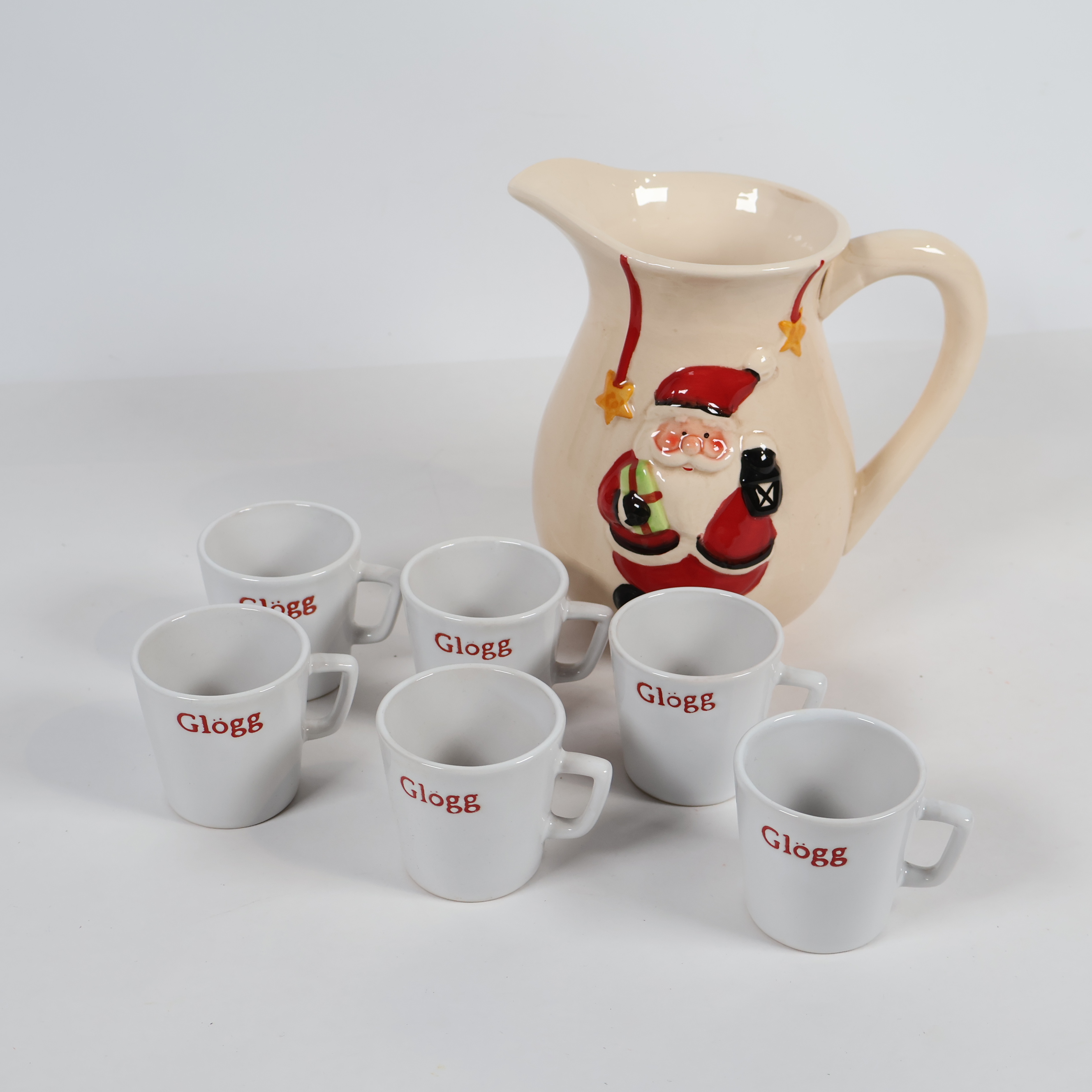 Glöggset med sex vita muggar och en kanna prydd med en glad tomte, perfekt för att skapa julkänsla. Det finns krackelering på kannan.