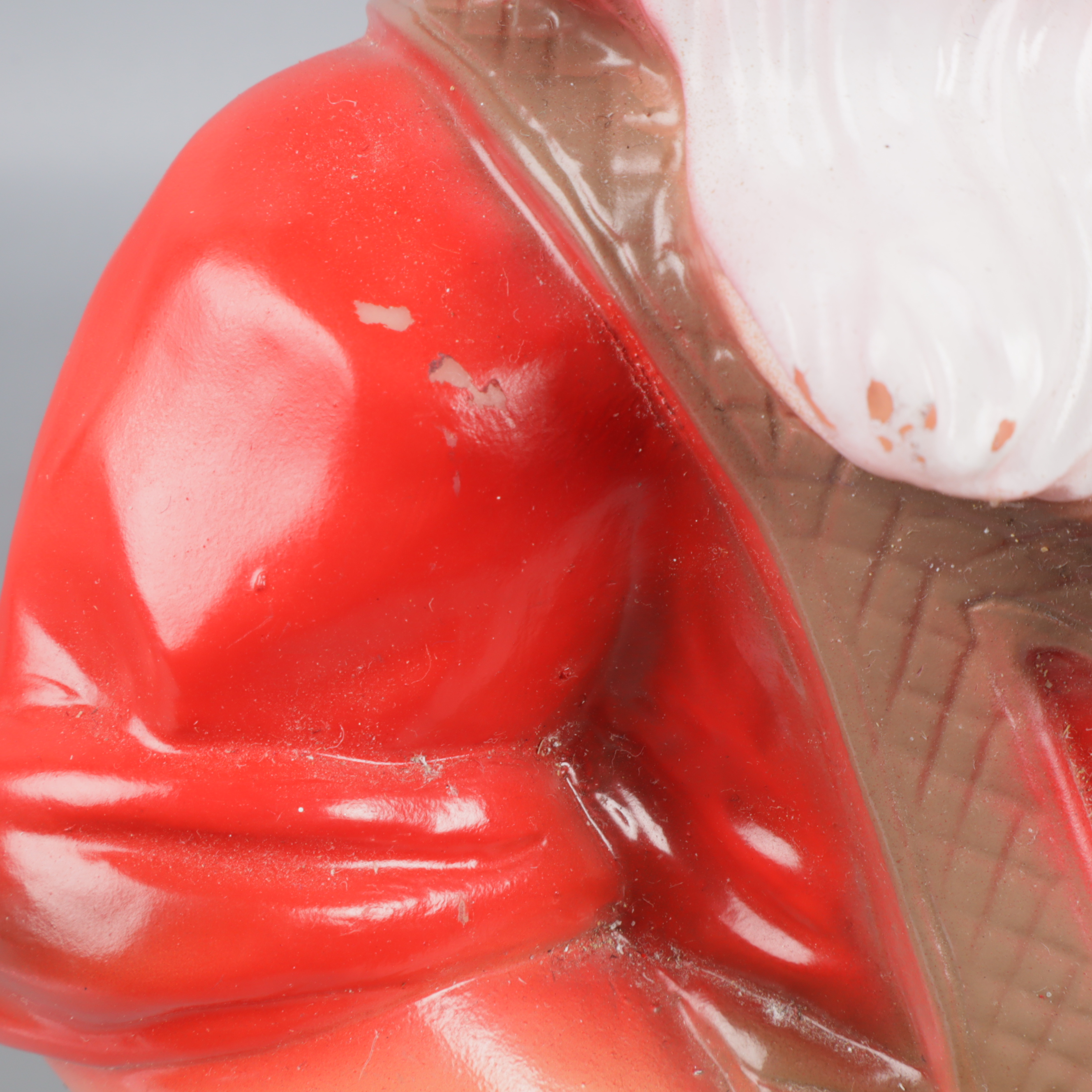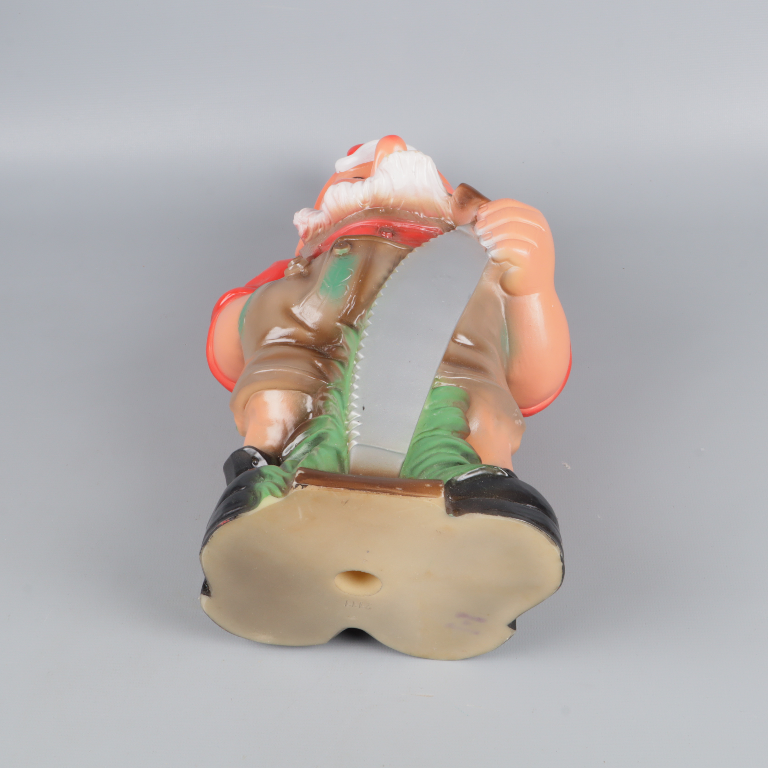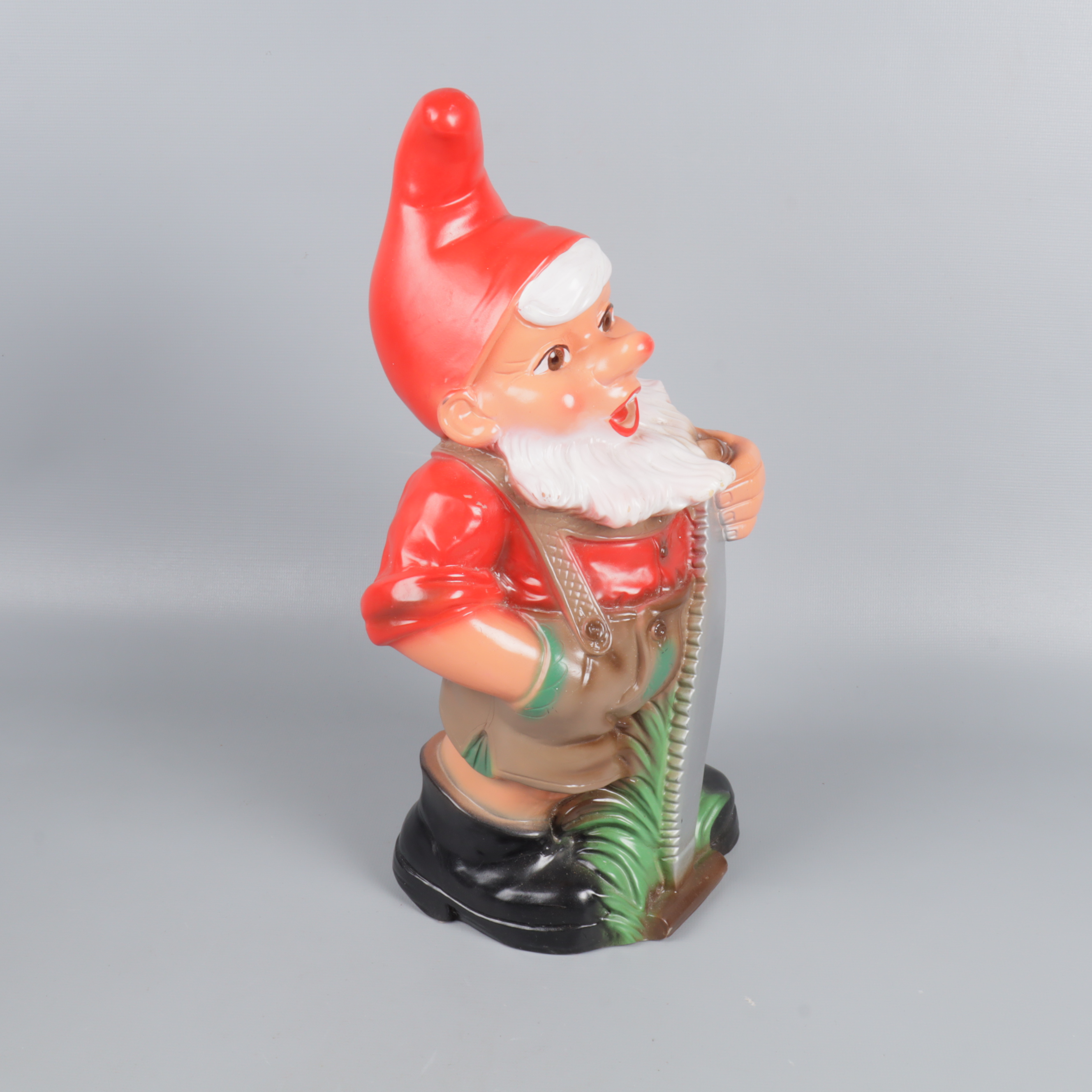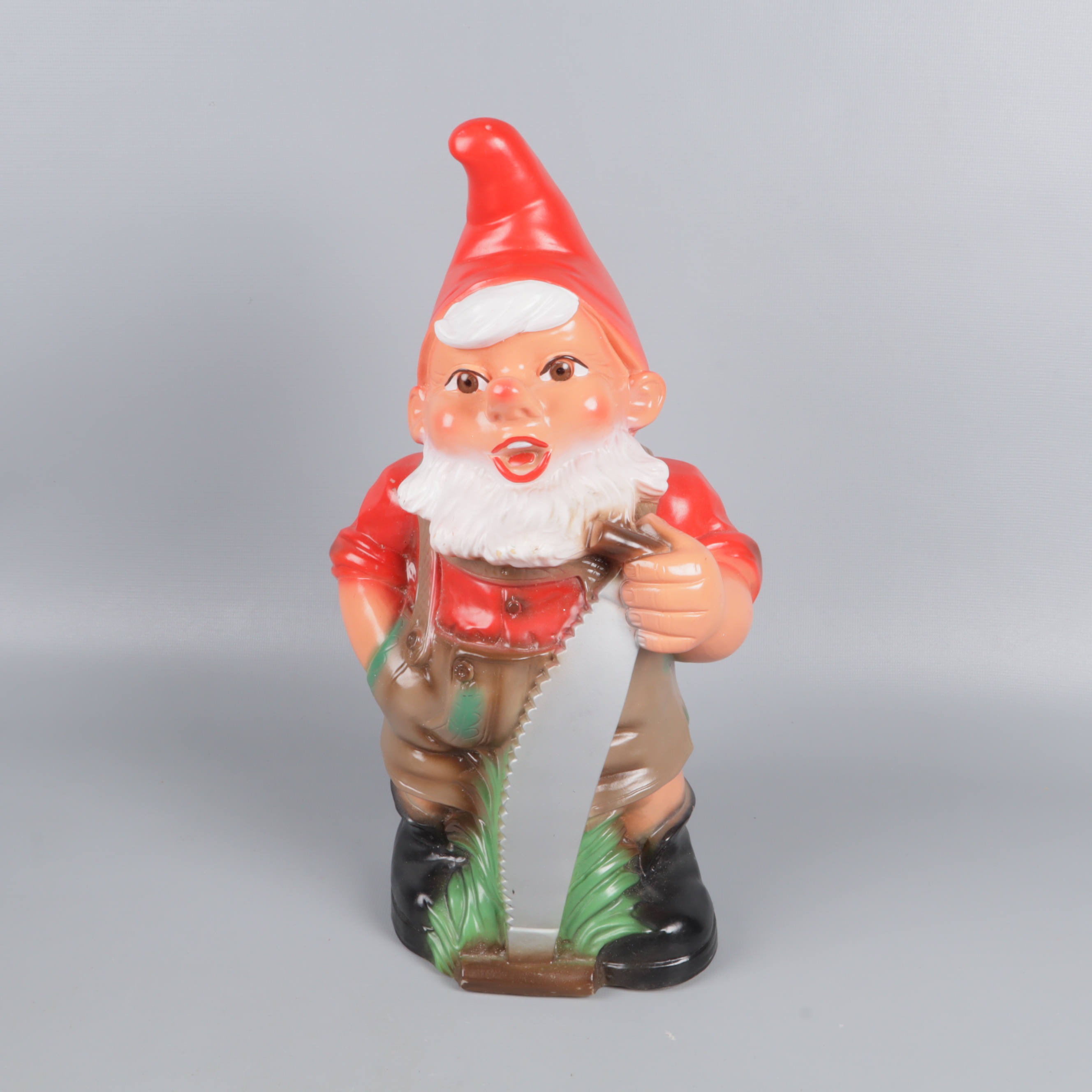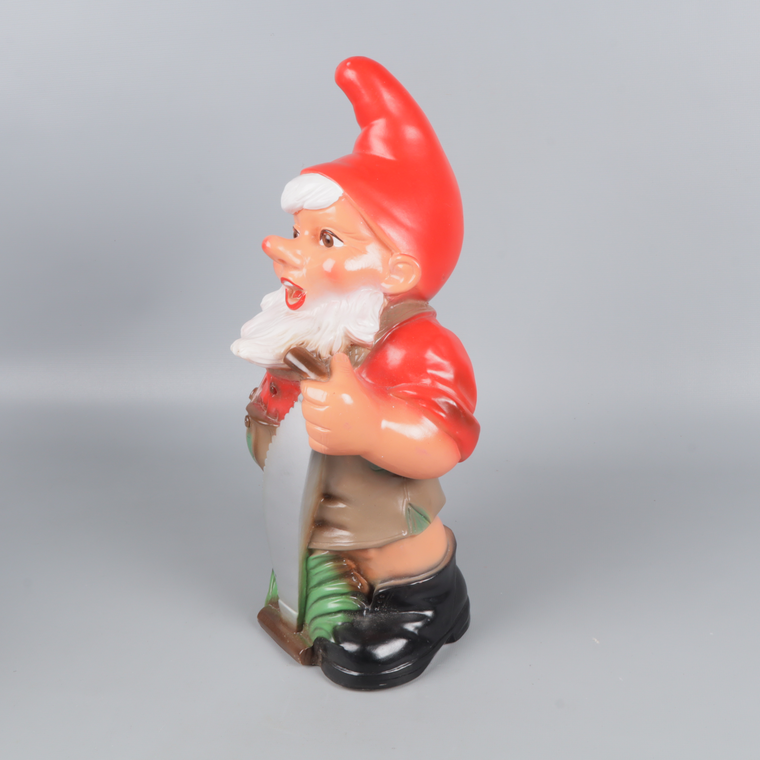 Charmig trädgårdstomte i plast med tydliga färger och fina detaljer. Tomten har röd luva, buskigt vitt skägg och håller en såg i handen.