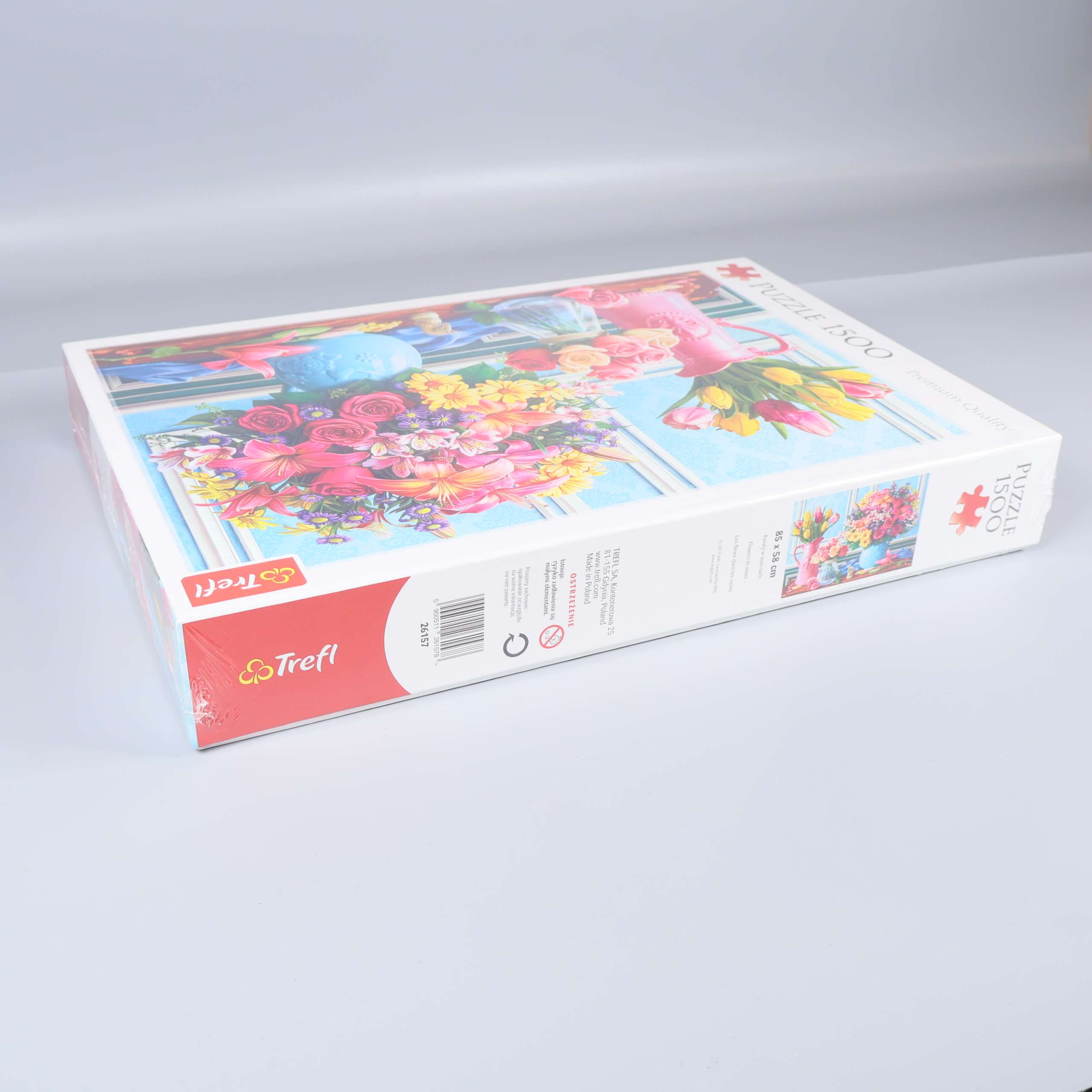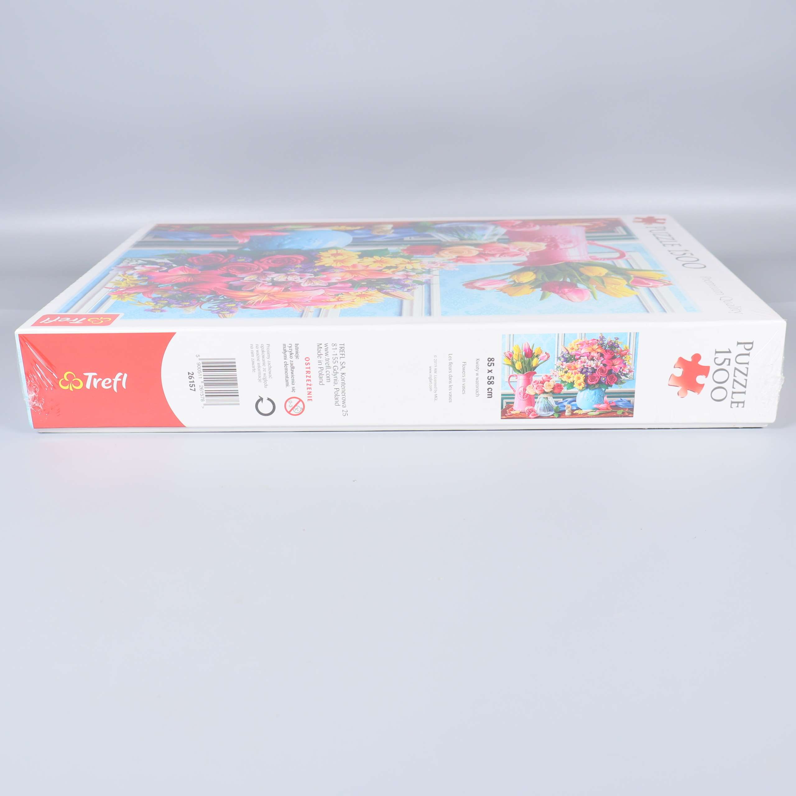 Färgglatt pussel med ett härligt blomsterarrangemang och levande nyanser, perfekt för dig som gillar utmaningar med många detaljer. Kartongen visar flera buketter i vas och kanna vid ett fönster. Premiumkvalitet från Trefl. Känslan är klassisk och tidlös, passar lika bra ensam som i sällskap.