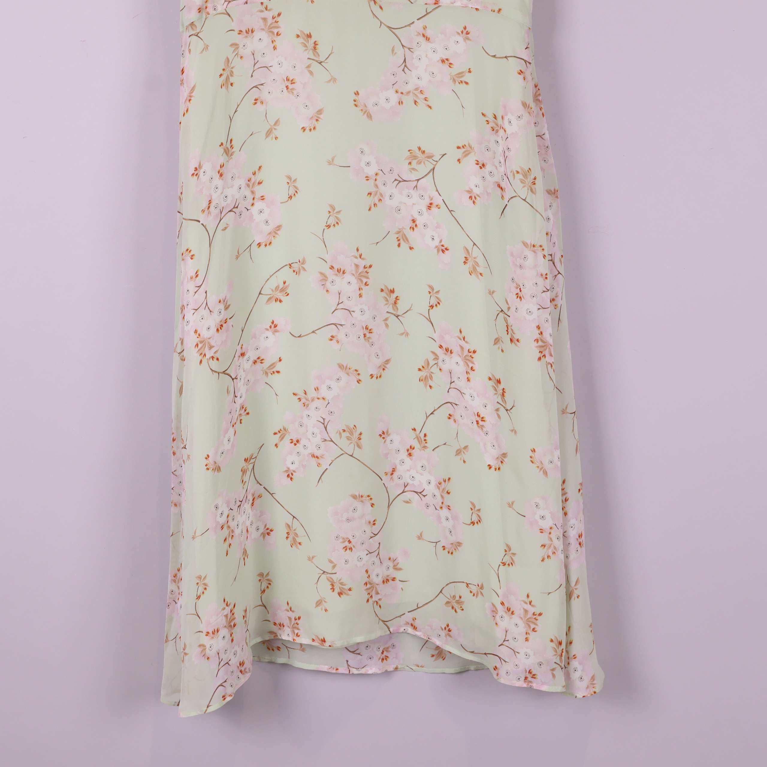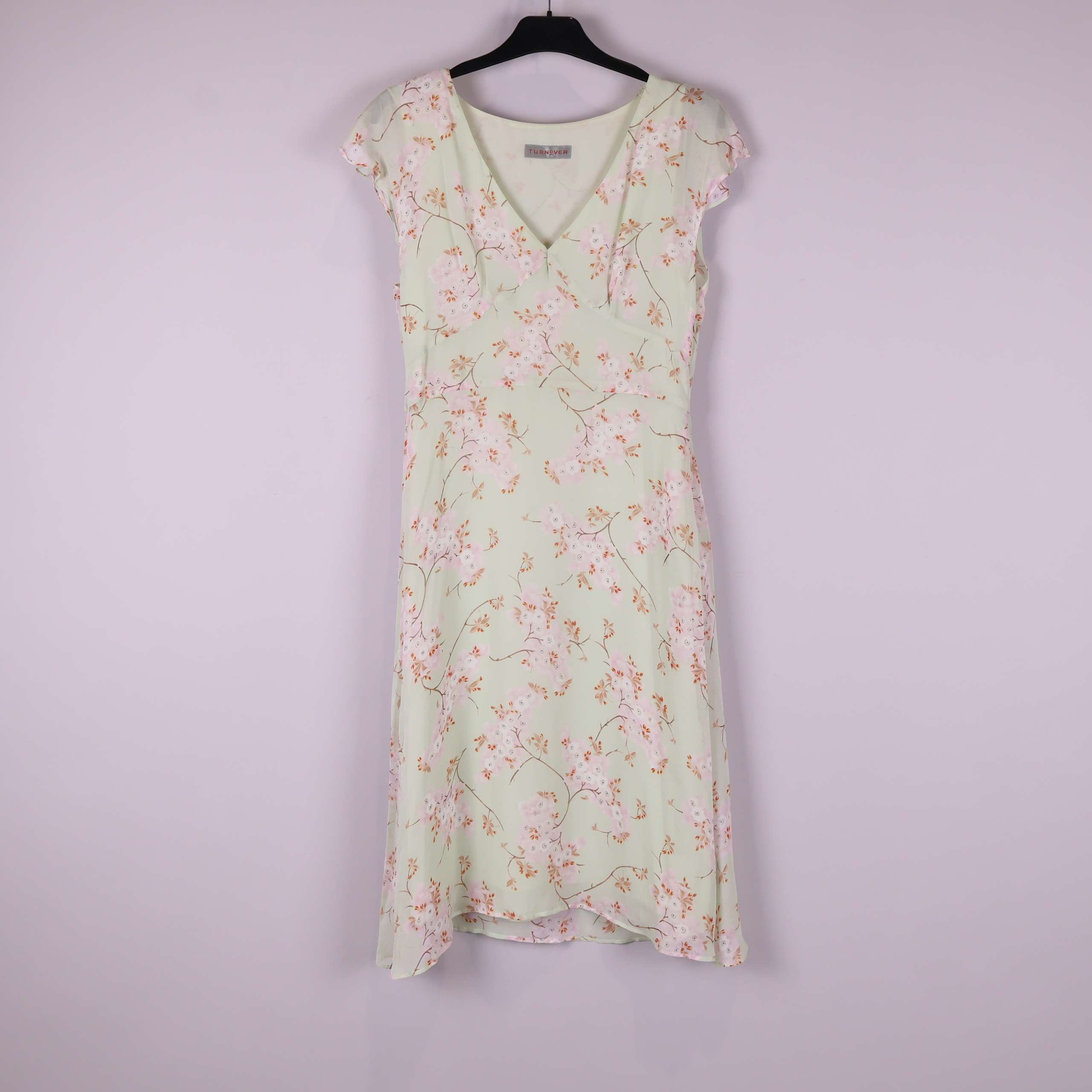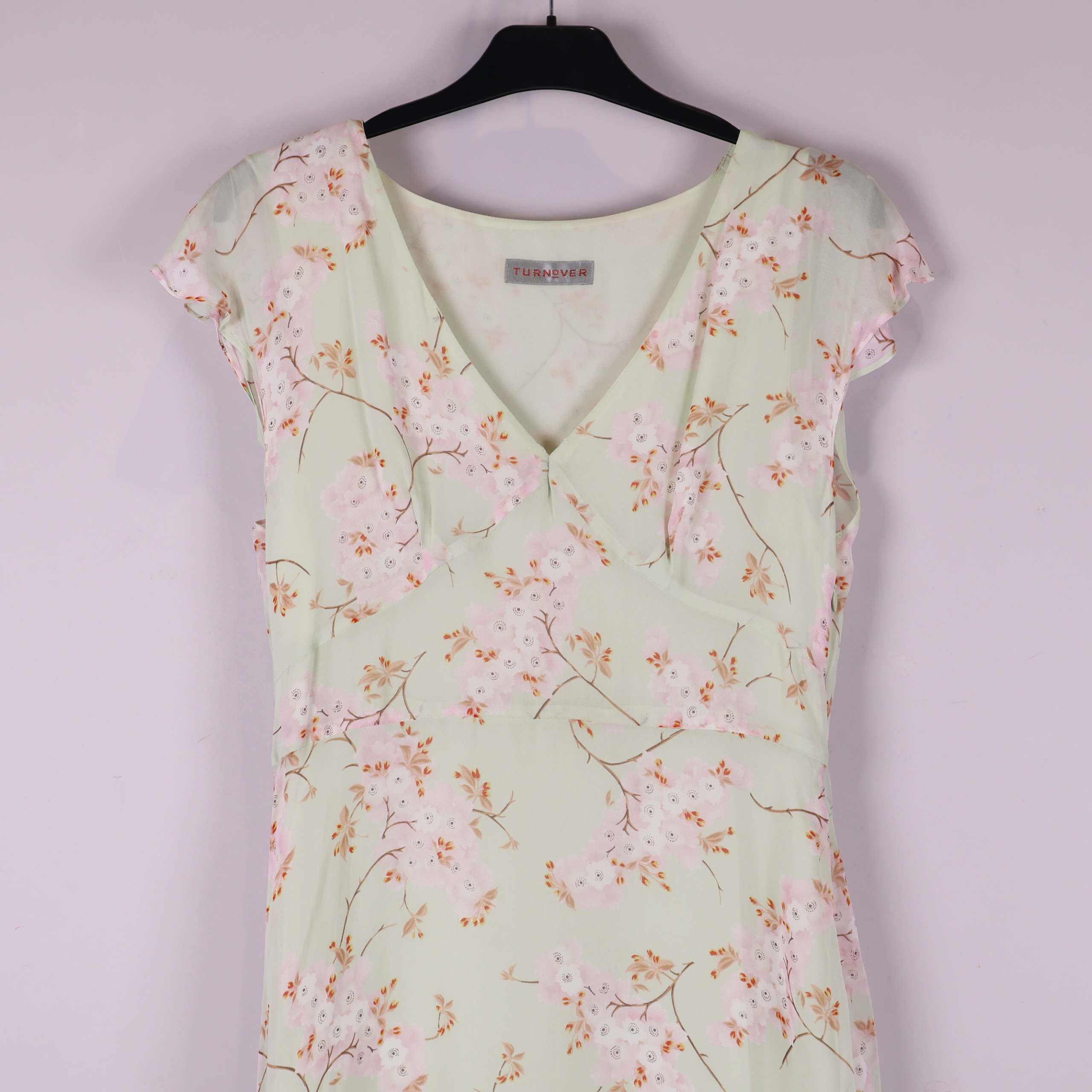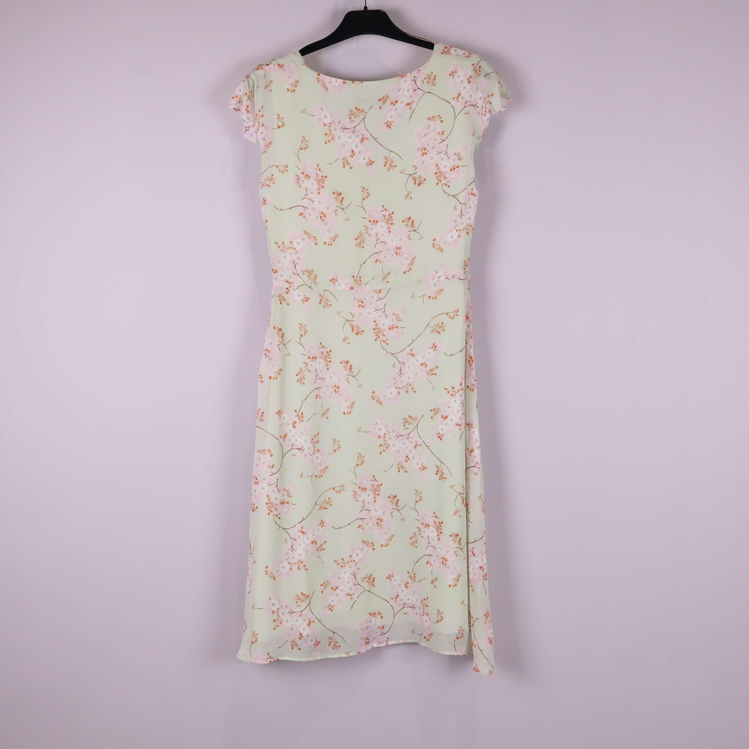 Lätt klänning med blommigt mönster i mjuk, ljus viskos. V-ringning fram, korta ärmar med liten volangdetalj och ett feminint, svagt figursytt snitt som ger en fin siluett. Materialet ger ett luftigt fall och printet har inslag av rosa och aprikos för en mjuk, vårig känsla.